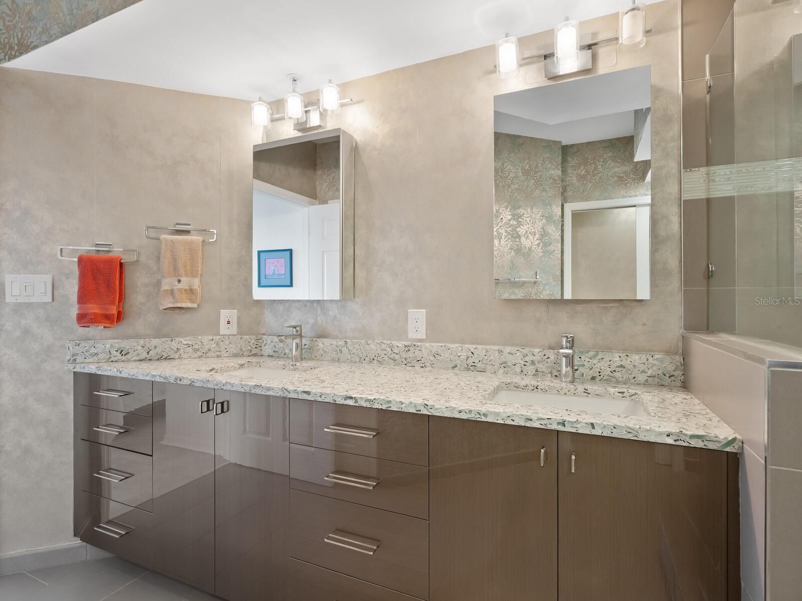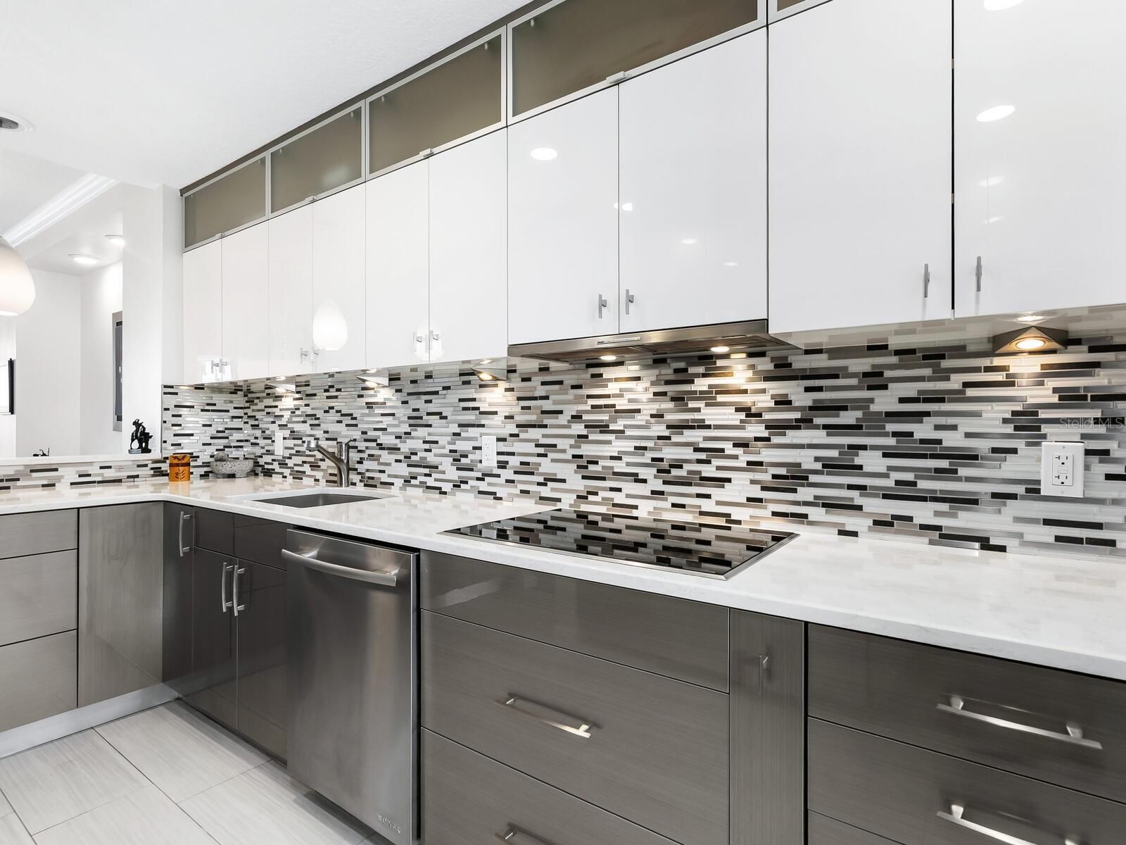 Step into this beautifully renovated 2-bedroom plus den condo, where modern elegance meets sophisticated design. With no updates needed, this condo is truly move-in ready. Situated on the first residence level of Eagles Point I, this condo features not only a screened-in balcony, but also an expansive open terrace to indulge your green thumb and enjoy a little gardening. With a western exposure, sunsets over the lush mangroves provide a breathtaking view that promises to be the highlight of your evening with vibrant colors - a prefect setting to unwind at days end. In addition, on the eastern side, the entry offers a sunny and bright patio set-up- an ideal spot for starting your day with morning coffee overlooking the lake. The sliding glass doors and windows on the western side of this condo are hurricane and impact-rated for your peace of mind. Inside, the open-concept living space features wide-plank engineered wood flooring throughout the living area, den, and guest bedroom. Adding to the ambience of the living room is a Dimplex electric fireplace making the area perfect for relaxing or entertaining. The primary bedroom is a retreat offering generous space with direct access to the balcony. A custom designed walk-in closet provides ample storage, an updated ensuite with dual sinks, stall shower, vanity with specialty granite and designer wallcoverings provide a spa-like experience. The kitchen will please any gourmet- featuring modern contemporary styling- Jenn-Air stainless appliances including an induction cooktop and wine refrigerator, high-gloss two-tone cabinets with a wealth of drawers and pull-outs provide plenty of storage. A desk and work station has been thoughtfully designed into the kitchen. The den, a flexible space that can adapt to your needs features glass doors which provide both privacy and light. This condo also includes a designated under-building parking spot with storage closet for added convenience. The building is pet-friendly, welcoming pets up to 25 lbs. As a resident of Eagles Point, you’ll enjoy access to the private pool and barbecue area. Additionally, you’ll have access to the Landings Racquet Club with 8 har-tru counts, pickle ball, pool with spa, gym and club house, where many social functions happen. An ideal spot to meet neighbors and partake in the community lifestyle.The Landings also offers a nature trail to a gazebo on the Intracoastal Waterway, where you can enjoy fishing or simply sit back and enjoy the beauty of nature. A kayak storage is also available. Situated in the coveted “West of the Trail” area, The Landings is a premier gated community with easy access to all amenities and lifestyle perks you could desire. Easy to show-make this spectacular condo your new home.