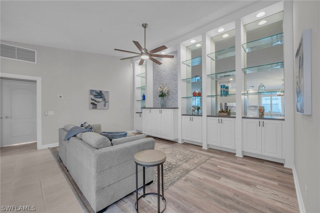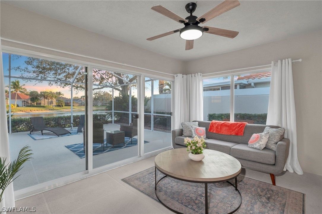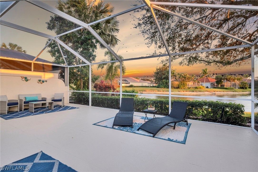 Nestled within the highly desirable, amenity-rich community of Island Walk, this beautifully updated and furnished Capri attached villa offers an exceptional blend of privacy, comfort, and breathtaking waterfront living. It's ready for you to move-in today. Perfectly positioned with coveted rear southern exposure, the expansive screened lanai captures sweeping panoramic lake views while providing a serene and highly private outdoor retreat ideal for relaxing or entertaining year-round. The thoughtfully designed interior is light-filled and inviting, enhanced by vaulted ceilings, elegant plantation shutters, and refined built-in features that add both character and functionality. The modernized kitchen and bathrooms showcase quality finishes, including quartz countertops, polished marble backsplash, contemporary cabinetry, and a fresh, bright aesthetic throughout. The glass-door enclosed lanai adds additional indoor/outdoor living space and is a relaxing place to watch tv or read a book. Brand-new impact windows have just been installed, offering both peace of mind and energy efficiency, and a new roof added was in 2020. The desirable two-bedroom plus den floorplan provides flexibility for guests, a home office, or additional living space, while the open layout seamlessly connects the main living areas to the outdoor lanai, allowing the tranquil lake views to serve as a constant backdrop. Island Walk is renowned for its unique Town Center, offering unmatched convenience with its own gas station, car wash, well-reviewed restaurant, post office, salon, library, and fitness center. Residents enjoy an active, resort-inspired lifestyle with tennis, pickleball, lap and resort-style pools, bocce courts, a putting green, and miles of scenic walking and biking paths connected by charming Venetian-style bridges. Set among lush landscaping, mature trees, and sparkling lakes, this vibrant DiVosta-built community offers a true sense of privacy, beauty, and connection. Ideally located in Naples, one of the nation’s most desirable coastal destinations, this exceptional villa presents a rare opportunity to enjoy modern comfort, stunning lakefront views, and an unparalleled lifestyle in one of the area’s most sought-after communities.
