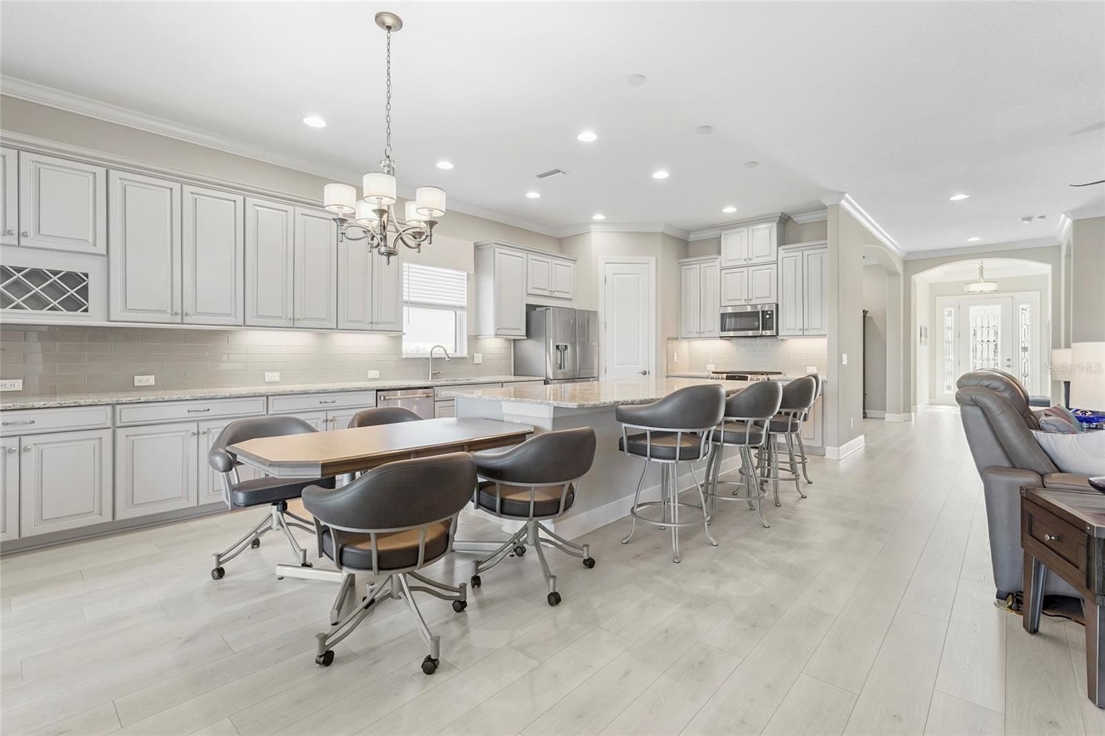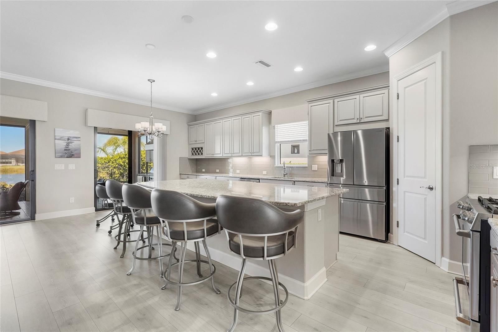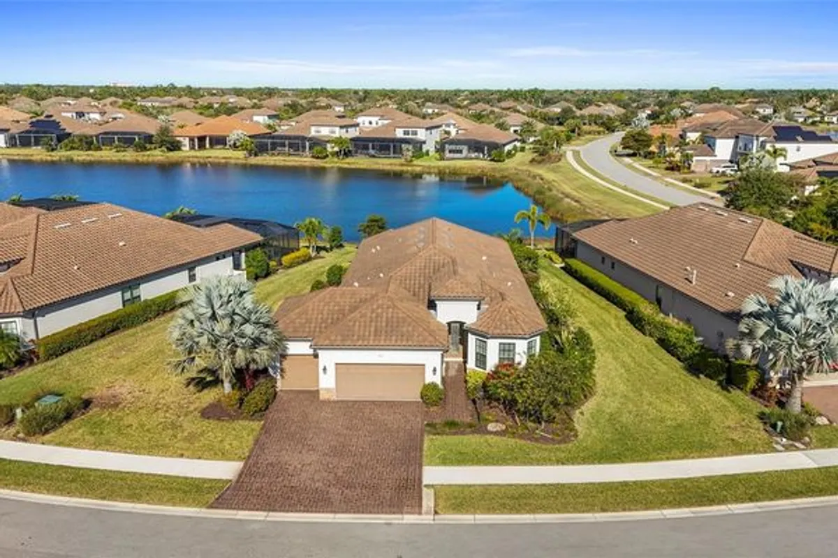 Experience resort-style living in the amenity-rich, gated community of Legacy Estates at Esplanade on Palmer Ranch. This rarely available Lazio model offers 3 bedrooms, 3 full baths, plus a den, and over 2,400 sq. ft. of thoughtfully designed living space. Perfectly positioned on an **oversized premium waterfront lot—the largest on the street. This home offers tranquil water views and lush landscaping, creating an exceptional setting for outdoor living and entertaining. The home features extensive structural and designer upgrades, including an extended gourmet natural gas kitchen, front and primary bedroom bump-outs, 8-foot doors throughout, and a true four-foot extended three-car garage with upgraded epoxy floor paint. Engineered laminate flooring spans the main living areas, complemented by new lighting and ceiling fans. The chef’s kitchen is a standout, showcasing upgraded finishes and fixtures ideal for both everyday living and entertaining. Additional highlights include a whole-house generator, hurricane-impact windows and sliders, tankless hot water heater, hurricane-rated glass front door, hurricane shades and whole house surge protector. The outdoor living space offers an outdoor kitchen with weatherproof cabinetry with porcelain floor tile with and underlay layer preventing cracks. Located within Esplanade on Palmer Ranch, residents enjoy world-class, maintenance-free living with resort-style amenities, dining, fitness, pickleball, and direct access to the Legacy Trail—offering the perfect blend of luxury, lifestyle, and location.