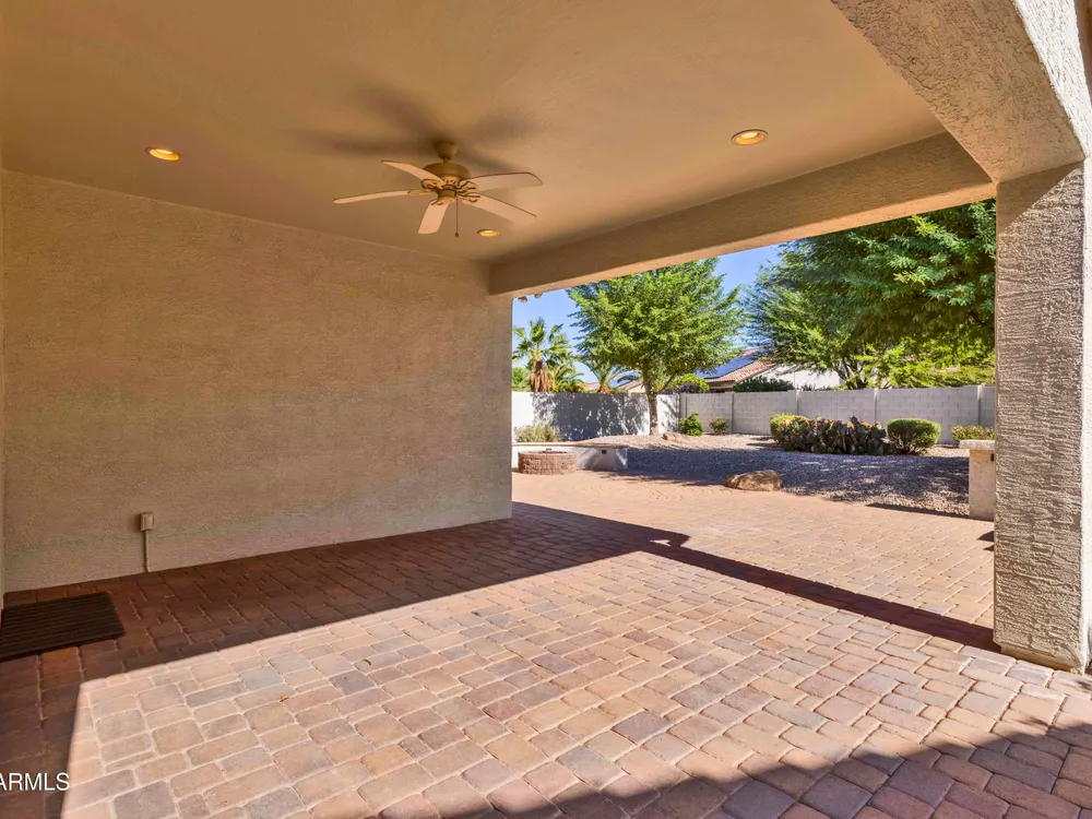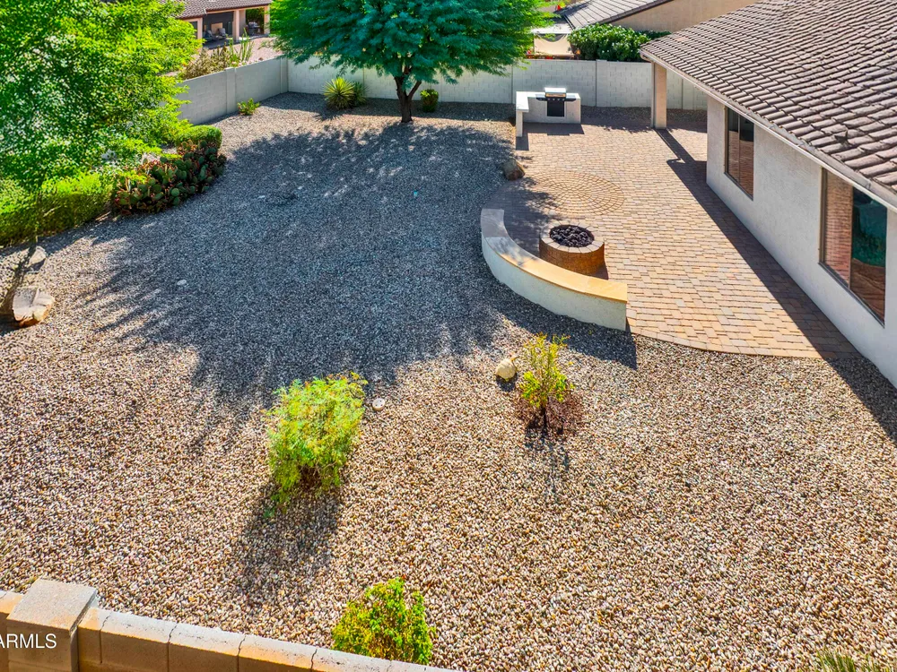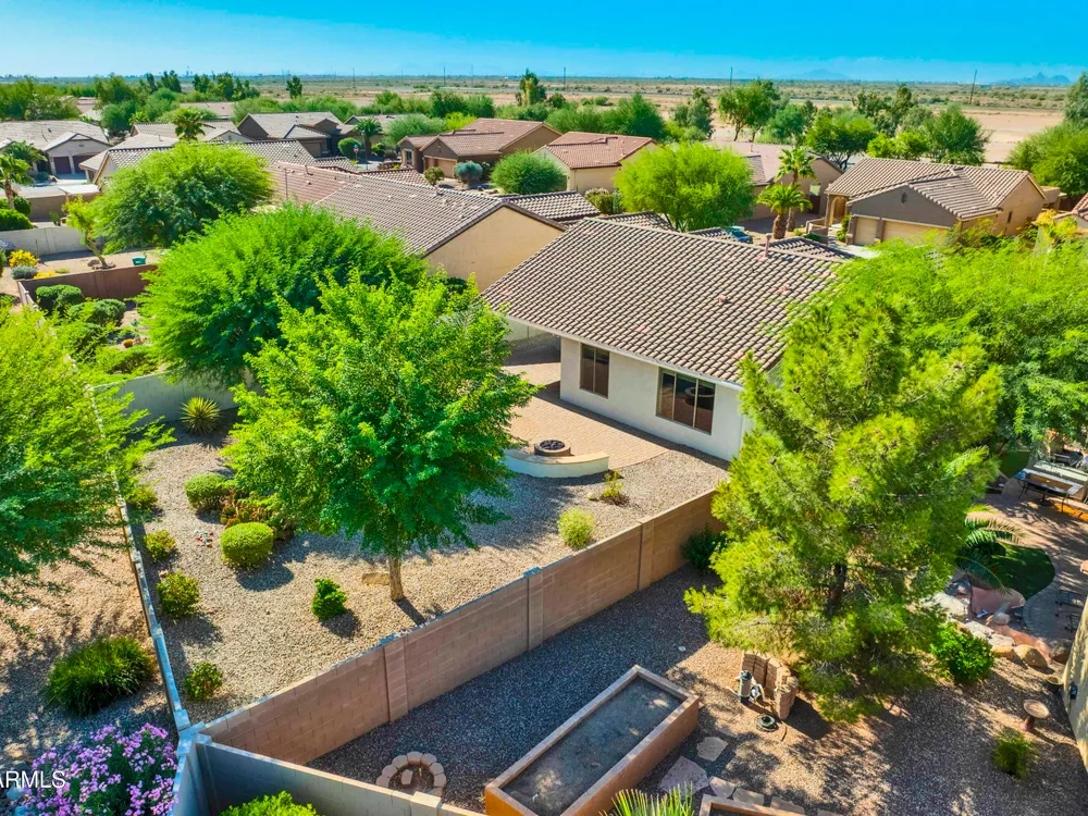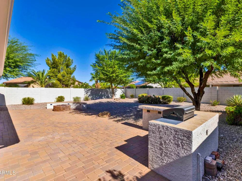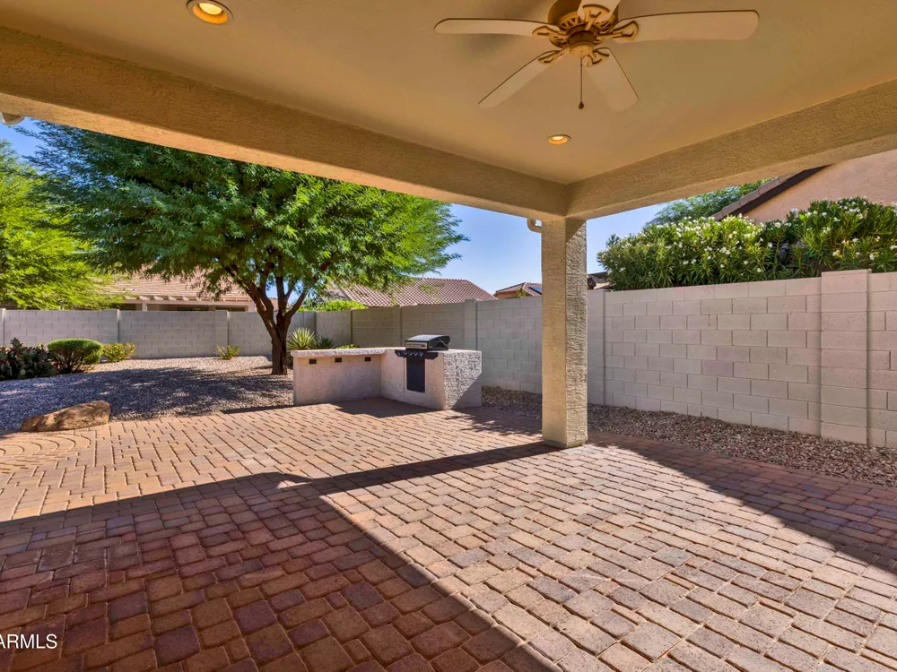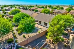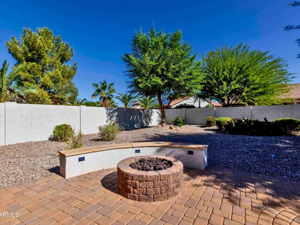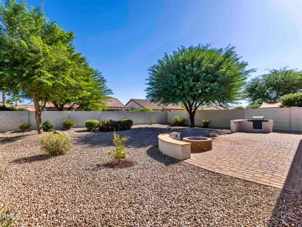 Welcome to this spacious 2bd + den, 1,683 sq ft Integra Block constructed home, nestled on an oversized 7,500 sf lot in the sought-after active adult community Robson Ranch. This home blends comfort, style, and low-maintenance living. Enjoy Arizona's gorgeous weather in your fully enclosed, double-gated backyard, featuring a freshly repainted exterior and 8-course block wall, mature desert landscaping, built-in gas BBQ, gas fire pit w/ built-in seating, extended paver patio with a large covered area and ceiling fan, perfect for entertaining or relaxing in peace. A full set of gutters adds to the home's practicality. Step inside to the inviting kitchen w/ classic Oak cabinets, Corian countertops, freestanding island, pantry, and a stylish French door refrigerator. The open floorplan is enhanced w/ large-profile tile throughout the main areas & brand new carpet adds comfort to the bedrooms & den. Addtl highlights include a spacious laundry room with cabinets, top-load W/D, and a garage equipped w/ workbench, many built in cabinets, Hot H20 recirculation pump & new H20 softener (2024). New Smoke/CO2 Detectors as well as Ceiling Fans in Every Room! This is an ideal lock-and-leave or full-time home w/ 30-day rentals allowed w/ access to Robson Ranch's world-class amenities-pools, golf, pickleball, restaurants & more! Don't miss this one-a perfect blend of privacy, space, and resort-style living!