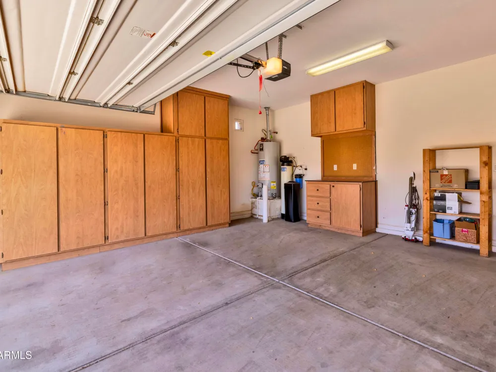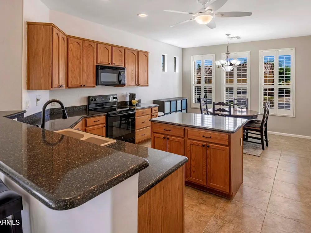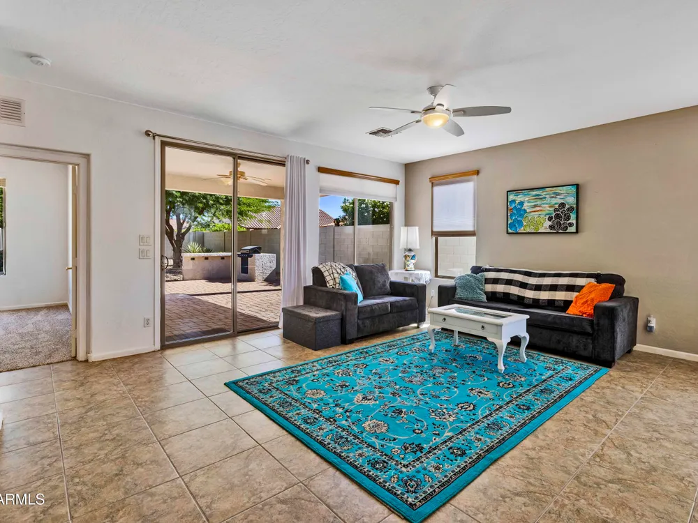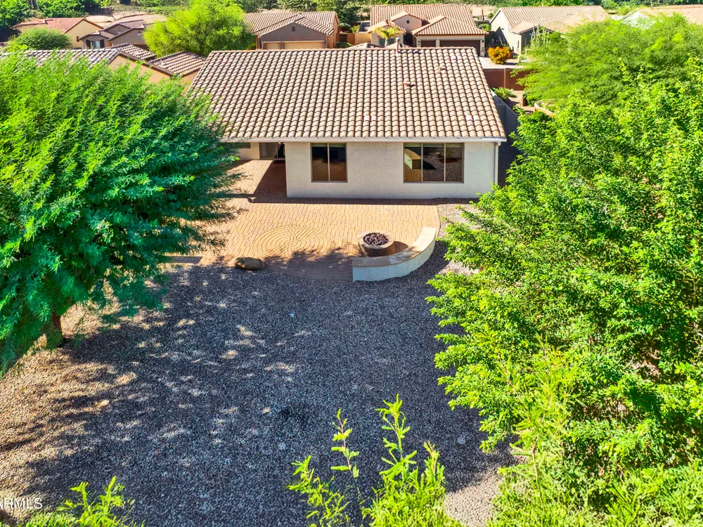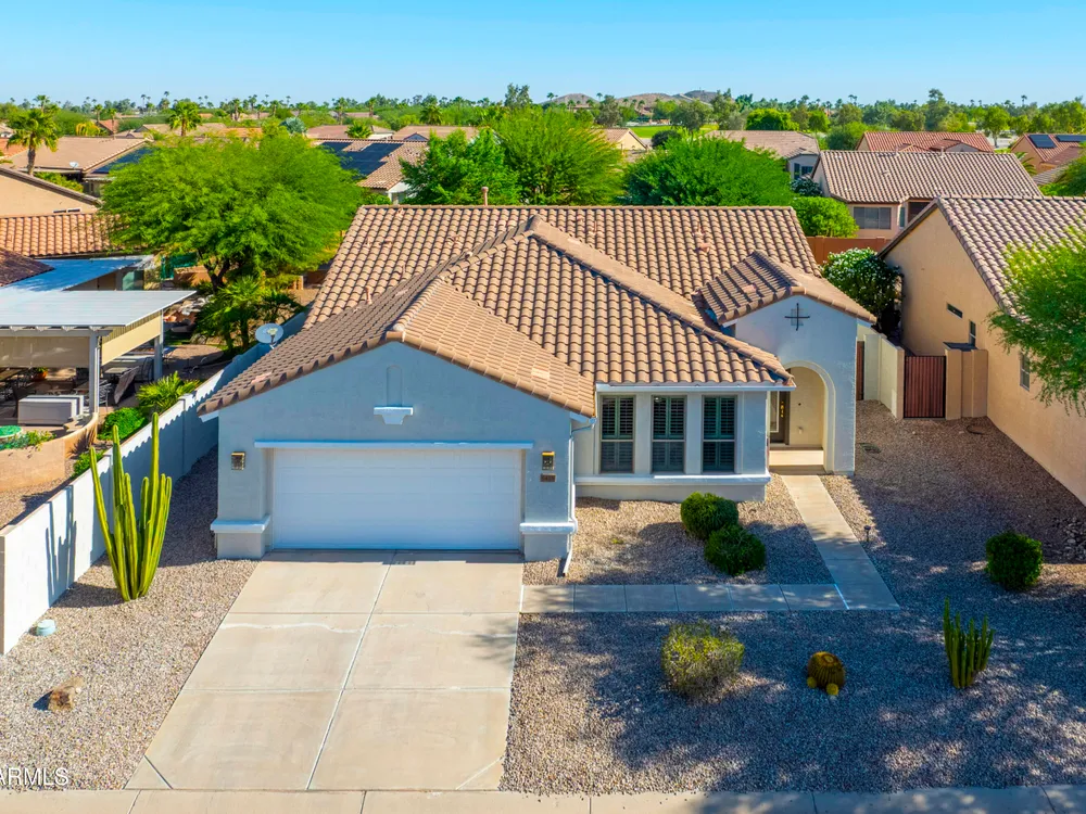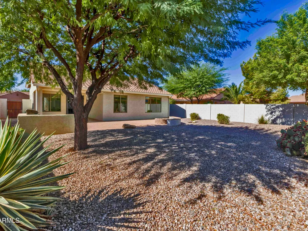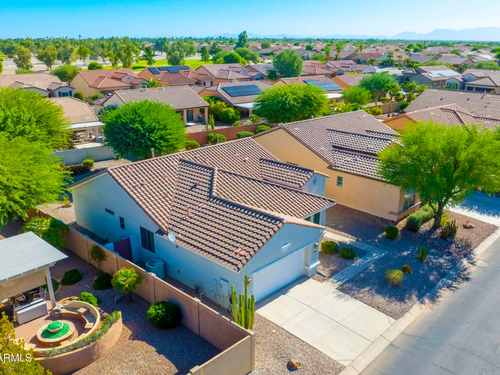 Welcome to this spacious 2bd + den, 1,683 sq ft Integra Block constructed home, nestled on an oversized 7,500 sf lot in the sought-after active adult community Robson Ranch. This home blends comfort, style, and low-maintenance living. Enjoy Arizona's gorgeous weather in your fully enclosed, double-gated backyard, featuring a freshly repainted exterior and 8-course block wall, mature desert landscaping, built-in gas BBQ, gas fire pit w/ built-in seating, extended paver patio with a large covered area and ceiling fan, perfect for entertaining or relaxing in peace. A full set of gutters adds to the home's practicality. Step inside to the inviting kitchen w/ classic Oak cabinets, Corian countertops, freestanding island, pantry, and a stylish French door refrigerator. The open floorplan is enhanced w/ large-profile tile throughout the main areas & brand new carpet adds comfort to the bedrooms & den. Addtl highlights include a spacious laundry room with cabinets, top-load W/D, and a garage equipped w/ workbench, many built in cabinets, Hot H20 recirculation pump & new H20 softener (2024). New Smoke/CO2 Detectors as well as Ceiling Fans in Every Room! This is an ideal lock-and-leave or full-time home w/ 30-day rentals allowed w/ access to Robson Ranch's world-class amenities-pools, golf, pickleball, restaurants & more! Don't miss this one-a perfect blend of privacy, space, and resort-style living!