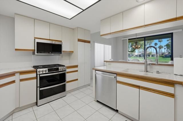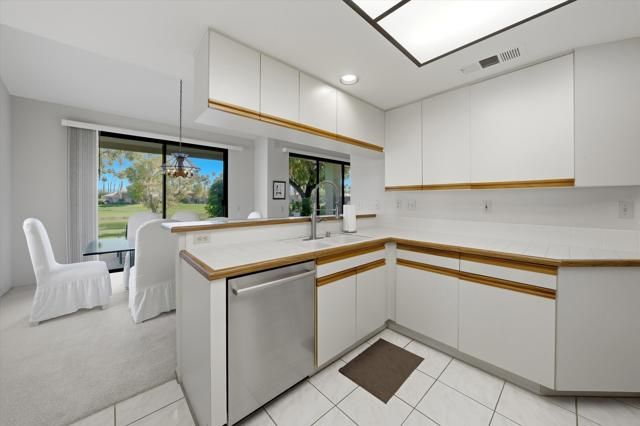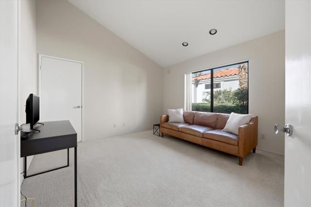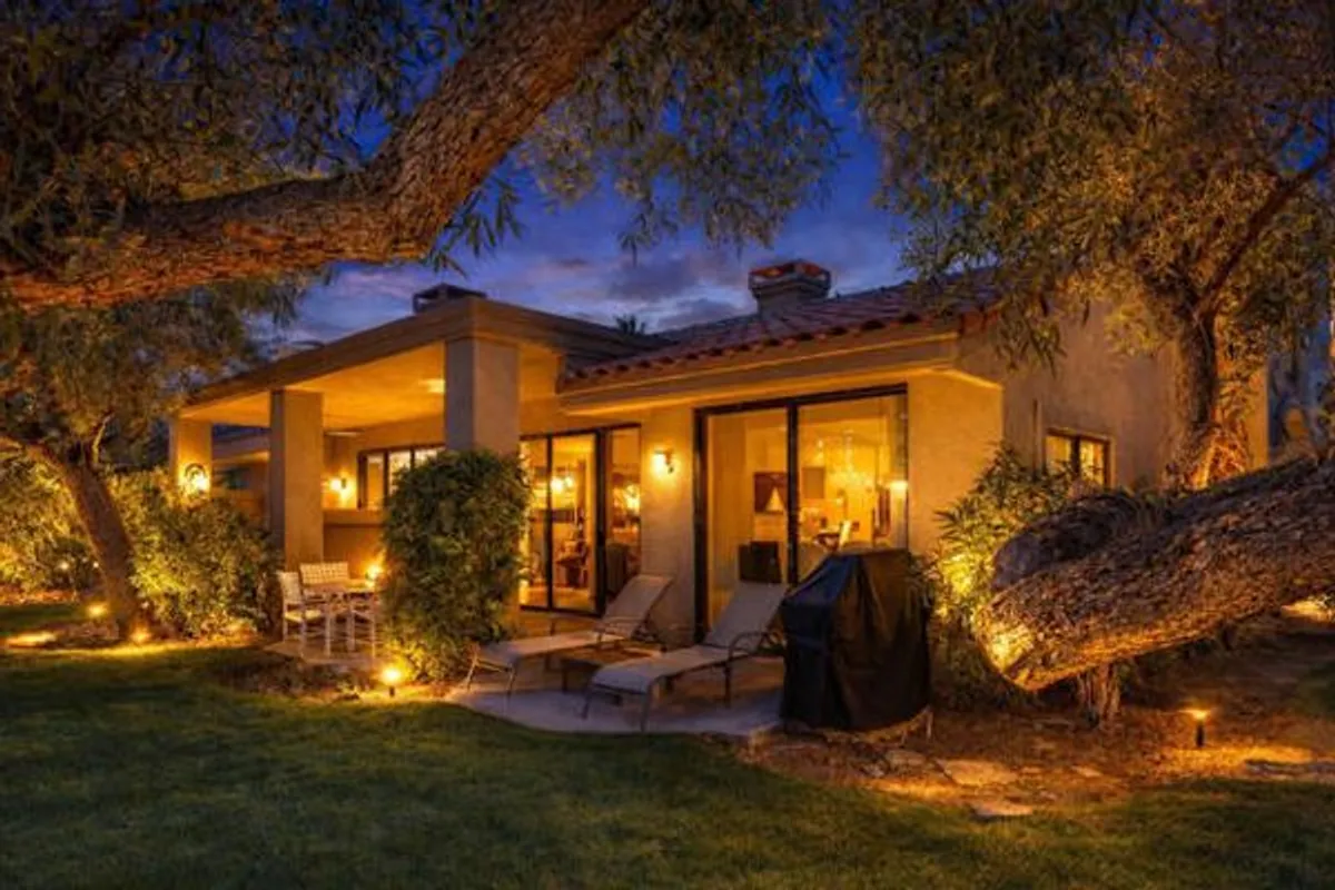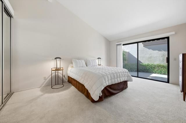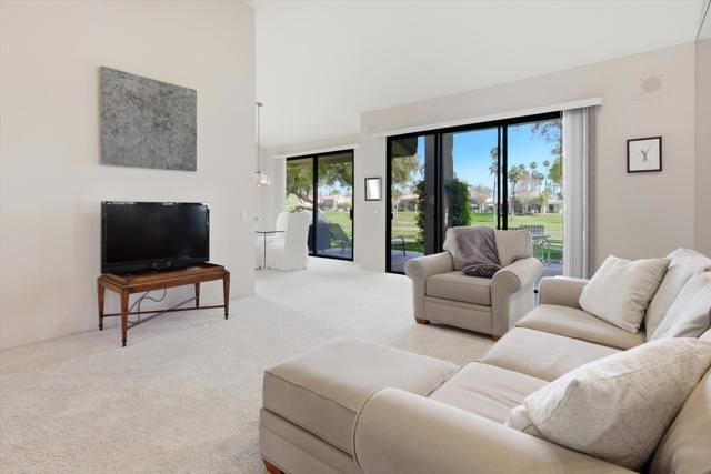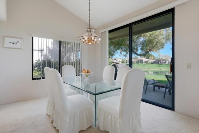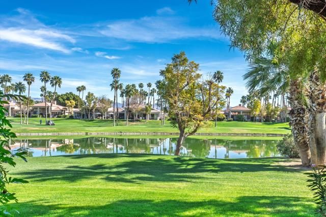 Perfectly positioned on the 7th fairway of the Arnold Palmer Private Course, this beautifully cared-for Champion 3 residence offers sweeping lake and golf course vistas from one of the community's most desirable end-unit locations. Set on a premium lot with the cart path across the water, the home enjoys exceptional privacy while capturing morning sunshine and comfortable shaded afternoons from the east-facing rear patio.This property spans approximately 1,627 square feet and features three bedrooms and two bathrooms. Inside, vaulted ceilings create an open, airy feel throughout the living spaces, complemented by a fireplace, wet bar, formal dining area, and built-in surround sound wiring -- an inviting layout for both relaxing and entertaining. Large windows and thoughtfully placed mirrored accents enhance the natural light and maximize the golf course views.The primary suite offers generous closet space, dual vanities, and direct access to a private courtyard with western exposure -- an ideal setting for quiet mornings or evening sunsets. A covered rear patio overlooks the lake and fairway, delivering the quintessential desert resort experience.Additional highlights include newer water heaters & AC/Heating as well as updated appliances. The property is conveniently located near community pools and spas for easy access to recreation.The HOA provides extensive coverage, including exterior maintenance, roof, paint, landscaping of all yard areas, irrigation water and equipment, trash service, cable and internet, earthquake insurance, and 24-hour guarded security -- allowing for true low-maintenance ownership within one of La Quinta's premier golf communities.