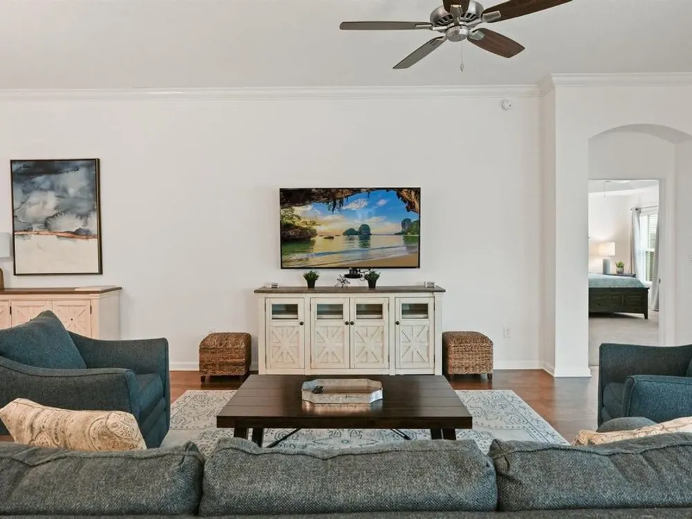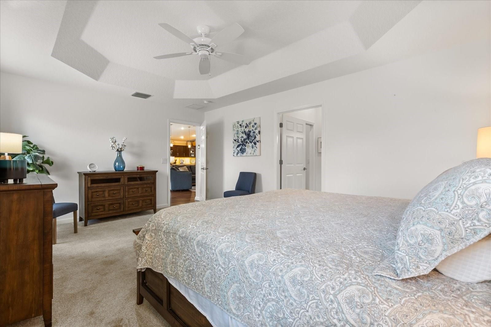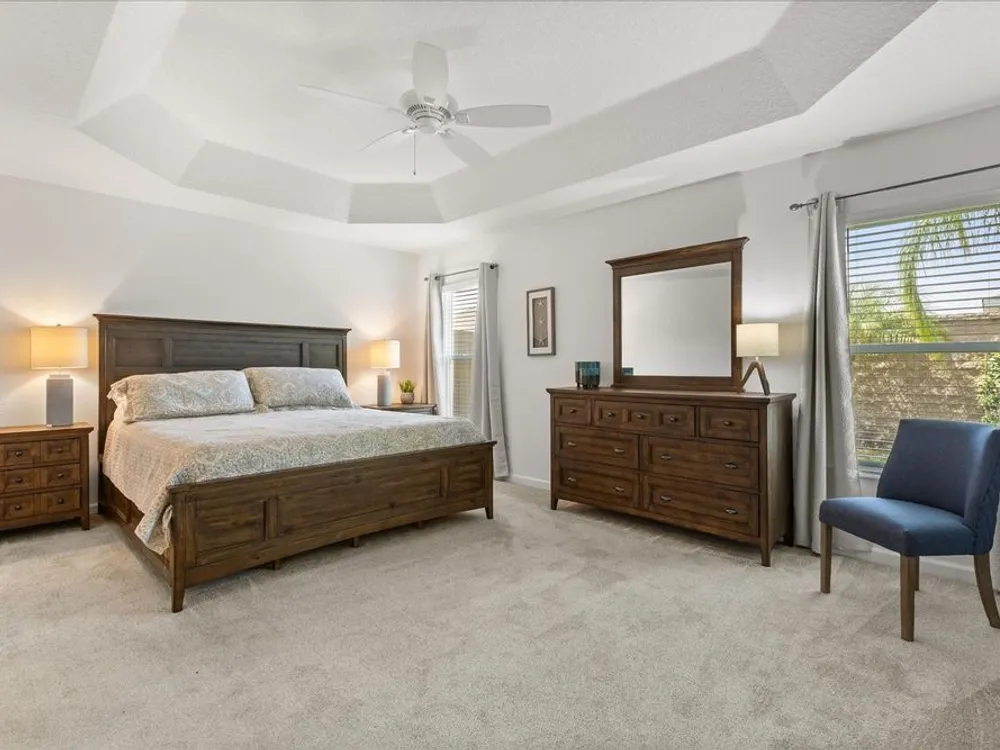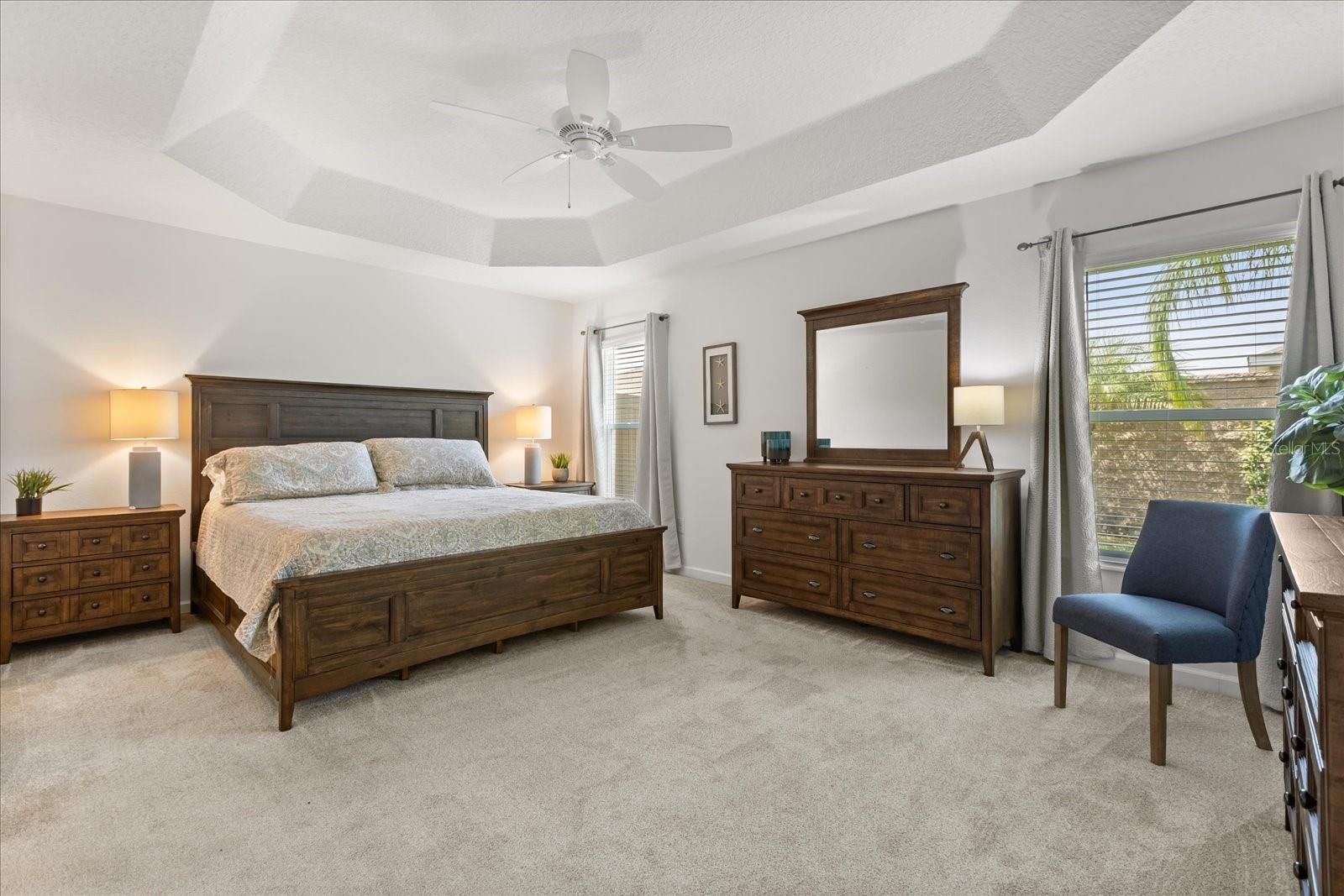 - Ceiling Fan(s), Crown Molding, Eat-in Kitchen, High Ceilings, Kitchen/Family Room Combo, Living/Dining Room, Open Floorplan, Main Level Primary, Solid Surface Counters, Solid-Wood Cabinets, Thermostat, Tray Ceiling(s), Walk-In Closet(s), Window Treatments