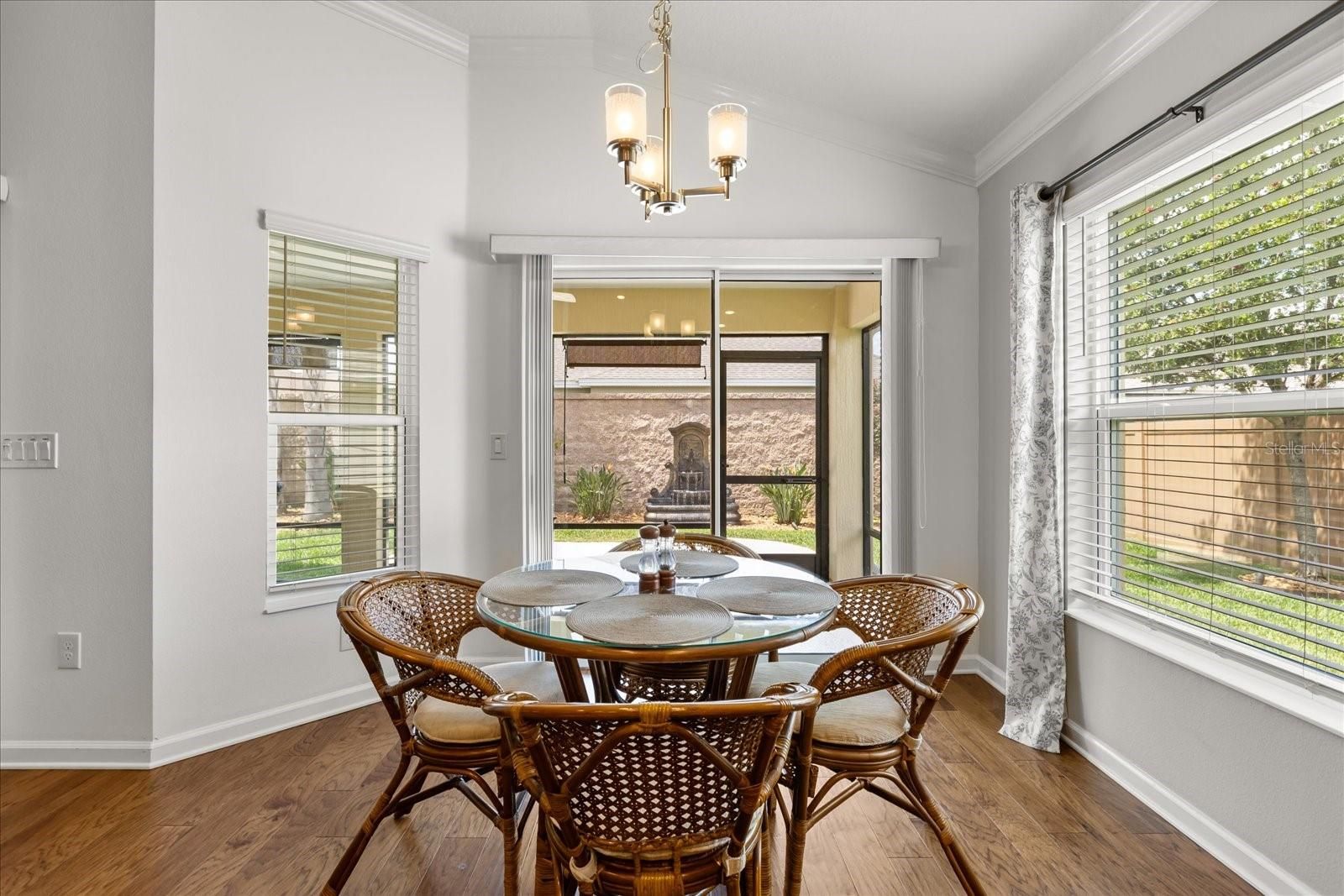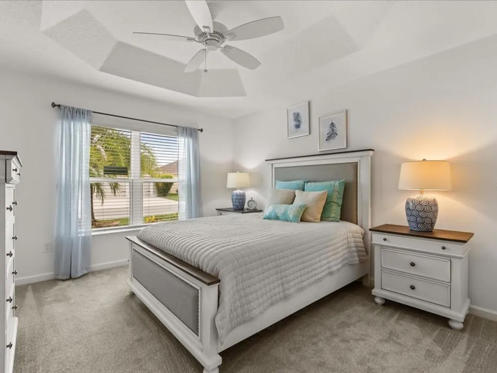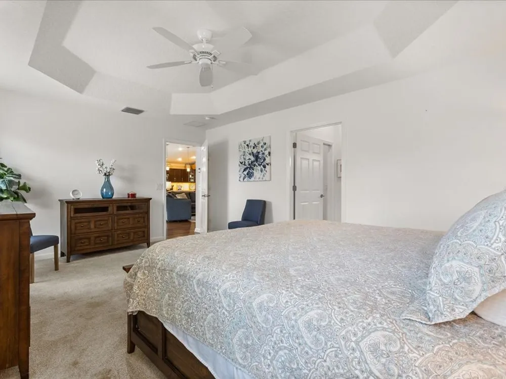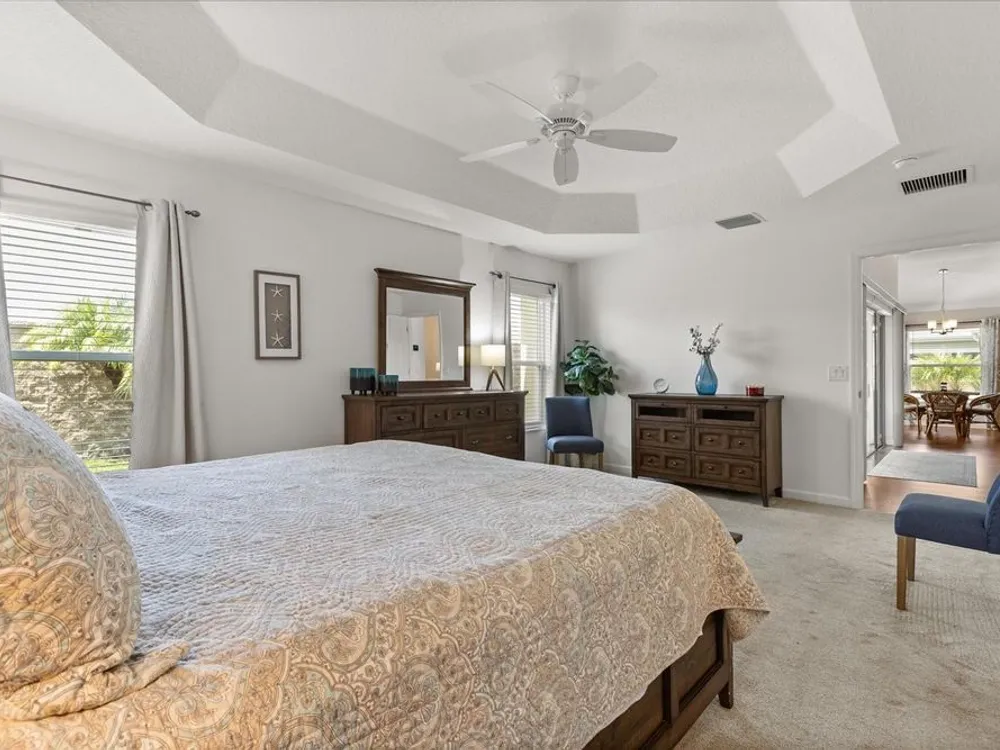 - Ceiling Fan(s), Crown Molding, Eat-in Kitchen, High Ceilings, Kitchen/Family Room Combo, Living/Dining Room, Open Floorplan, Main Level Primary, Solid Surface Counters, Solid-Wood Cabinets, Thermostat, Tray Ceiling(s), Walk-In Closet(s), Window Treatments