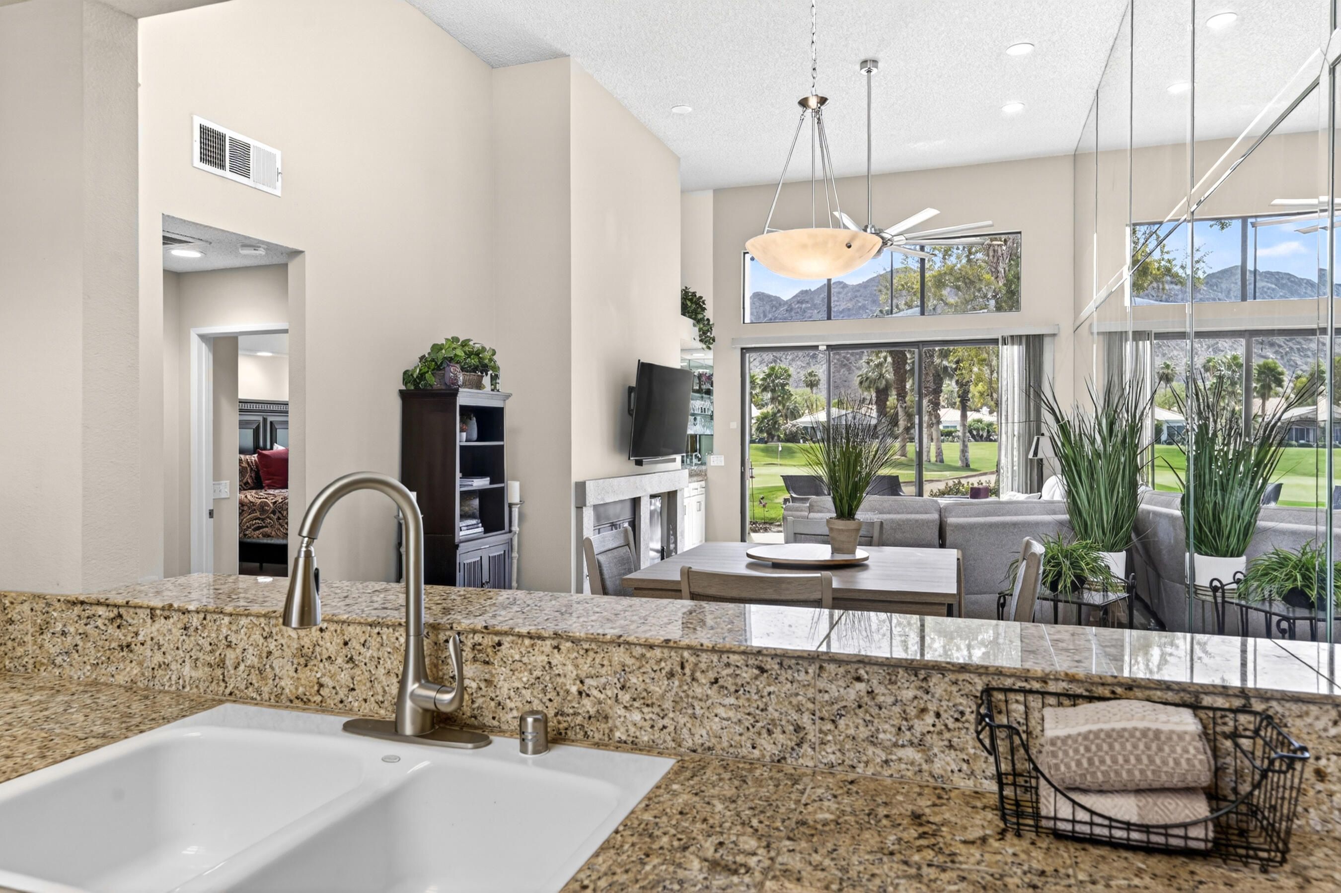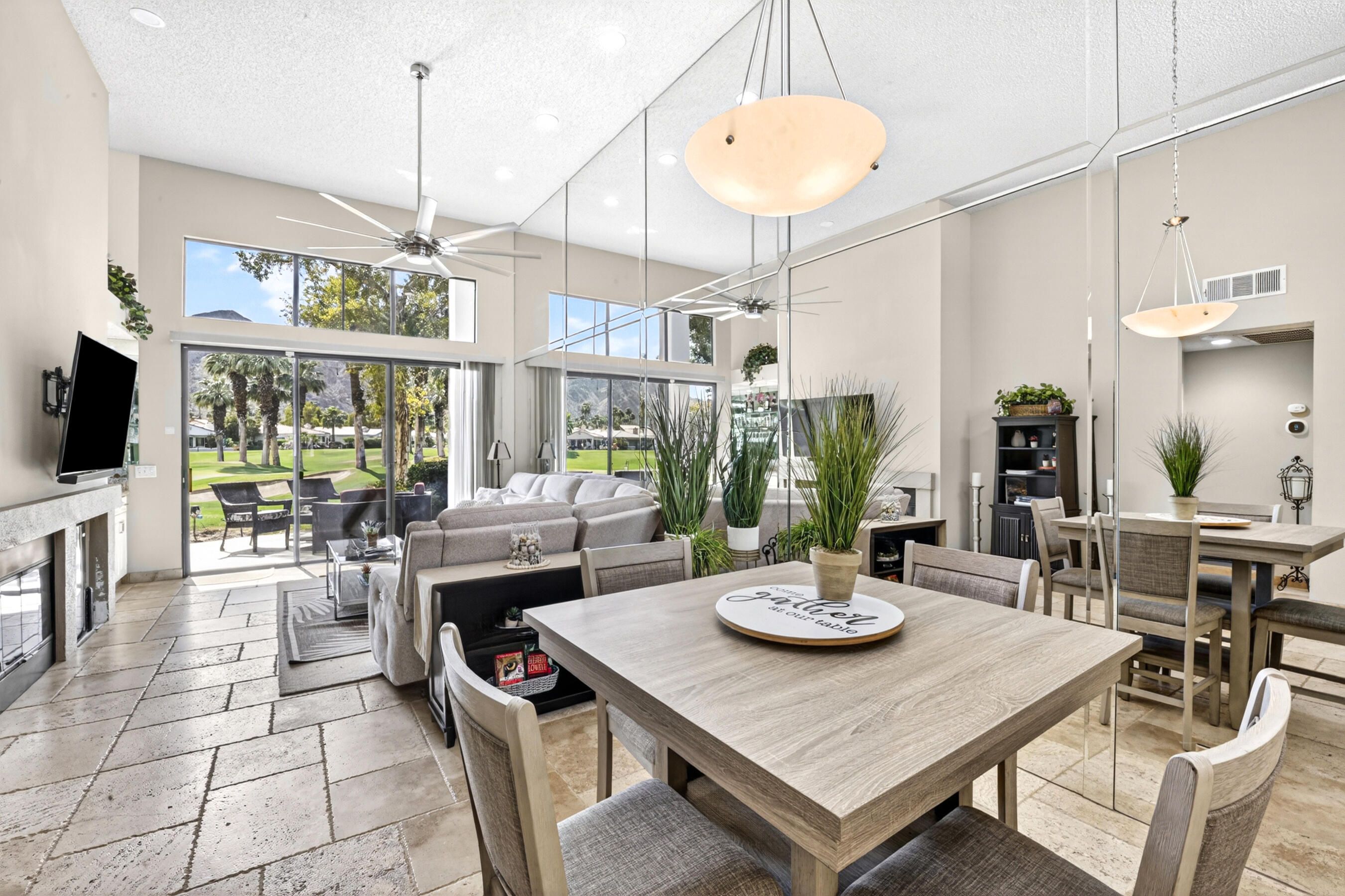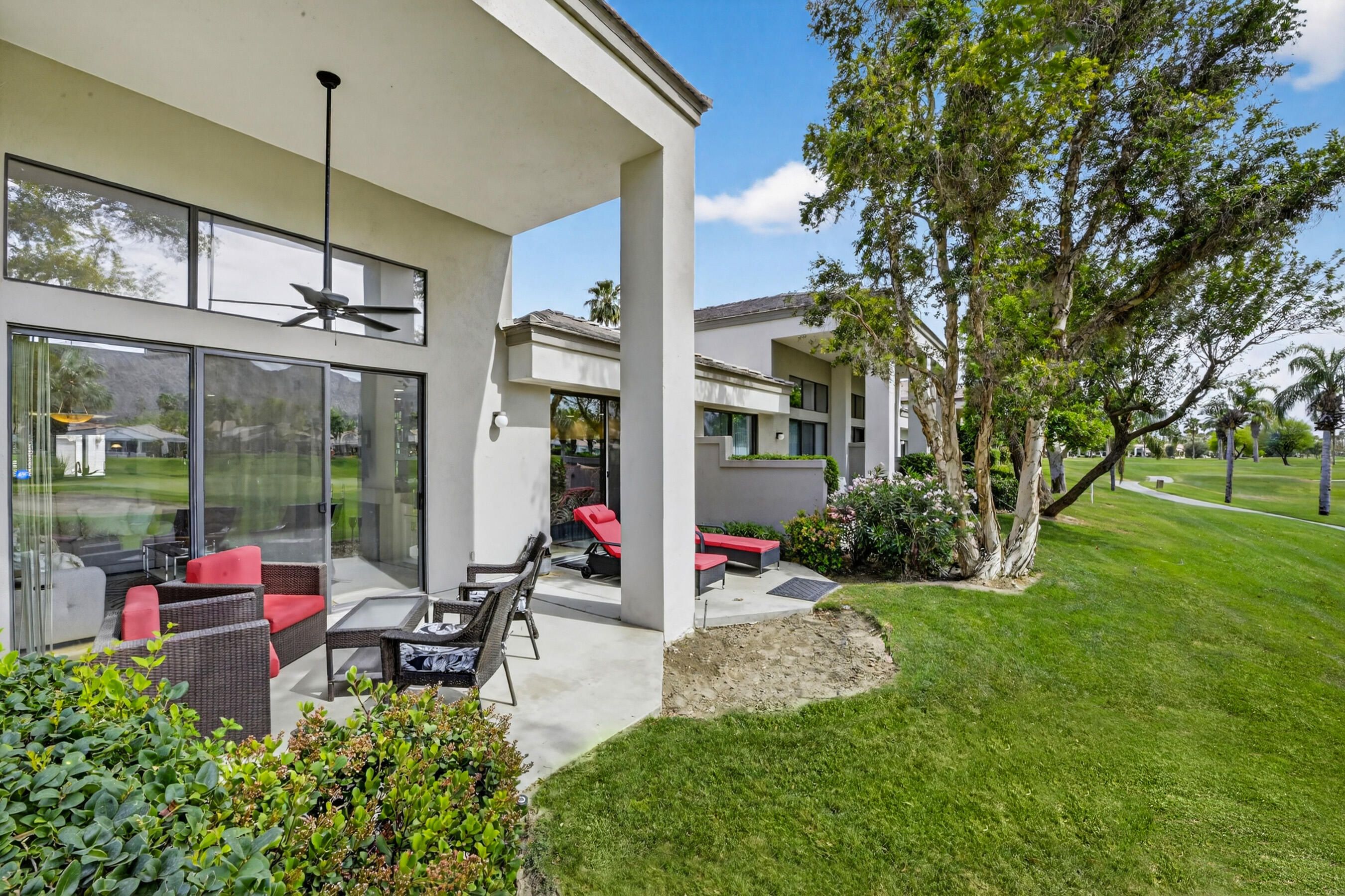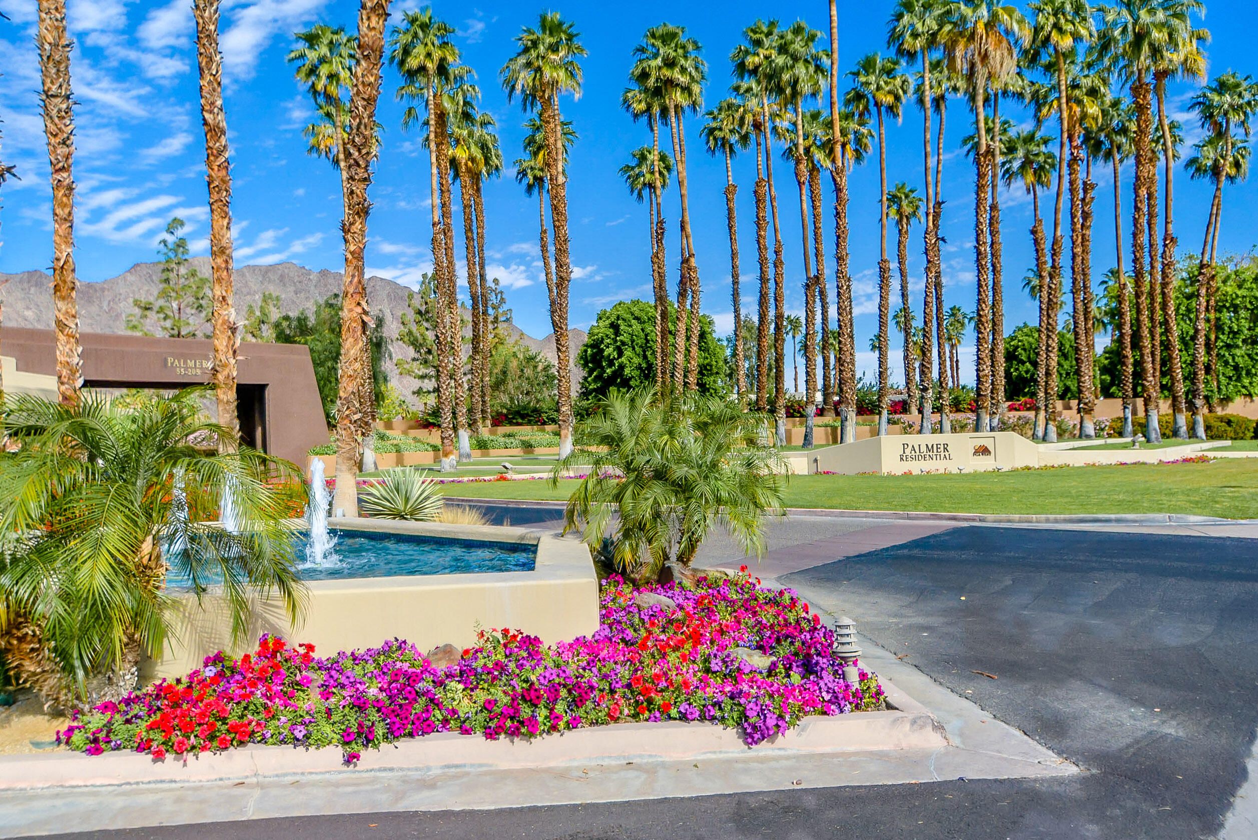 Welcome to an exceptional residence in the prestigious Palmer Private community at PGA West, showcasing the highly sought-after Champion 2 floor plan with sweeping panoramic views of the 3rd and 4th fairways. Offering 2 bedrooms, 2 bathrooms, and 1,549 square feet of thoughtfully designed living space, this home captures the essence of elevated desert living. The expansive outdoor living spaces are designed to fully embrace this extraordinary setting, creating the perfect environment to relax, entertain, and savor the beauty of the desert. Whether enjoying a quiet morning coffee or hosting unforgettable sunset gatherings under clear blue skies, the picturesque golf course setting provides both privacy and an ever-changing backdrop of natural beauty. Inside, the single-level design blends comfort and sophistication, featuring high ceilings and elegant Versailles-pattern travertine flooring throughout. Walls of glass invite natural light to pour in while framing stunning views from nearly every angle, seamlessly connecting indoor and outdoor living. The open-concept living area creates a warm, welcoming atmosphere ideal for both everyday living and refined entertaining. The kitchen is beautifully updated with rich honey-toned cabinetry, granite countertops, and stainless steel appliances--offering both style and functionality. A versatile den/office provides flexibility for guests or a private workspace, while two spacious ensuite bedrooms are thoughtfully positioned on opposite sides of the home, ensuring privacy and comfort for both residents and visitors. The HOA provides extensive coverage, including exterior maintenance, roof, paint, landscaping of all yard areas, irrigation water and equipment, trash service, cable and internet, earthquake insurance, and 24-hour guarded security--allowing for true low-maintenance ownership within one of La Quinta's premier golf communities. Offered furnished and inclusive of a golf cart, this home presents a seamless turnkey opportunity--allowing you to immediately enjoy the luxury lifestyle and world-class amenities that PGA West has to offer.