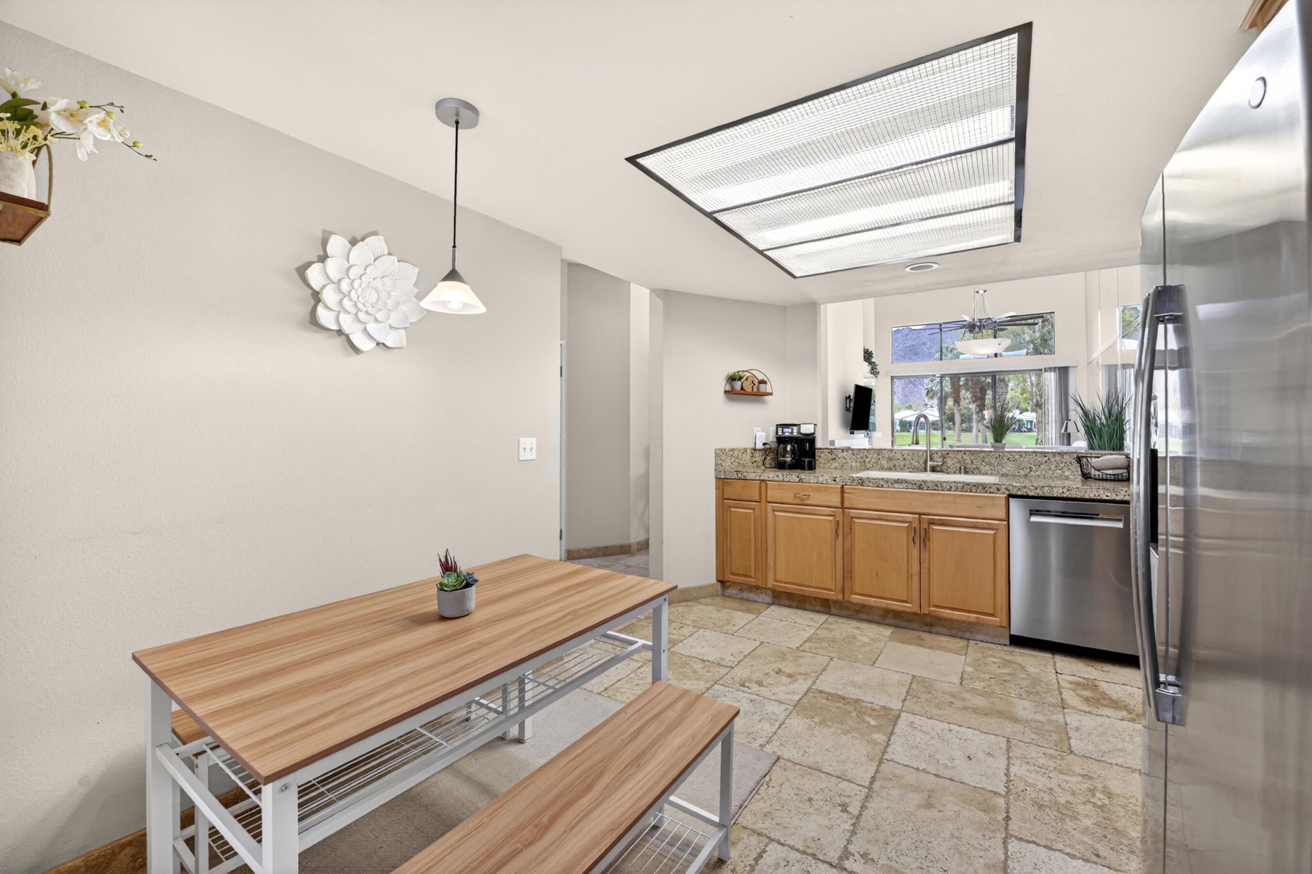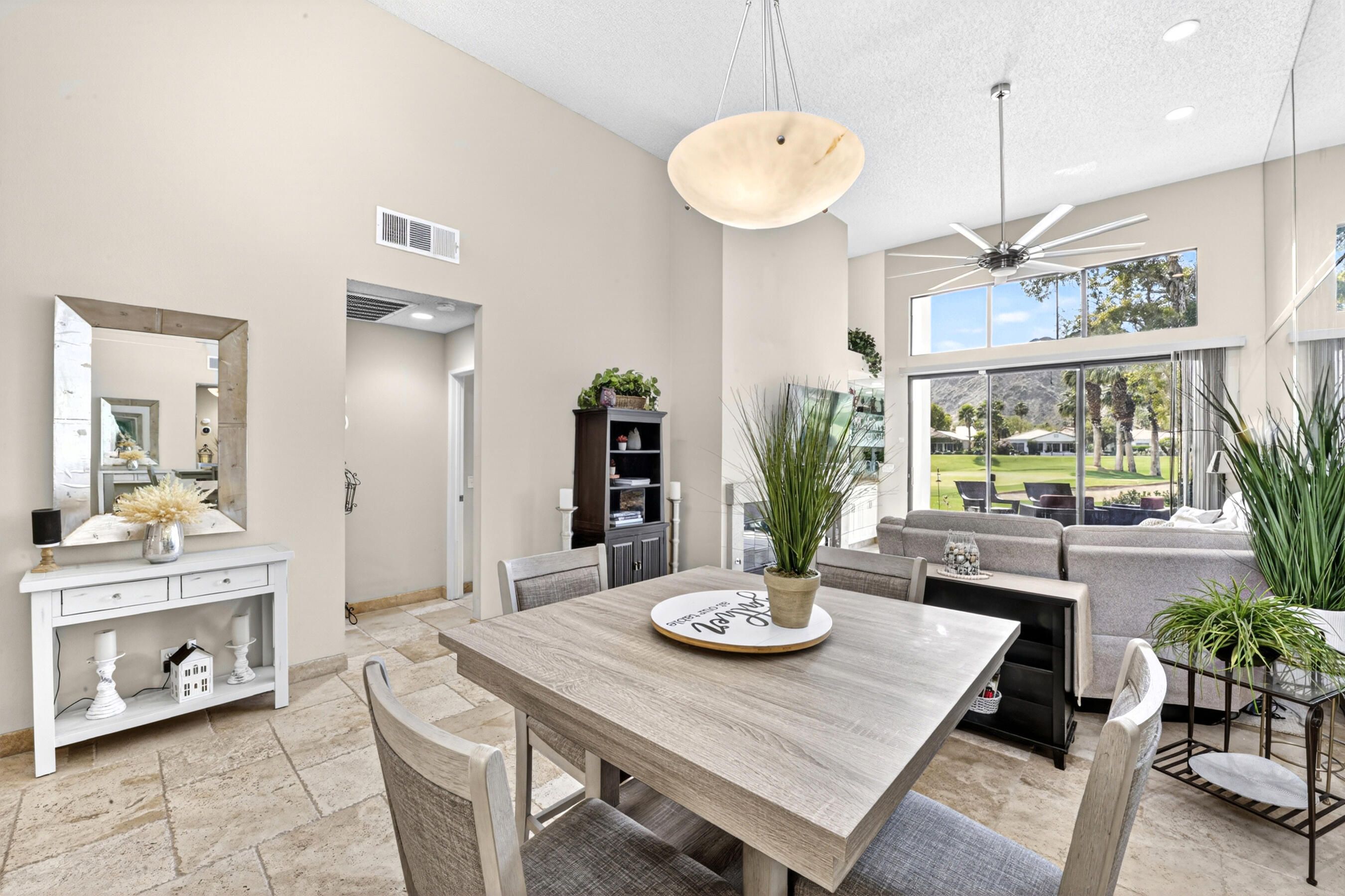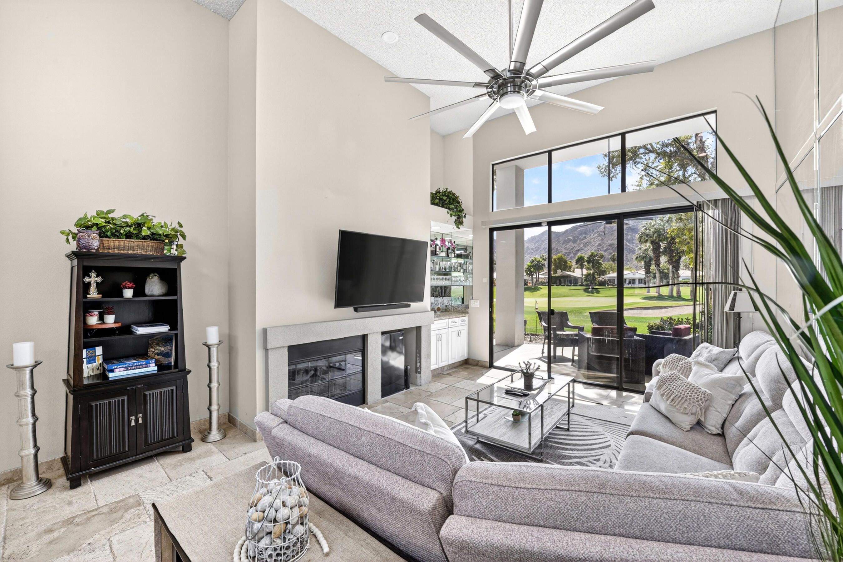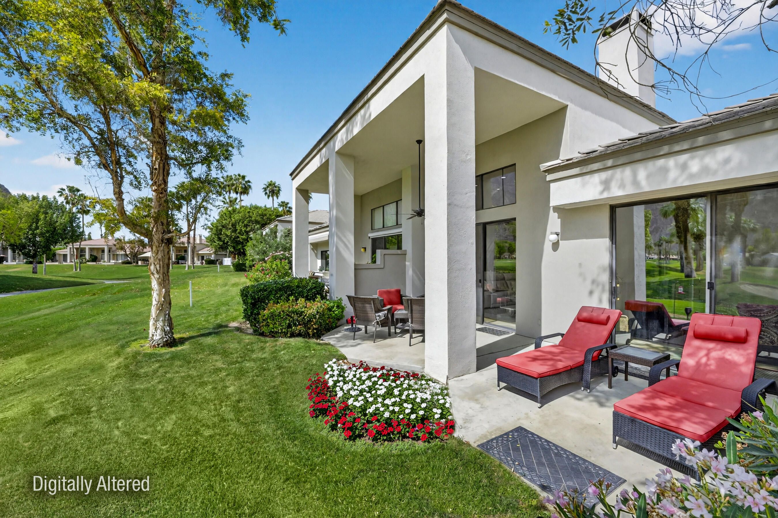 Welcome to an exceptional residence in the prestigious Palmer Private community at PGA West, showcasing the highly sought-after Champion 2 floor plan with sweeping panoramic views of the 3rd and 4th fairways. Offering 2 bedrooms, 2 bathrooms, and 1,549 square feet of thoughtfully designed living space, this home captures the essence of elevated desert living. The expansive outdoor living spaces are designed to fully embrace this extraordinary setting, creating the perfect environment to relax, entertain, and savor the beauty of the desert. Whether enjoying a quiet morning coffee or hosting unforgettable sunset gatherings under clear blue skies, the picturesque golf course setting provides both privacy and an ever-changing backdrop of natural beauty. Inside, the single-level design blends comfort and sophistication, featuring high ceilings and elegant Versailles-pattern travertine flooring throughout. Walls of glass invite natural light to pour in while framing stunning views from nearly every angle, seamlessly connecting indoor and outdoor living. The open-concept living area creates a warm, welcoming atmosphere ideal for both everyday living and refined entertaining. The kitchen is beautifully updated with rich honey-toned cabinetry, granite countertops, and stainless steel appliances--offering both style and functionality. A versatile den/office provides flexibility for guests or a private workspace, while two spacious ensuite bedrooms are thoughtfully positioned on opposite sides of the home, ensuring privacy and comfort for both residents and visitors. The HOA provides extensive coverage, including exterior maintenance, roof, paint, landscaping of all yard areas, irrigation water and equipment, trash service, cable and internet, earthquake insurance, and 24-hour guarded security--allowing for true low-maintenance ownership within one of La Quinta's premier golf communities. Offered furnished and inclusive of a golf cart, this home presents a seamless turnkey opportunity--allowing you to immediately enjoy the luxury lifestyle and world-class amenities that PGA West has to offer.