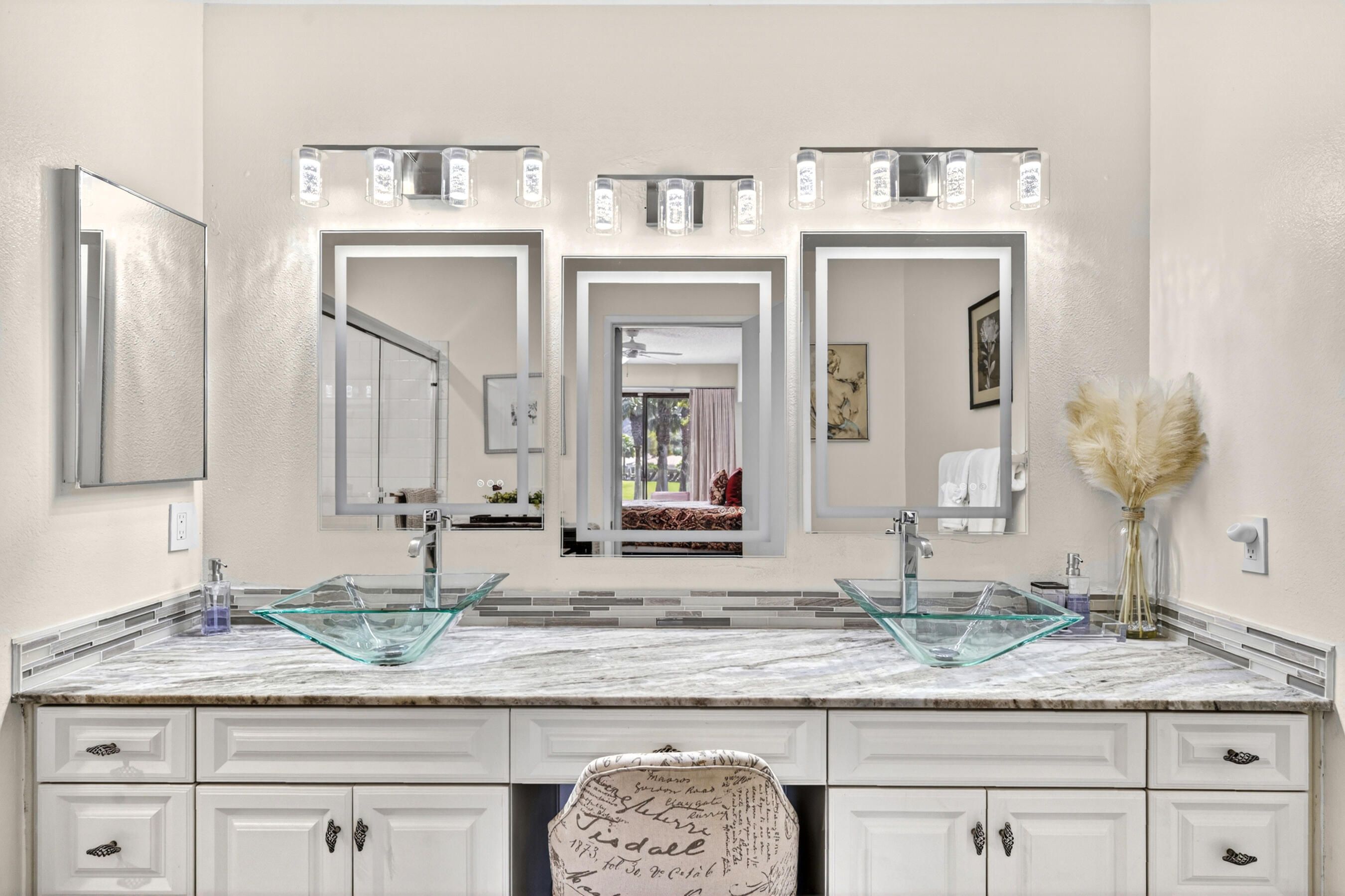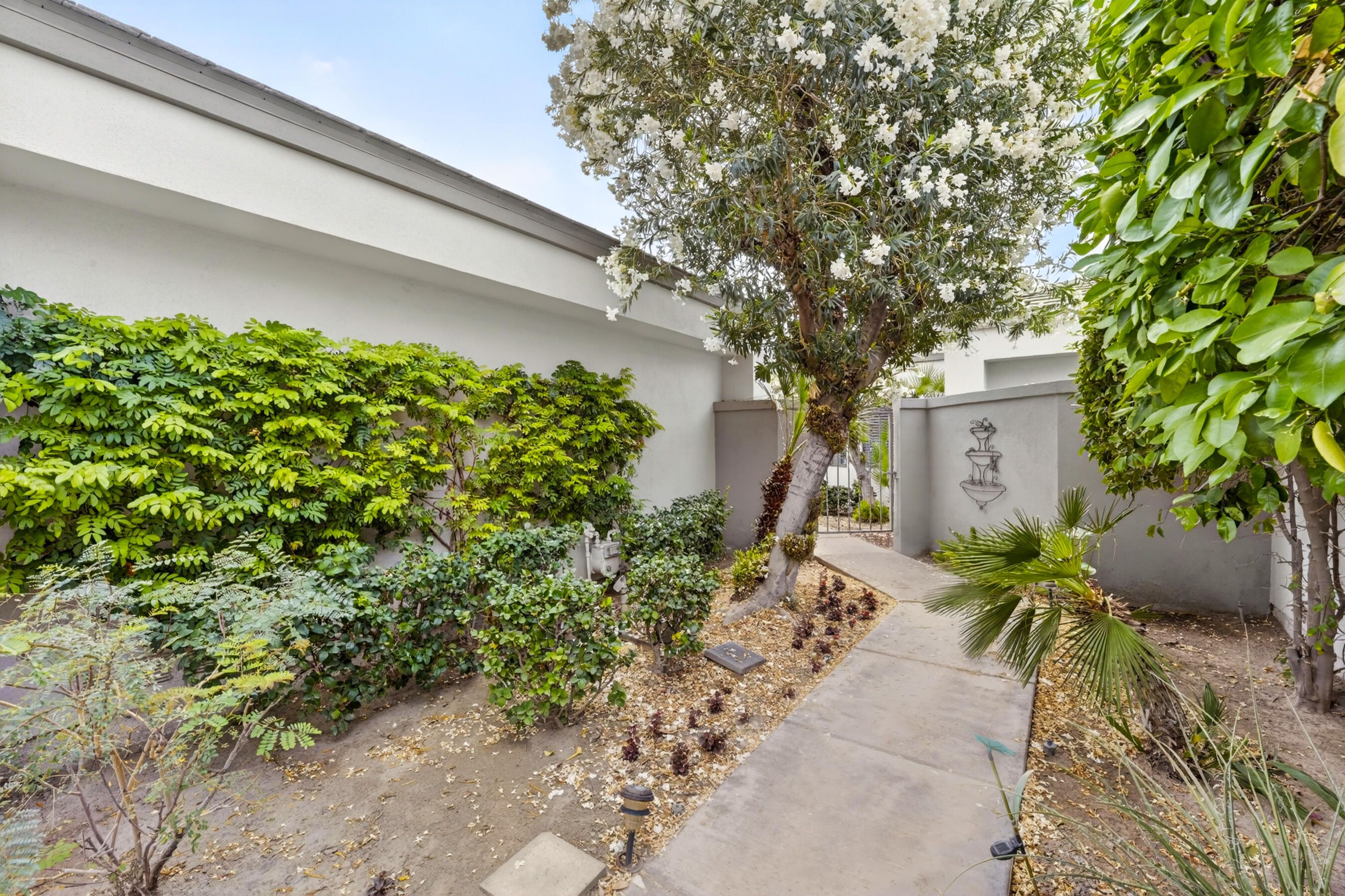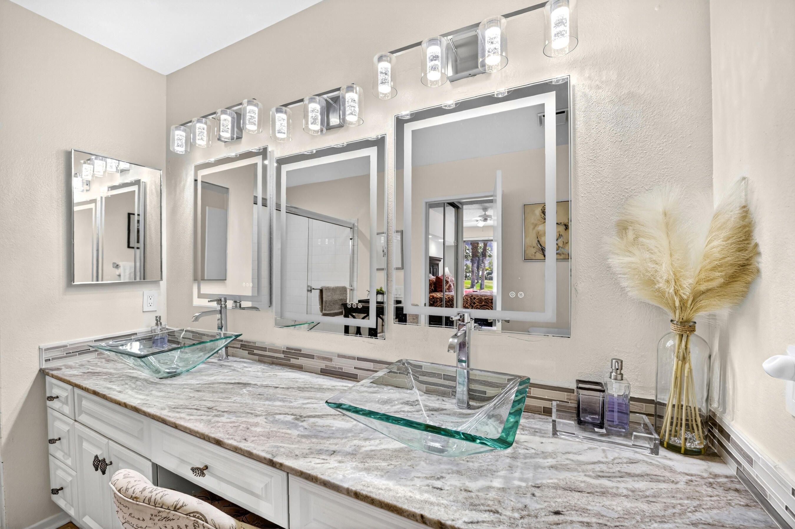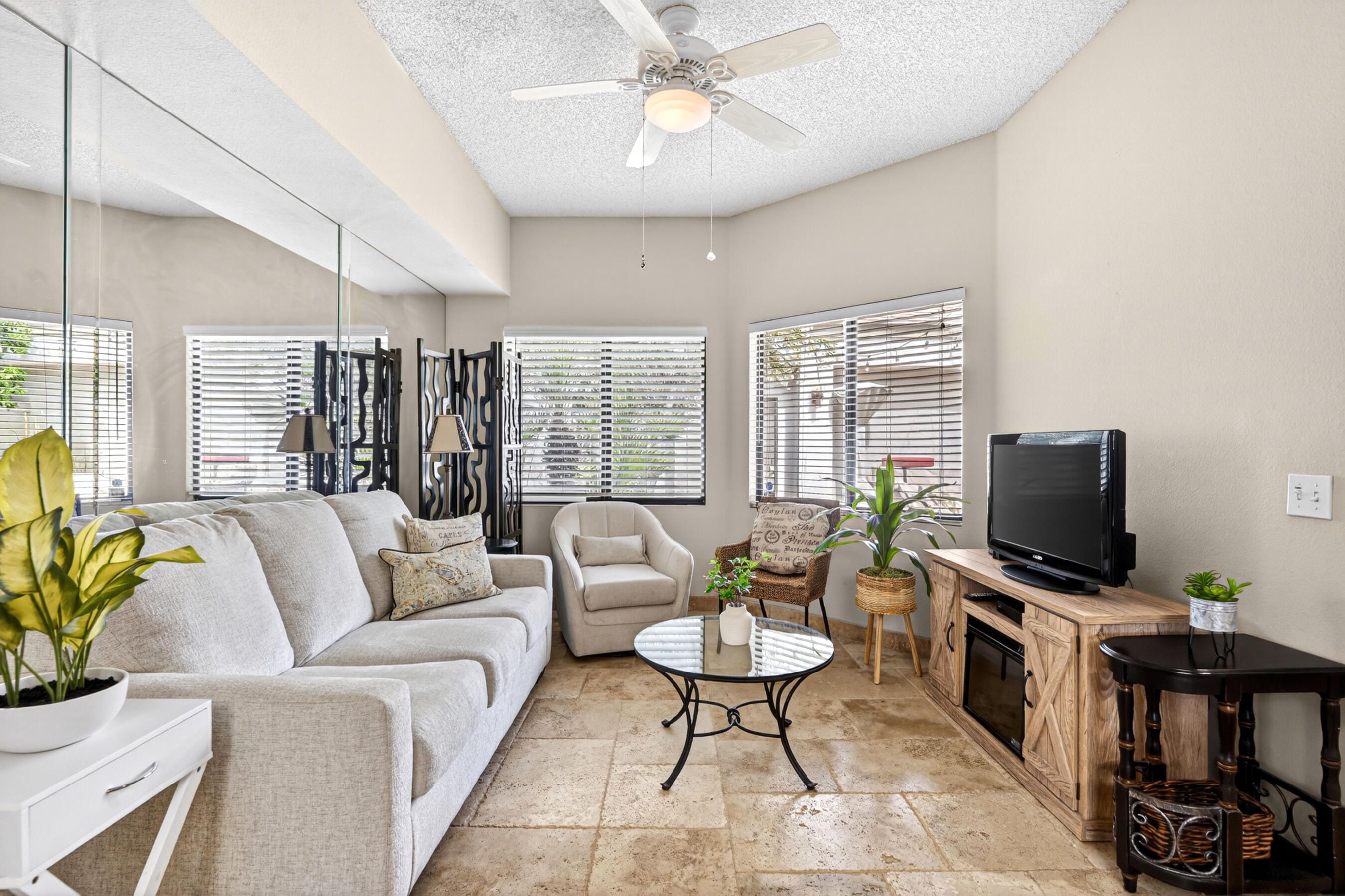 Welcome to an exceptional residence in the prestigious Palmer Private community at PGA West, showcasing the highly sought-after Champion 2 floor plan with sweeping panoramic views of the 3rd and 4th fairways. Offering 2 bedrooms, 2 bathrooms, and 1,549 square feet of thoughtfully designed living space, this home captures the essence of elevated desert living. The expansive outdoor living spaces are designed to fully embrace this extraordinary setting, creating the perfect environment to relax, entertain, and savor the beauty of the desert. Whether enjoying a quiet morning coffee or hosting unforgettable sunset gatherings under clear blue skies, the picturesque golf course setting provides both privacy and an ever-changing backdrop of natural beauty. Inside, the single-level design blends comfort and sophistication, featuring high ceilings and elegant Versailles-pattern travertine flooring throughout. Walls of glass invite natural light to pour in while framing stunning views from nearly every angle, seamlessly connecting indoor and outdoor living. The open-concept living area creates a warm, welcoming atmosphere ideal for both everyday living and refined entertaining. The kitchen is beautifully updated with rich honey-toned cabinetry, granite countertops, and stainless steel appliances--offering both style and functionality. A versatile den/office provides flexibility for guests or a private workspace, while two spacious ensuite bedrooms are thoughtfully positioned on opposite sides of the home, ensuring privacy and comfort for both residents and visitors. The HOA provides extensive coverage, including exterior maintenance, roof, paint, landscaping of all yard areas, irrigation water and equipment, trash service, cable and internet, earthquake insurance, and 24-hour guarded security--allowing for true low-maintenance ownership within one of La Quinta's premier golf communities. Offered furnished and inclusive of a golf cart, this home presents a seamless turnkey opportunity--allowing you to immediately enjoy the luxury lifestyle and world-class amenities that PGA West has to offer.