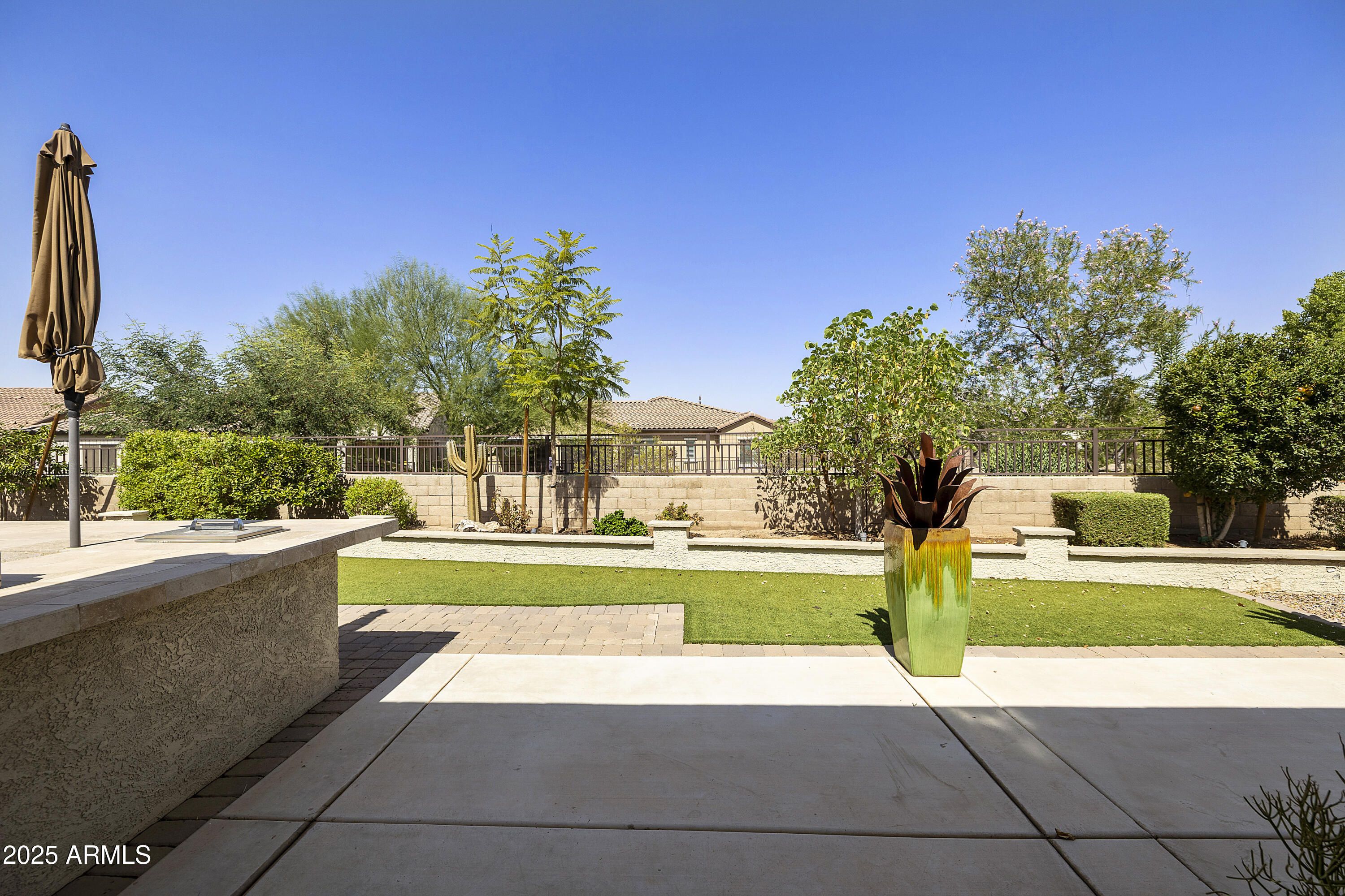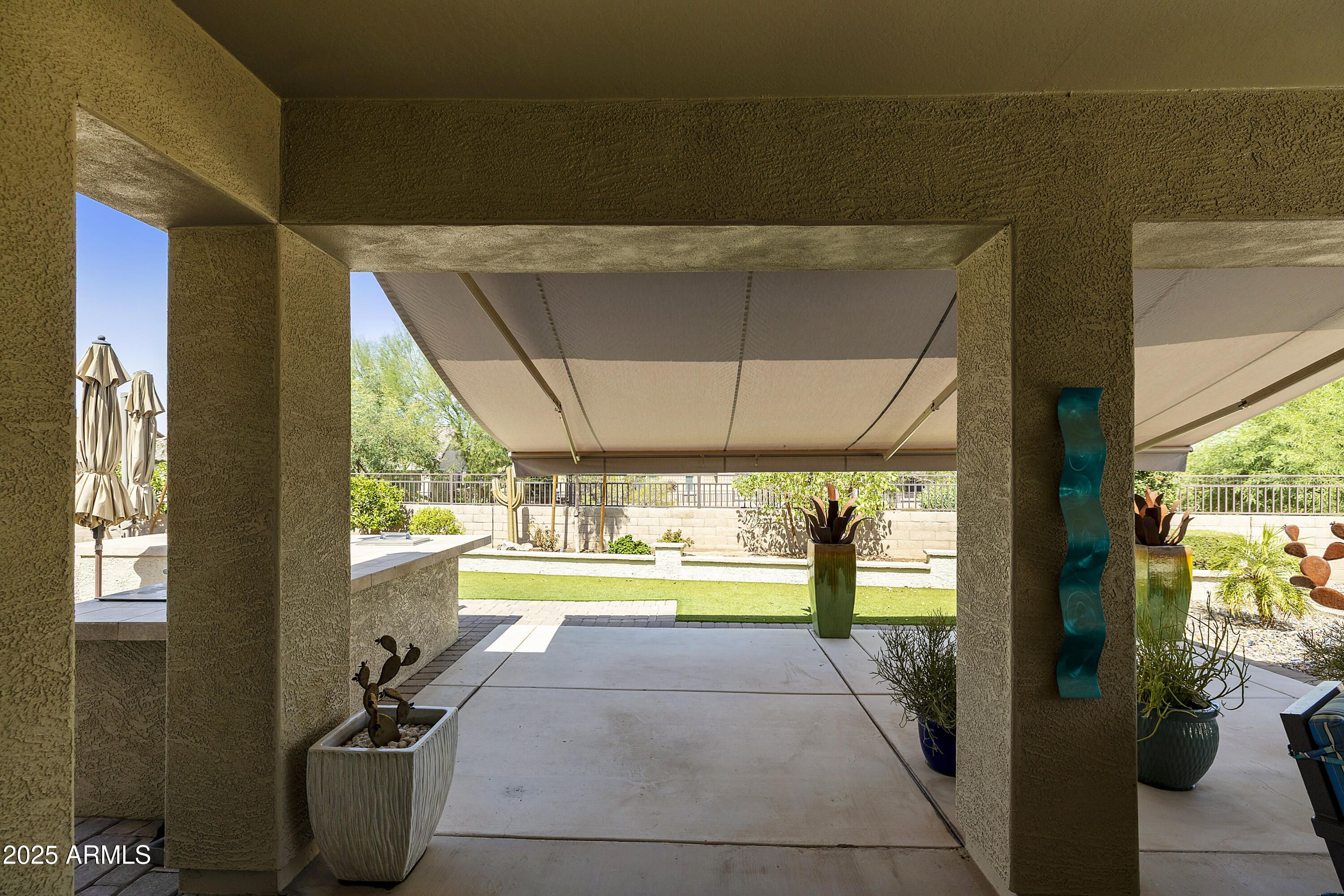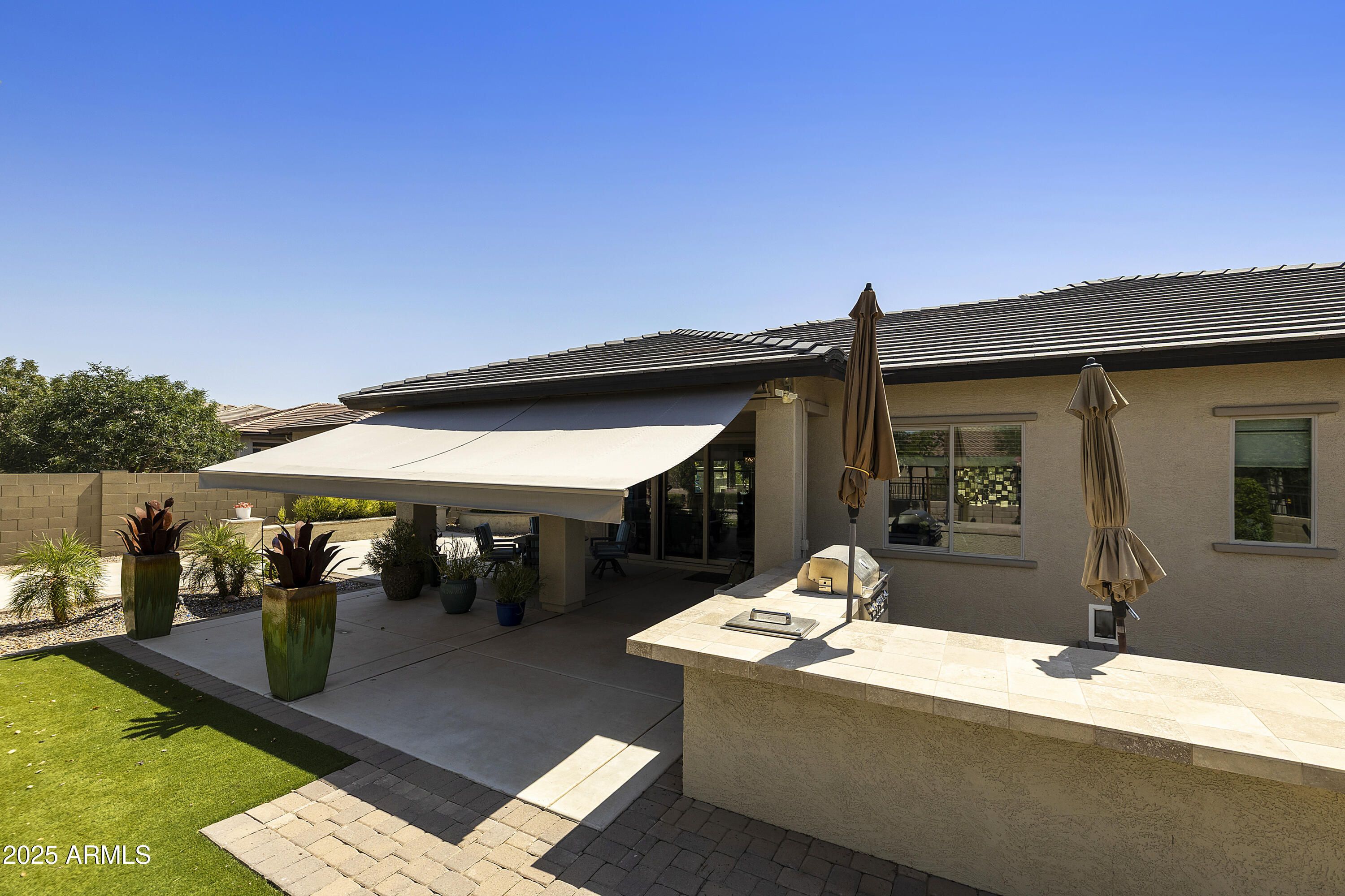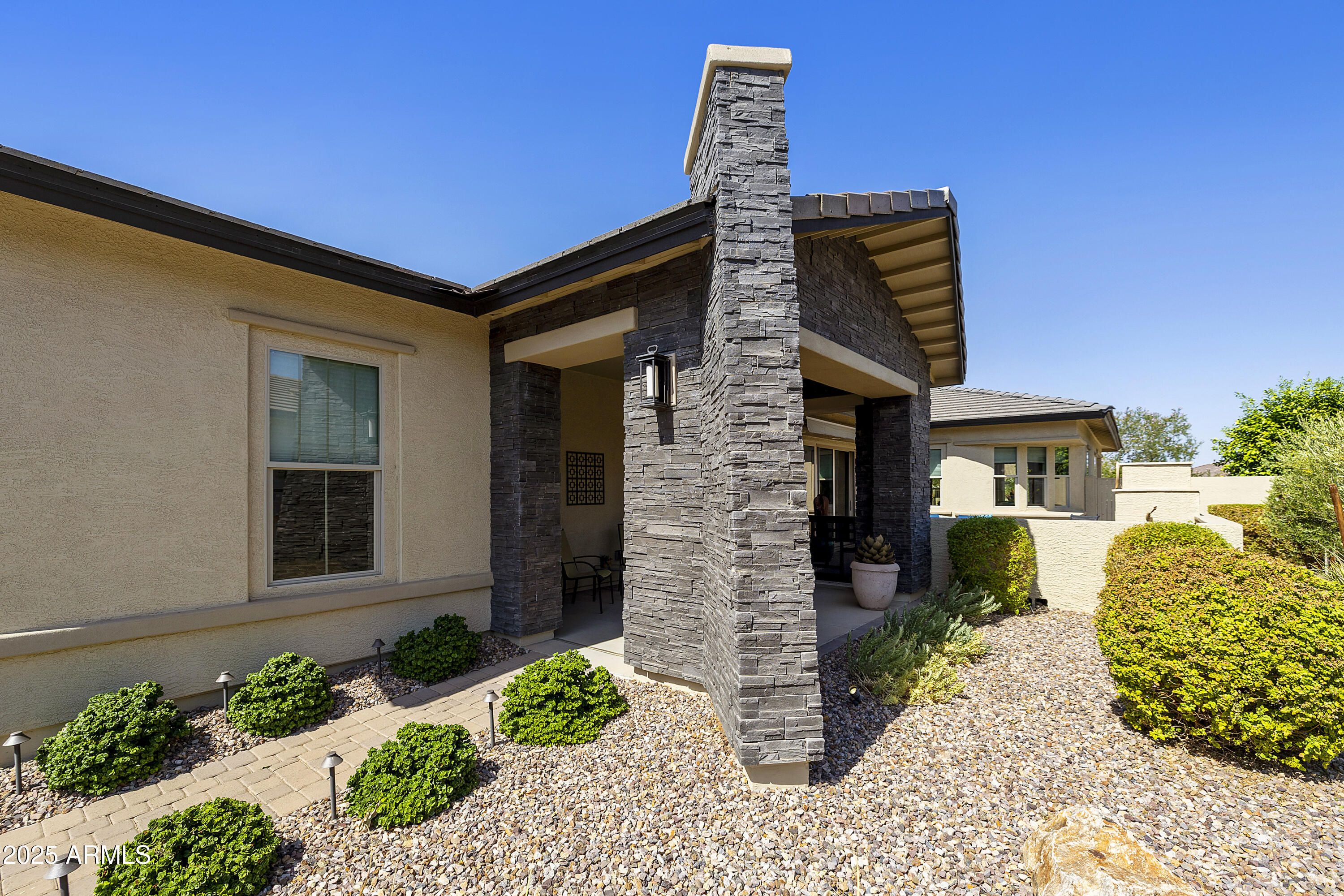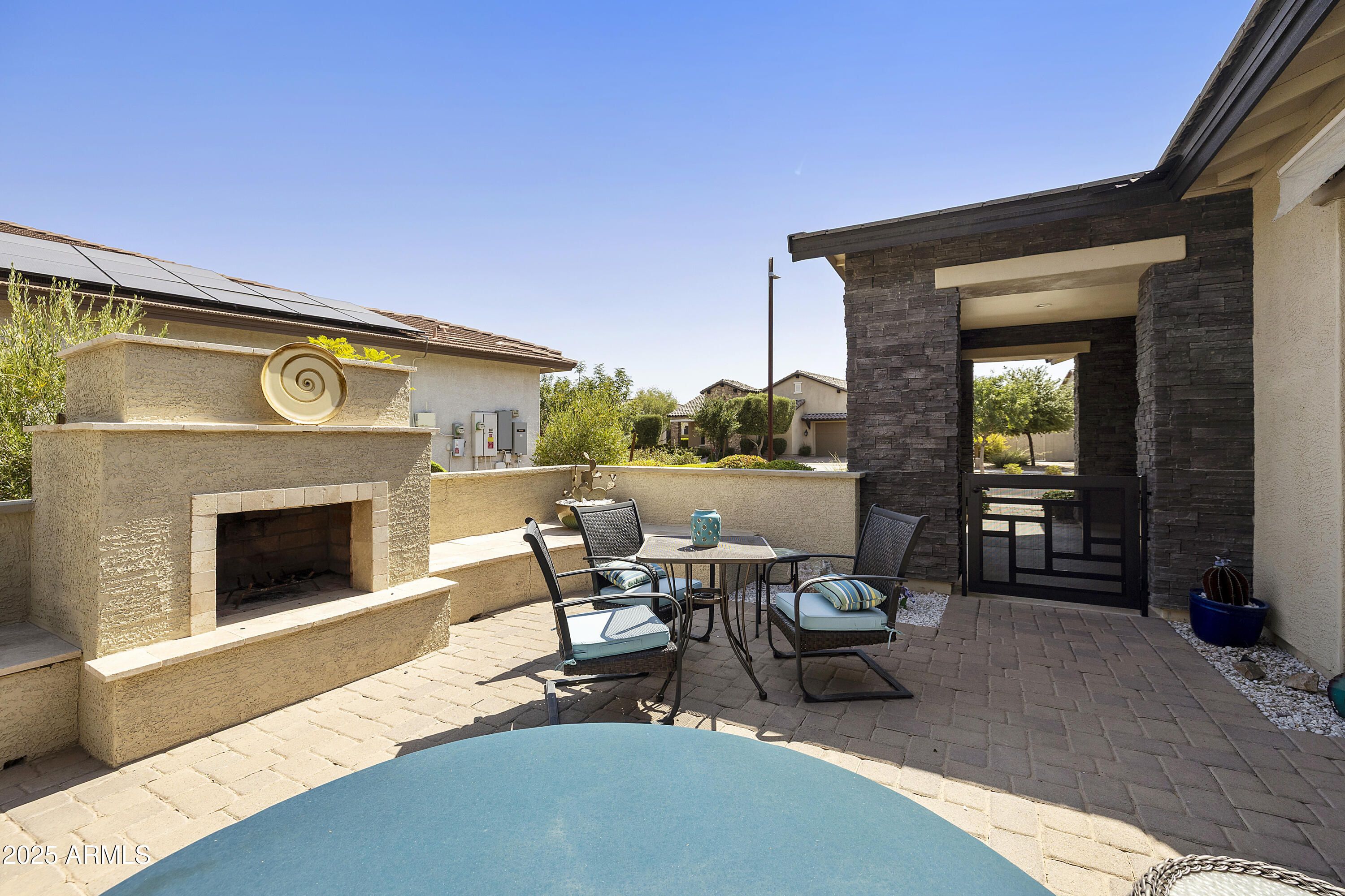 This highly sought after concert floor plan offers an abundance of thoughtful features & comfortable living space. The flexible floor plan includes 2 well-appointed en-suites, each with a W-I closet & private bthm with dual sinks, framed mirrors, & W-I shower. The gourmet kitchen boasts Jenn-Air appliances (3 ovens & gas range), an oversized center island with cabinetry on both sides, & upgraded granite countertops. The wet bar in the flex/dining rm provides an ideal space for entertaining & access through the multi-slider to the gated courtyard with B-I fireplace creates additional entertainment space. The great rm features a stunning stone wall with electric fireplace. The second multi-slider is off the great room & leads to the professionally landscaped yard with extended covered... ...patio & mechanical awning, & B-I BBQ creating an ideal indoor-outdoor living space. The home boarders a walking path & common area, offering a private tranquil setting. Additional features include oversized laundry rm with ample cabinet storage & a utility sink. There is also a den/sitting rm off the primary bdrm, a lg W-I pantry, & custom shutters in most rooms. The open-concept floor plan with wood-look tile T/O creates a cohesive & welcoming atmosphere. In addition, the home offers an extended 2-car garage with overhead storage, a water softener, tankless water heater & 22 seer air conditioners. You will also love the lifestyle at Encore at Eastmark, offering many activities & clubs. Are you looking for pickle ball, tennis, bocci ball, craft rm with 2 kilns, billiard rm, meeting rms, library, Proving Ground Café & many places to make new friends? Then Encore maybe for you!!!