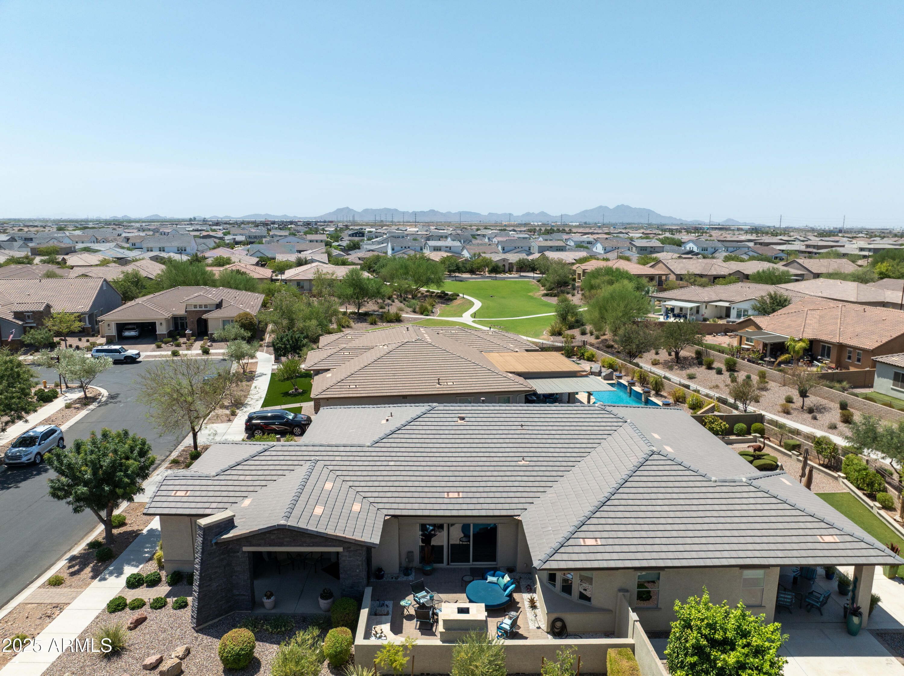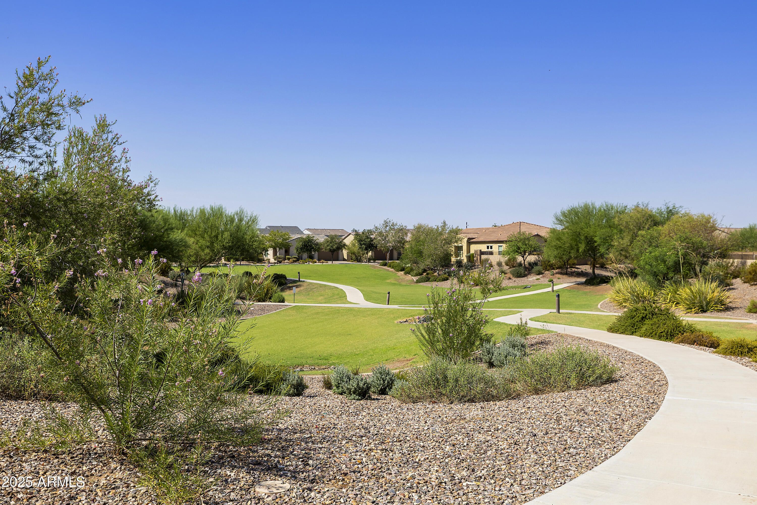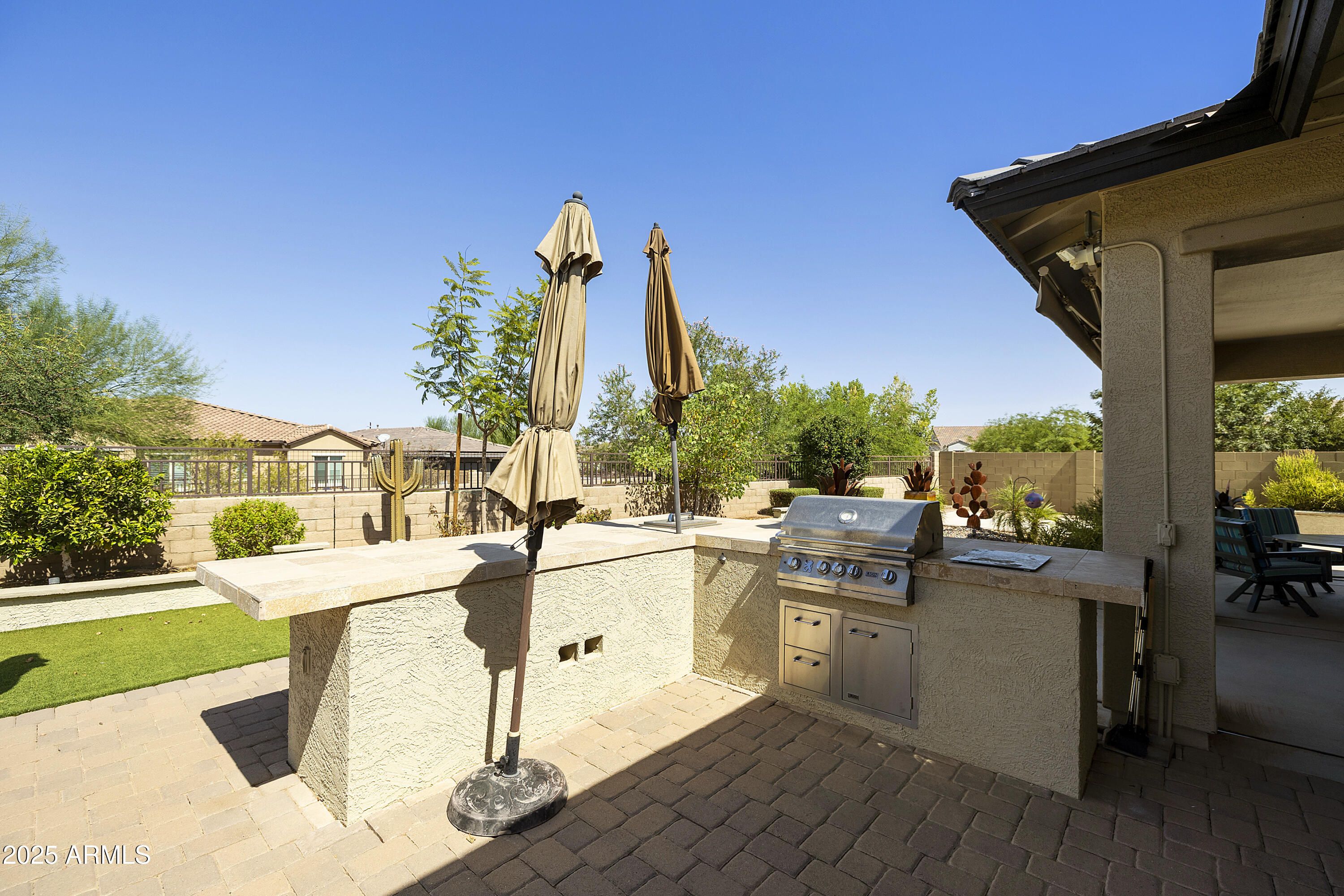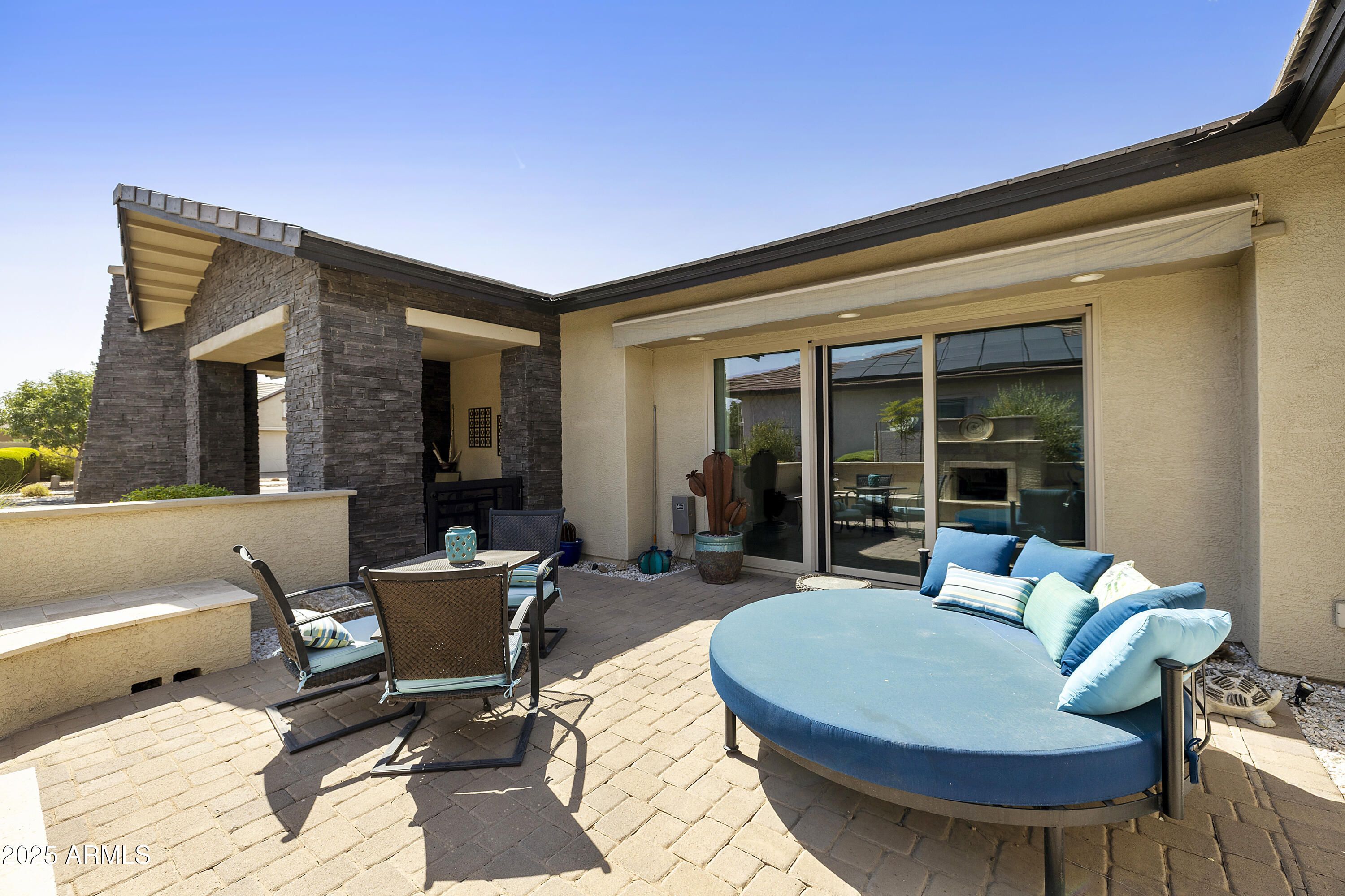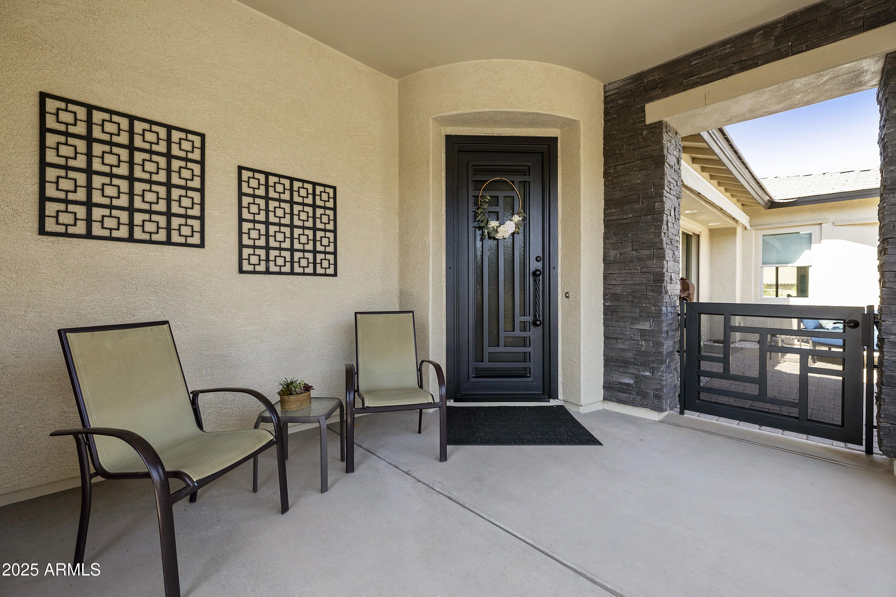 This highly sought after concert floor plan offers an abundance of thoughtful features & comfortable living space. The flexible floor plan includes 2 well-appointed en-suites, each with a W-I closet & private bthm with dual sinks, framed mirrors, & W-I shower. The gourmet kitchen boasts Jenn-Air appliances (3 ovens & gas range), an oversized center island with cabinetry on both sides, & upgraded granite countertops. The wet bar in the flex/dining rm provides an ideal space for entertaining & access through the multi-slider to the gated courtyard with B-I fireplace creates additional entertainment space. The great rm features a stunning stone wall with electric fireplace. The second multi-slider is off the great room & leads to the professionally landscaped yard with extended covered... ...patio & mechanical awning, & B-I BBQ creating an ideal indoor-outdoor living space. The home boarders a walking path & common area, offering a private tranquil setting. Additional features include oversized laundry rm with ample cabinet storage & a utility sink. There is also a den/sitting rm off the primary bdrm, a lg W-I pantry, & custom shutters in most rooms. The open-concept floor plan with wood-look tile T/O creates a cohesive & welcoming atmosphere. In addition, the home offers an extended 2-car garage with overhead storage, a water softener, tankless water heater & 22 seer air conditioners. You will also love the lifestyle at Encore at Eastmark, offering many activities & clubs. Are you looking for pickle ball, tennis, bocci ball, craft rm with 2 kilns, billiard rm, meeting rms, library, Proving Ground Café & many places to make new friends? Then Encore maybe for you!!!