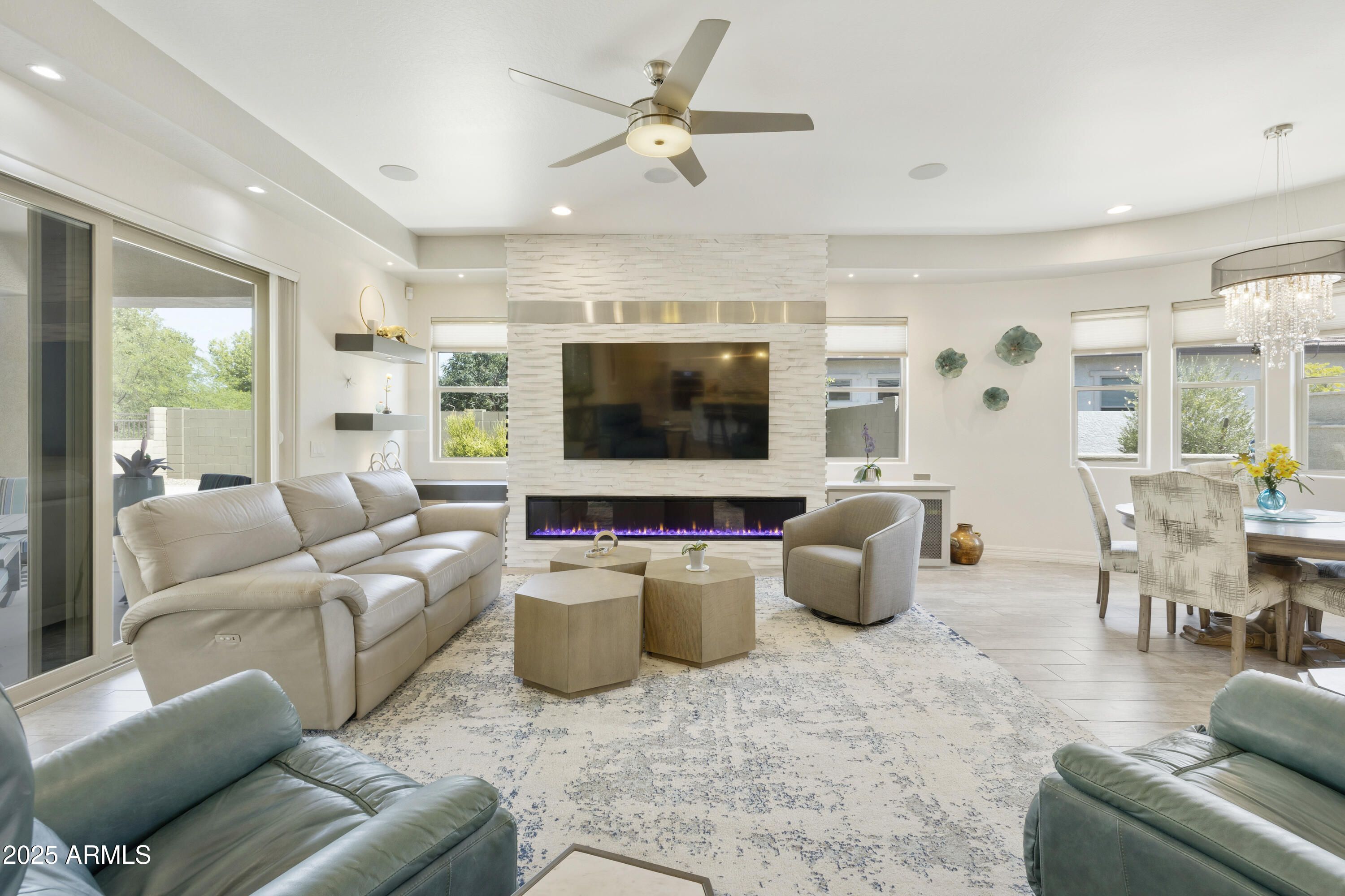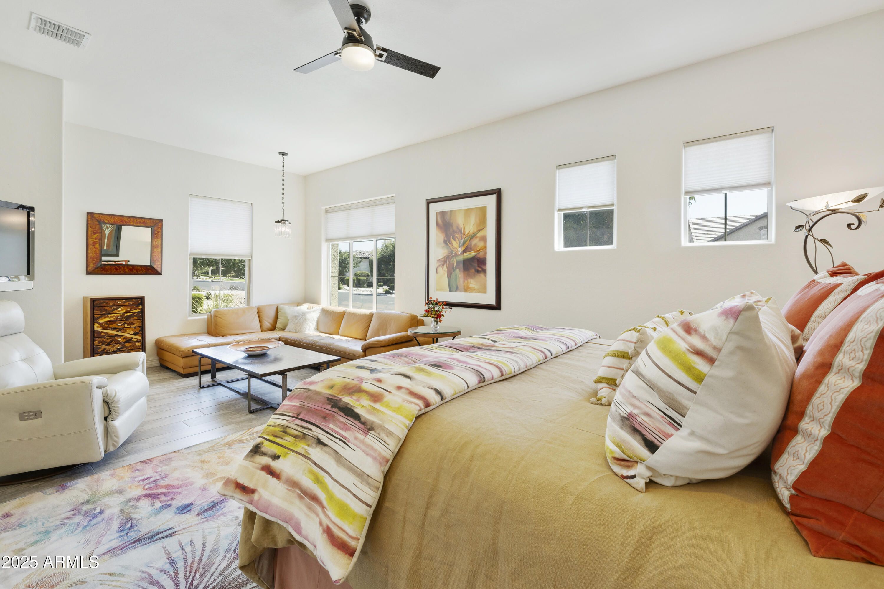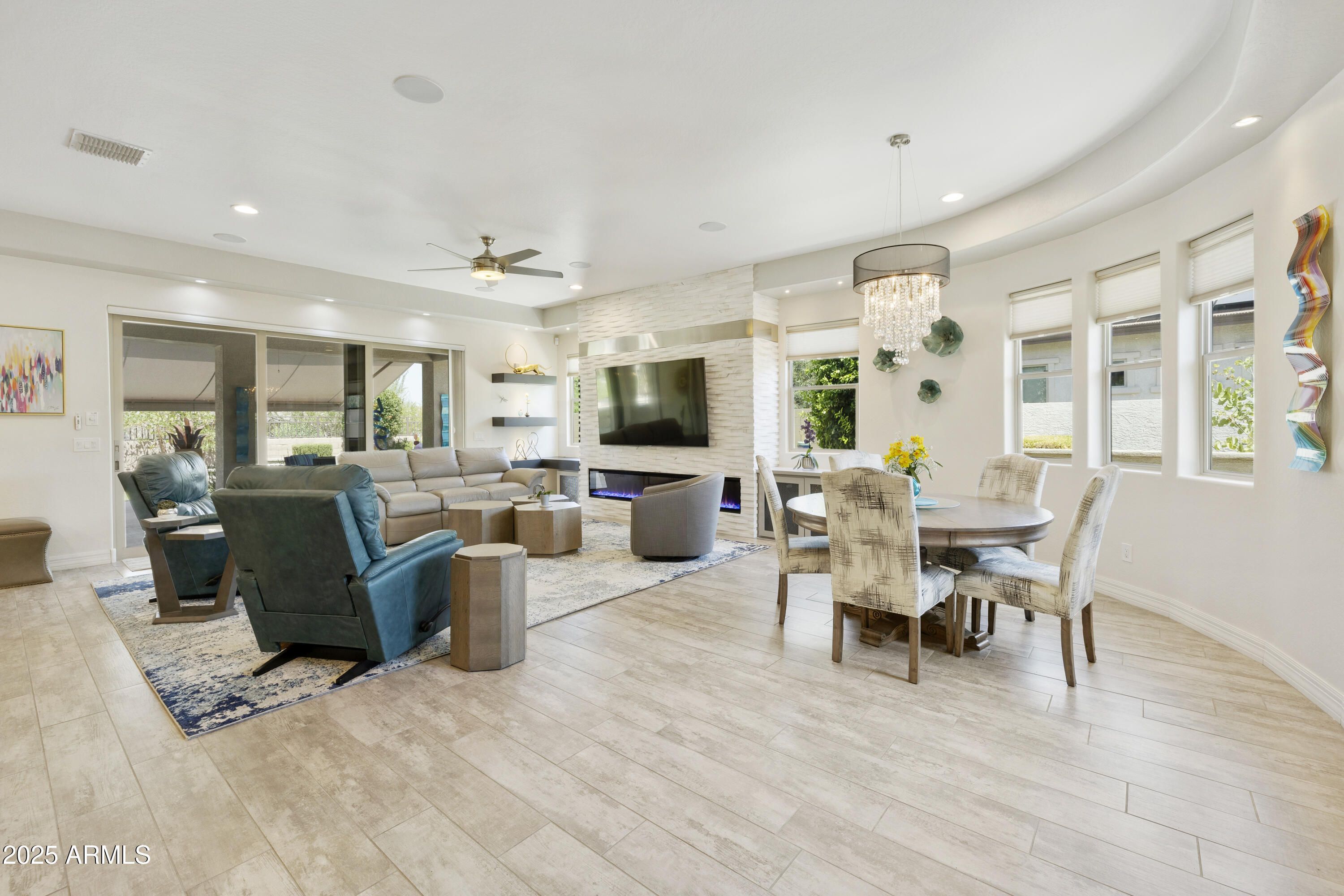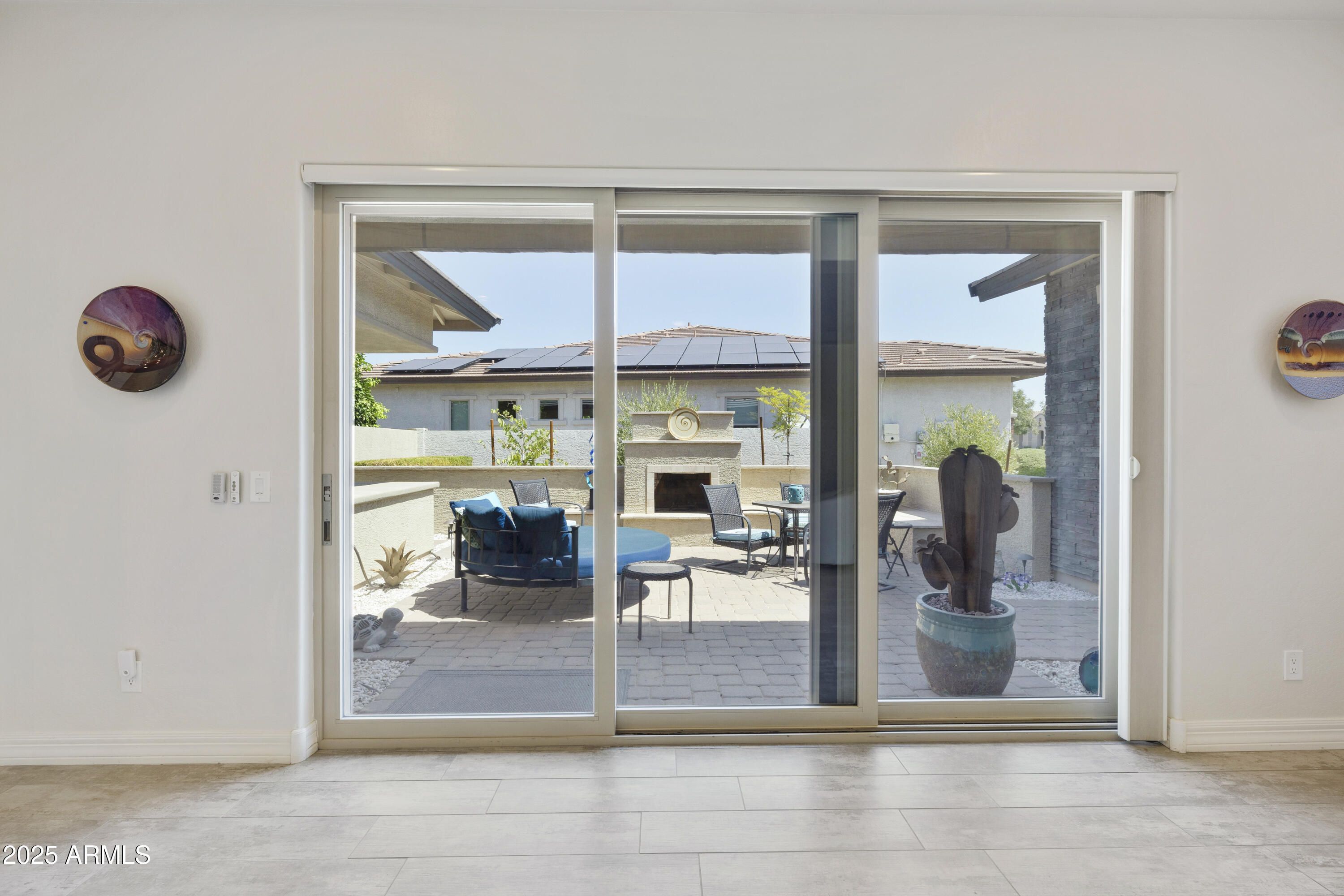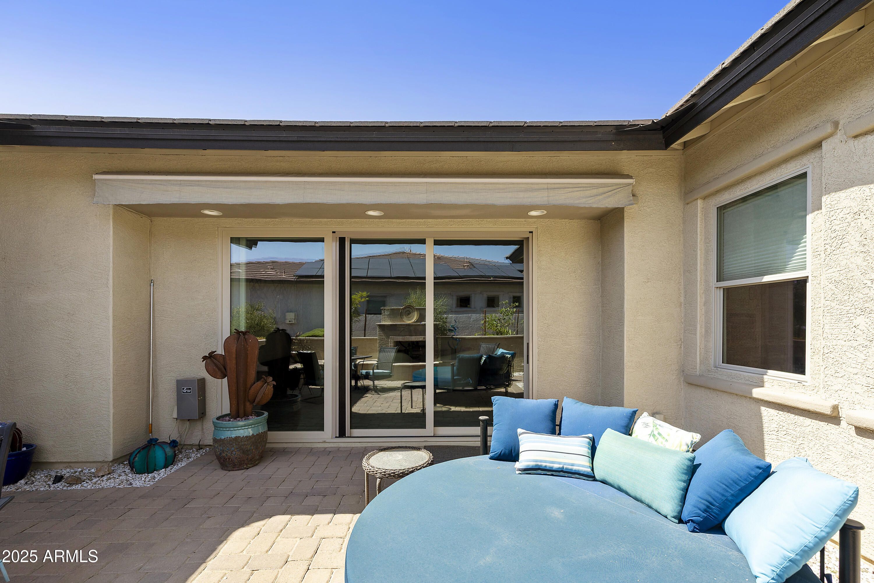 This highly sought after concert floor plan offers an abundance of thoughtful features & comfortable living space. The flexible floor plan includes 2 well-appointed en-suites, each with a W-I closet & private bthm with dual sinks, framed mirrors, & W-I shower. The gourmet kitchen boasts Jenn-Air appliances (3 ovens & gas range), an oversized center island with cabinetry on both sides, & upgraded granite countertops. The wet bar in the flex/dining rm provides an ideal space for entertaining & access through the multi-slider to the gated courtyard with B-I fireplace creates additional entertainment space. The great rm features a stunning stone wall with electric fireplace. The second multi-slider is off the great room & leads to the professionally landscaped yard with extended covered... ...patio & mechanical awning, & B-I BBQ creating an ideal indoor-outdoor living space. The home boarders a walking path & common area, offering a private tranquil setting. Additional features include oversized laundry rm with ample cabinet storage & a utility sink. There is also a den/sitting rm off the primary bdrm, a lg W-I pantry, & custom shutters in most rooms. The open-concept floor plan with wood-look tile T/O creates a cohesive & welcoming atmosphere. In addition, the home offers an extended 2-car garage with overhead storage, a water softener, tankless water heater & 22 seer air conditioners. You will also love the lifestyle at Encore at Eastmark, offering many activities & clubs. Are you looking for pickle ball, tennis, bocci ball, craft rm with 2 kilns, billiard rm, meeting rms, library, Proving Ground Café & many places to make new friends? Then Encore maybe for you!!!