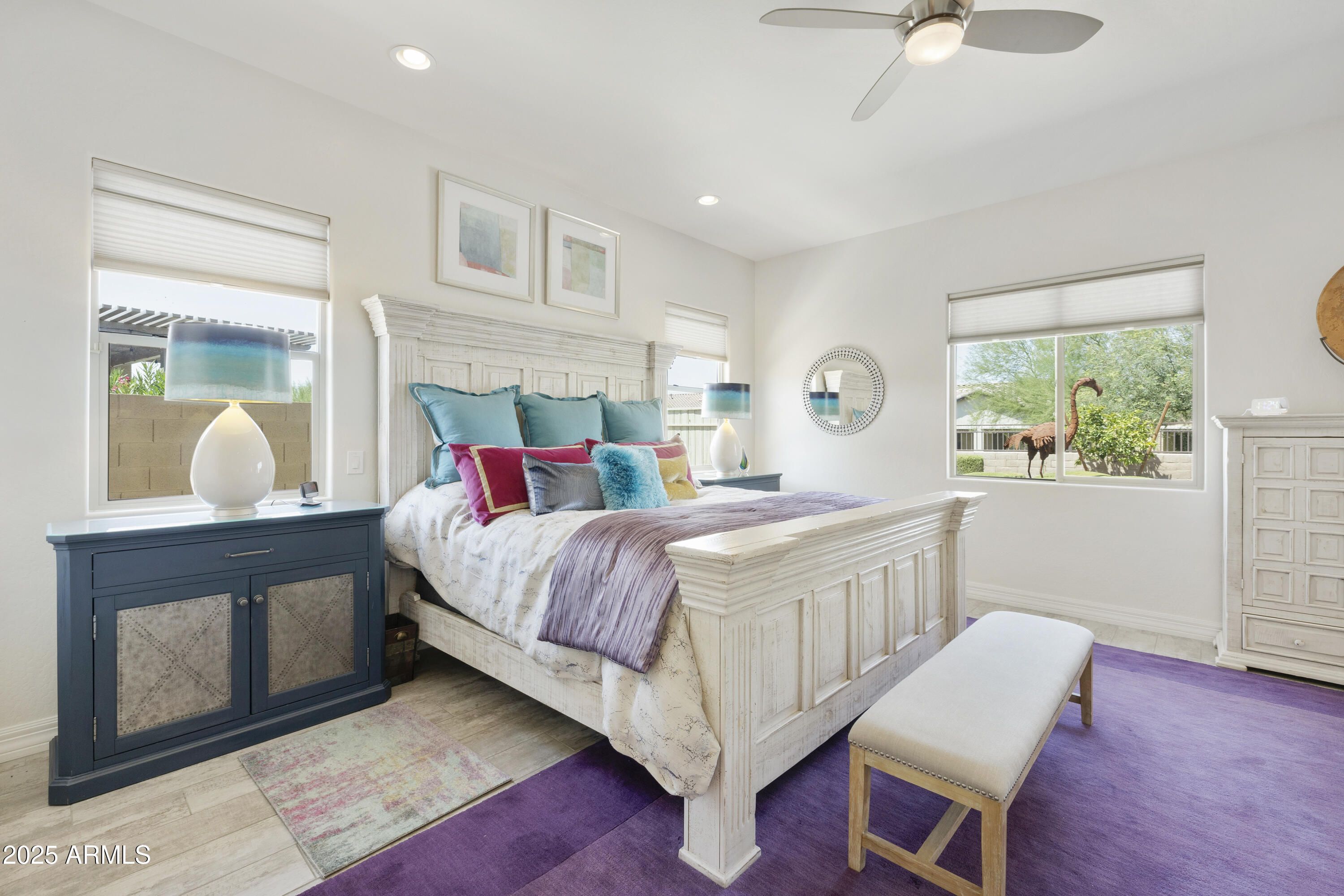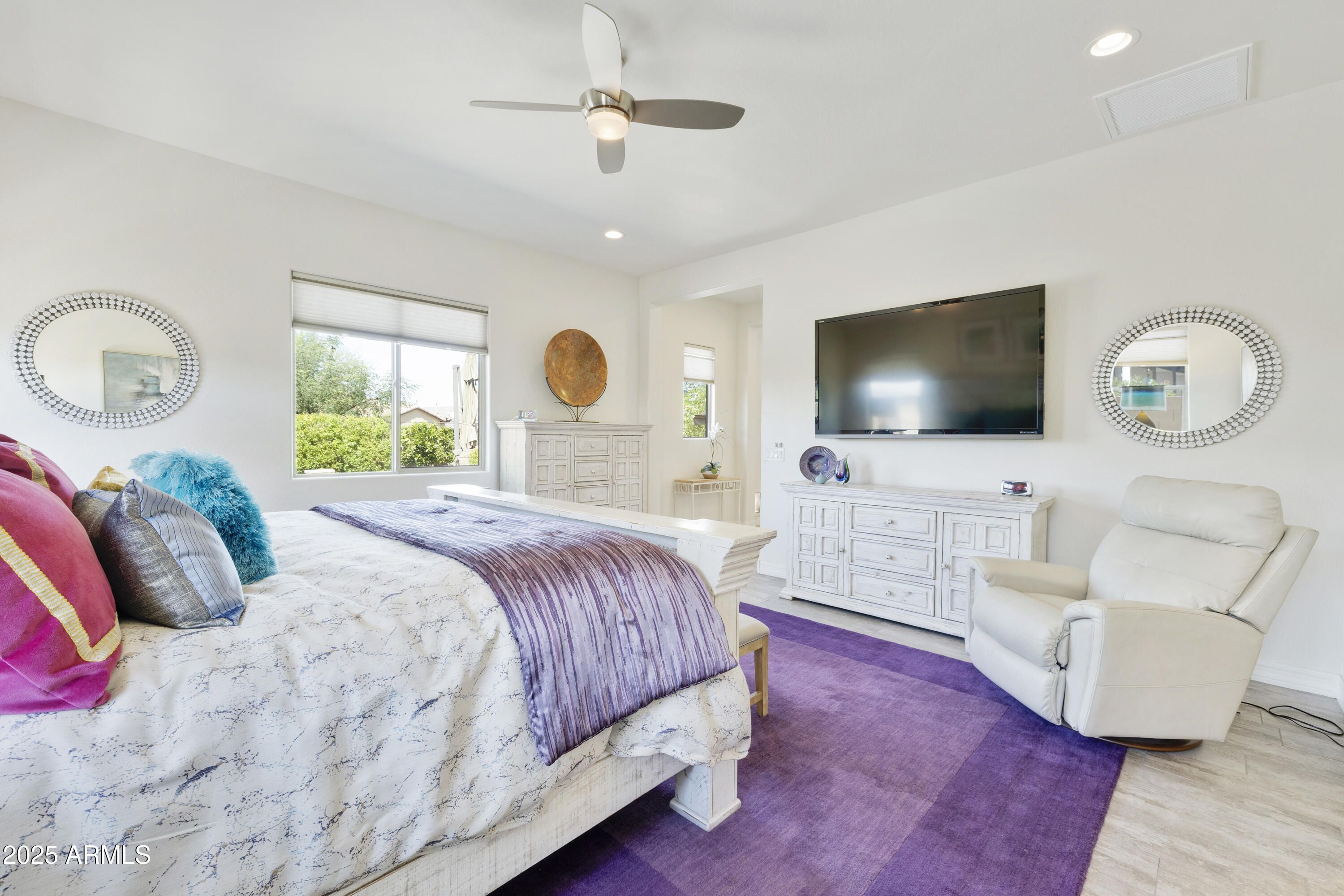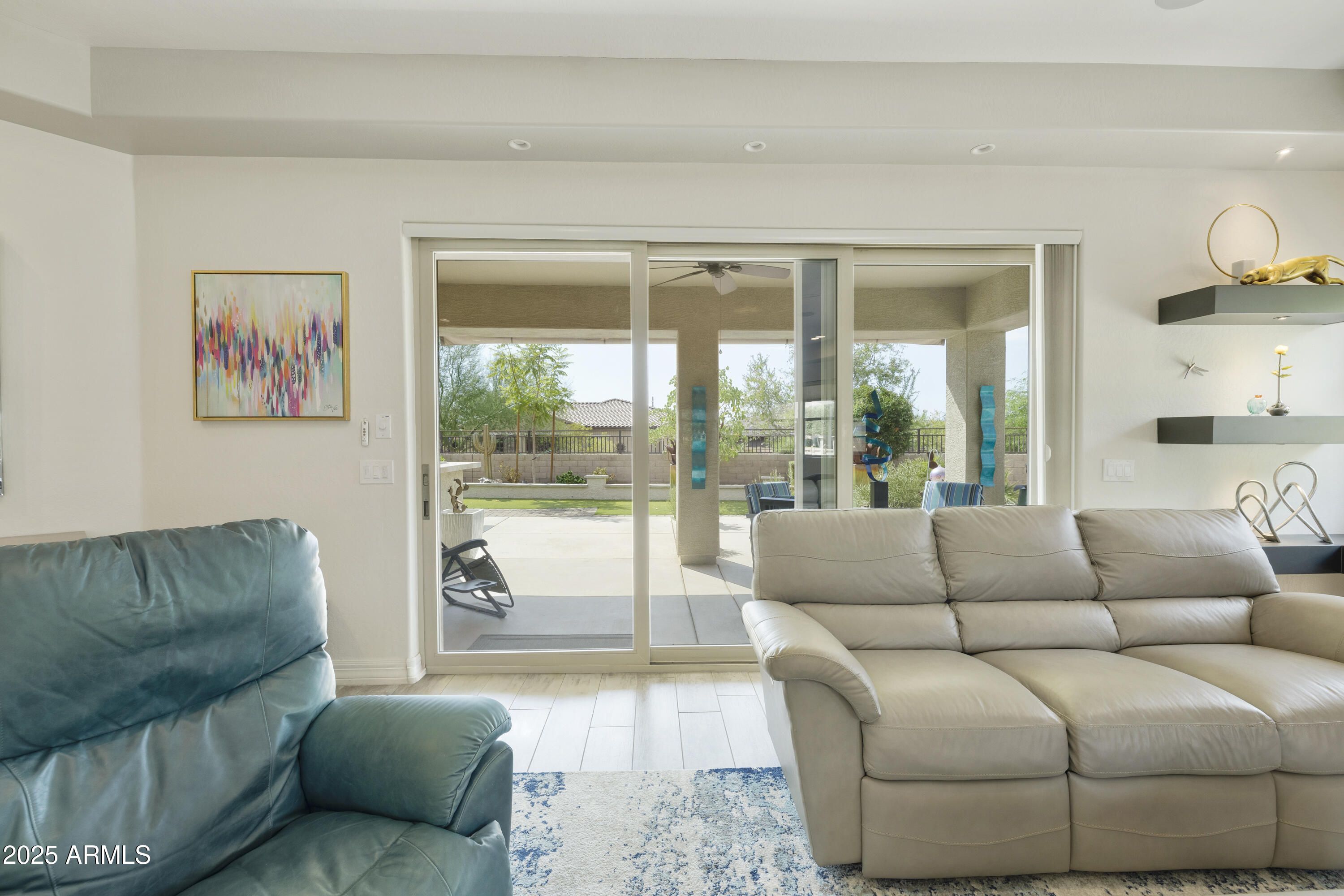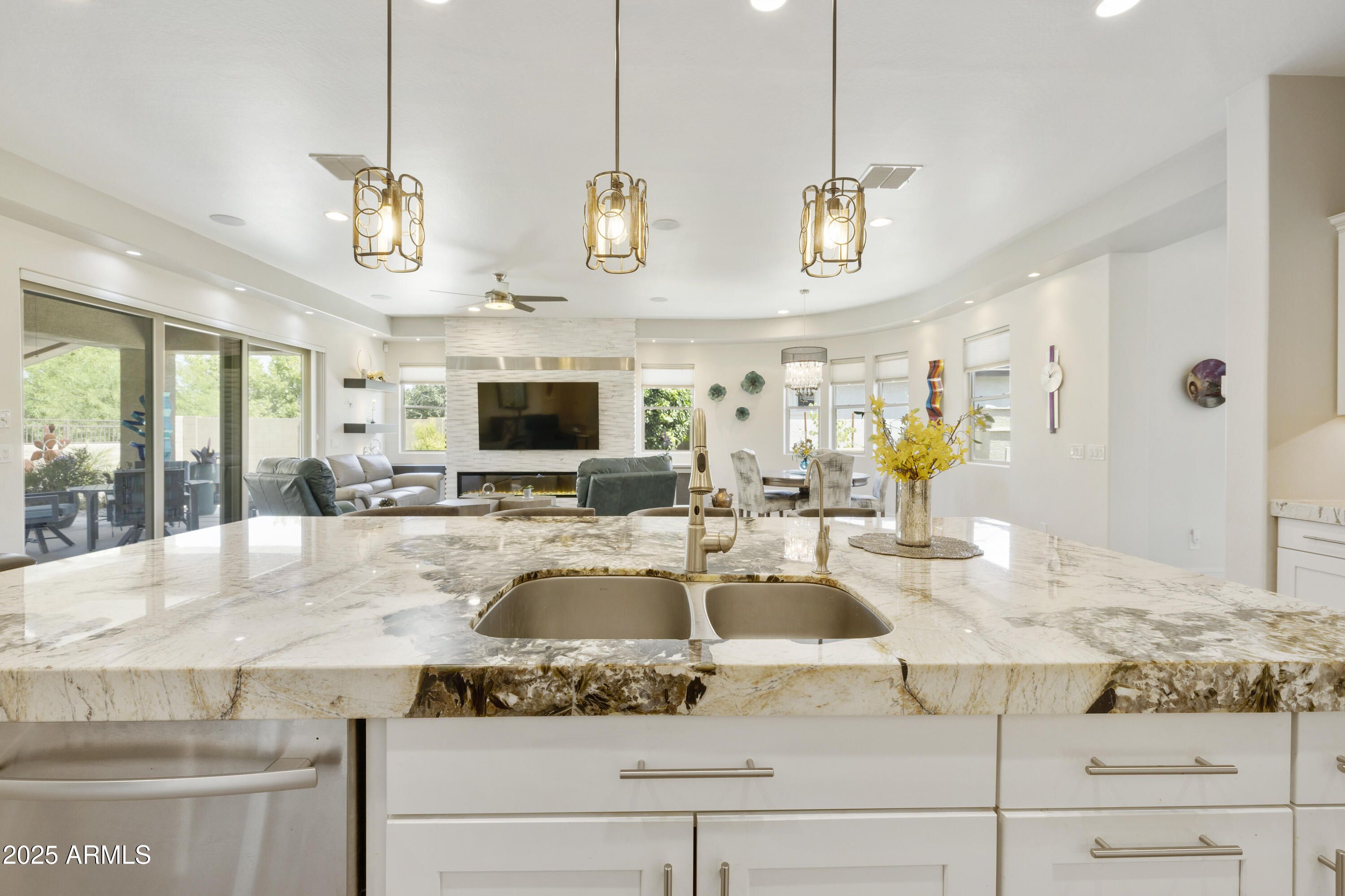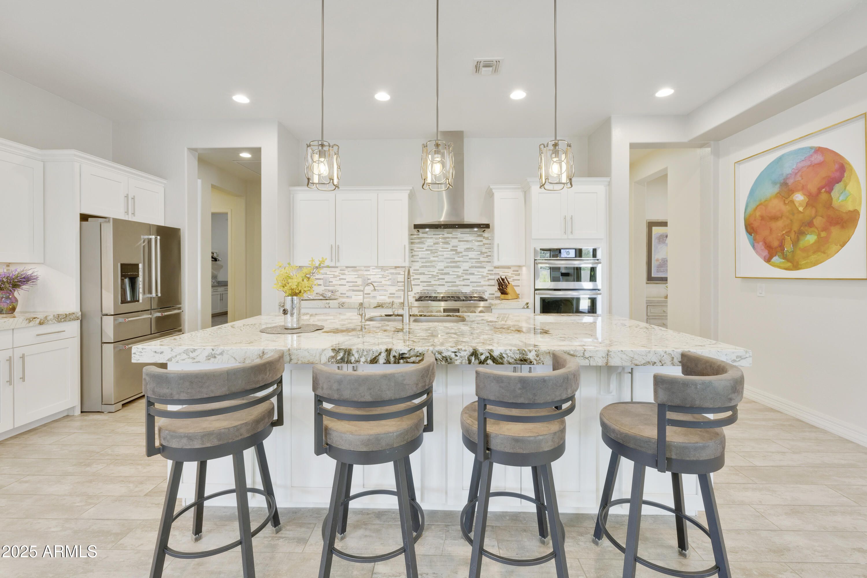 This highly sought after concert floor plan offers an abundance of thoughtful features & comfortable living space. The flexible floor plan includes 2 well-appointed en-suites, each with a W-I closet & private bthm with dual sinks, framed mirrors, & W-I shower. The gourmet kitchen boasts Jenn-Air appliances (3 ovens & gas range), an oversized center island with cabinetry on both sides, & upgraded granite countertops. The wet bar in the flex/dining rm provides an ideal space for entertaining & access through the multi-slider to the gated courtyard with B-I fireplace creates additional entertainment space. The great rm features a stunning stone wall with electric fireplace. The second multi-slider is off the great room & leads to the professionally landscaped yard with extended covered... ...patio & mechanical awning, & B-I BBQ creating an ideal indoor-outdoor living space. The home boarders a walking path & common area, offering a private tranquil setting. Additional features include oversized laundry rm with ample cabinet storage & a utility sink. There is also a den/sitting rm off the primary bdrm, a lg W-I pantry, & custom shutters in most rooms. The open-concept floor plan with wood-look tile T/O creates a cohesive & welcoming atmosphere. In addition, the home offers an extended 2-car garage with overhead storage, a water softener, tankless water heater & 22 seer air conditioners. You will also love the lifestyle at Encore at Eastmark, offering many activities & clubs. Are you looking for pickle ball, tennis, bocci ball, craft rm with 2 kilns, billiard rm, meeting rms, library, Proving Ground Café & many places to make new friends? Then Encore maybe for you!!!