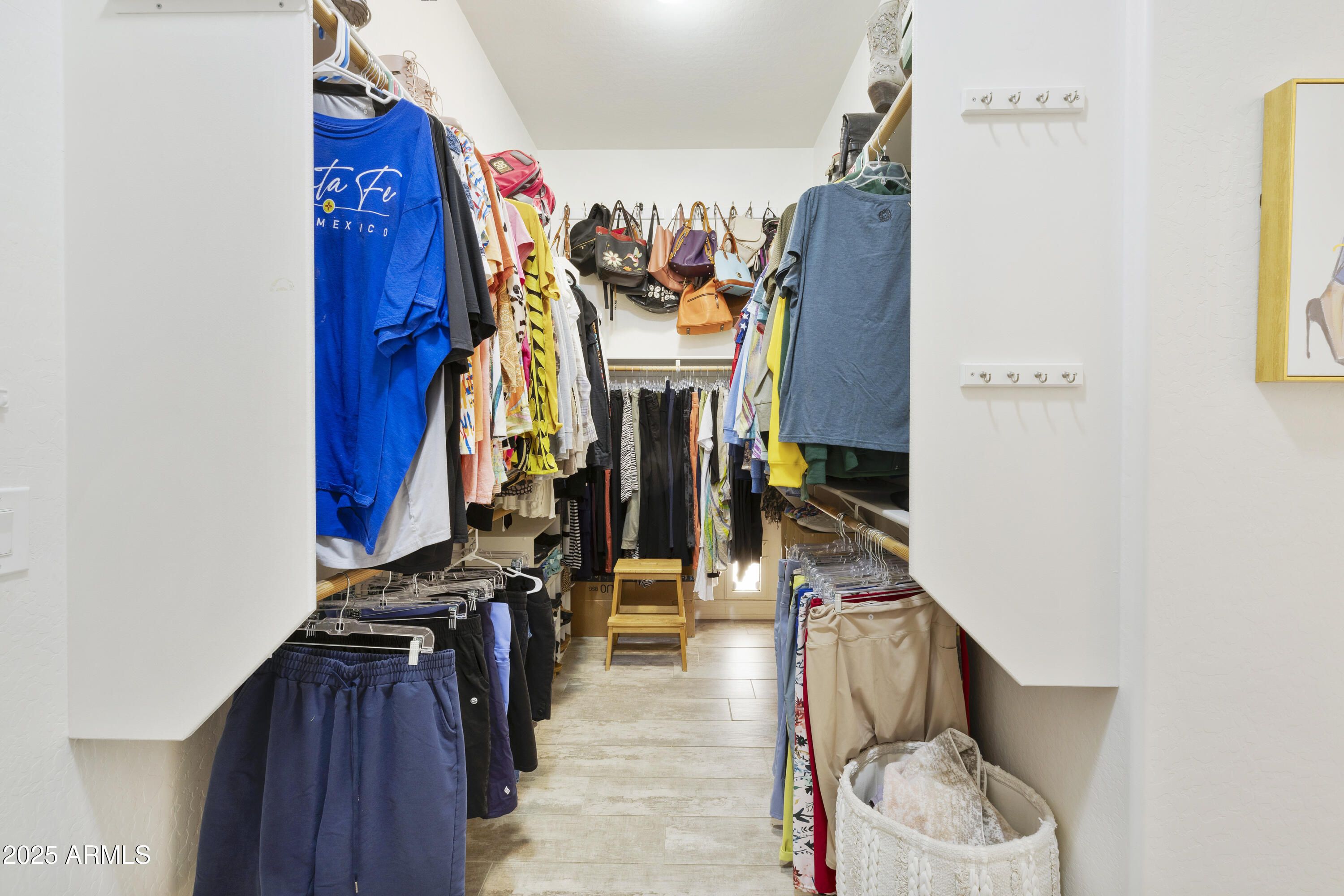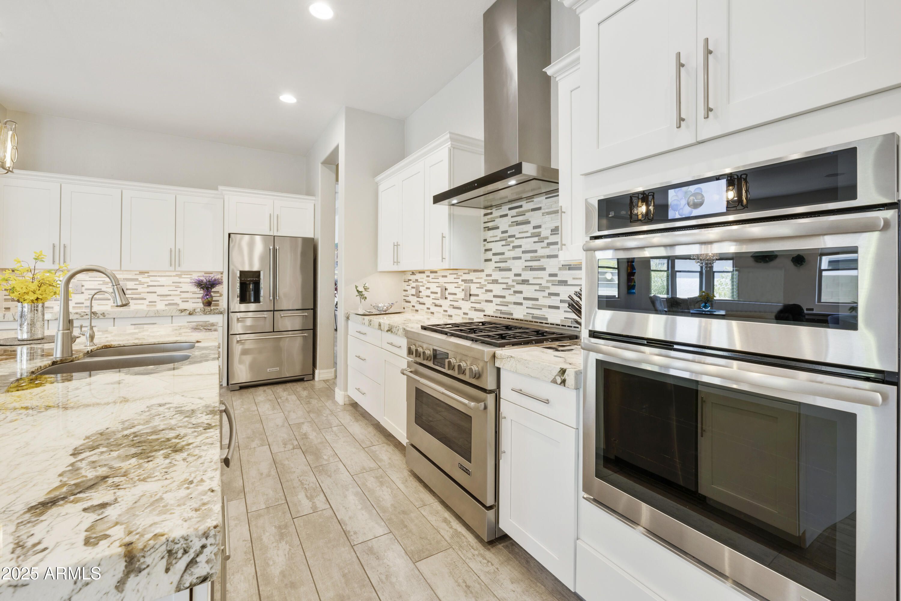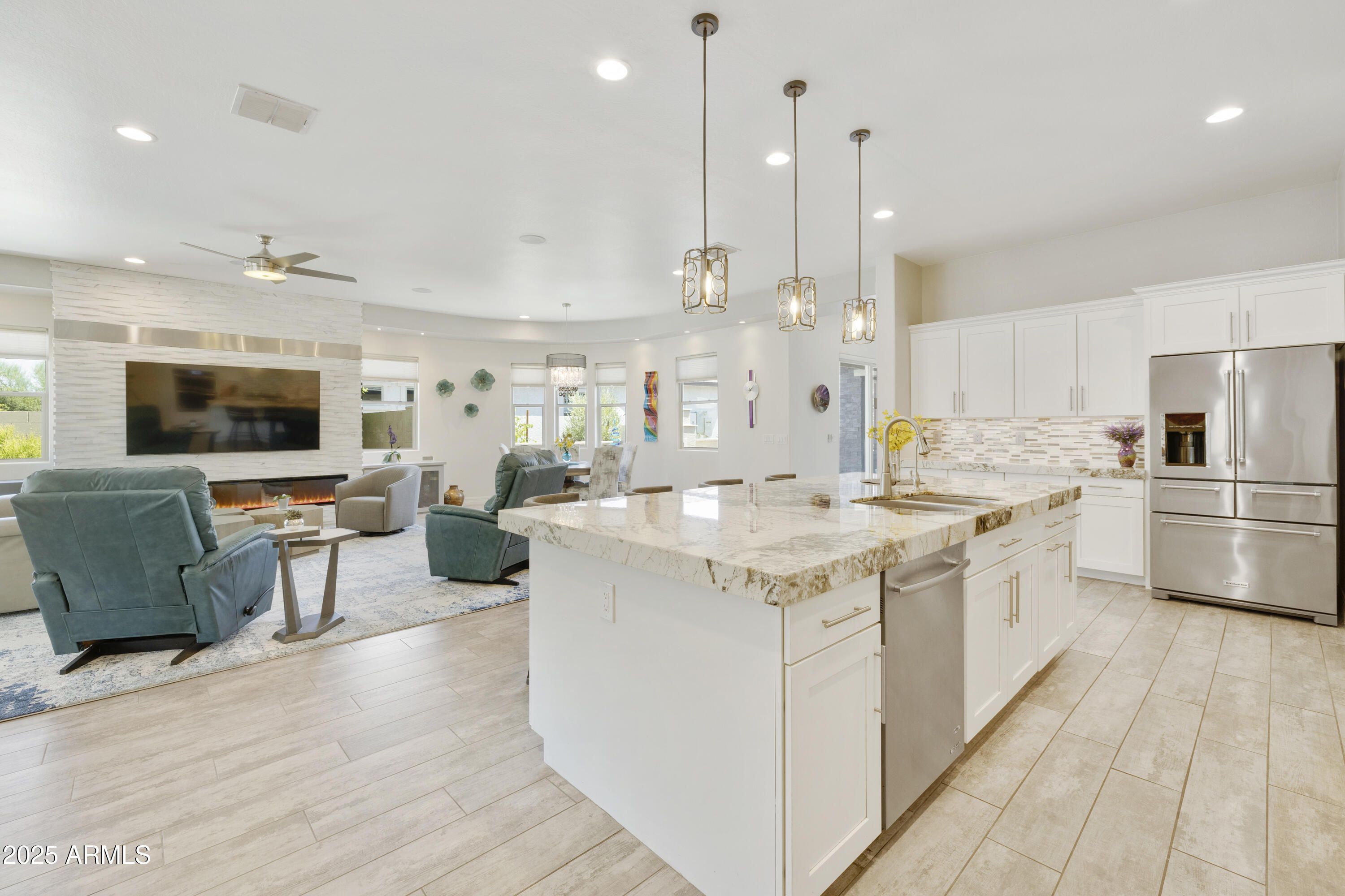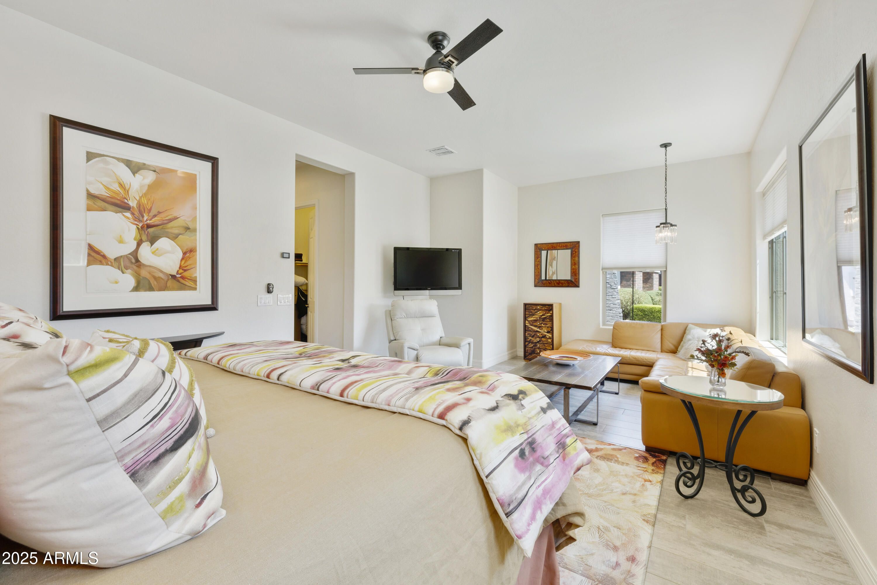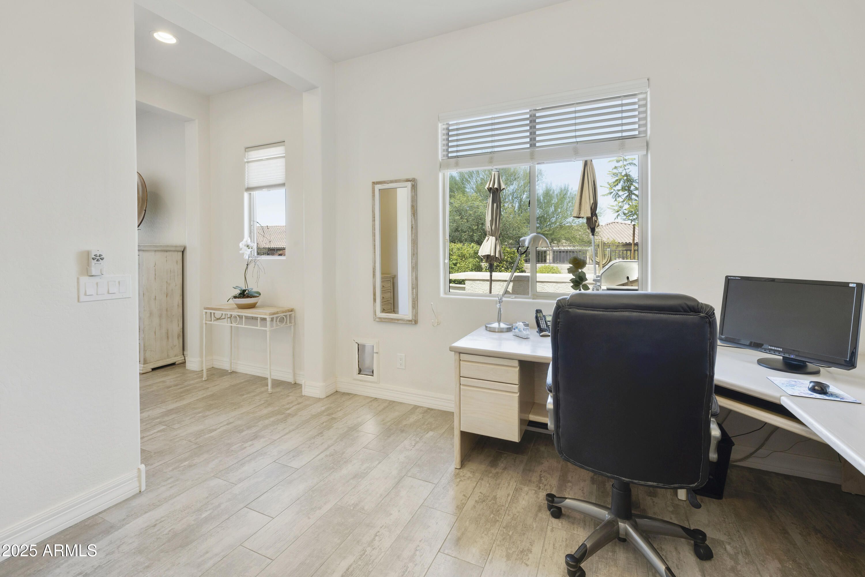 This highly sought after concert floor plan offers an abundance of thoughtful features & comfortable living space. The flexible floor plan includes 2 well-appointed en-suites, each with a W-I closet & private bthm with dual sinks, framed mirrors, & W-I shower. The gourmet kitchen boasts Jenn-Air appliances (3 ovens & gas range), an oversized center island with cabinetry on both sides, & upgraded granite countertops. The wet bar in the flex/dining rm provides an ideal space for entertaining & access through the multi-slider to the gated courtyard with B-I fireplace creates additional entertainment space. The great rm features a stunning stone wall with electric fireplace. The second multi-slider is off the great room & leads to the professionally landscaped yard with extended covered... ...patio & mechanical awning, & B-I BBQ creating an ideal indoor-outdoor living space. The home boarders a walking path & common area, offering a private tranquil setting. Additional features include oversized laundry rm with ample cabinet storage & a utility sink. There is also a den/sitting rm off the primary bdrm, a lg W-I pantry, & custom shutters in most rooms. The open-concept floor plan with wood-look tile T/O creates a cohesive & welcoming atmosphere. In addition, the home offers an extended 2-car garage with overhead storage, a water softener, tankless water heater & 22 seer air conditioners. You will also love the lifestyle at Encore at Eastmark, offering many activities & clubs. Are you looking for pickle ball, tennis, bocci ball, craft rm with 2 kilns, billiard rm, meeting rms, library, Proving Ground Café & many places to make new friends? Then Encore maybe for you!!!