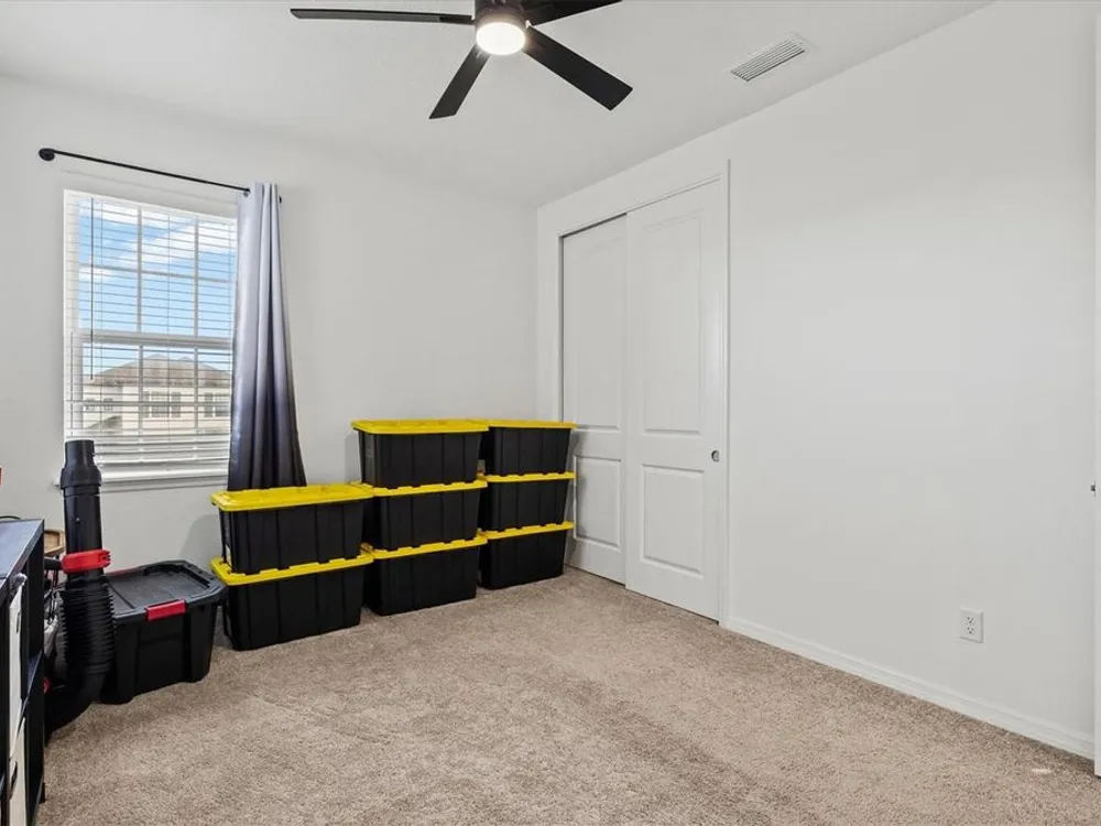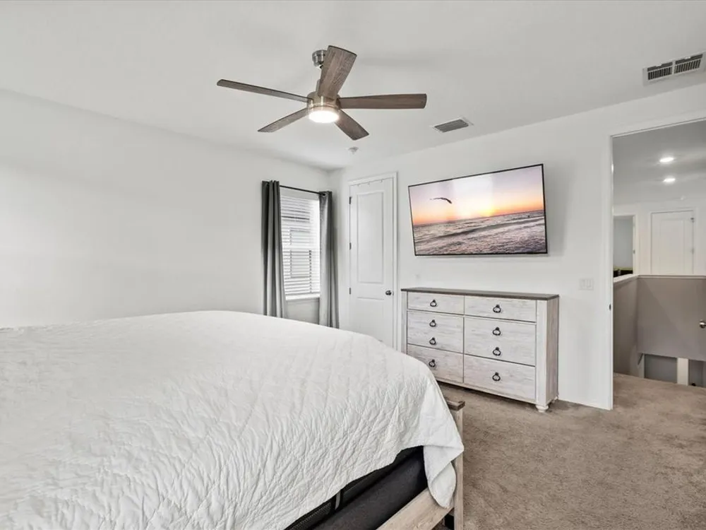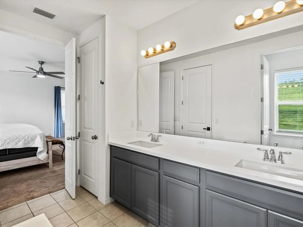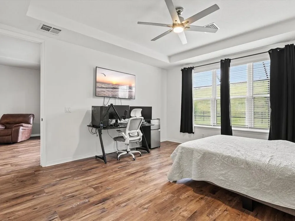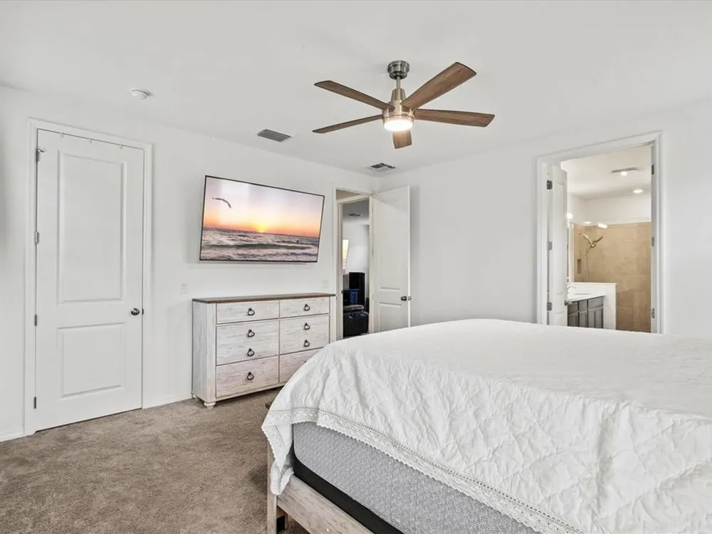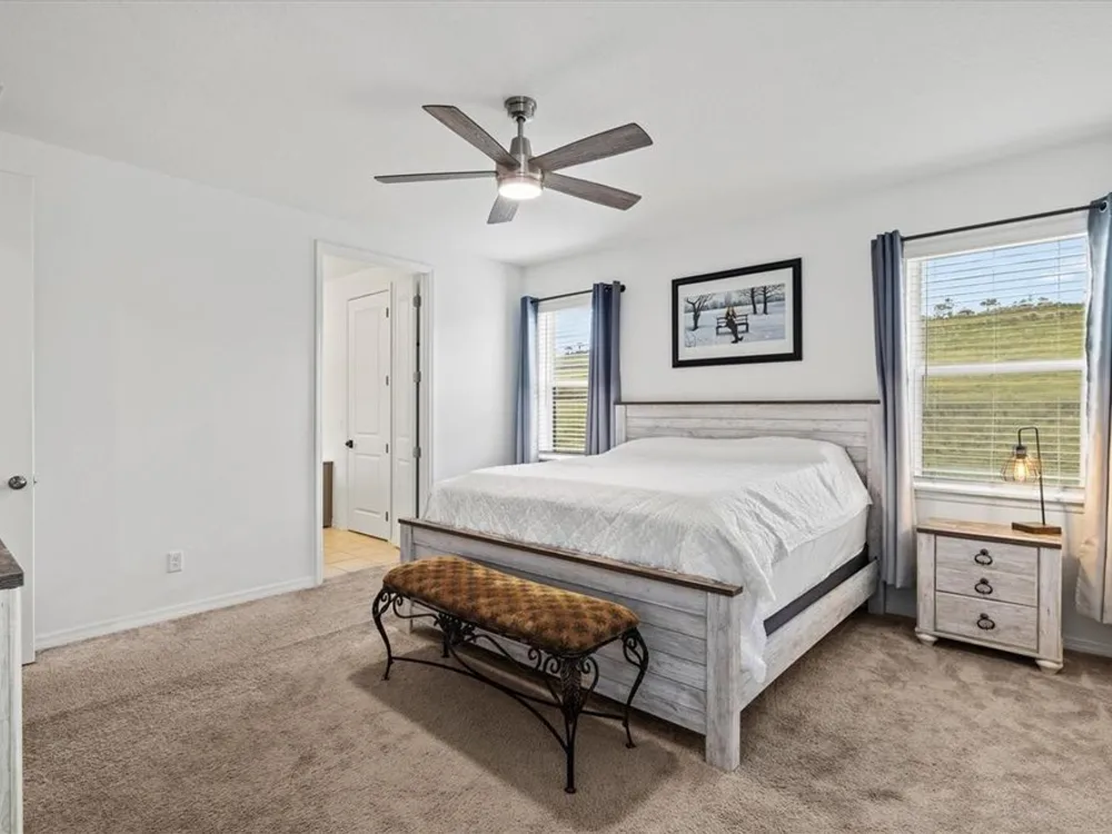 - Ceiling Fan(s), Open Floorplan, Main Level Primary, Upper Level Primary, Solid Surface Counters, Solid-Wood Cabinets, Split Bedrooms, Stone Counters, Thermostat, Walk-In Closet(s)