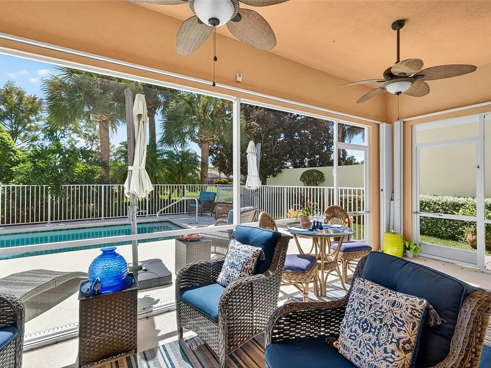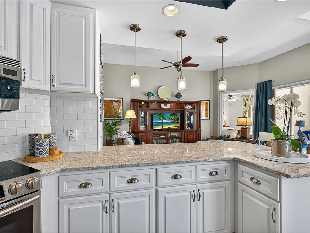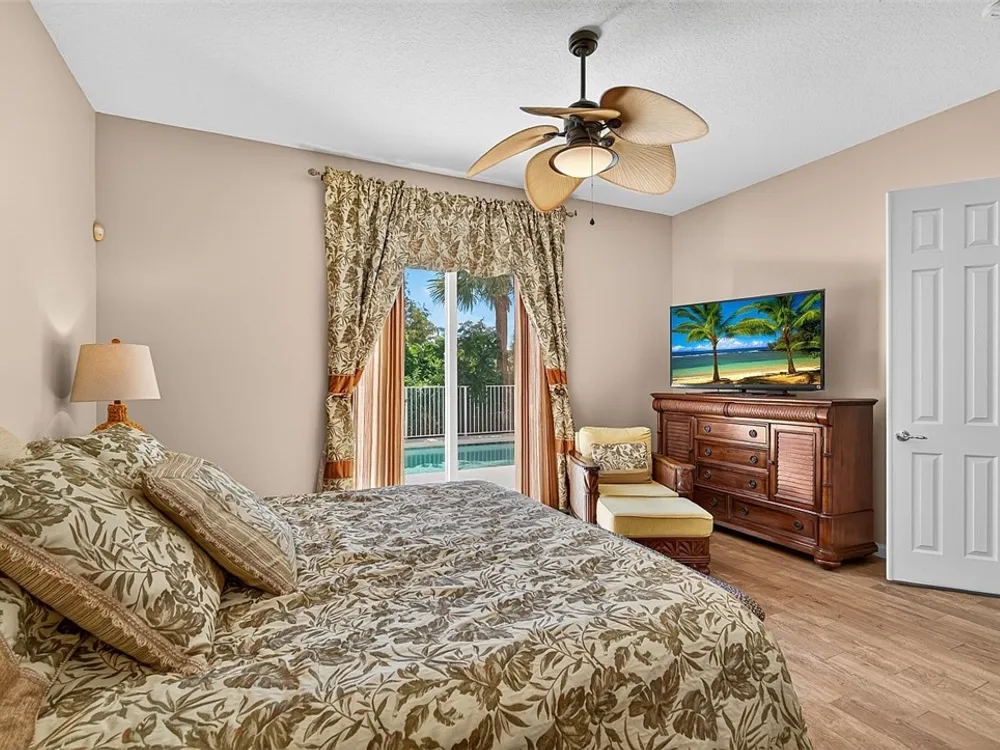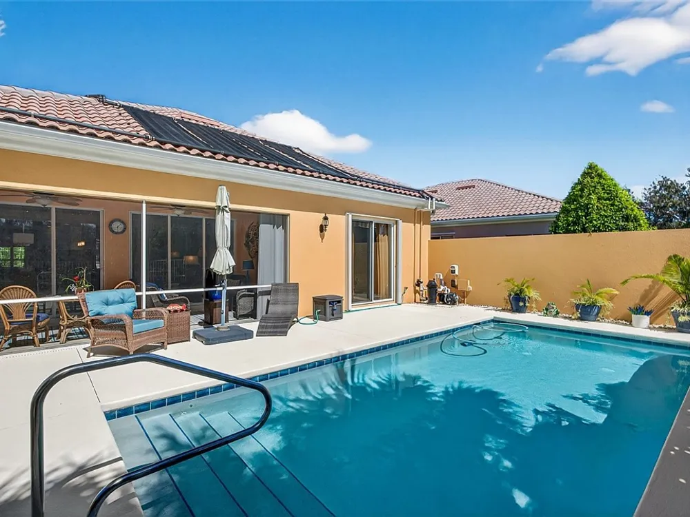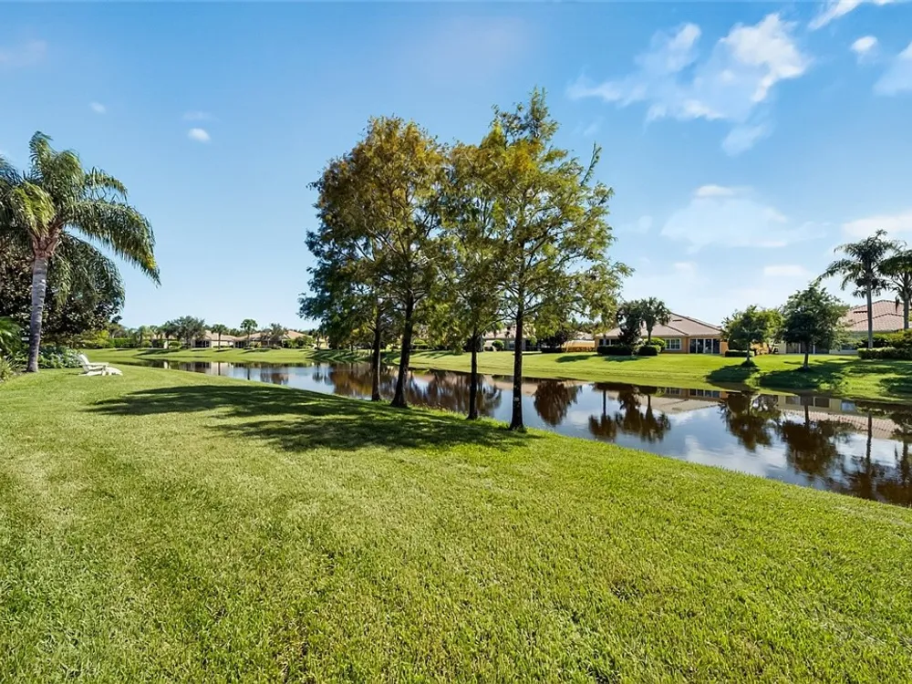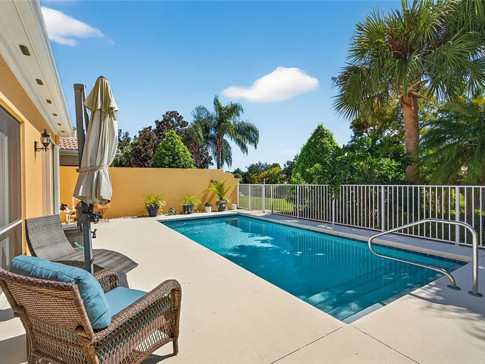 Divosta Oakmont model 3 BD/3 BA w/private Pool & View of the Lake. Kitchen w/white cabinets; quartz countertop; SS appliances; pullout drawers in cabinets & pantry; tile backsplash; large undermount sink; filtered water; plantation shutters w/custom blinds on sliders. Walk-in shower in primary bedroom w/new tile floor & decorative tile around garden tub; 3 closets. Pool-fenced in, solar heated, saltwater, resurfaced & tiled w/new pool pump; screened in patio; hurricane shutters; privacy walls; safe room. Resort Style living w/amenities to enjoy!