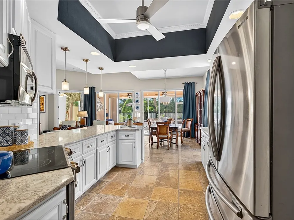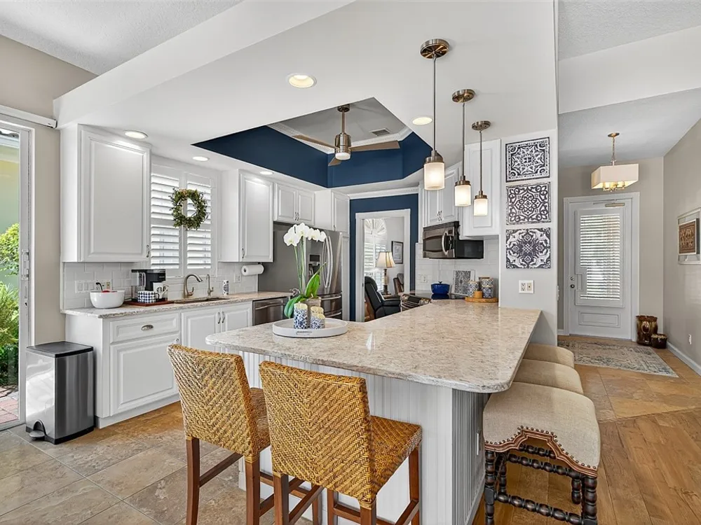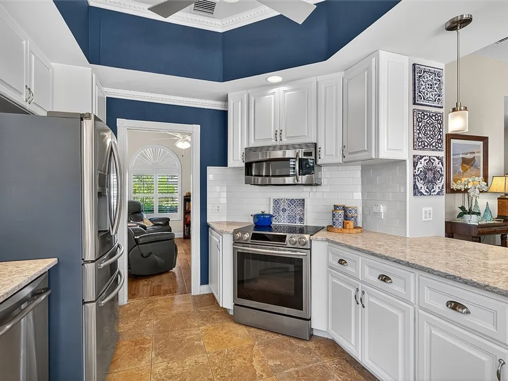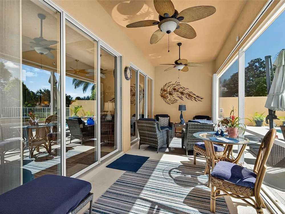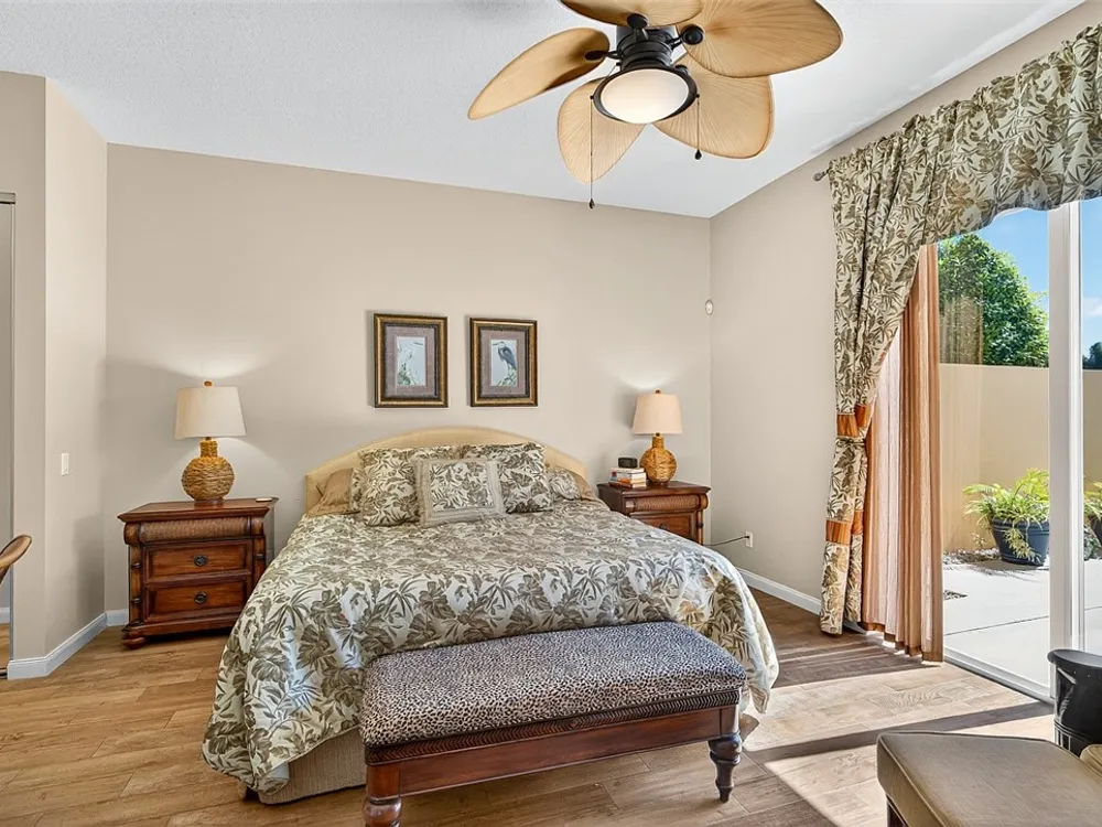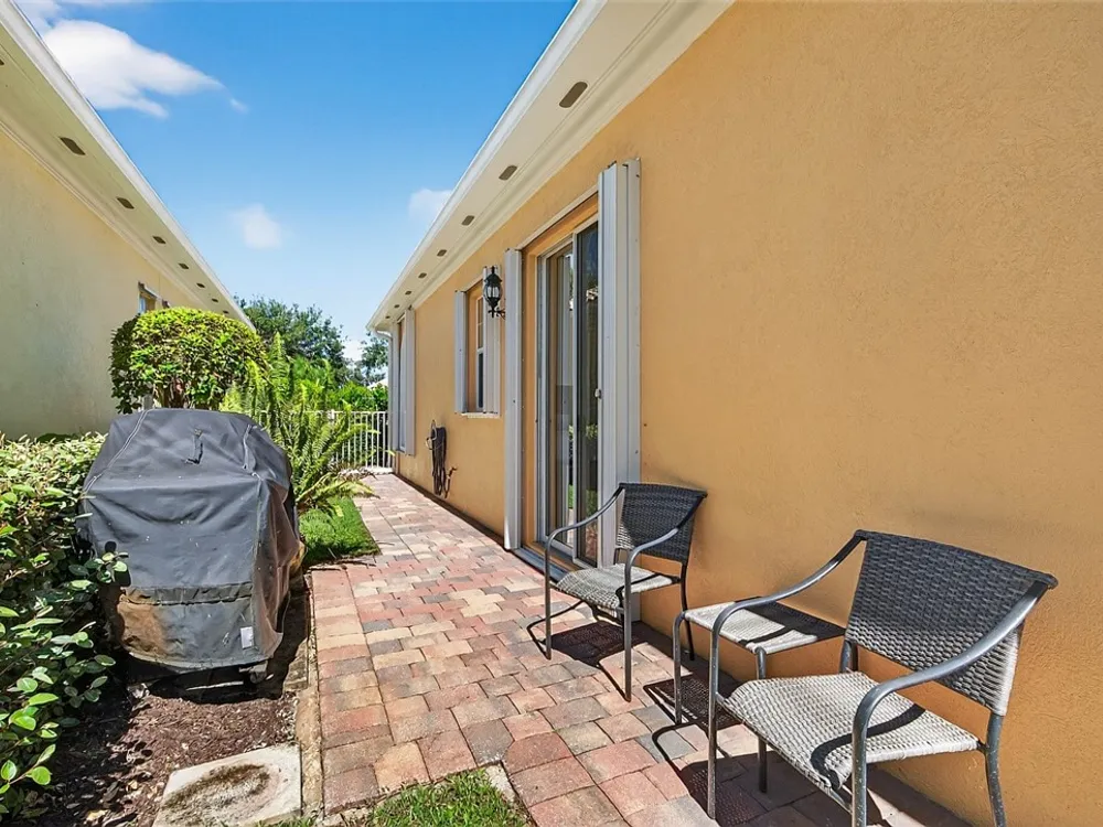 Divosta Oakmont model 3 BD/3 BA w/private Pool & View of the Lake. Kitchen w/white cabinets; quartz countertop; SS appliances; pullout drawers in cabinets & pantry; tile backsplash; large undermount sink; filtered water; plantation shutters w/custom blinds on sliders. Walk-in shower in primary bedroom w/new tile floor & decorative tile around garden tub; 3 closets. Pool-fenced in, solar heated, saltwater, resurfaced & tiled w/new pool pump; screened in patio; hurricane shutters; privacy walls; safe room. Resort Style living w/amenities to enjoy!