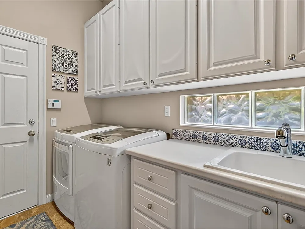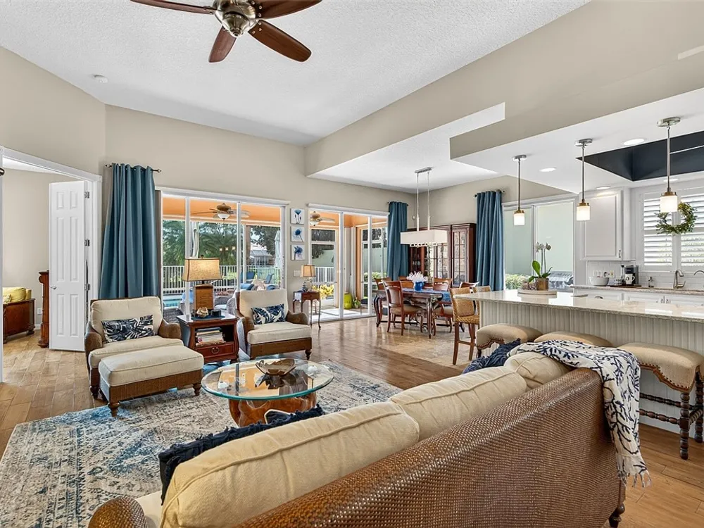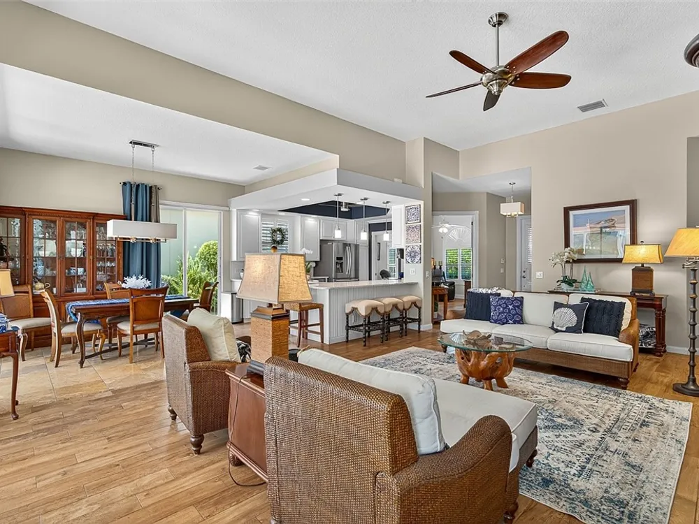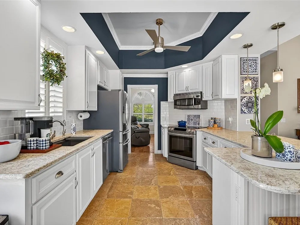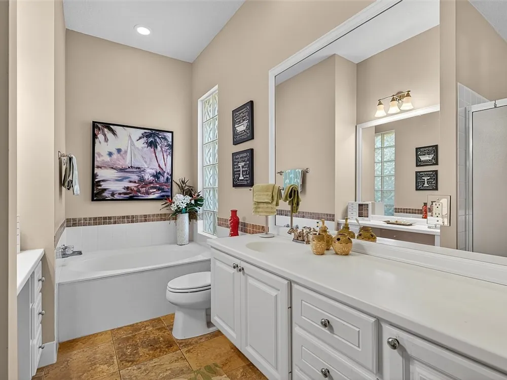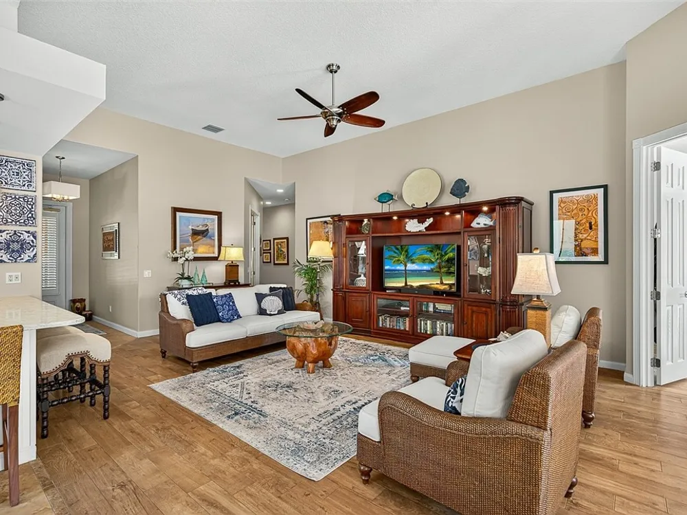 Divosta Oakmont model 3 BD/3 BA w/private Pool & View of the Lake. Kitchen w/white cabinets; quartz countertop; SS appliances; pullout drawers in cabinets & pantry; tile backsplash; large undermount sink; filtered water; plantation shutters w/custom blinds on sliders. Walk-in shower in primary bedroom w/new tile floor & decorative tile around garden tub; 3 closets. Pool-fenced in, solar heated, saltwater, resurfaced & tiled w/new pool pump; screened in patio; hurricane shutters; privacy walls; safe room. Resort Style living w/amenities to enjoy!