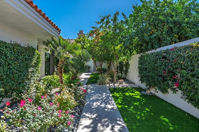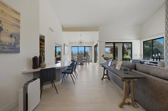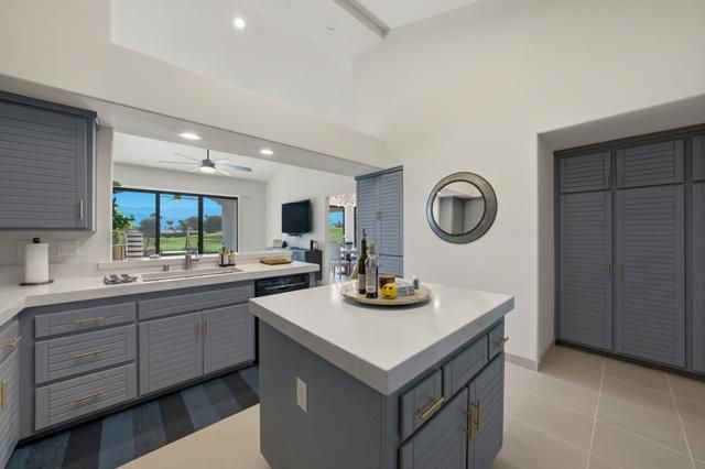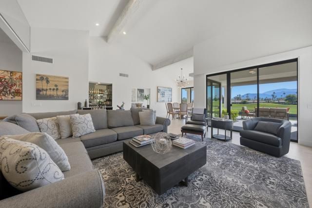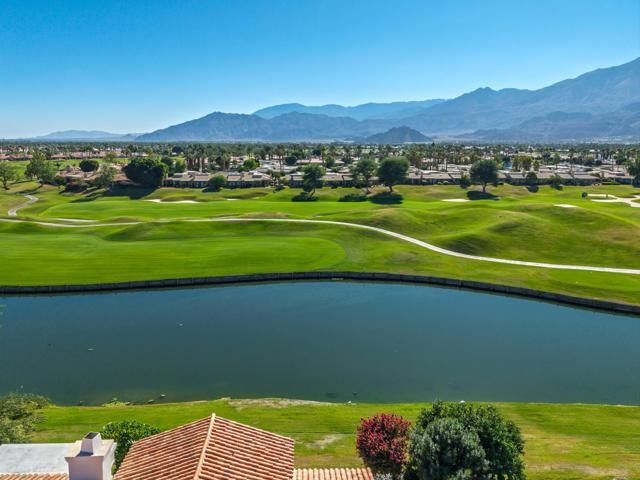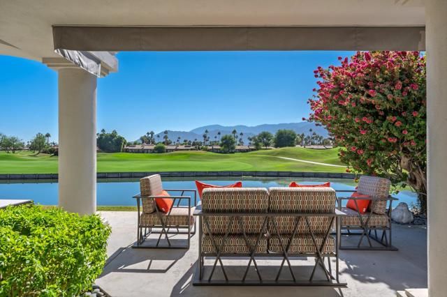 Welcome to your desert dream home on the 5th hole of the world famous Pete Dye Stadium Course at PGA West, where the American Express Tournament is played each year. This beautifully renovated Legend 40 floor plan offers one of the most breathtaking south facing views in the entire community, showcasing panoramic mountains, shimmering lake, and stunning golf course scenery from every vantage point. From the moment you arrive, the lushly landscaped courtyard with turf and colorful desert plantings provides a warm and inviting entrance that sets the tone for the quality and style that continue throughout the home. Inside, soaring ceilings and walls of glass fill the great room with natural light, highlighting the dramatic floor to ceiling tiled fireplace that serves as a striking focal point. The open layout flows easily to the dining area and kitchen, perfect for both entertaining and everyday living. The former atrium has been thoughtfully converted into a private office or flex space with skylights, ideal for working from home or relaxing with a book. While the home is listed as a two bedroom, there is an additional room often used as a third bedroom in this floor plan, although it does not have a window to the exterior. Throughout the home, motorized window coverings provide comfort and privacy, while automated awnings extend the living space outdoors creating a seamless connection between indoor and outdoor living. Step outside to an entertainer's paradise where the built-in barbecue and generous patio invite gatherings with friends and family while enjoying the stunning views of the lake and the Santa Rosa Mountains. The property includes a two car garage with epoxy flooring and an electric car charging station, along with a separate golf cart garage. Major improvements include a new HVAC system, ducting, and water heaters installed in 2018, and all windows and sliders replaced in 2020 for improved energy efficiency and peace of mind. Offered fully furnished with high end designer pieces, this home is truly turnkey and ready for immediate enjoyment. Rental income from February 1, 2026, through May 1, 2026, with a gross rent of $28,500 can be transferred to the new owner. With its exceptional location, thoughtful upgrades, and breathtaking views, this residence captures the essence of desert luxury living at PGA West, whether as a full time residence, seasonal escape, or investment opportunity in one of the most desirable golf communities in La Quinta