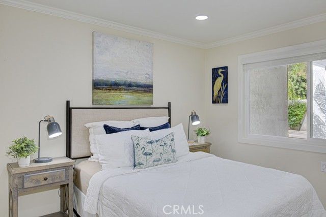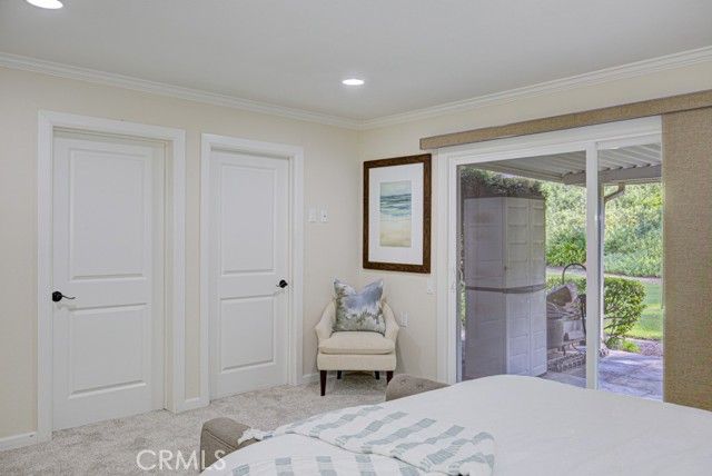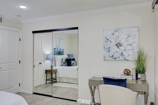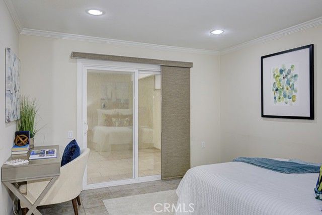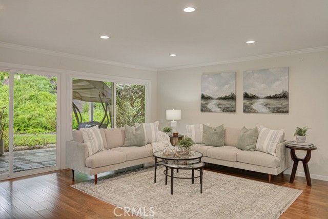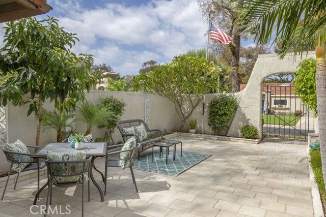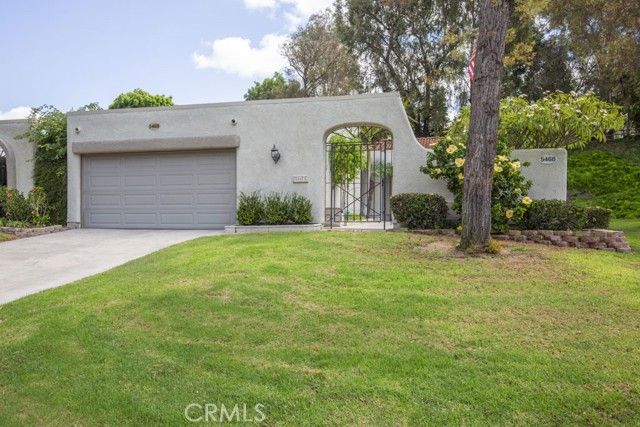 Welcome to 5468-C Paseo Del Lago – a beautiful upgraded single-level, end-unit, three-bedroom, two-bath CABRILLO residence in the active Laguna Woods senior community. Situated in a tranquil cul-de-sac far from busy roads and noisy highways, this home boasts excellent curb appeal. The large private front courtyard is paved with attractive stone tile and is the perfect setting for outdoor entertaining, dining or relaxing. This large courtyard extends around the garage to a covered side patio that separates the garage from the main house. The attractive front door with etched glass inserts opens to a spacious living room that has direct access to the large covered rear patio which looks onto an expansive grassy area. This is an excellent floorplan for a homeowner who enjoys outdoor entertaining. The kitchen boasts granite countertops, an attractive tile backsplash, stainless steel appliances, a window overlooking the front courtyard and seating for up to three at the breakfast bar. The kitchen island offers additional counter space and cabinet storage capacity. The primary bedroom suite also has direct access to the rear patio via a glass slider. The primary bedroom closet has been reconfigured to be a walk-in. The primary bathroom has a shower only while the guest bathroom features a tub/shower combo. Both showers have lovely stone walls and convenient accessory shelves. Either of the two guest bedrooms could serve as a workout room, arts and crafts studio or home office. One of these bedrooms has direct access to the side patio. Upgrades throughout include smooth ceilings, crown molding, recessed lighting, dual-pane windows and sliders, attractive wood flooring and central HVAC. The oversized detached garage has washer-dryer hookups, a convenient utility sink and easily holds two vehicles plus a golf cart. The driveway can accommodate up to four additional vehicles plus there is ample street parking for guests. Do not miss this spectacular home!
