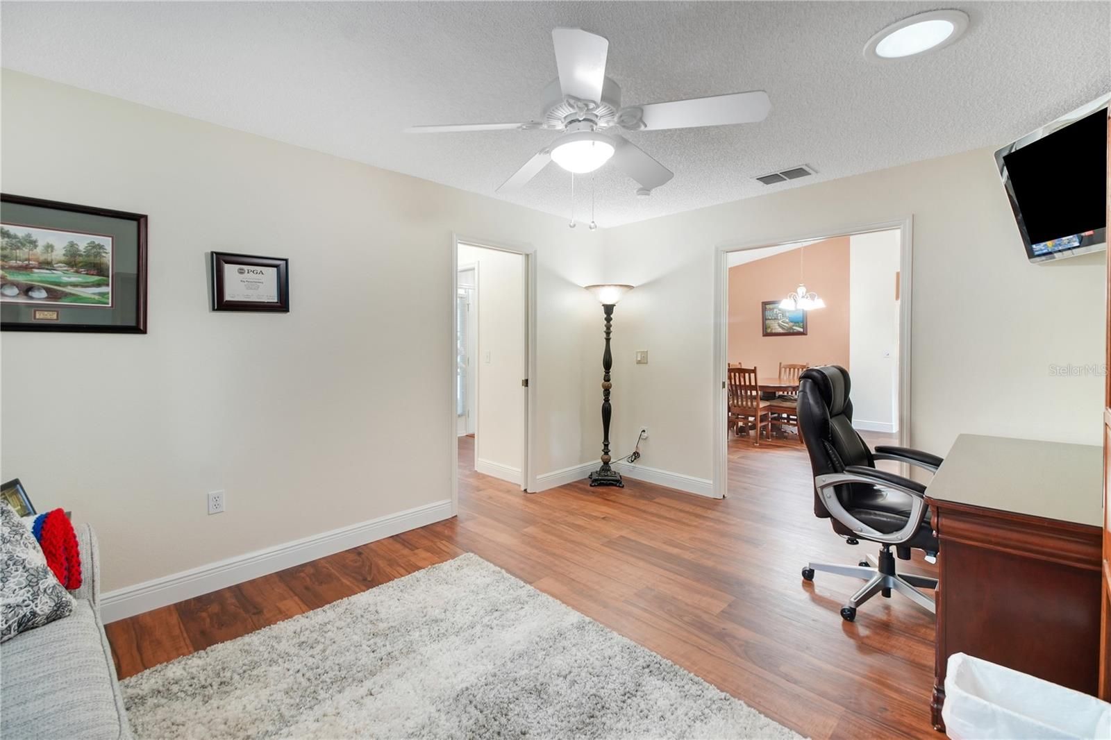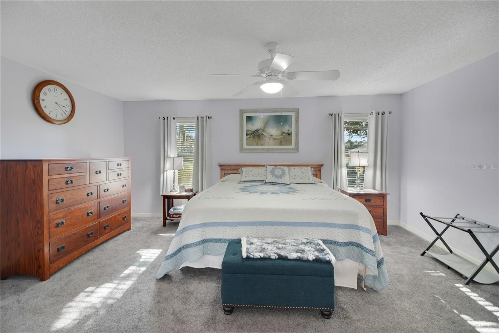 One of a Kind GOLF Frontage Home with WATER VIEWS PLUS a large 2 car garage with a BONUS Room in the desirable 55+ Pennbrooke Fairways! This 3 Bedroom 2 bath is 1999 square feet of Living space. The primary bedroom is 17 x 13 and features a large walk-in closet and an ensuite with a water closet, 2 separate vanities, dual sinks and a large walk-in shower. The 2 guest bedrooms are spacious in size (one of the bedrooms does not have a closet) and share a bathroom nearby. The Inside laundry room is oversized and has lots of storage space and a utility sink. This home showcases lots of natural light in addition to the 4 solar tubes. Lovely finished glass enclosed Lanai has wood like ceramic tile flooring and breathtaking Water & Golf Course views! New roof in 2020,New HVAC in 2021 and water heater in 2015. Kitchen & bathrooms feature granite countertops. Also the kitchen has newer stainless steel appliances, white cabinets, a desk area as well as eat-in space overlooking the water and golf course views. Living room and Dining room combo has Luxury Vinyl plank floors. Between the inside Laundry room and garage is a 20x10 workshop that is heated and cooled (not included in the living sq ft) which could be a great Man Cave, Craft Room or storage! The low $255 Monthly HOA fee includes grass cutting, Hi-speed internet, cable and amenities. Pennbrooke Fairways is a lovely Gated Golf community. 27 holes of golf, pro shop and restaurant. Two recreation Centers, 2 pools and Fitness Center, Shuffleboard, pickleball, tennis, softball, horse shoes, water volleyball and cornhole. If you like inside activities, there are darts, billiards, Line dancing, Quilting, Art room and over 100 Clubs. Pennbrooke is convenient to Shopping and dining and 6 miles East of The Villages Brownwood Paddock Town Square.