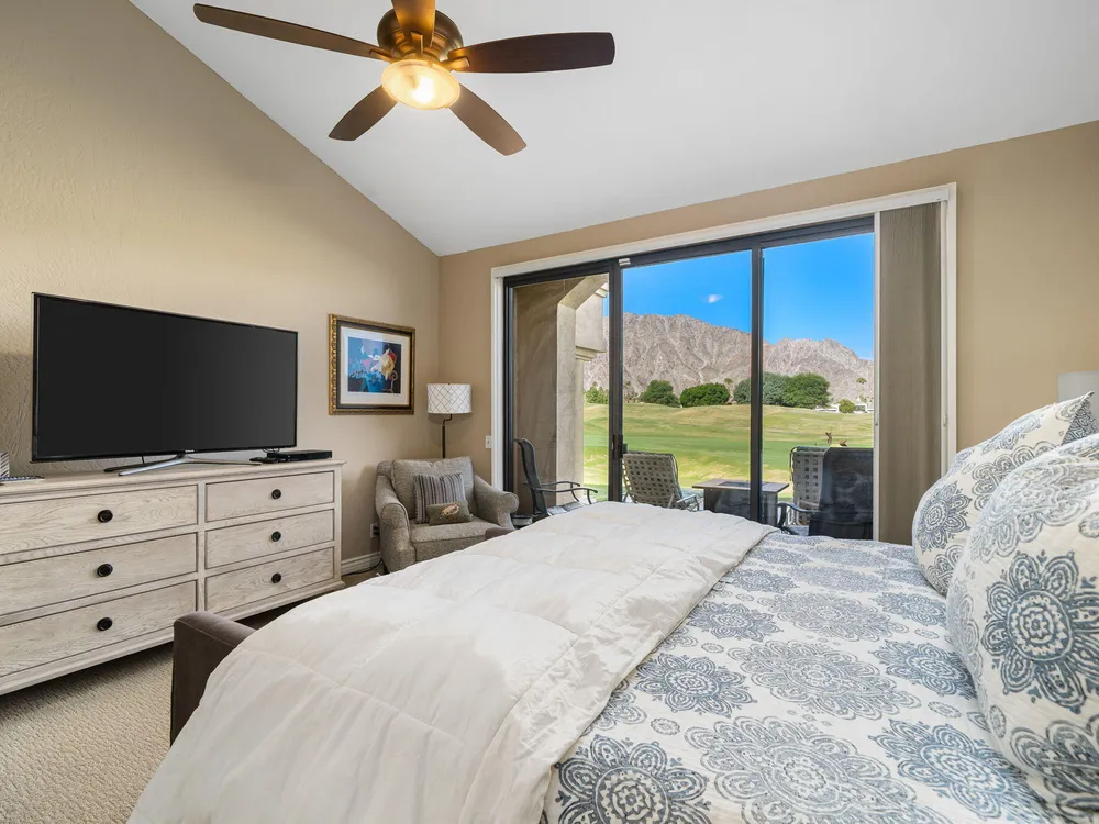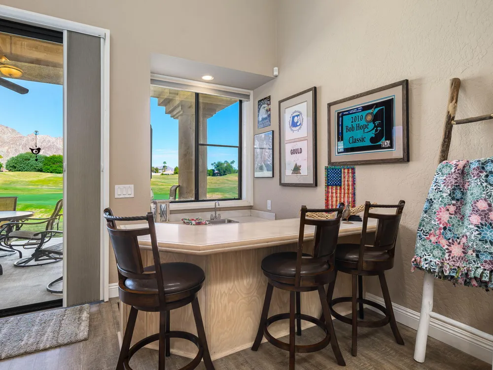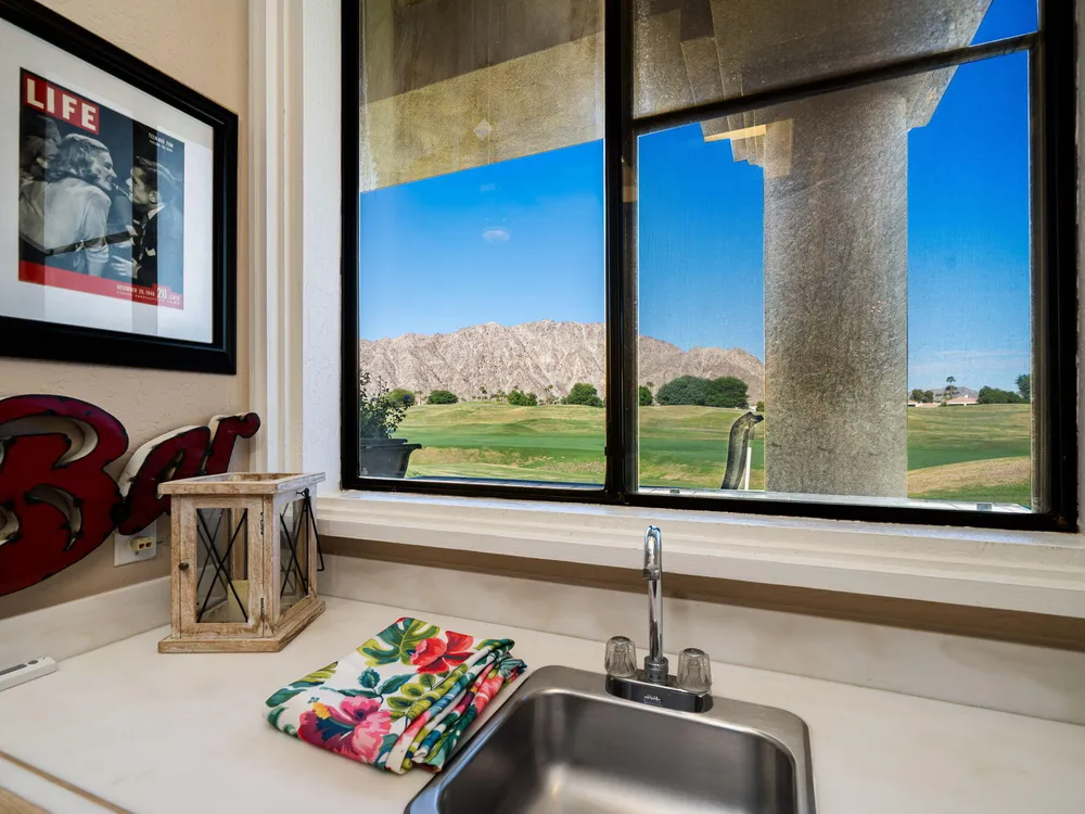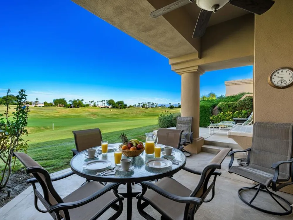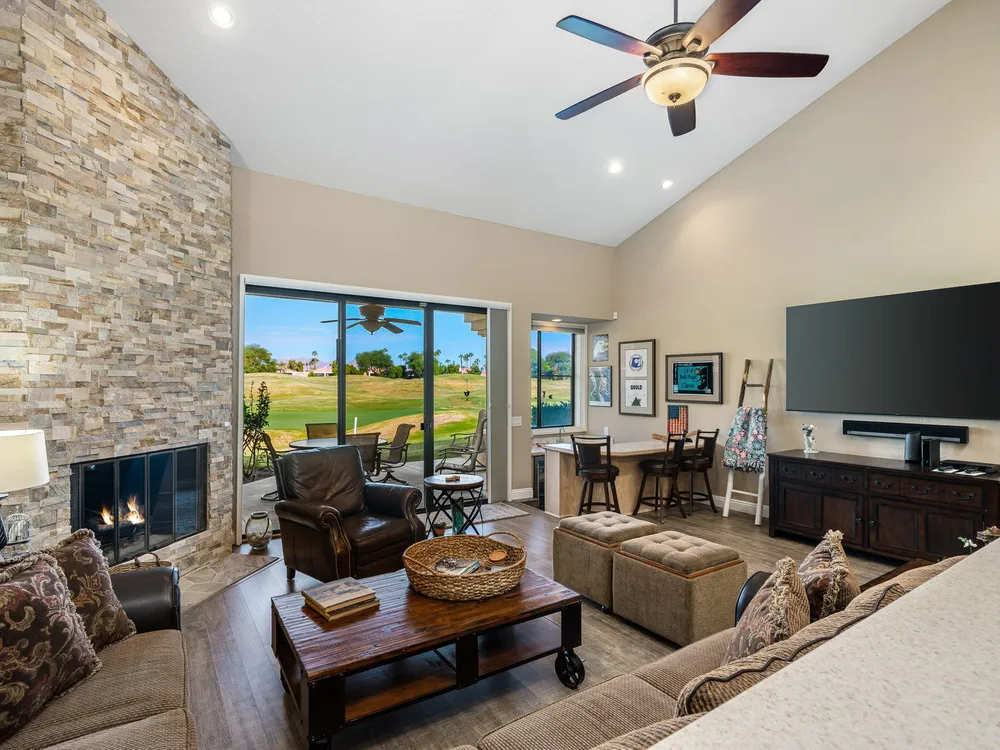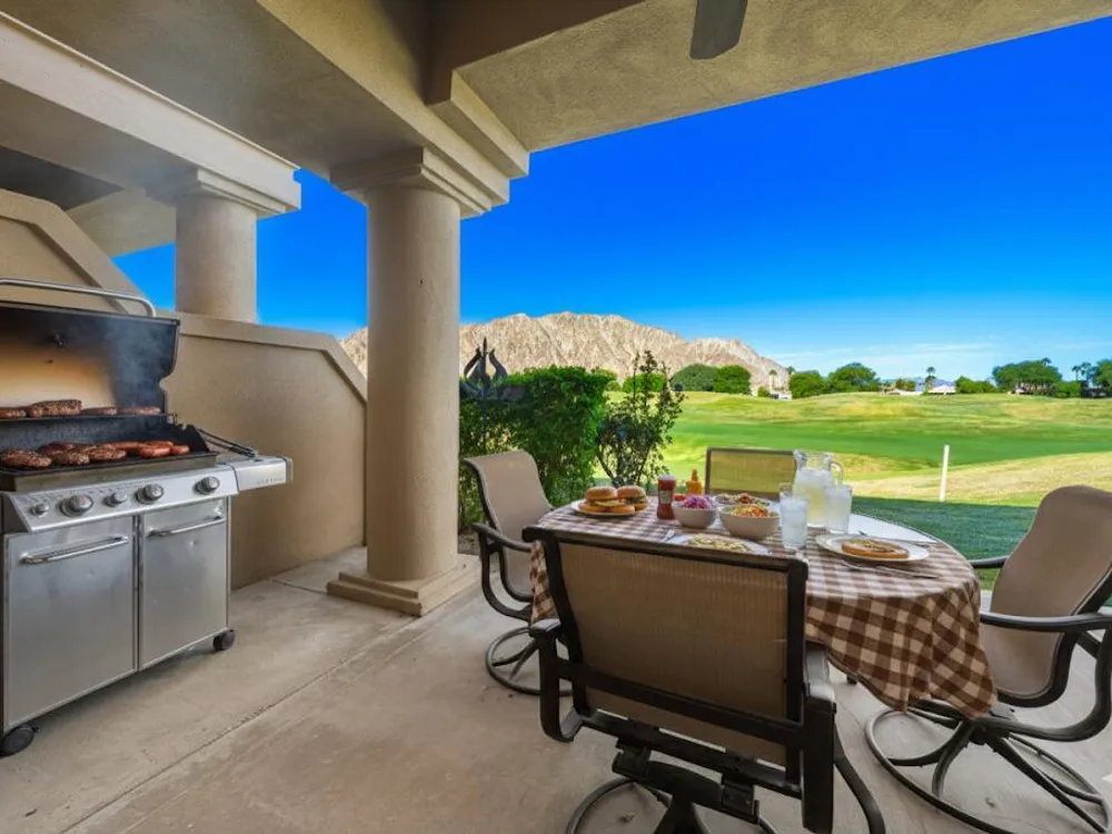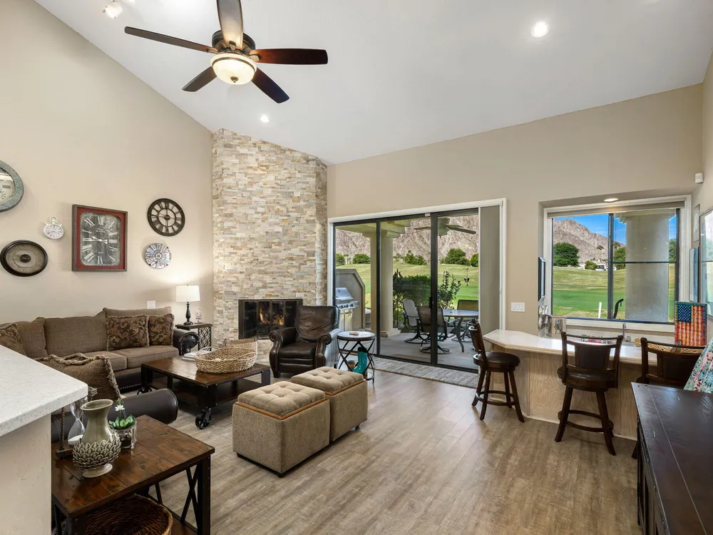 STUNNING LEGENDS 20 RESIDENCE WITH DOUBLE FAIRWAY & PANORAMIC MOUNTAIN VIEWS! The highly sought-after Legends 20 model at PGA West combines elegant design, spacious interiors, and a premier location within one of La Quinta's most prestigious guard-gated communities. Offering 3 bedrooms, 3.5 bathrooms, and approximately 2,596 sq. ft., this residence delivers the perfect blend of comfort and resort-style living. Soaring vaulted ceilings, abundant skylights, and an open floor plan fill the home with natural light. The main living area is anchored by a dramatic floor-to-ceiling stacked-stone fireplace and features luxury vinyl flooring and a built-in wet bar, creating the perfect space for relaxation or entertainment. A remodeled gourmet kitchen showcases quartz countertops, custom cabinetry, stainless-steel appliances, gas cooktop, under-cabinet lighting, recessed ceiling lights, and expanded storage, making it ideal for both everyday living and special gatherings. The primary suite is a true retreat with direct patio access, custom closet, and a spa-inspired bath complete with a frameless shower featuring dual heads, a freestanding soaking tub, Newport Brass fixtures, dual vanities, and expanded storage. Two additional bedrooms, each with en-suite baths, provide privacy and comfort for family or guests. Outdoor living is equally impressive, with panoramic mountain and double fairway views of the Stadium Course. The spacious patio includes a built-in grill and plenty of room for dining or lounging, while the community pool is conveniently located right across the street. UPGRADE HIGHLIGHTS INCLUDE: luxury vinyl flooring in main living areas, floor-to-ceiling stone fireplace, Waterboy whole-house water filtration system, refurbished entry door, ceiling fans throughout, and a golf-cart garage with custom cabinetry and overhead storage. The property is offered turnkey furnished, excluding Seller's personal items and those listed on the exclusions list. Residents of PGA West enjoy a world-class lifestyle with access to championship golf, multiple clubhouses, dining, fitness, tennis, pickleball, and resort-style pools. This Legends 20 model showcases the perfect combination of luxury, convenience, and the active desert lifestyle that makes PGA West one of California's most desirable destinations. *Some exterior and landscape photos have been digitally enhanced for illustration only.