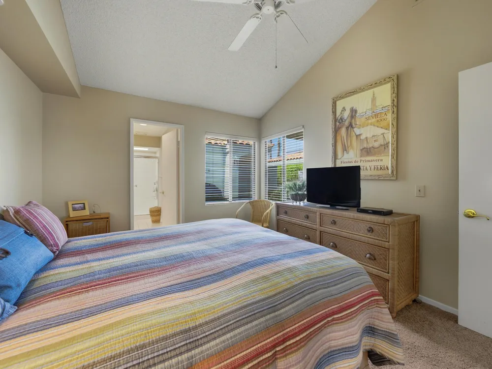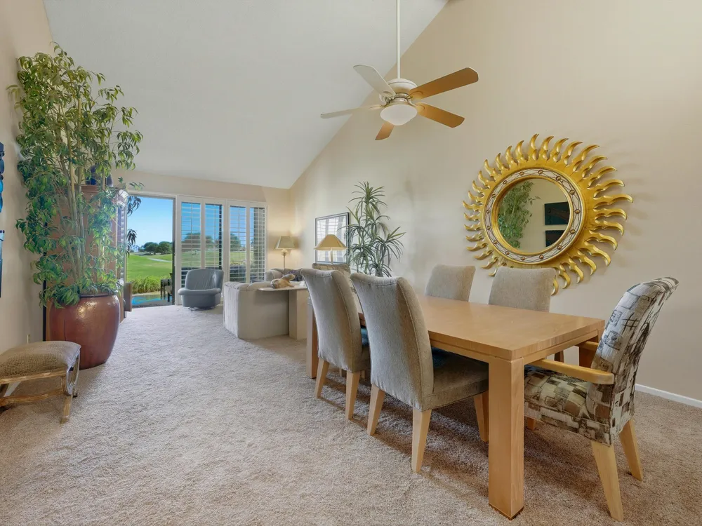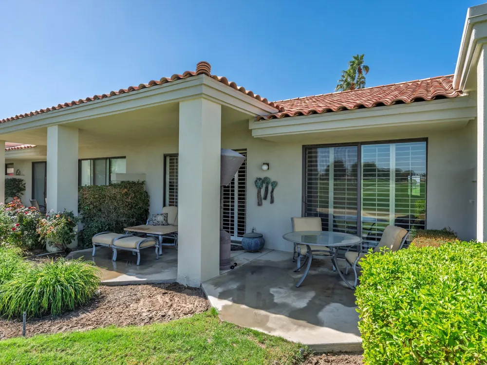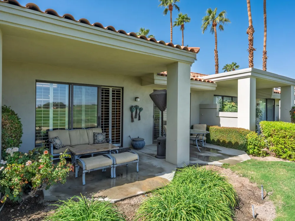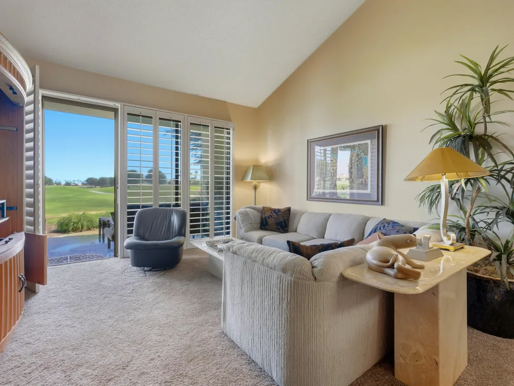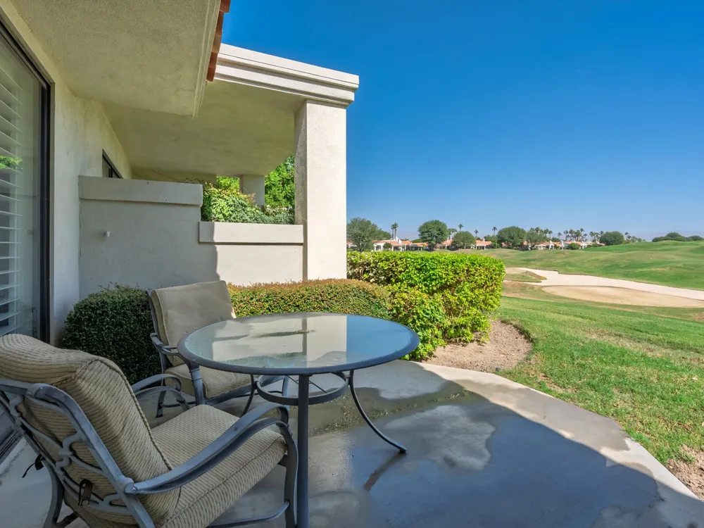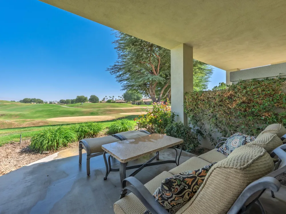 Discover this pristine and rarely available Champion 2X floor plan located on the 4th hole of the renowned TPC Stadium Course at PGA West. Offering 3 bedrooms and 3 baths across 1,673 sq ft, this light-filled single-level condo combines timeless design with tasteful modern upgrades. A private gated entry patio welcomes you inside, leading to an open-concept layout with soaring ceilings and abundant natural light. The interior features upgraded flooring, designer paint palette, custom shutters, recessed lighting, ceiling fans, enhanced baseboards, and stainless-steel appliances in the well-appointed kitchen. The spacious great room and dining area flow seamlessly to a private patio overlooking the lush fairway—ideal for enjoying morning coffee or evening sunsets. Additional highlights include a two-car garage, beautifully maintained landscaping, and close proximity to community pools and spas. Sold furnished per inventory, this move-in-ready home captures the essence of desert resort living at its finest.