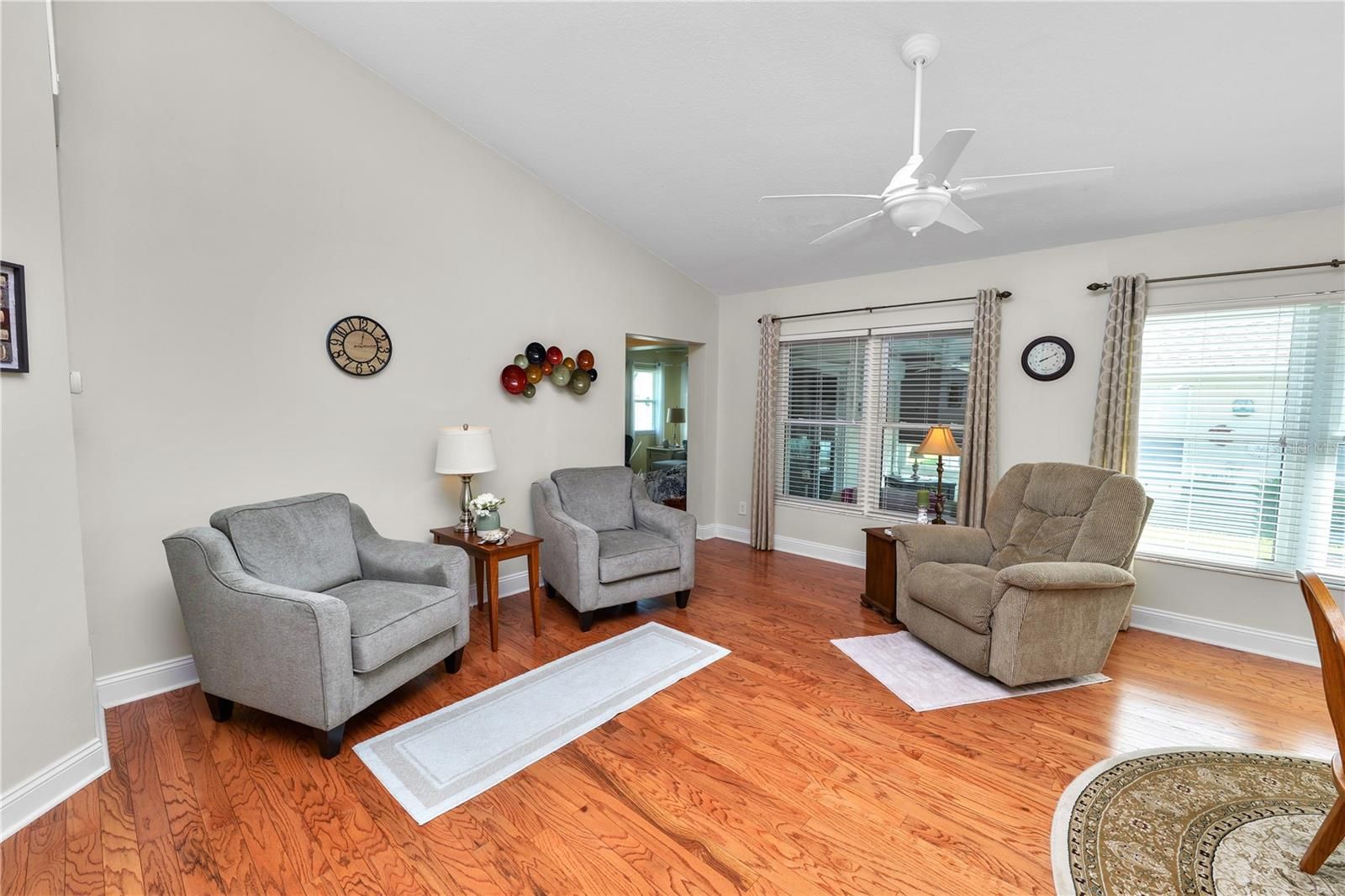 - Ceiling Fan(s), Eat-in Kitchen, High Ceilings, Living/Dining Room, Open Floorplan, Main Level Primary, Split Bedrooms, Thermostat, Vaulted Ceiling(s), Walk-In Closet(s)