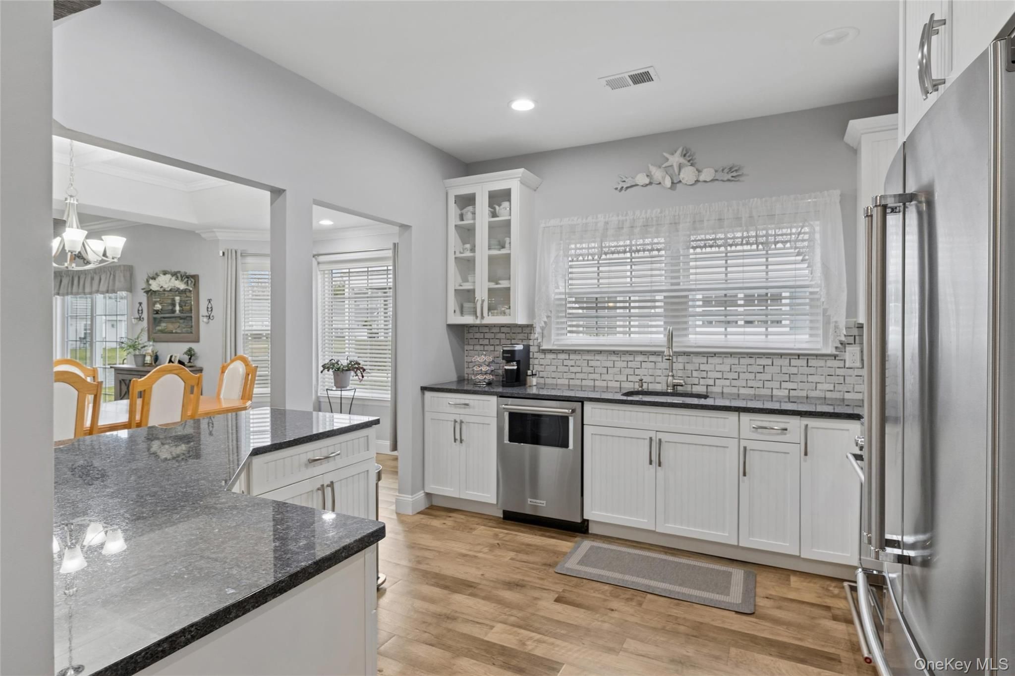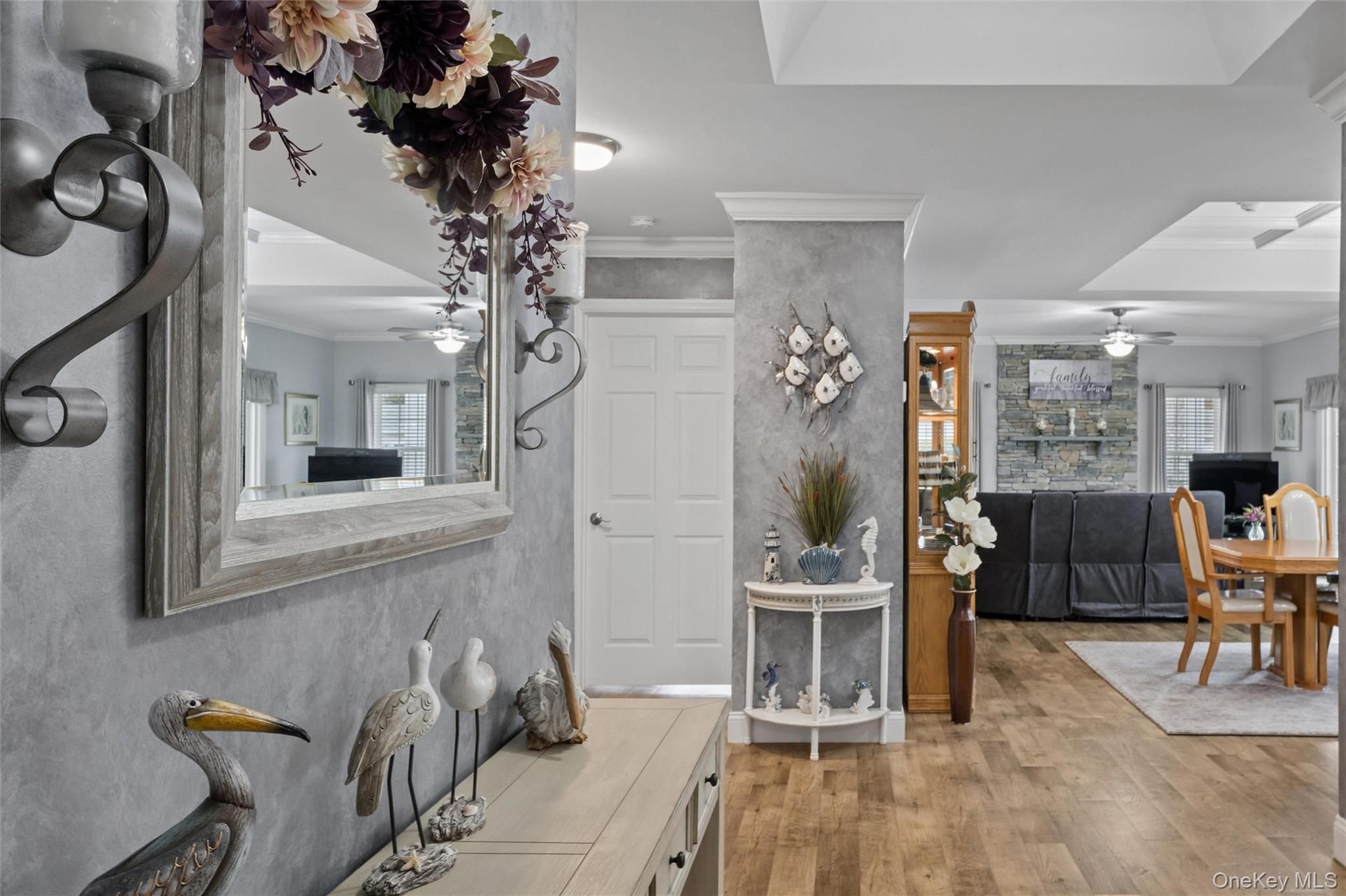Welcome to The Waterways gated 55+ where resort style living meets the charm of coastal Moriches on Forge river. Experience comfort, elegance, and pond front serenity in this beautifully renovated Edgewater model, ideally situated on the first floor for easy living. This thoughtfully designed home features a spacious, open-concept layout with a stunning kitchen showcasing newer cabinetry and granite countertops; perfect for both everyday living and entertaining. The primary suite offers peaceful pond views with a tranquil water feature, along with a recently renovated en-suite bath. A bright and airy guest bedroom and a second fully updated bathroom with all new fixtures provide comfort and flexibility for visitors. The inviting living room/dining room are centered around a cozy gas fireplace, and sliding doors that lead to your own private patio an ideal spot to unwind and take in the calming pond front scenery. The seamless flow between the kitchen and main living space enhances both functionality and style. Lovingly maintained, this home radiates warmth and pride of ownership throughout. Additional highlights include a one-car garage, central air conditioning, and a convenient roll-out awning for added outdoor comfort. Significant upgrades have been thoughtfully completed in recent years, enhancing both style and efficiency. In 2020, improvements included kitchen cabinetry, the primary bath, vinyl flooring, central air conditioning, furnace, and awning. In 2021, updates continued with the guest bath, windows, sliding glass door, garage door, and garage door opener. The outdoor space was elevated in 2022 with new patio pavers, and in 2023, a new washer and dryer were added—making this home truly move-in ready. Residents of The Waterways enjoy an exceptional array of amenities, including a clubhouse renovated in 2025, private marina on the Forge river, ballroom, heated pool, tennis and pickle ball courts, fitness center, and bocce. Discover why The Waterways is one of the most sought-after 55+ communities; offering a unique blend of beauty, tranquility, and an elevated lifestyle