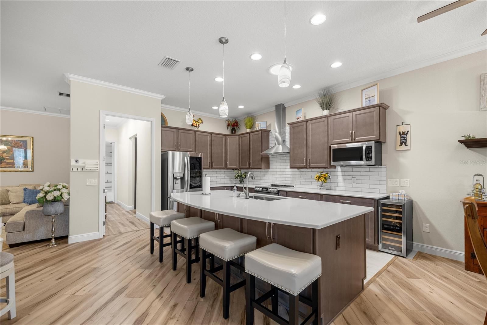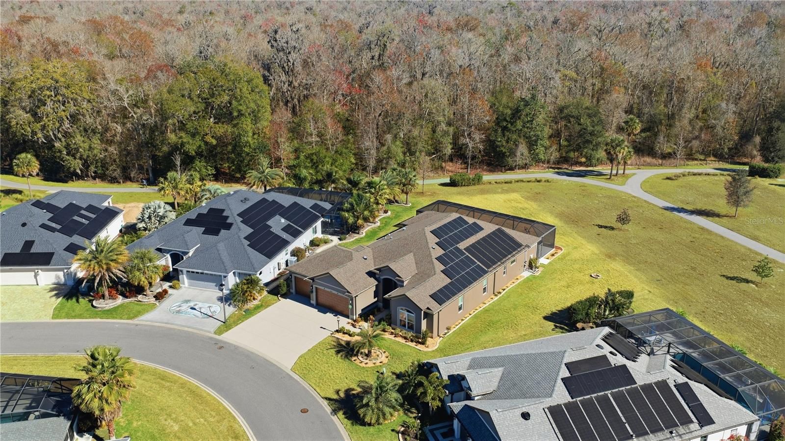 NESTLED on one of the LARGEST PREMIUM LOTS in the EXCLUSIVE Village of Bradford, this stunning IVY 10 Model Custom Pool Home offers a rare blend of architectural elegance and cutting-edge sustainability. Purchased new in 2021, the residence sits on a coveted lot that backs directly onto a permanent Nature Preserve, ensuring breathtaking views and total privacy with no rear neighbors, power lines, or traffic noise. The exterior's sophisticated block and stucco construction is complemented by professional landscaping with block flower beds and a custom-coordinated rain gutter system, setting a high standard of luxury before you even step through the custom glass front doors. Inside, the home radiates a sense of volume and grandeur with 10-foot ceilings and 8-foot solid wood doors throughout. The masterfully designed floor plan features four bedrooms and 2.5 baths, including an extended master suite that has been lengthened toward the pool for a true retreat-like feel. Architectural details like arched hallways and crown molding accent the space, while 7mm waterproof luxury plank flooring runs completely throughout the home for a seamless, modern aesthetic. The gourmet kitchen is a chef’s dream, featuring top-tier LG stainless steel appliances with European convection, Quartz Countertops, a custom backsplash, and extra-tall cabinetry with slide-out shelving. Thoughtful electrical touches abound, including under-cabinet lighting in the kitchen, floor outlets in the TV area, and E1EC outlets for maximum convenience. This estate is a marvel of modern efficiency and smart technology, designed for a low-impact, high-comfort lifestyle. A comprehensive Solar Panel system paired with a Tesla whole-house battery backup ensures minimal electrical costs and peace of mind. The home is further enhanced by a whole-house water filter, solar light tubes with integrated night lights, and a Sonos sound system that flows through every room. Climate control is highly personalized with dedicated mini-split HVAC systems in both the master bedroom and the garage. For security, the property is fully equipped with an ADT camera system and a Google video doorbell. The outdoor living space is a private sanctuary, featuring an oversized lanai and a T&D custom-built pool with auto-fill and drain technology. The pool is sheltered by a "Bird Cage" enclosure with premium tight-weave screening and minimal framing to preserve the view, and it stays comfortable year-round thanks to a dedicated solar heating system. Even the 3-Car Garage is finished to a luxury standard, boasting epoxy floors, 7-foot custom doors, 10-foot ceilings, a utility sink, and overhead storage racks. From the wine fridge area to the custom-tiled baths, every inch of this home has been upgraded to provide the ultimate Florida lifestyle.