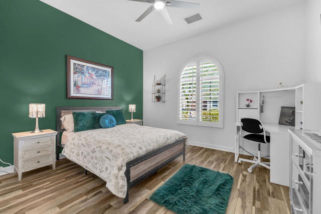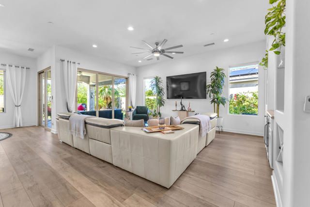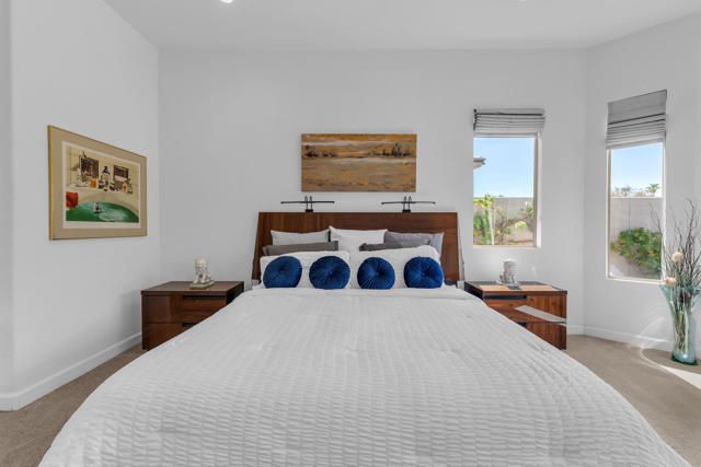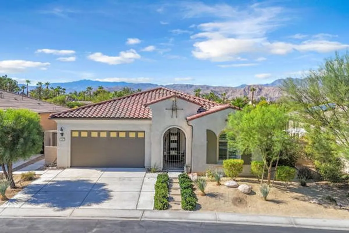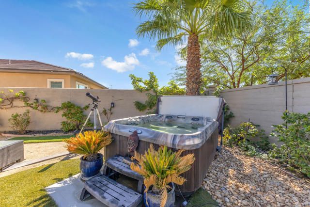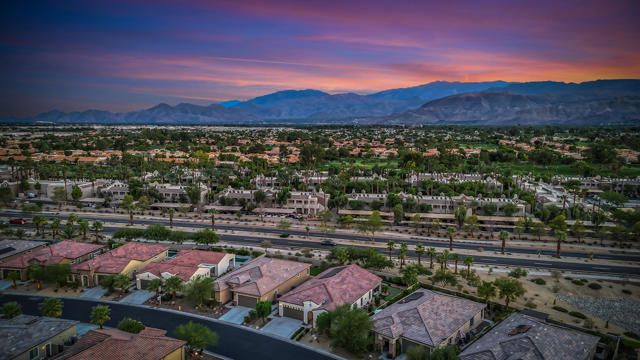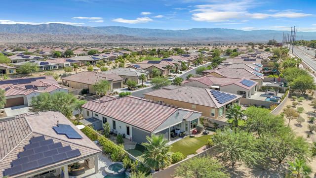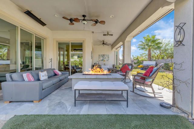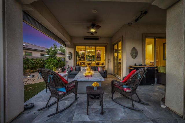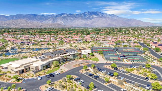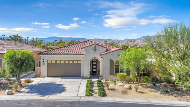 Welcome to your private desert retreat in the 55+ gated community of Del Webb Rancho Mirage! This highly desirable Preserve Model features 2 bedrooms + den (easily a 3rd bedroom), 2 baths, and a bonus flex room off the garage--perfect for a workshop, studio, or ''man-cave.'' The open-concept great room with custom bar flows seamlessly into the gourmet kitchen with stainless appliances, upgraded cabinetry, large island, and walk-in pantry. Multi-panel glass sliders lead to an expansive covered patio with tiled flooring, fire pit, commercial misting system, heaters, and remote-controlled sunshades--perfect for year-round entertaining. Enjoy low-maintenance landscaping, a private hot tub, and stunning mountain views. Residents enjoy resort-style amenities including a clubhouse, fitness center, pools, pickleball, tennis, bocce, and a vibrant social calendar.