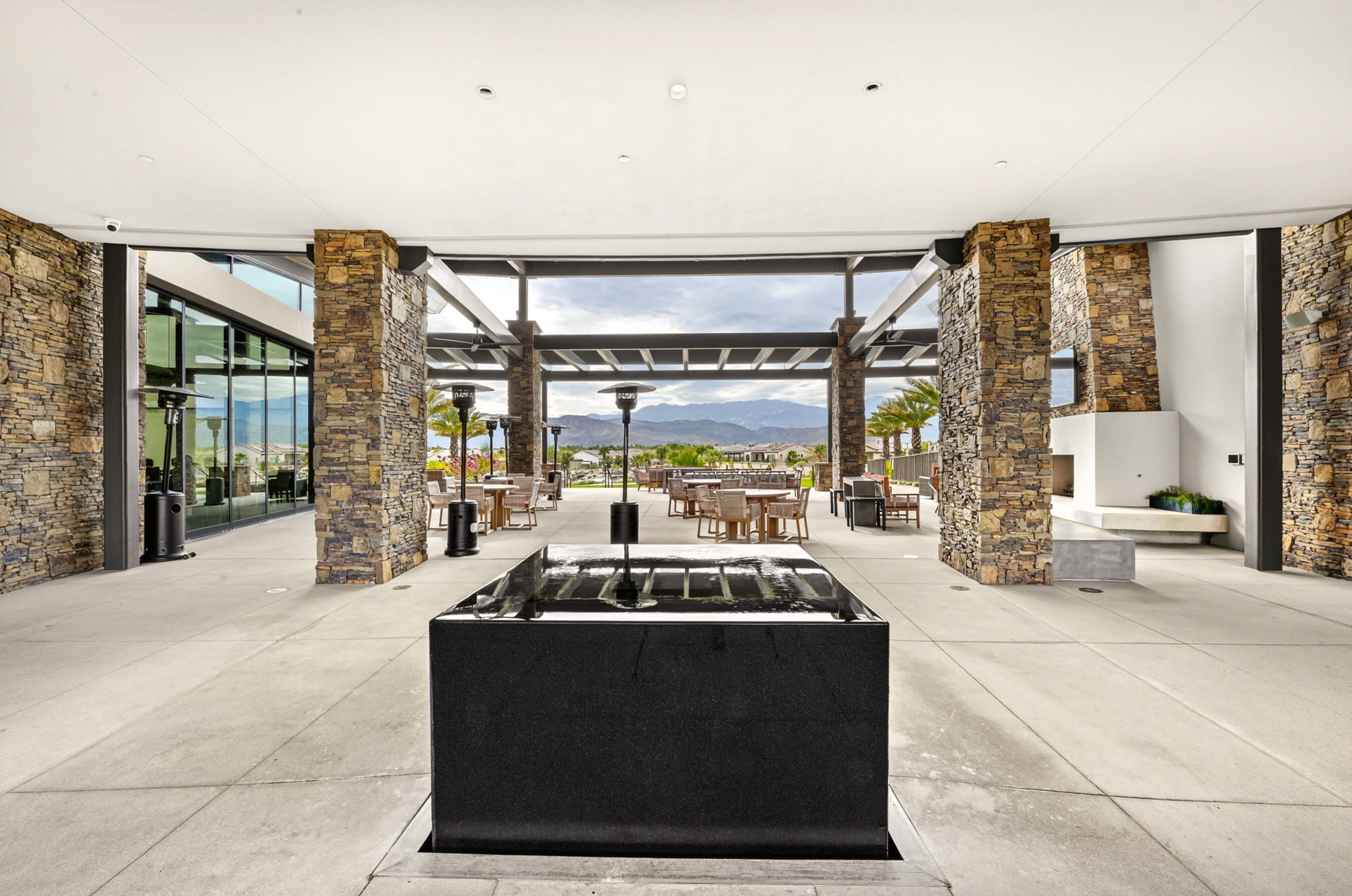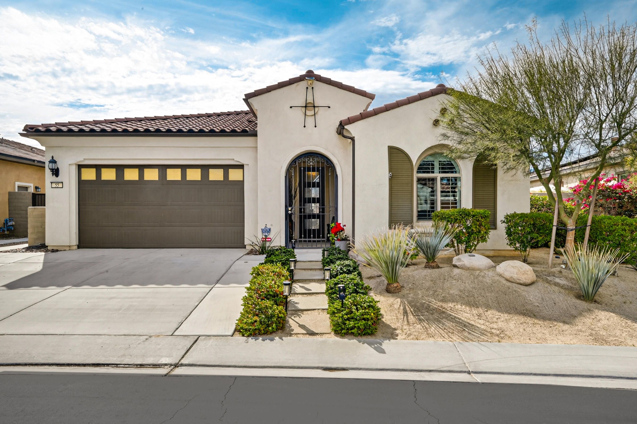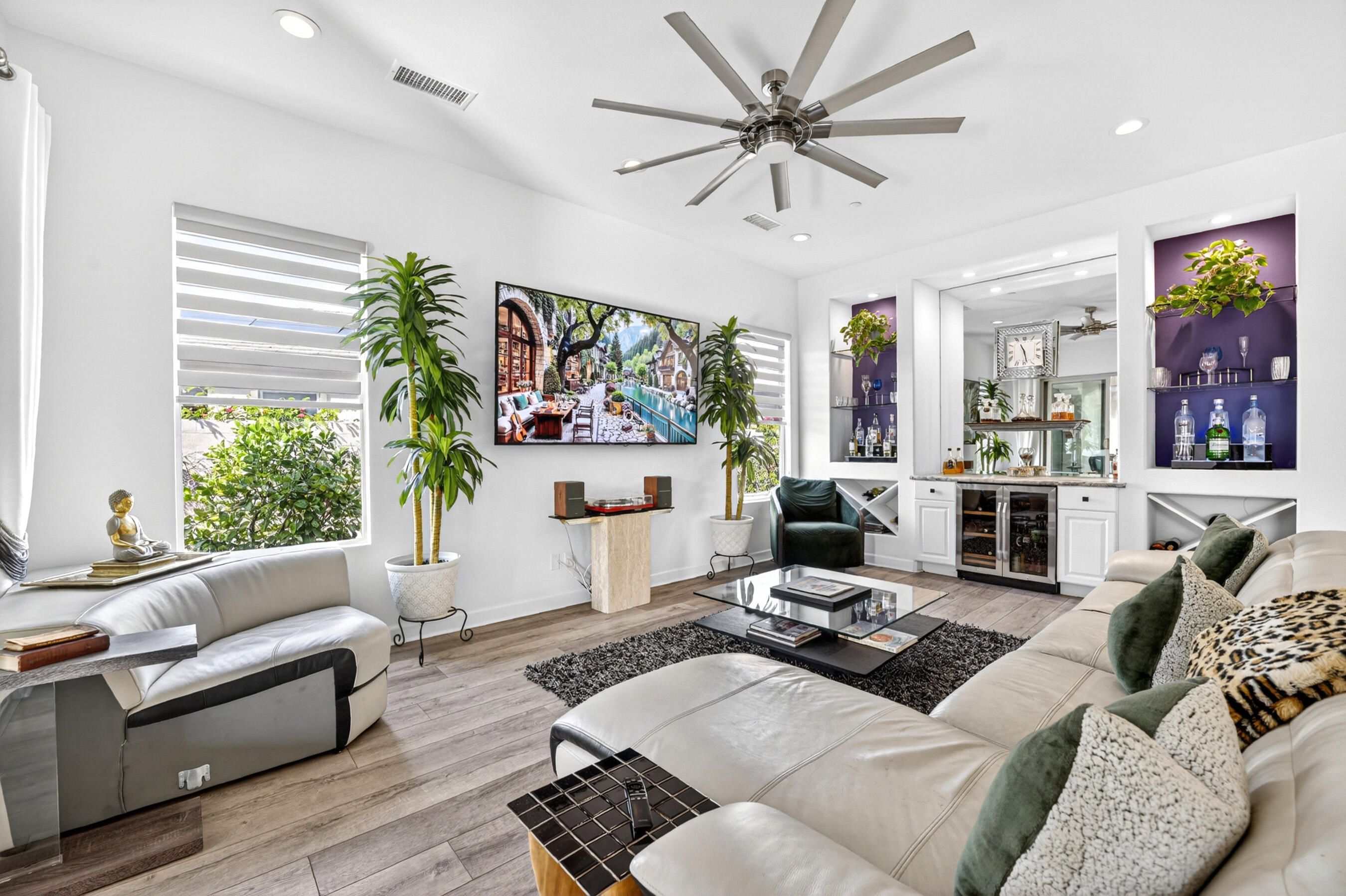 Experience elevated desert living in this beautifully upgraded home within the sought-after 55+ community of Del Webb Rancho Mirage. Built in 2019 and thoughtfully enhanced throughout, this residence offers 2,034 square feet of refined living space on a generous 7,579 square foot lot, featuring 2 bedrooms plus a versatile den or optional third bedroom and 2 well-appointed baths. Inside, the open-concept great room is designed for both comfort and entertaining, highlighted by custom sliding doors that create seamless indoor-outdoor flow and a striking custom bar complete with wine and beer refrigeration. The chef's kitchen showcases quartz countertops with full backsplash and subway tile, custom beveled glass pantry door with added shelving, as well as pull-out spice rack, instant hot water dispenser, and a new Bosch dishwasher—blending beauty with everyday functionality. A whole-house water filtration system and custom fans throughout further enhance comfort and efficiency. The spacious primary suite serves as a private retreat, featuring a bay window, huge upgraded custom shower, and bidet toilet for spa-like luxury. Step outside to a resort-inspired backyard designed for year-round enjoyment, where tile patio flooring, motorized shades, cooling misters, custom outdoor fans and heaters, a jacuzzi hot tub, putting green, and a custom gas fire pit create the ultimate setting for relaxation or entertaining under the desert sky. Located in the premier gated community of Del Webb Rancho Mirage, residents enjoy world-class amenities, vibrant social opportunities, and an exceptional active-adult lifestyle—making this impeccably upgraded home a rare opportunity to enjoy the very best of desert living.