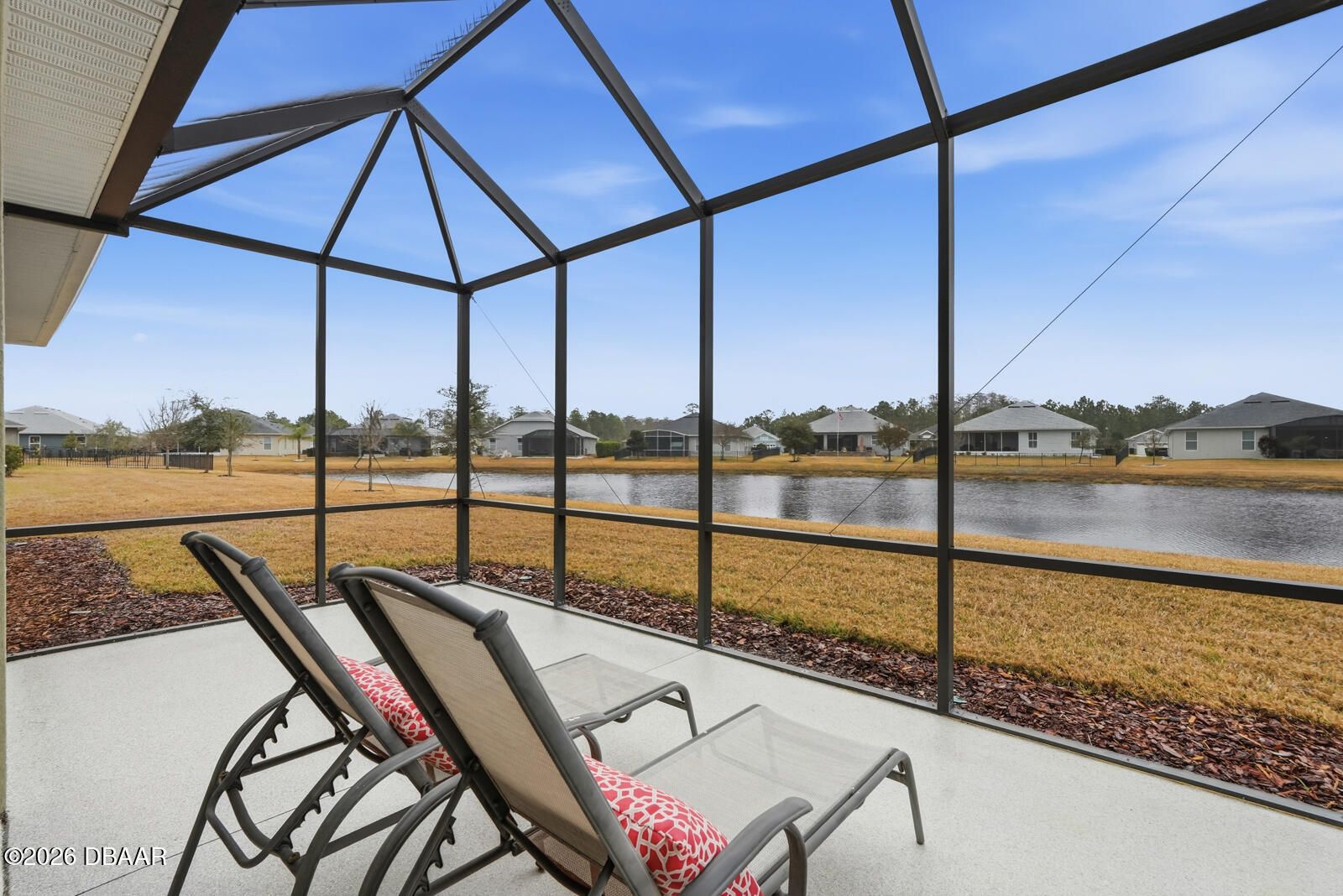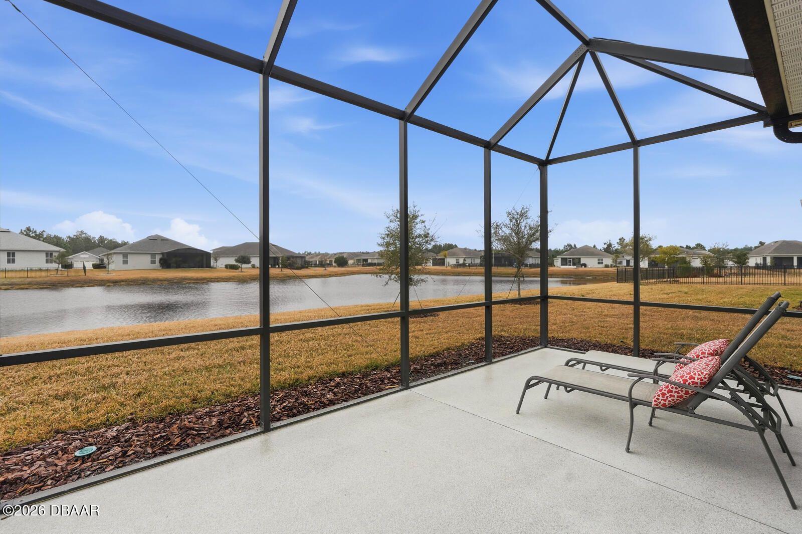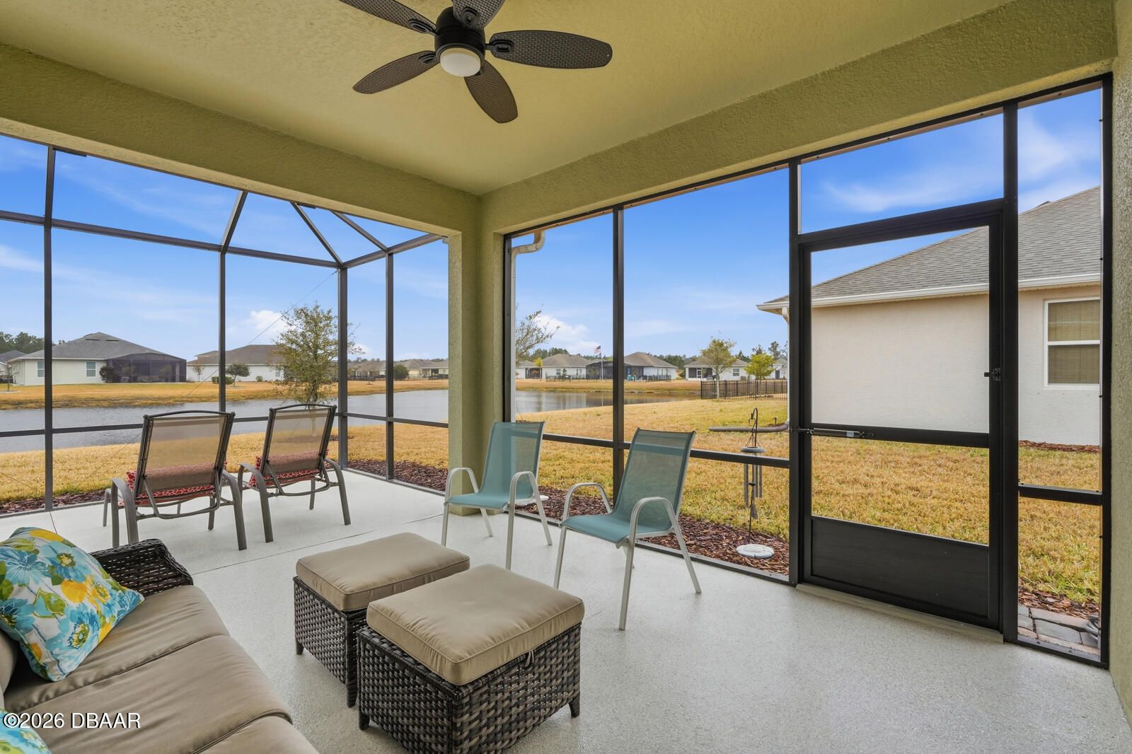 Imagine trading snow boots for sunshine in this stunning Holiday Builder home, perfectly situated in the sought-after 55+ community of Hunters Ridge. Designed for effortless living, this home delivers the ultimate zero-maintenance lifestyle—say goodbye to shoveling, scraping, and weekend chores. Lawn care, exterior paint, pressure washing, high-speed internet, cable TV, irrigation, tree trimming, fertilization, pest control, and mulch are all included, leaving you free to simply enjoy life. Inside, the light-filled, open design immediately feels welcoming and relaxed. With four thoughtfully split bedrooms and two bathrooms, the layout balances comfort, privacy, and easy everyday living. The owner's suite is a true warm-weather retreat, featuring dual sinks, an oversized walk-in shower, a generous walk-in closet—plus two additional closets for all your Florida lifestyle needs. Step outside to the expansive screened lanai and soak in peaceful lake views while enjoying gentle breezes and year-round usability thanks to panoramic screening and ideal southern exposure. Whether you're sipping your morning coffee or unwinding at sunset, this serene outdoor space makes every day feel like a vacation.