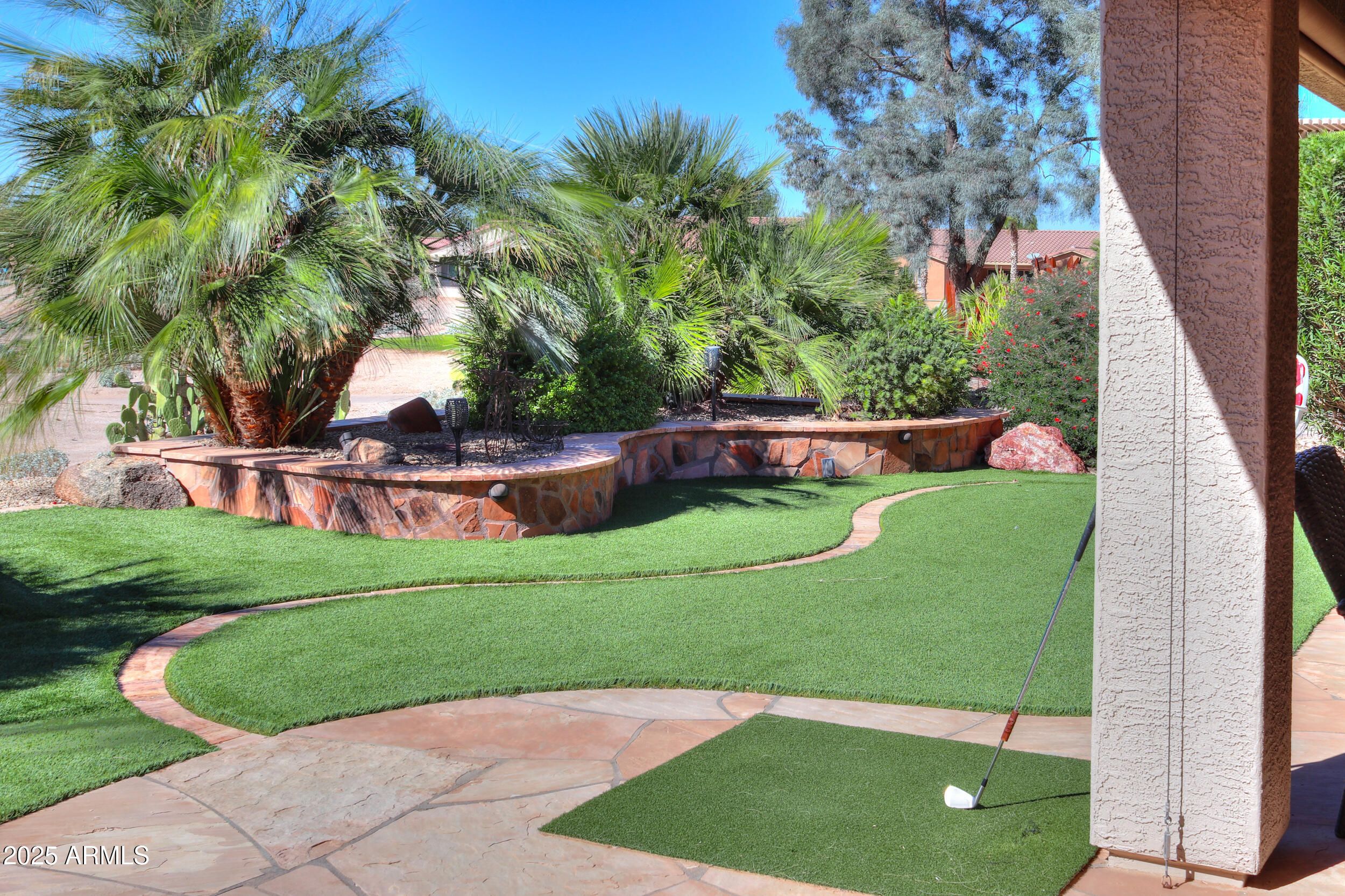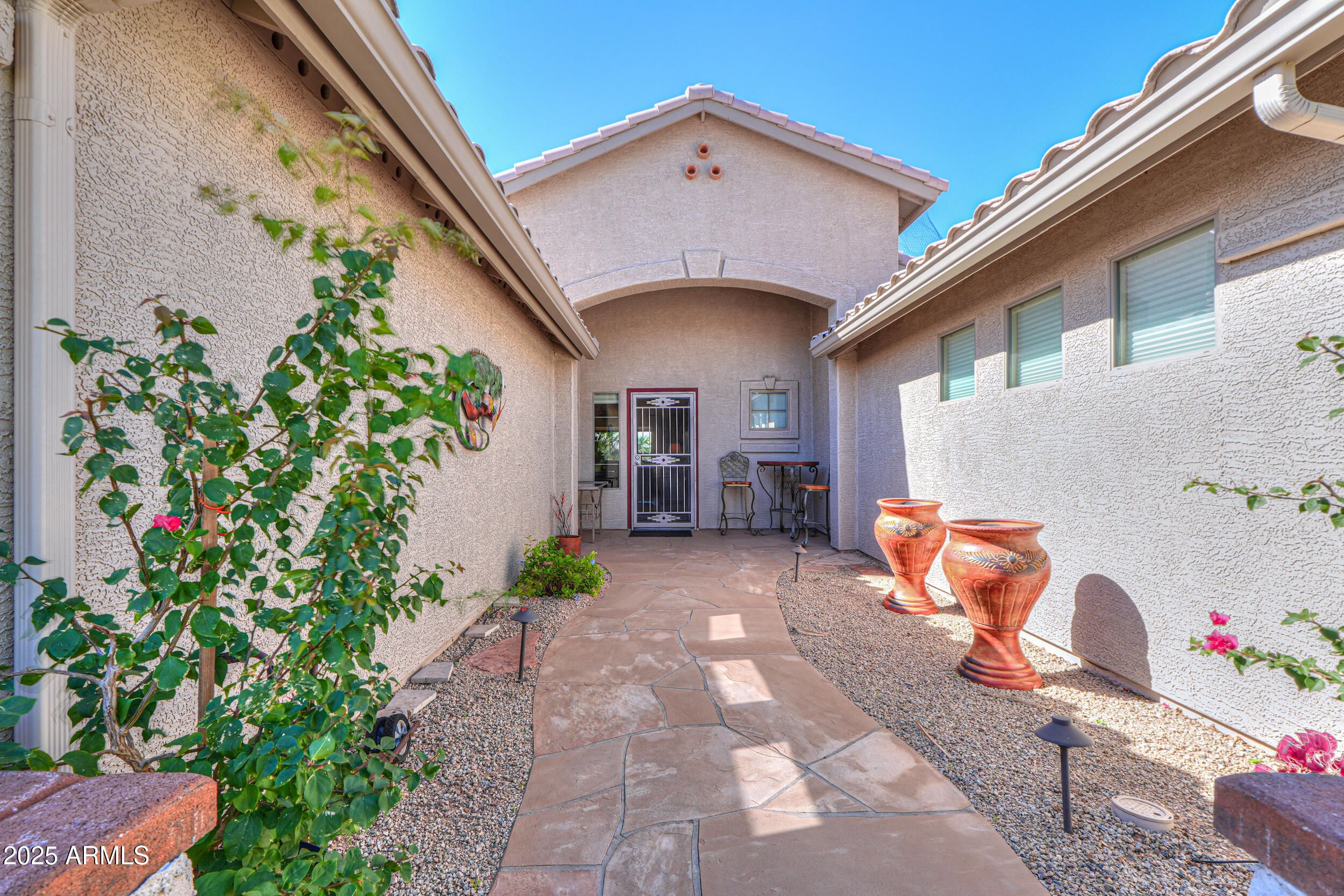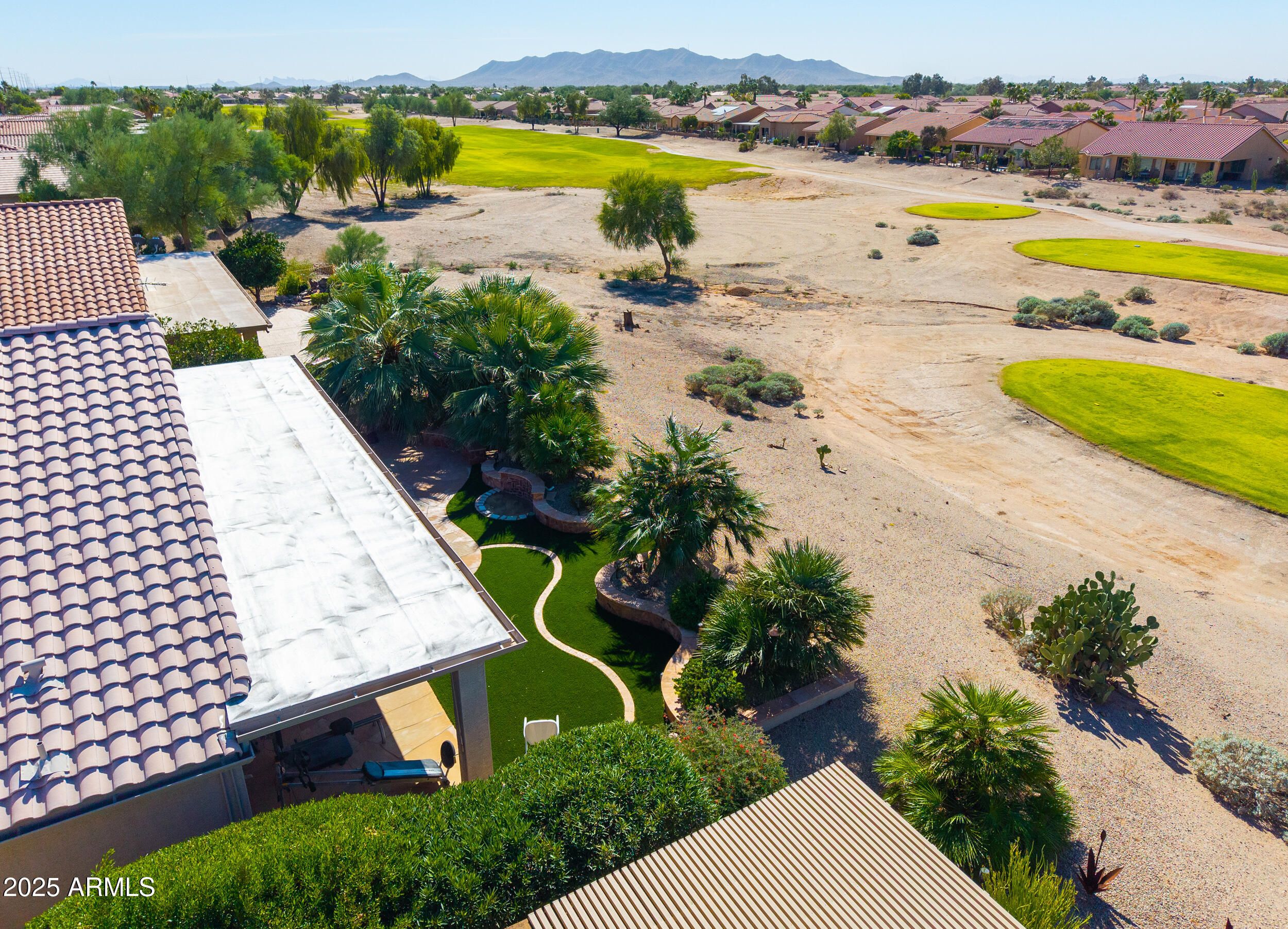 Experience resort-style living in this partially furnished home overlooking the breathtaking Mission Royale Golf Course. From the moment you step onto the elegant flagstone walkway, you'll know you've found something special. Step inside to discover a spacious open floor plan with vaulted ceilings, tile flooring with a bright, airy feel throughout. The gorgeous kitchen is a showstopper, featuring engineered stone countertops, stylish backsplash, stainless steel appliances & beautiful Hickory cabinets with hardware & reverse osmosis water system. Wake up to amazing golf course views from your serene primary suite. The luxurious en-suite bath includes a marble shower surround &a dual marble vanity for a true spa-like experience. The extended garage offers even more convenience with built-in cabinetry, utility sink, water softener, ceiling fan & epoxy flooring. Your private backyard oasis is the ultimate retreat! Enjoy the full-length covered patio with recently recoated flagstone, three ceiling fans with lights, a built-in BBQ, tranquil water feature, low-maintenance artificial turf & beautifully manicured landscaping, perfect for entertaining or simply relaxing with a view. For added convenience, there is also a 4x7 shed! As part of the sought-after Mission Royale Active Adult Community, you'll have access to incredible amenities including a championship golf course, tennis and pickleball courts, two sparkling swimming pools, large jacuzzi, billiard & ballroom, fitness center, library & so much more! Don't miss your chance to own this stunning home where luxury, comfort & lifestyle come together perfectly!