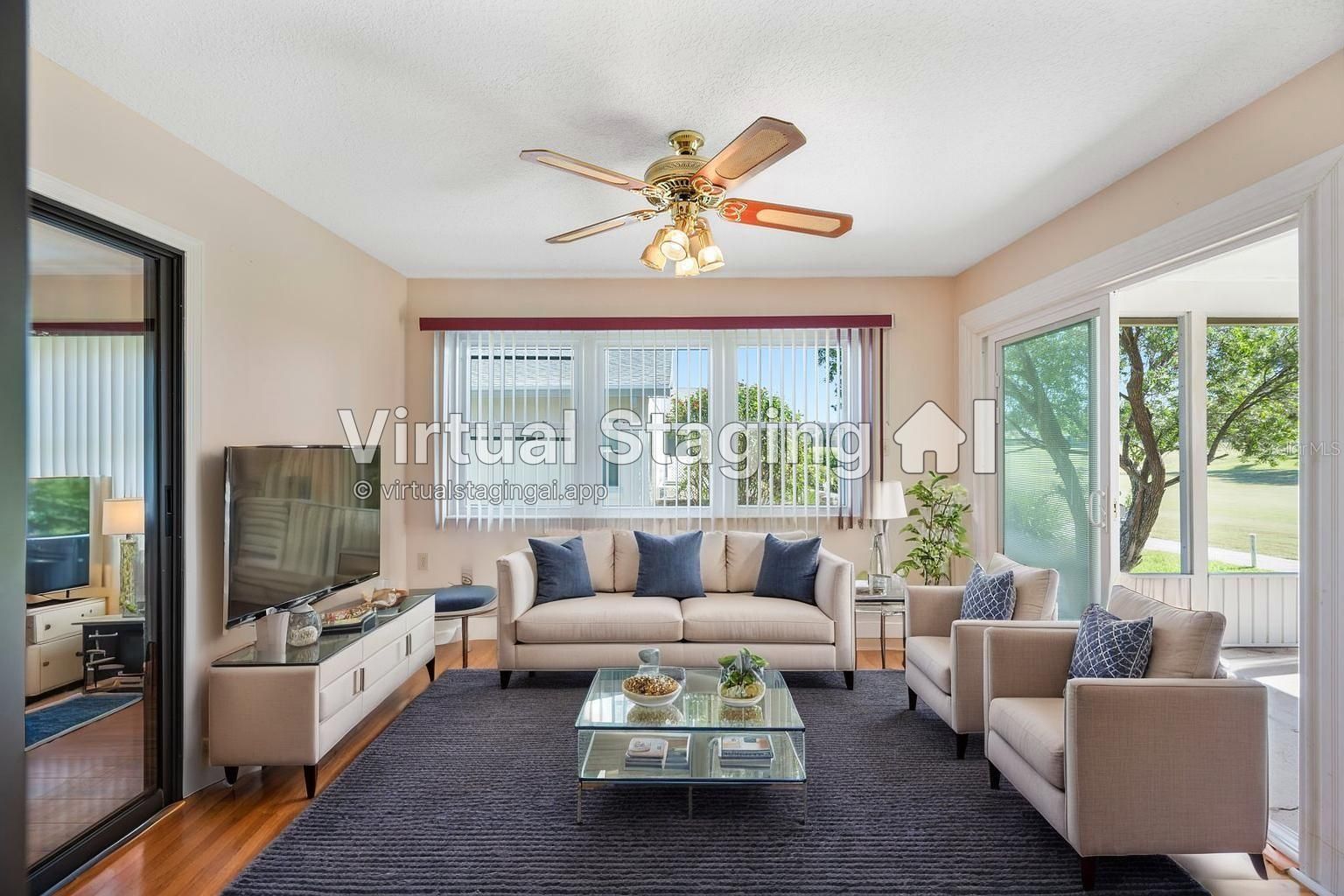 One or more photo(s) has been virtually staged. Perfectly situated on the golf course with scenic 11th fairway views, this beautiful home is located in the highly sought-after Sandpiper Golf & Country Club, a premier 55+ gated golf community in Central Florida. This move-in-ready residence features an inviting open floor plan designed for both everyday comfort and easy entertaining after a day on the course. A brick paver driveway and walkway provide excellent curb appeal, while custom built-in closets in both bedrooms which provides smart storage. Enjoy true indoor-outdoor living with a sunny Florida room and a spacious screened brick-paver lanai, complete with additional private golf cart parking in the rear—perfect for morning coffee while watching play on the course or relaxing afternoons with peaceful views. The split floor plan, two bedrooms and two baths, a combined living, dining, and kitchen area with a separate breakfast nook, sliding glass doors with privacy blinds, and an inside laundry room for added convenience. Sandpiper delivers a resort-style golf lifestyle year-round, featuring an 18-hole golf course, two community pools, two clubhouses, pickleball, tennis, shuffleboard, library, billiards, a recreation center, RV/boat parking (additional fee), and gated security. The main clubhouse offers a restaurant open seven days a week plus a full-service bar and lounge with a lively sports-style atmosphere—perfect for unwinding after a round. Conveniently located near I-4, Orlando, Tampa, shopping, and dining. The HOA covers lawn care, security, internet, and cable, making this an easy, low-maintenance way to enjoy the Florida golf lifestyle. Schedule your private showing today and start living where every day feels like a vacation. Roof (2019) Brick Pavers (2016) Windows Replaced (2016) Front Door and sliding glass door replaced (2022), New AC (2026).