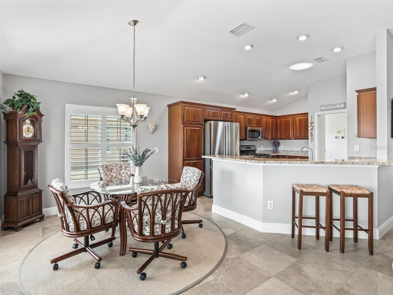 - Cathedral Ceiling(s), Ceiling Fan(s), Eat-in Kitchen, High Ceilings, Living/Dining Room, Open Floorplan, Main Level Primary, Split Bedrooms, Stone Counters, Thermostat, Tray Ceiling(s), Walk-In Closet(s), Window Treatments