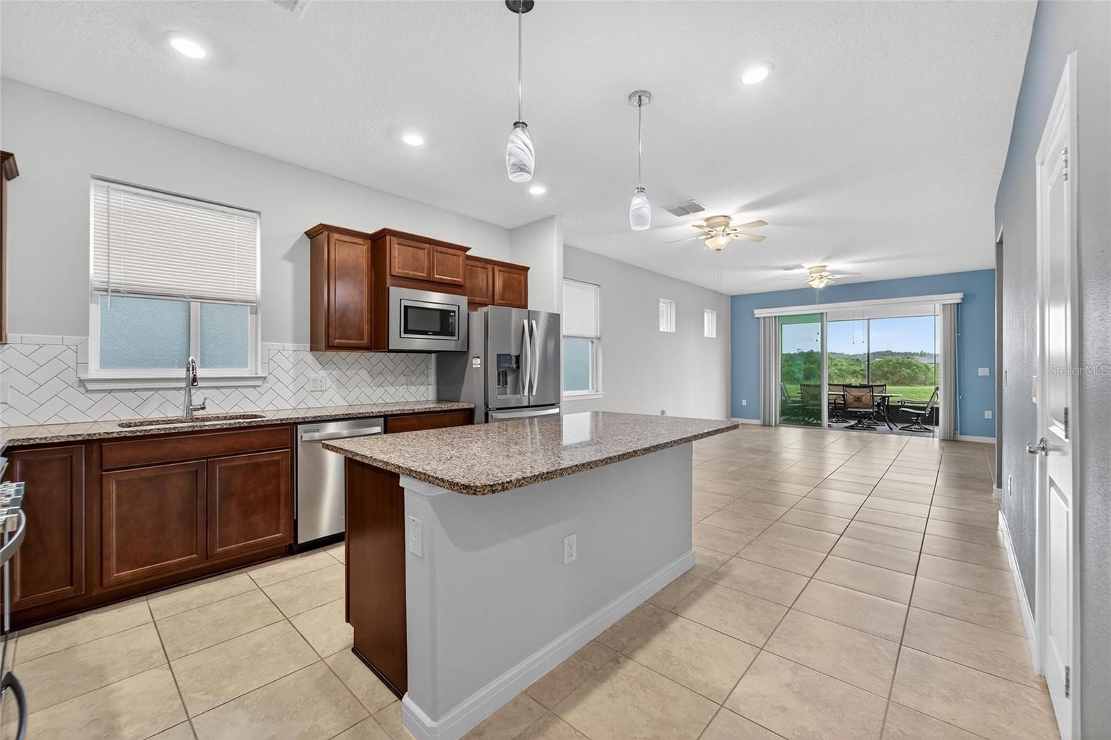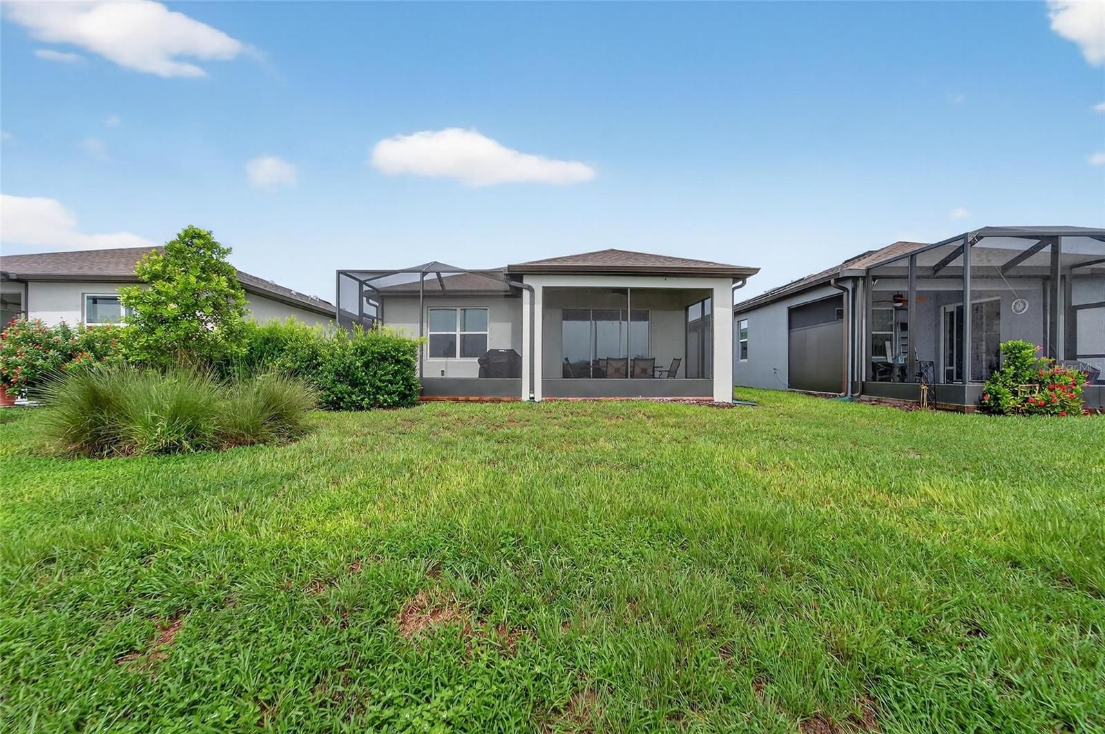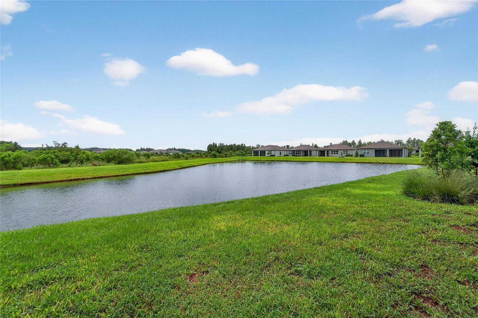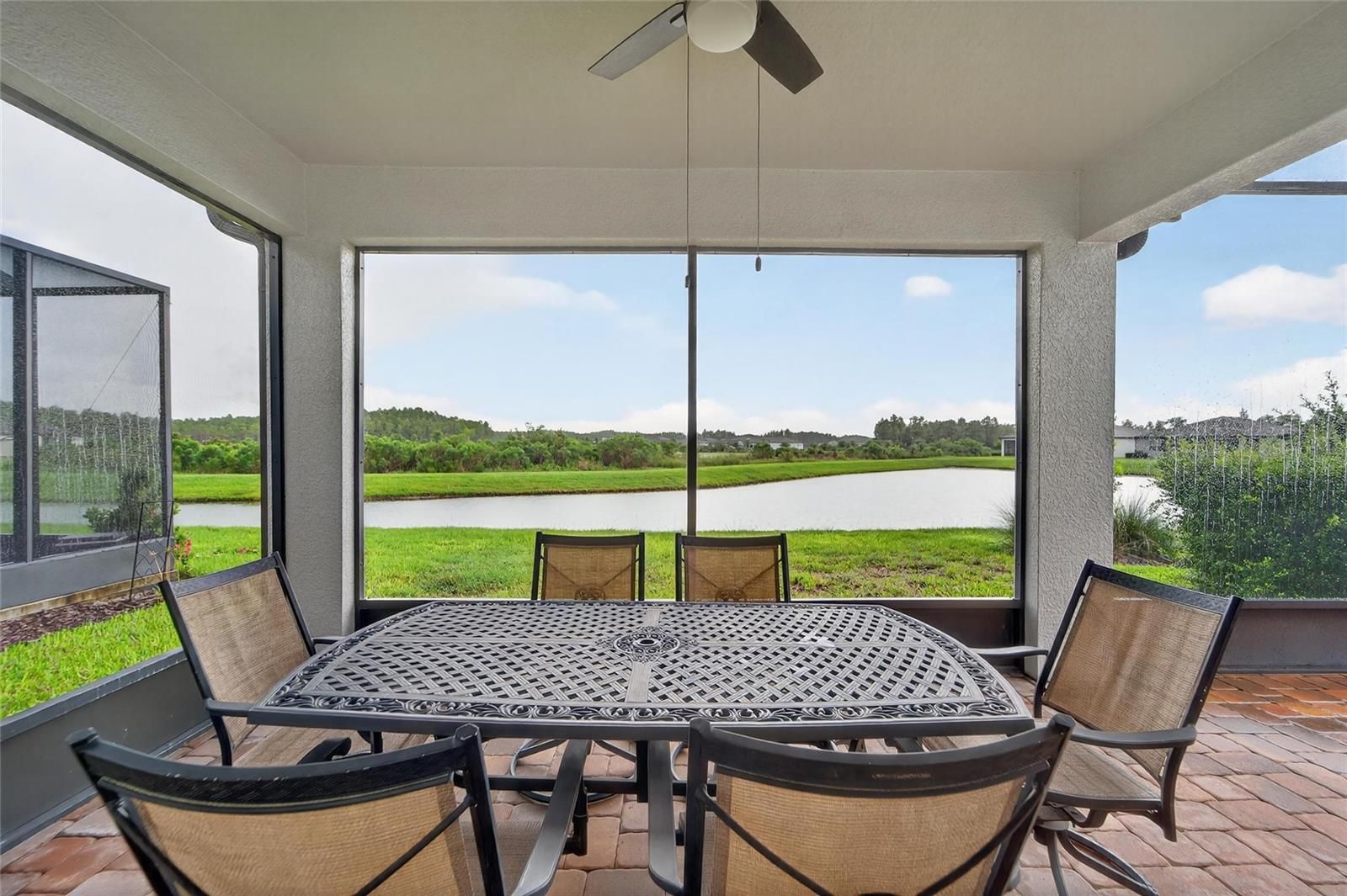 One or more photo(s) has been virtually staged. New Price for this home with a WATER VIEW! - Life is good in this 55+ active adult community of Del Webb Bexley, where a full-time activities director ensures there’s always something fun to do. Step inside this 3 Yr NEW home where just off the foyer you will discover a flex space—ideal for crafting, gaming or working at your desk. The open floor plan creates a roomy feel, perfect for entertaining guests while you cook in your modern kitchen, complete with Whirlpool Stainless Steel Appliances, GRANITE countertops, a chevron tile backsplash, pendant lighting over the breakfast bar and elegant dark cabinetry. Coastal Blue accent walls add a refreshing touch throughout the home. At the front of the home, you’ll find a guest bedroom with a walk-in closet and a full bathroom, while the primary ensuite bedroom is tucked away at the back for maximum privacy. The primary bathroom boasts DUAL SINKS, GRANITE countertops, linen closet and a glass shower with bench and soap niche. Both bedrooms are carpeted, while the rest of the home features beautiful, upgraded large-format tile flooring. Storage is plentiful with a coat closet, linen closet and an extra-large primary suite walk-in closet. The inside laundry room includes a Whirlpool washer and dryer for your convenience. Enjoy unwinding on your spacious screen enclosed lanai overlooking a tranquil pond. - There you will find a gas line stub, so you can use a natural gas grill. The epoxy finished two car garage has been extended by four feet, providing space for an extra-long SUV or additional storage. Your monthly HOA fee includes Spectrum internet and cable, the use and maintenance of state-of-the-art amenities, landscaping within the common areas inside of the gates and maintenance of the landscape on your home site. In addition your monthly fee includes a broad internet and cable TV package. In this gated community the clubhouse features a fitness center, ball room, multi-purpose rooms, clubs, planned activities, a bistro and more. Outdoors you will enjoy bocce ball, pickle ball, tennis, a resort style zero entry heated pool, additional walking resistance pool, spa, community garden and even a dog park. Feel free to jump on your golf cart and drive to the Meridian Clubhouse where you will meet up with your new friends and neighbors!
