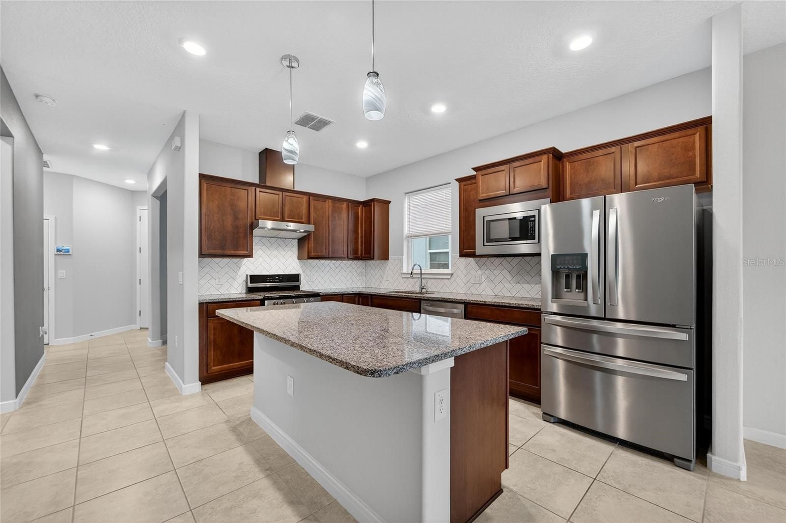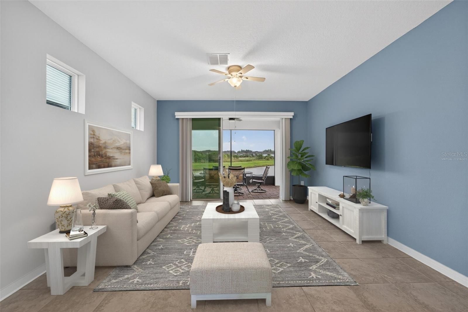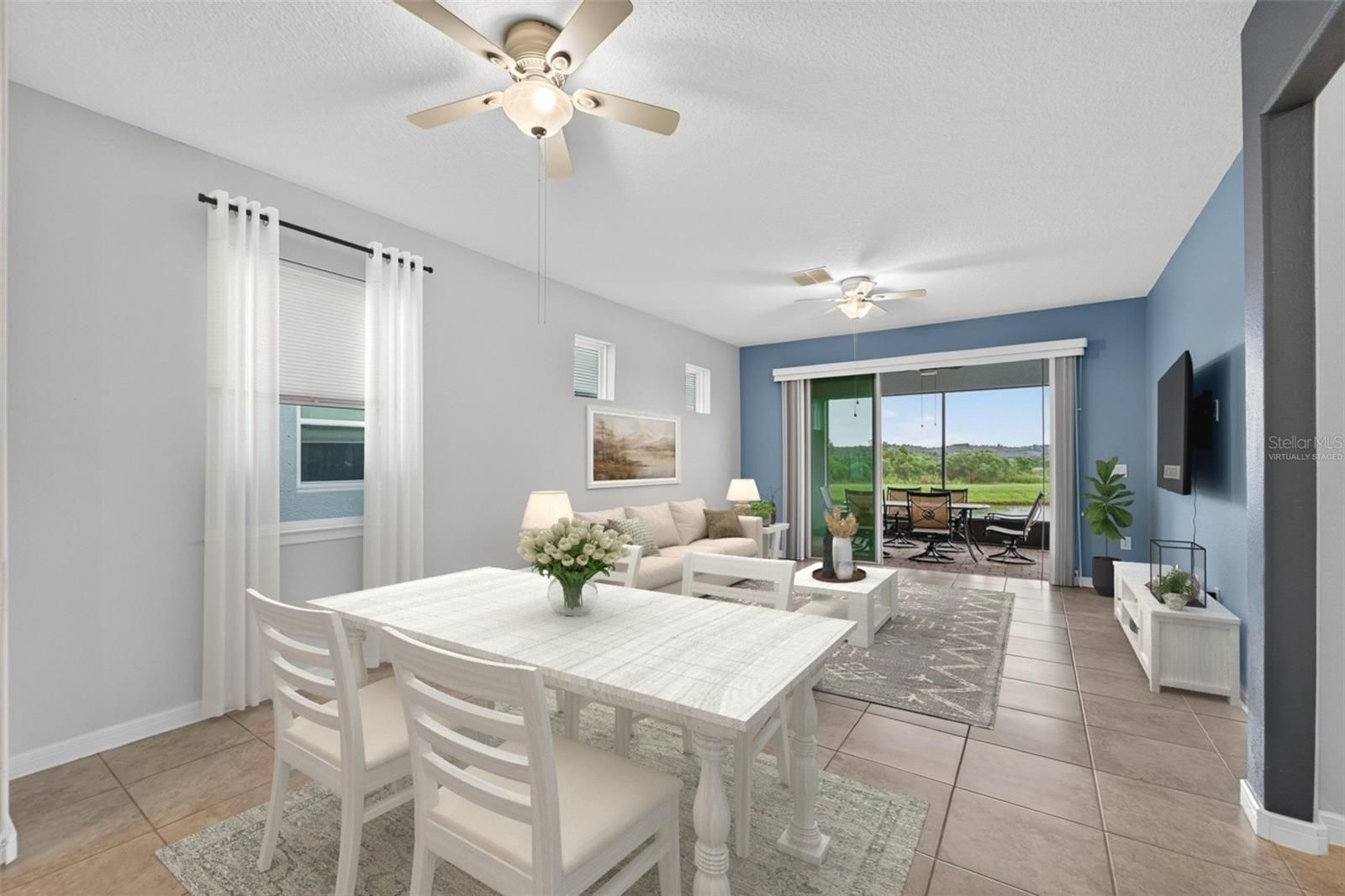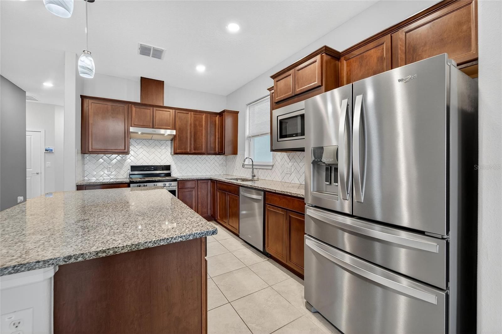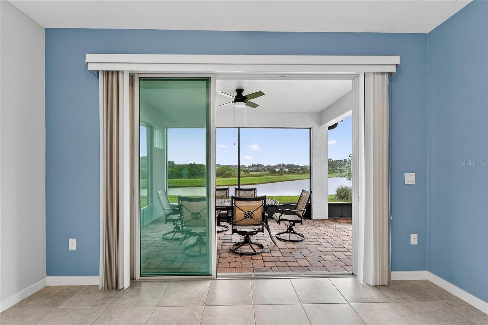 One or more photo(s) has been virtually staged. New Price for this home with a WATER VIEW! - Life is good in this 55+ active adult community of Del Webb Bexley, where a full-time activities director ensures there’s always something fun to do. Step inside this 3 Yr NEW home where just off the foyer you will discover a flex space—ideal for crafting, gaming or working at your desk. The open floor plan creates a roomy feel, perfect for entertaining guests while you cook in your modern kitchen, complete with Whirlpool Stainless Steel Appliances, GRANITE countertops, a chevron tile backsplash, pendant lighting over the breakfast bar and elegant dark cabinetry. Coastal Blue accent walls add a refreshing touch throughout the home. At the front of the home, you’ll find a guest bedroom with a walk-in closet and a full bathroom, while the primary ensuite bedroom is tucked away at the back for maximum privacy. The primary bathroom boasts DUAL SINKS, GRANITE countertops, linen closet and a glass shower with bench and soap niche. Both bedrooms are carpeted, while the rest of the home features beautiful, upgraded large-format tile flooring. Storage is plentiful with a coat closet, linen closet and an extra-large primary suite walk-in closet. The inside laundry room includes a Whirlpool washer and dryer for your convenience. Enjoy unwinding on your spacious screen enclosed lanai overlooking a tranquil pond. - There you will find a gas line stub, so you can use a natural gas grill. The epoxy finished two car garage has been extended by four feet, providing space for an extra-long SUV or additional storage. Your monthly HOA fee includes Spectrum internet and cable, the use and maintenance of state-of-the-art amenities, landscaping within the common areas inside of the gates and maintenance of the landscape on your home site. In addition your monthly fee includes a broad internet and cable TV package. In this gated community the clubhouse features a fitness center, ball room, multi-purpose rooms, clubs, planned activities, a bistro and more. Outdoors you will enjoy bocce ball, pickle ball, tennis, a resort style zero entry heated pool, additional walking resistance pool, spa, community garden and even a dog park. Feel free to jump on your golf cart and drive to the Meridian Clubhouse where you will meet up with your new friends and neighbors!