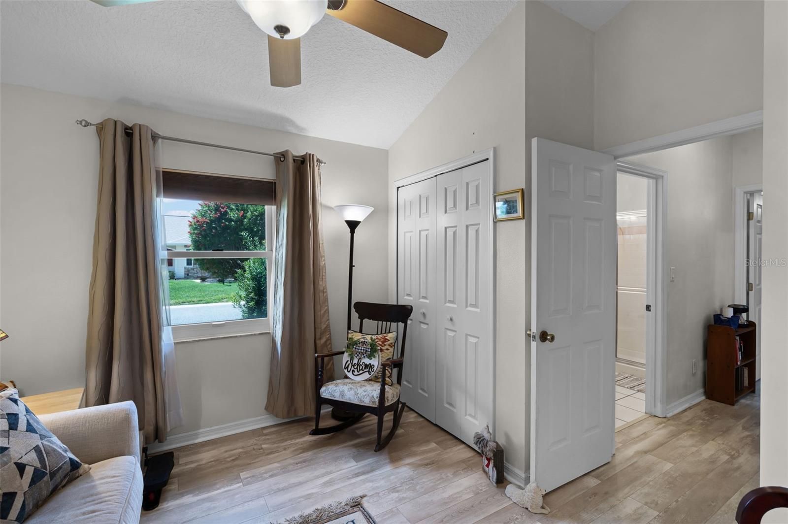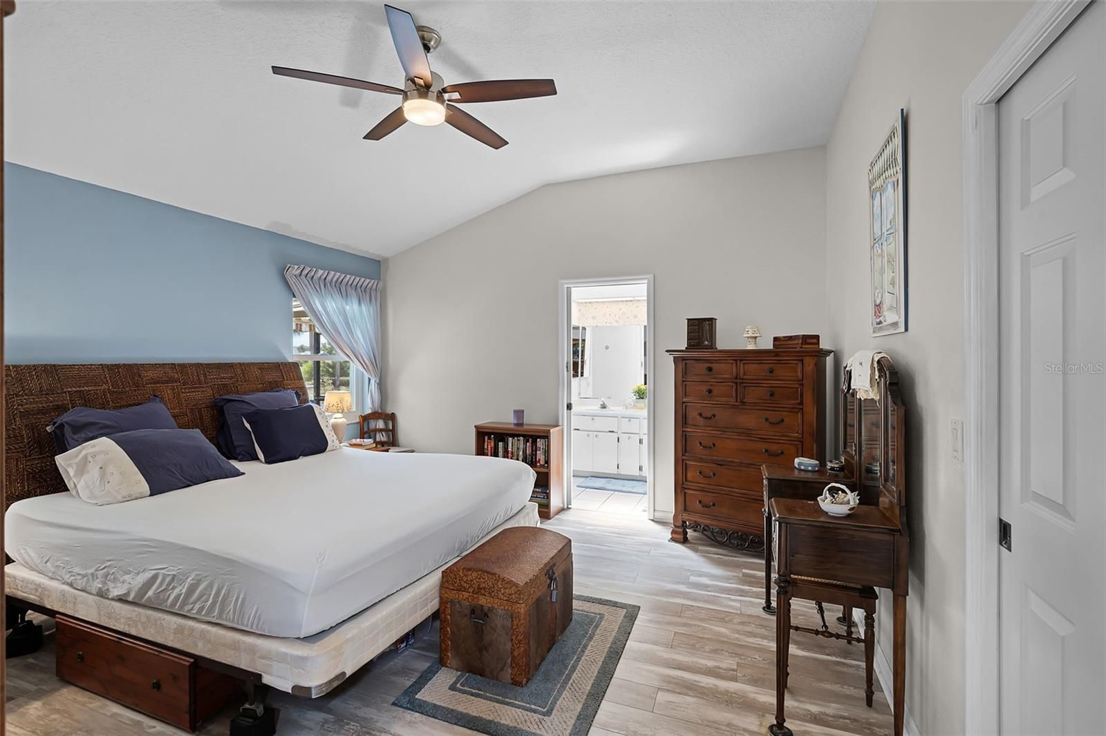 - Ceiling Fan(s), Eat-in Kitchen, Open Floorplan, Main Level Primary, Solid Surface Counters, Solid-Wood Cabinets, Split Bedrooms, Thermostat, Walk-In Closet(s)
