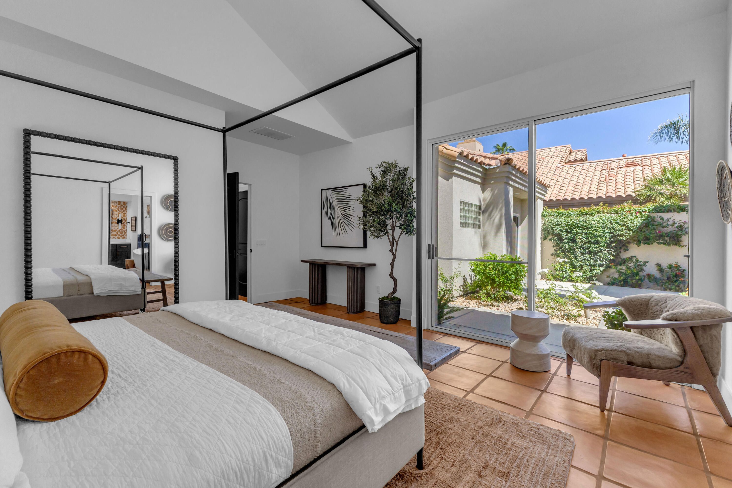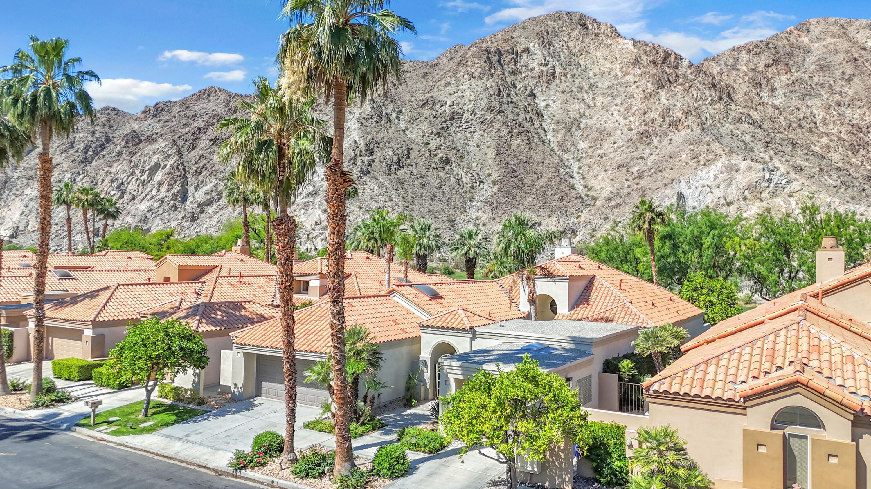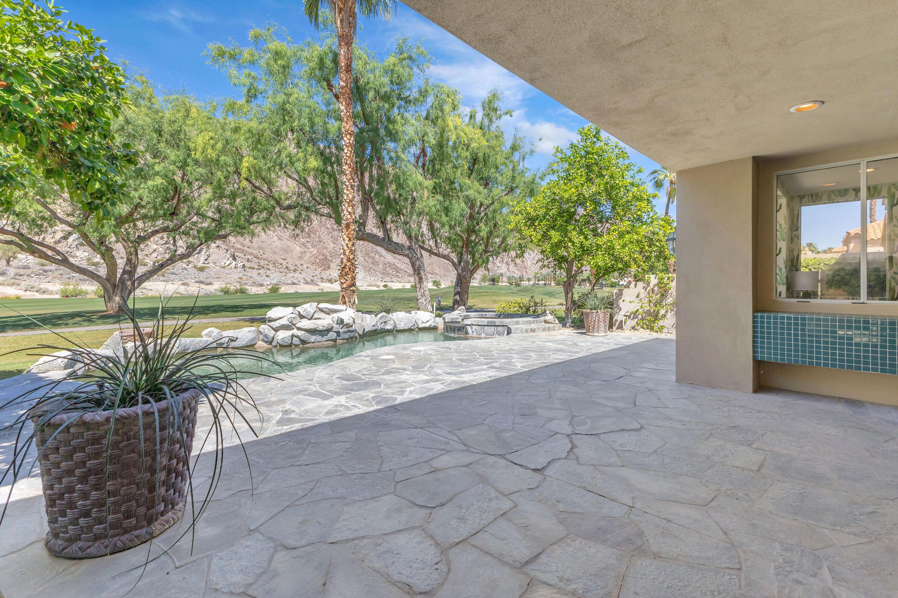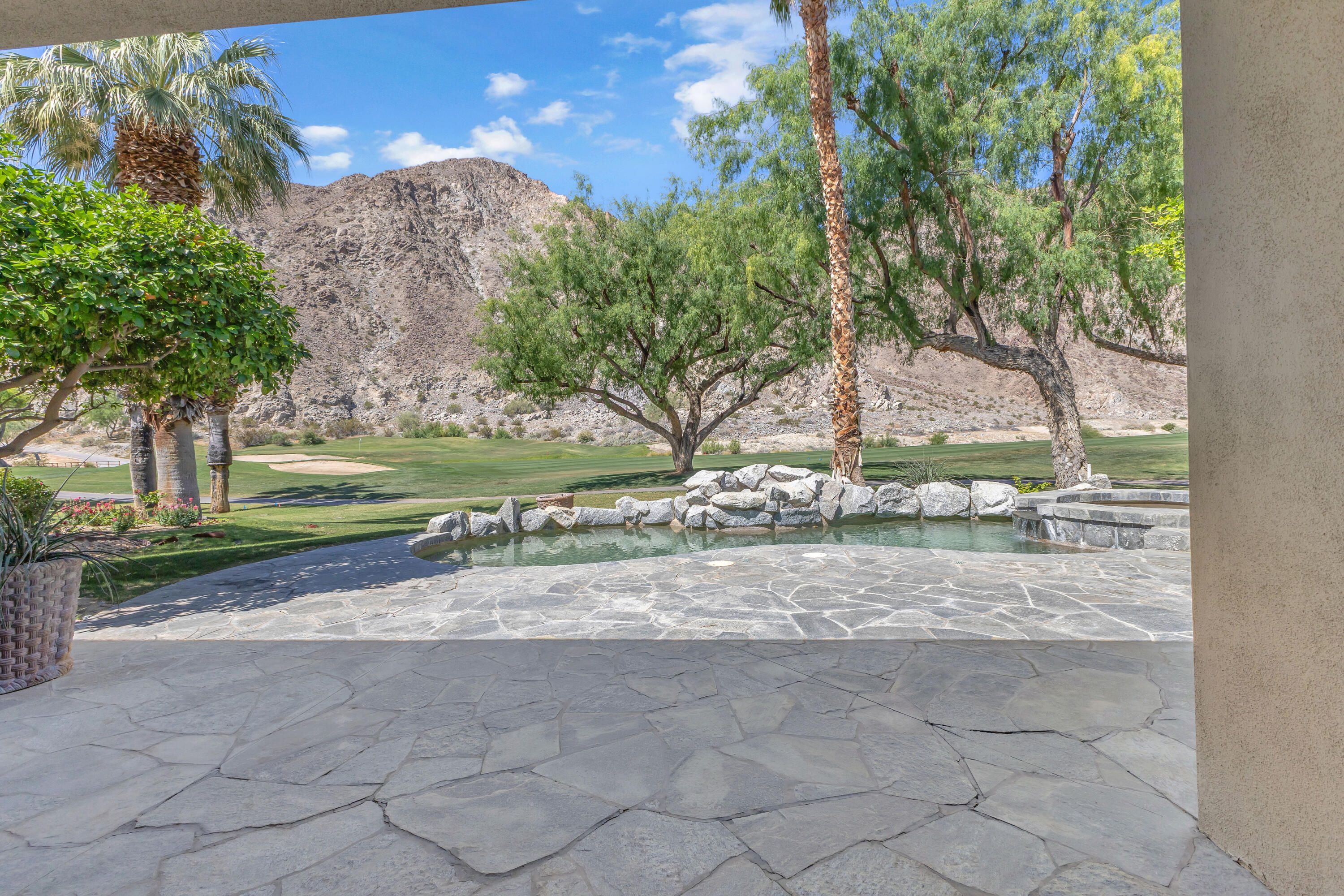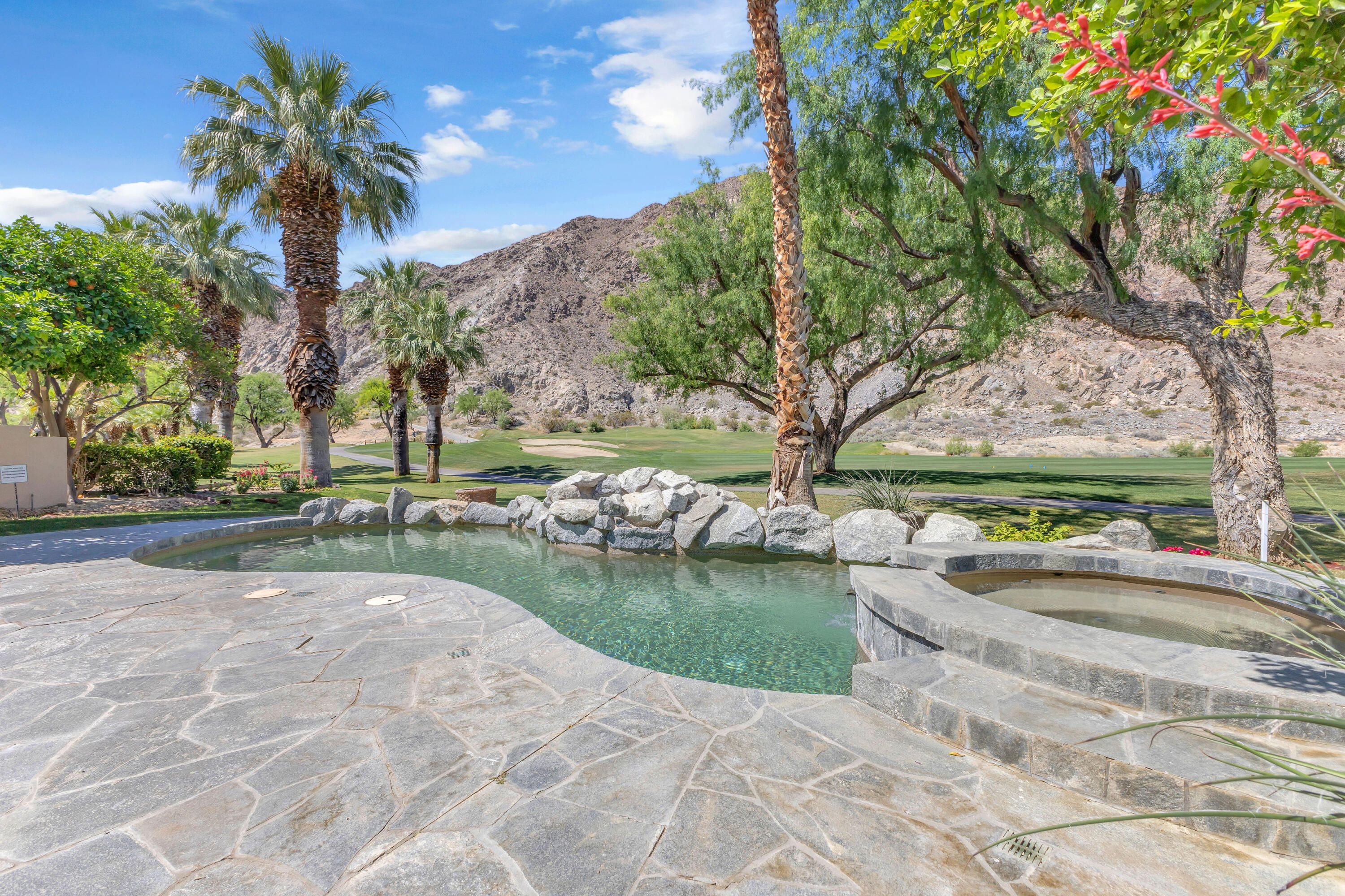 Experience elevated desert living in this exquisitely remodeled luxury residence, where no detail has been overlooked. This home offers 4 bedrooms and 4.5 bathrooms, thoughtfully redesigned with the finest high-end materials and impeccable craftsmanship throughout. New Saltillo flooring flows beautifully through the home, highlighted by custom accents at the step down into the sunken living room--adding warmth, character, and architectural charm. Every bathroom has been exquisitely reimagined with premium fixtures and elegant tile work. The primary suite delivers a spa-inspired retreat, featuring a stunning standalone soaking tub and a separate glass-enclosed shower designed for ultimate relaxation. Professionally curated with designer-selected art and furnishings--all included--this home offers a truly turnkey, move-in-ready experience. The detached casita, equally refined and fully furnished, provides a private and luxurious space for guests or extended stays. Modern upgrades include a new HVAC system for enhanced comfort, as well as a mini-split system in the garage. Both garages feature brand-new epoxy flooring, combining durability with a sleek, polished look. Step outside to your own resort-style oasis, where a sparkling pool overlooks the 15th fairway of the Palmer Private Course within the prestigious PGA West community. Enjoy unobstructed mountain views, lush golf course scenery, and breathtaking sunsets from your own backyard. This is more than a home, it's a seamless blend of luxury, design, and effortless indoor-outdoor living in one of the desert's most sought-after settings. PGA West offers 3 private and 3 public golf courses, tennis, pickleball, 3 clubhouses, restaurants,& 24-hour guard-gated security. HOA dues conveniently cover building structure, exterior paint, roof, ,full landscaping & irrigation, internet, cable, trash, and more making ownership effortless.