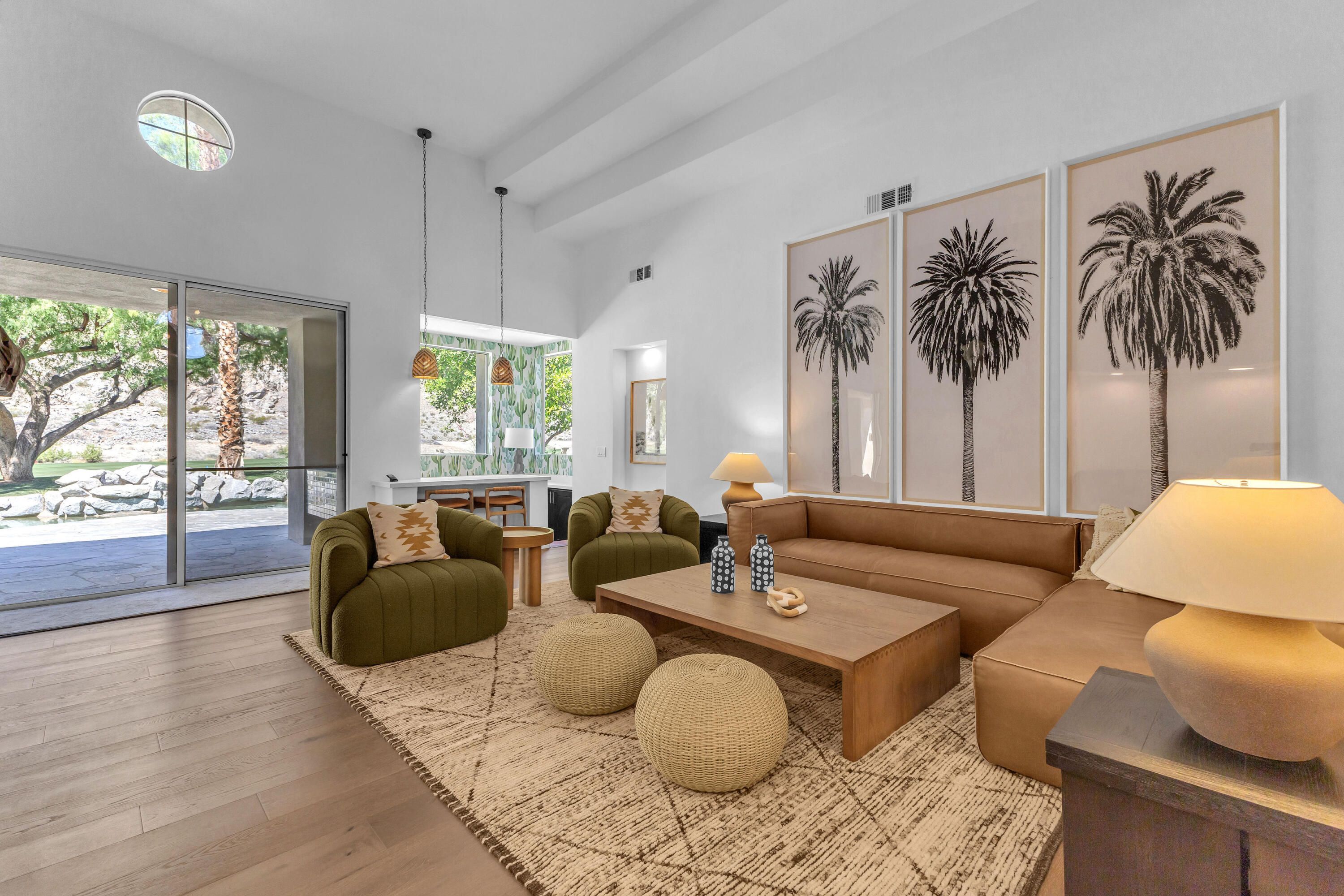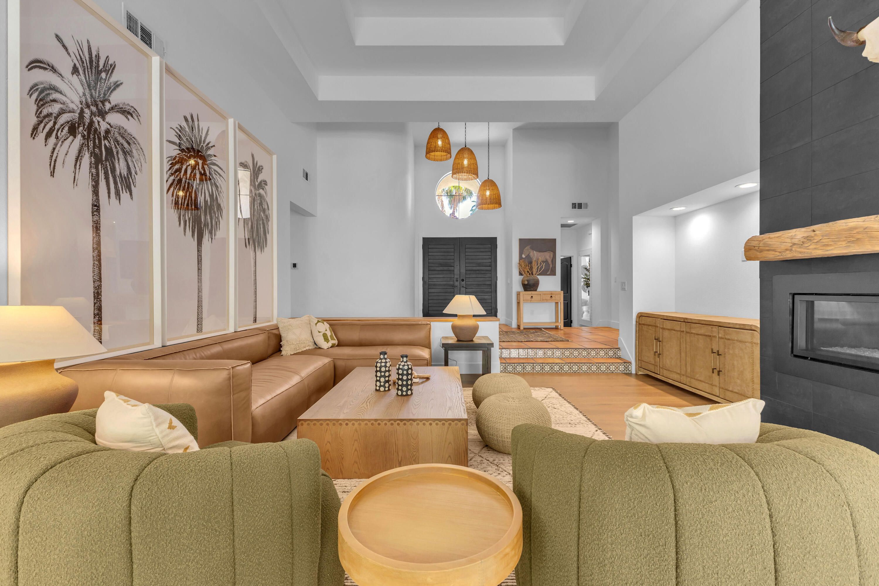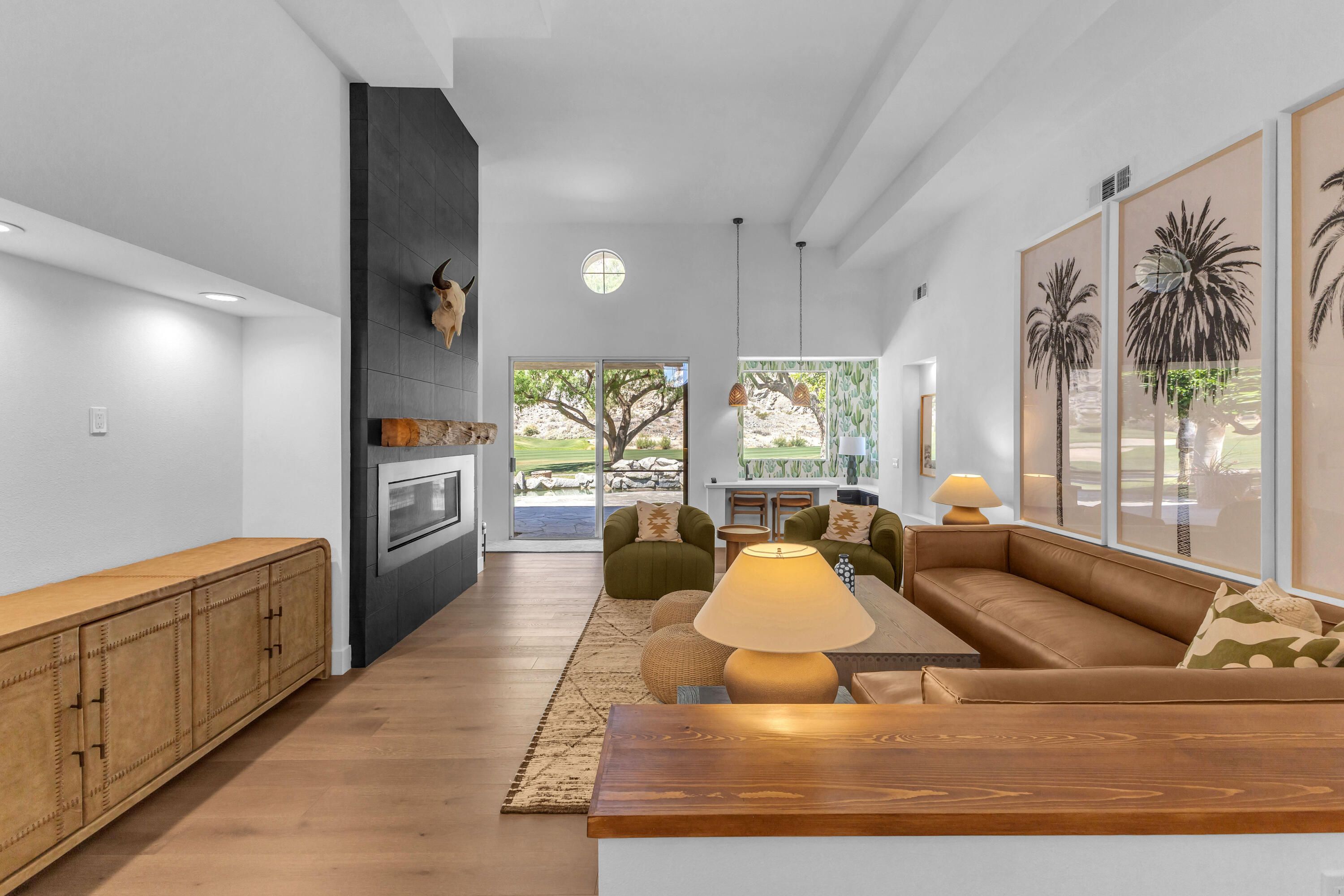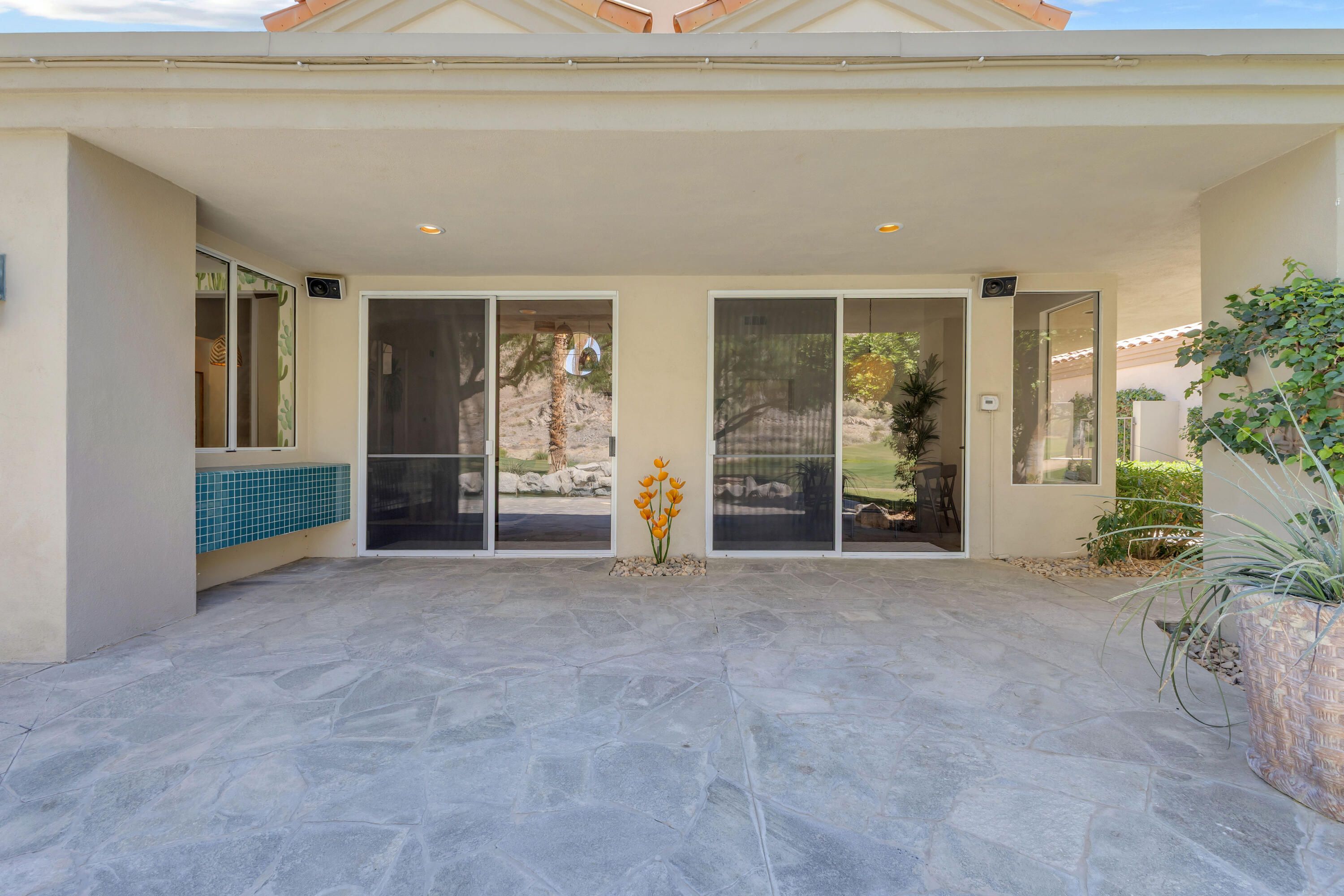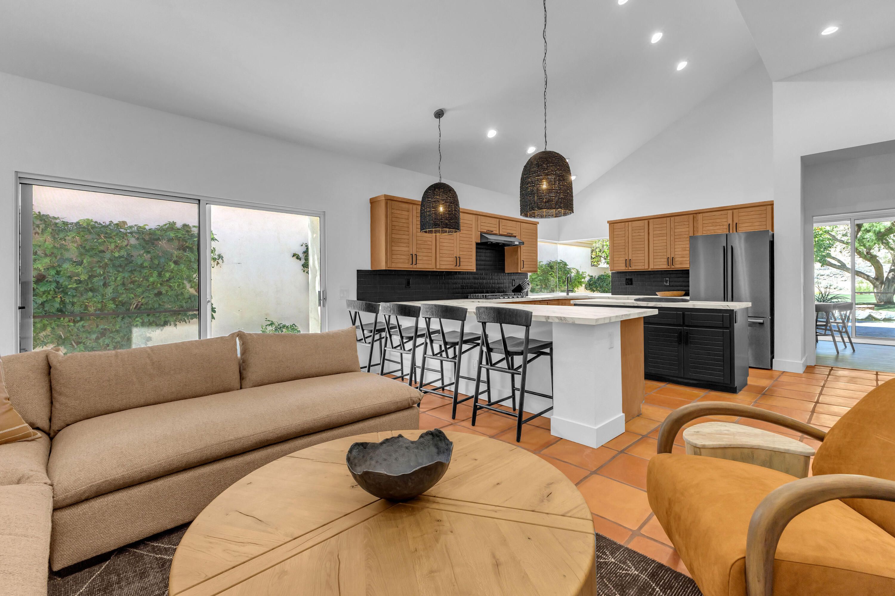 Experience elevated desert living in this exquisitely remodeled luxury residence, where no detail has been overlooked. This home offers 4 bedrooms and 4.5 bathrooms, thoughtfully redesigned with the finest high-end materials and impeccable craftsmanship throughout. New Saltillo flooring flows beautifully through the home, highlighted by custom accents at the step down into the sunken living room--adding warmth, character, and architectural charm. Every bathroom has been exquisitely reimagined with premium fixtures and elegant tile work. The primary suite delivers a spa-inspired retreat, featuring a stunning standalone soaking tub and a separate glass-enclosed shower designed for ultimate relaxation. Professionally curated with designer-selected art and furnishings--all included--this home offers a truly turnkey, move-in-ready experience. The detached casita, equally refined and fully furnished, provides a private and luxurious space for guests or extended stays. Modern upgrades include a new HVAC system for enhanced comfort, as well as a mini-split system in the garage. Both garages feature brand-new epoxy flooring, combining durability with a sleek, polished look. Step outside to your own resort-style oasis, where a sparkling pool overlooks the 15th fairway of the Palmer Private Course within the prestigious PGA West community. Enjoy unobstructed mountain views, lush golf course scenery, and breathtaking sunsets from your own backyard. This is more than a home, it's a seamless blend of luxury, design, and effortless indoor-outdoor living in one of the desert's most sought-after settings. PGA West offers 3 private and 3 public golf courses, tennis, pickleball, 3 clubhouses, restaurants,& 24-hour guard-gated security. HOA dues conveniently cover building structure, exterior paint, roof, ,full landscaping & irrigation, internet, cable, trash, and more making ownership effortless.