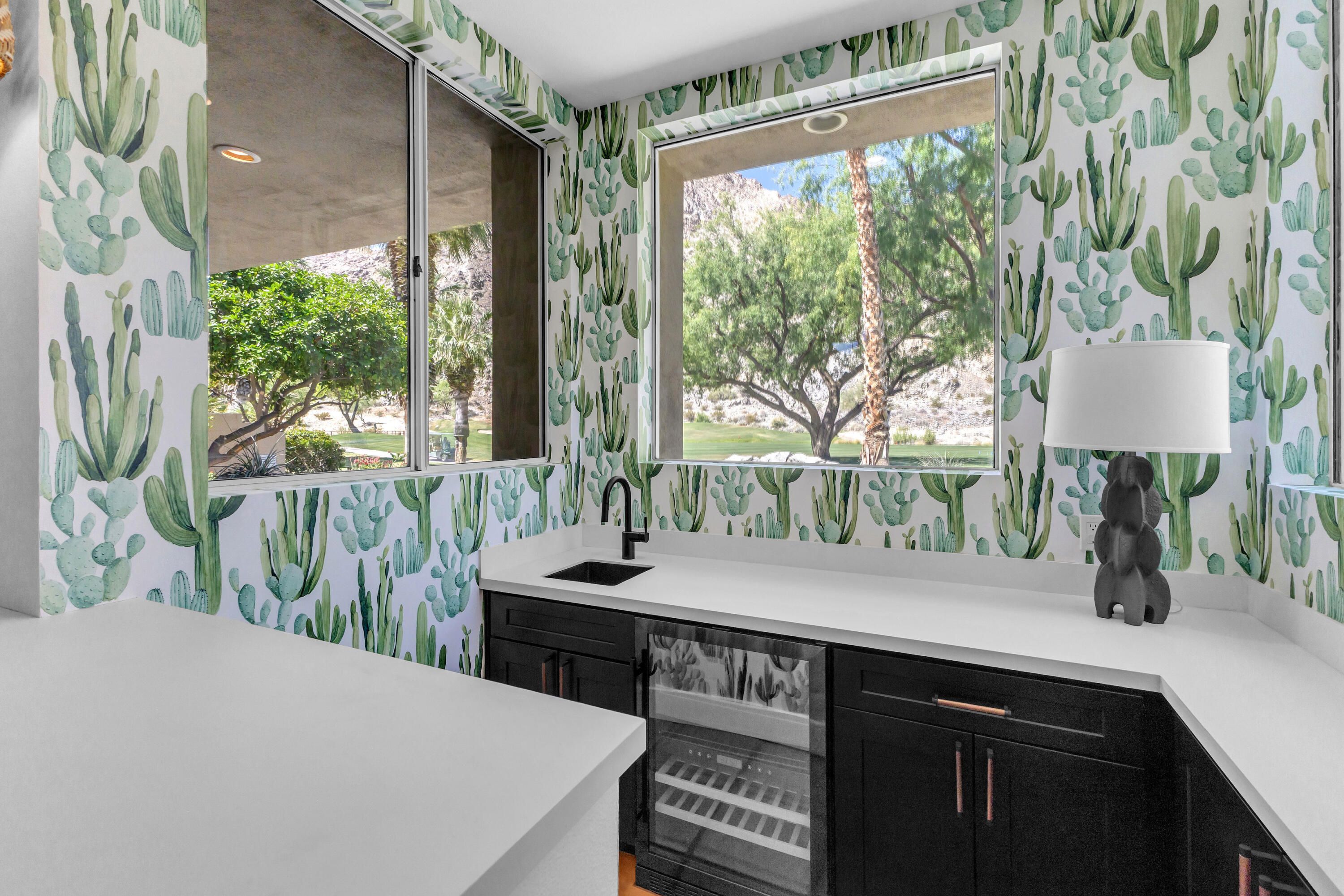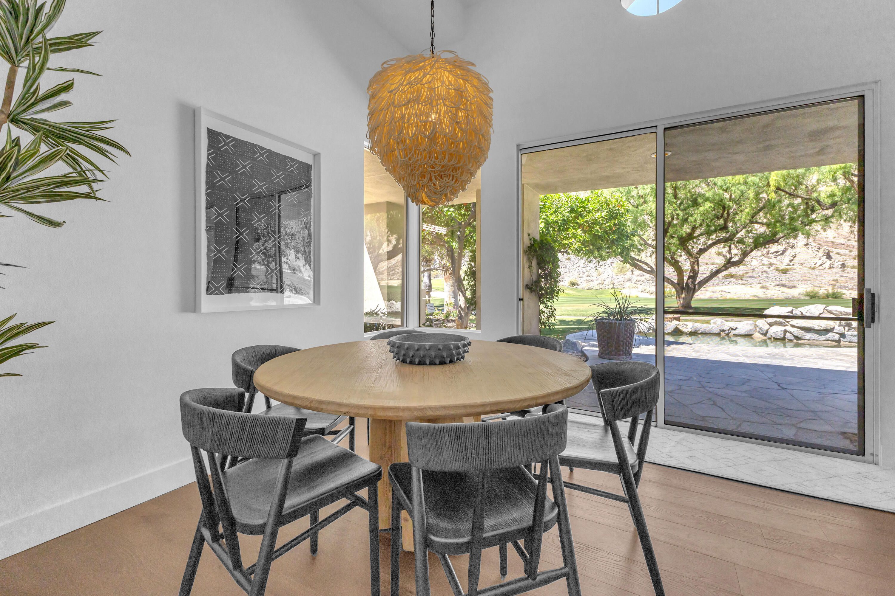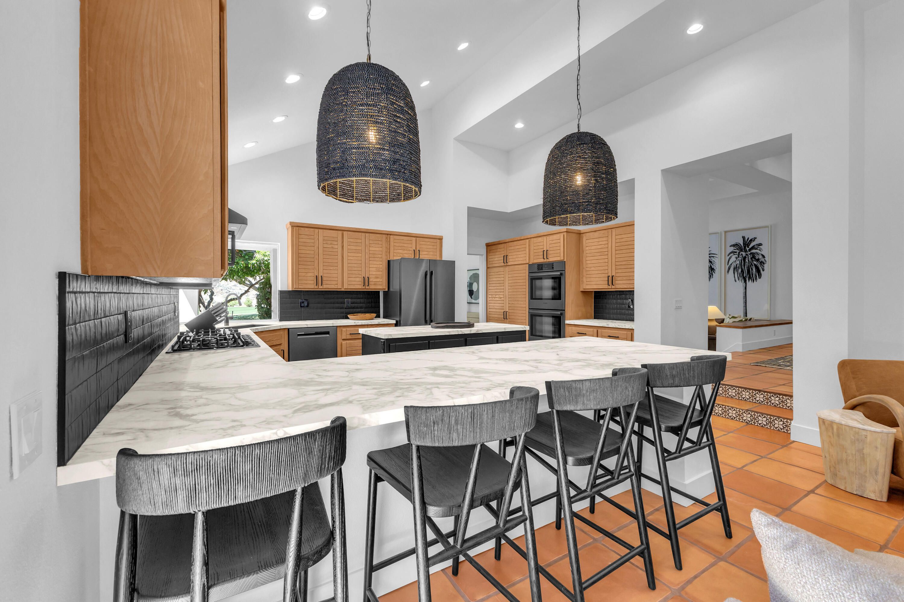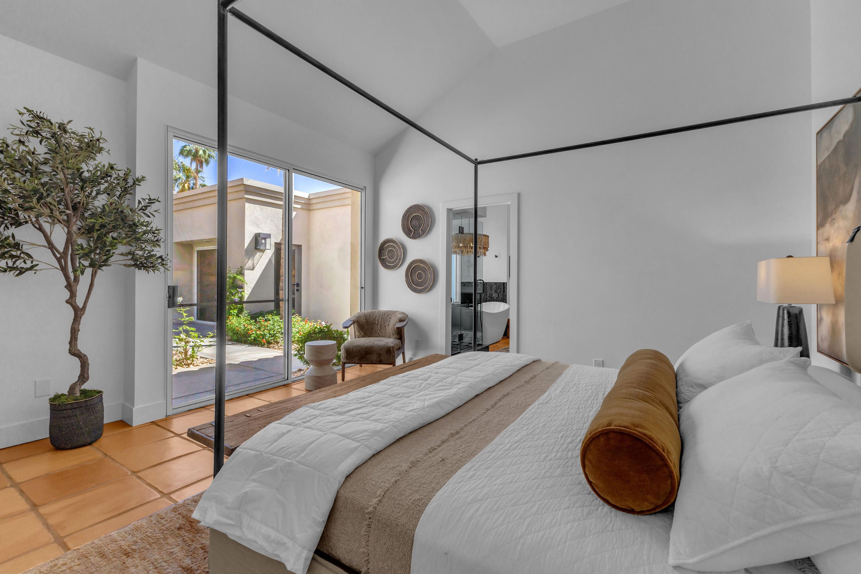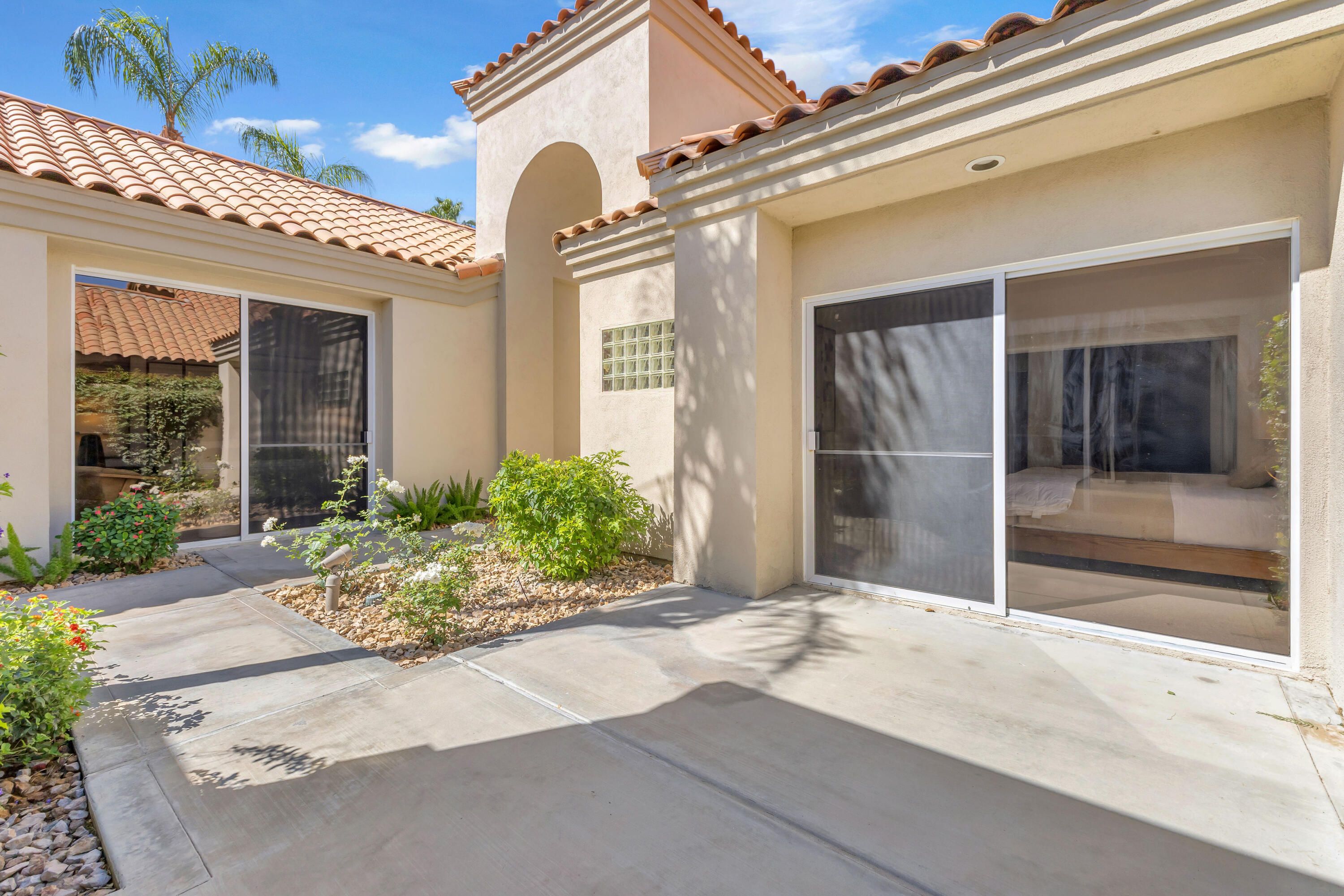 Experience elevated desert living in this exquisitely remodeled luxury residence, where no detail has been overlooked. This home offers 4 bedrooms and 4.5 bathrooms, thoughtfully redesigned with the finest high-end materials and impeccable craftsmanship throughout. New Saltillo flooring flows beautifully through the home, highlighted by custom accents at the step down into the sunken living room--adding warmth, character, and architectural charm. Every bathroom has been exquisitely reimagined with premium fixtures and elegant tile work. The primary suite delivers a spa-inspired retreat, featuring a stunning standalone soaking tub and a separate glass-enclosed shower designed for ultimate relaxation. Professionally curated with designer-selected art and furnishings--all included--this home offers a truly turnkey, move-in-ready experience. The detached casita, equally refined and fully furnished, provides a private and luxurious space for guests or extended stays. Modern upgrades include a new HVAC system for enhanced comfort, as well as a mini-split system in the garage. Both garages feature brand-new epoxy flooring, combining durability with a sleek, polished look. Step outside to your own resort-style oasis, where a sparkling pool overlooks the 15th fairway of the Palmer Private Course within the prestigious PGA West community. Enjoy unobstructed mountain views, lush golf course scenery, and breathtaking sunsets from your own backyard. This is more than a home, it's a seamless blend of luxury, design, and effortless indoor-outdoor living in one of the desert's most sought-after settings. PGA West offers 3 private and 3 public golf courses, tennis, pickleball, 3 clubhouses, restaurants,& 24-hour guard-gated security. HOA dues conveniently cover building structure, exterior paint, roof, ,full landscaping & irrigation, internet, cable, trash, and more making ownership effortless.