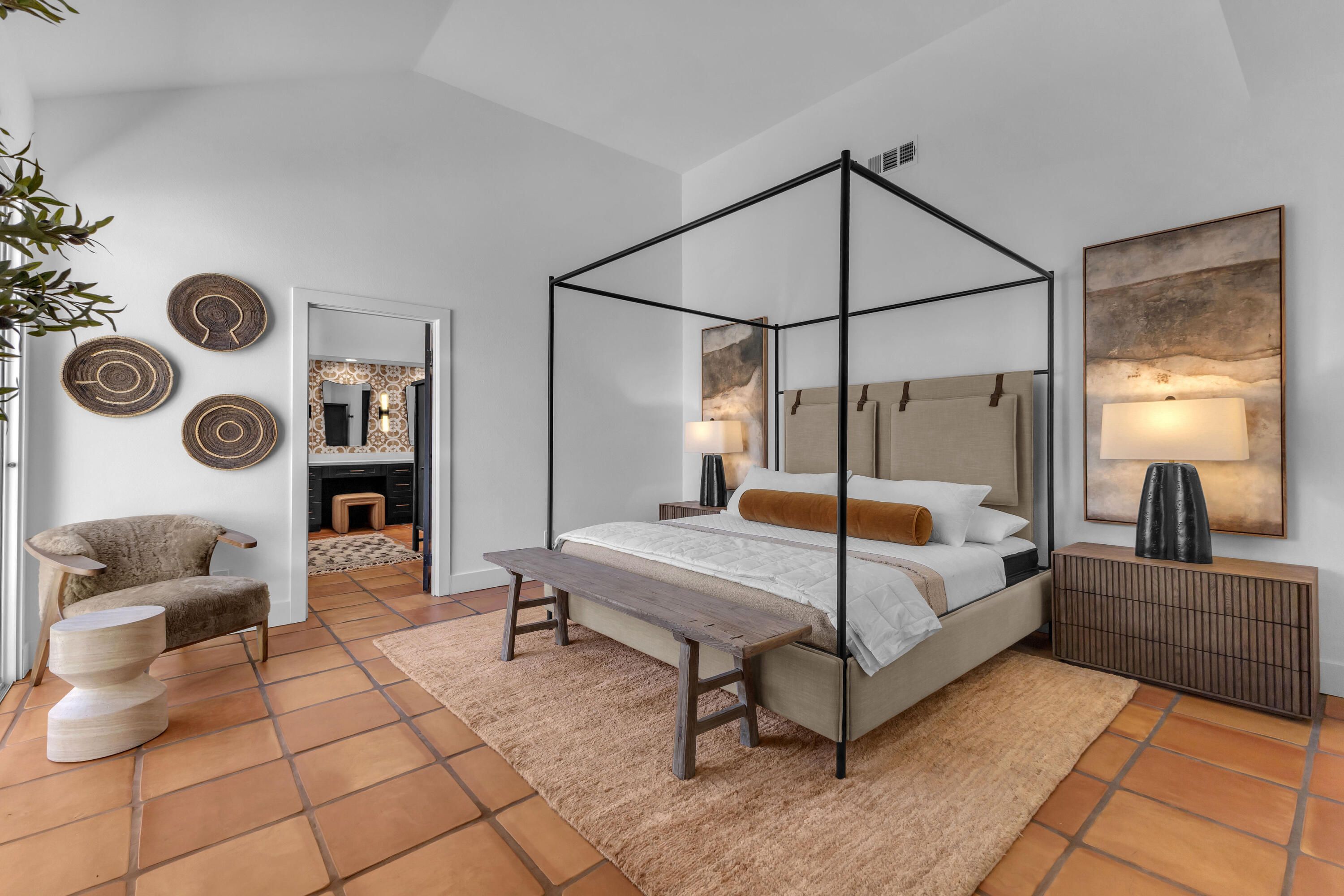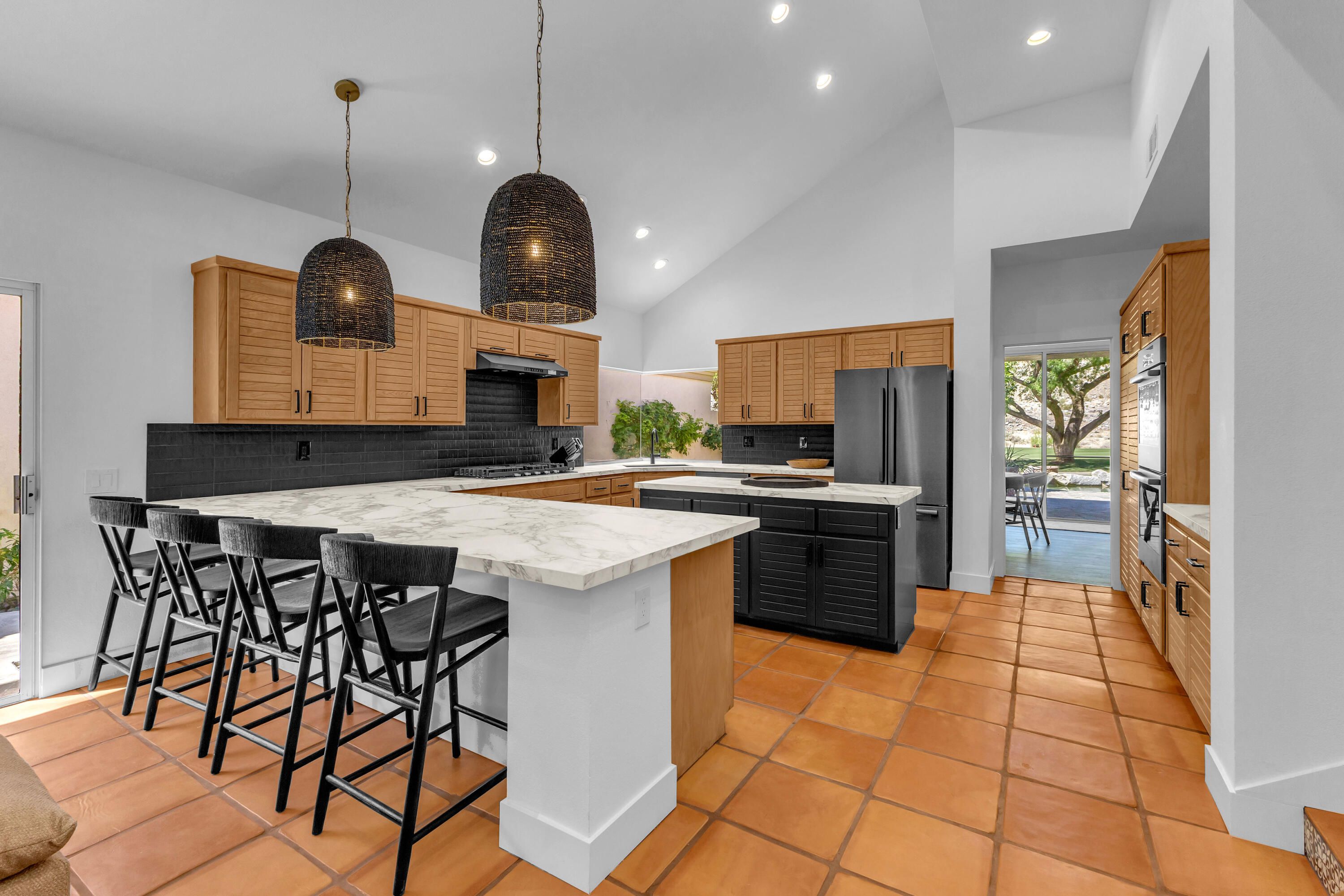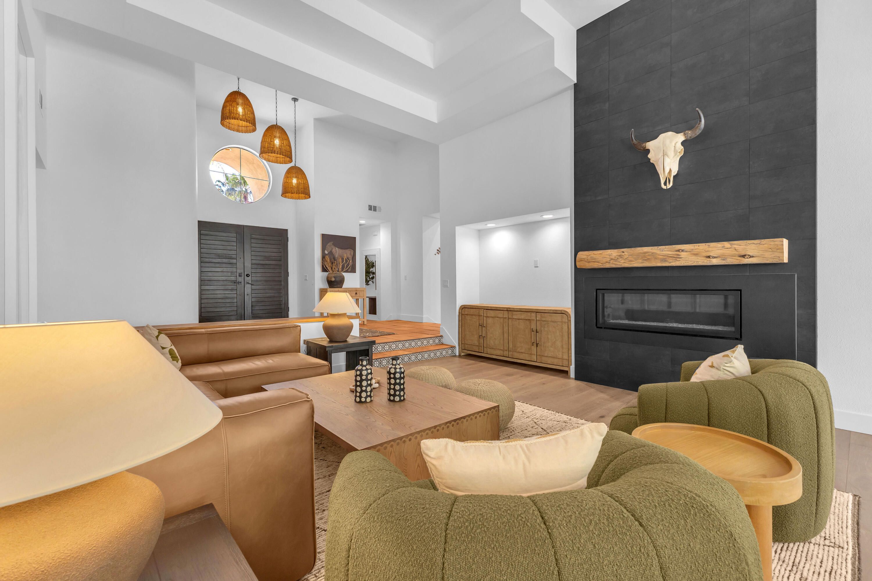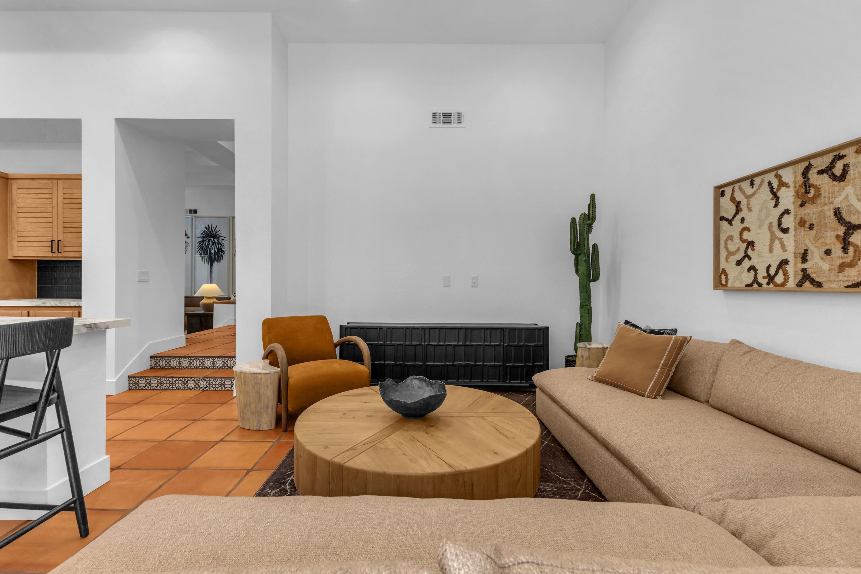Experience elevated desert living in this exquisitely remodeled luxury residence, where no detail has been overlooked. This home offers 4 bedrooms and 4.5 bathrooms, thoughtfully redesigned with the finest high-end materials and impeccable craftsmanship throughout. New Saltillo flooring flows beautifully through the home, highlighted by custom accents at the step down into the sunken living room--adding warmth, character, and architectural charm. Every bathroom has been exquisitely reimagined with premium fixtures and elegant tile work. The primary suite delivers a spa-inspired retreat, featuring a stunning standalone soaking tub and a separate glass-enclosed shower designed for ultimate relaxation. Professionally curated with designer-selected art and furnishings--all included--this home offers a truly turnkey, move-in-ready experience. The detached casita, equally refined and fully furnished, provides a private and luxurious space for guests or extended stays. Modern upgrades include a new HVAC system for enhanced comfort, as well as a mini-split system in the garage. Both garages feature brand-new epoxy flooring, combining durability with a sleek, polished look. Step outside to your own resort-style oasis, where a sparkling pool overlooks the 15th fairway of the Palmer Private Course within the prestigious PGA West community. Enjoy unobstructed mountain views, lush golf course scenery, and breathtaking sunsets from your own backyard. This is more than a home, it's a seamless blend of luxury, design, and effortless indoor-outdoor living in one of the desert's most sought-after settings. PGA West offers 3 private and 3 public golf courses, tennis, pickleball, 3 clubhouses, restaurants,& 24-hour guard-gated security. HOA dues conveniently cover building structure, exterior paint, roof, ,full landscaping & irrigation, internet, cable, trash, and more making ownership effortless.