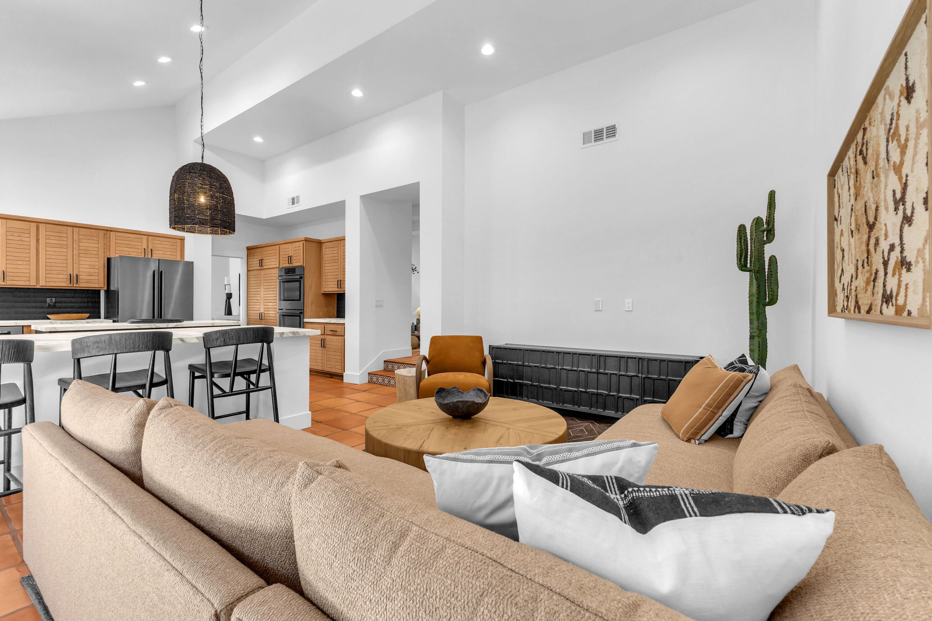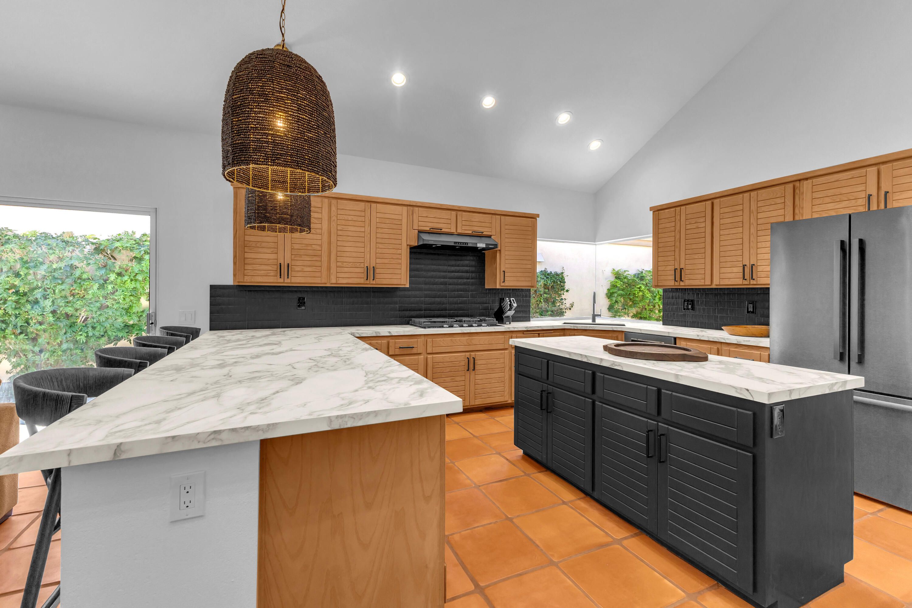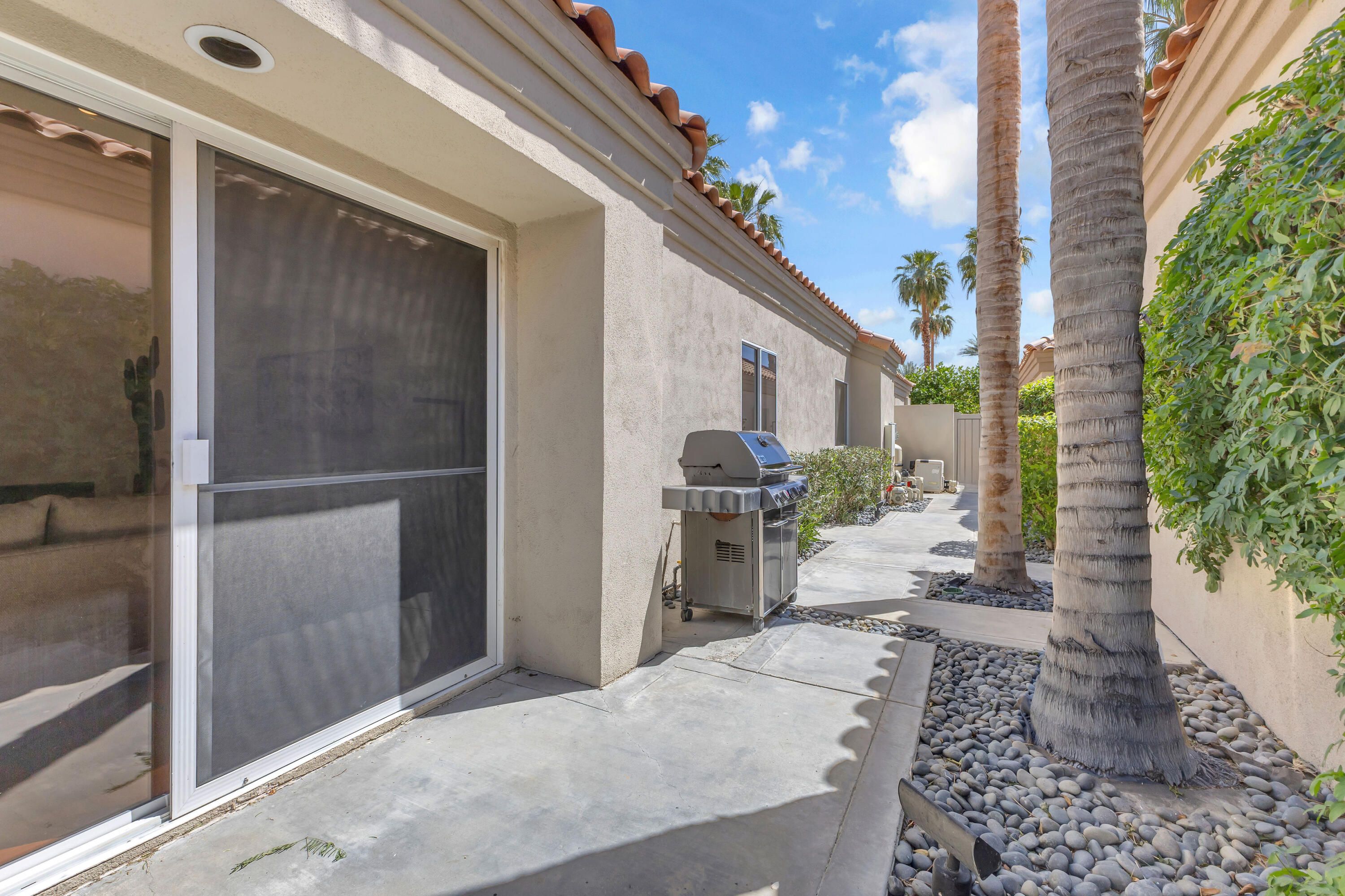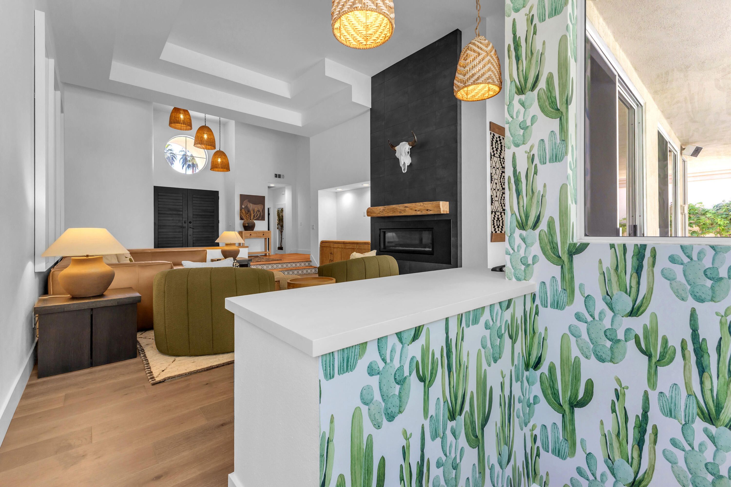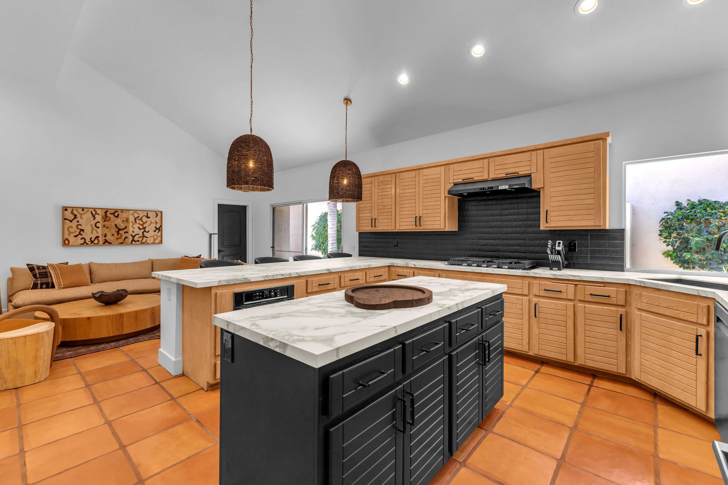 Experience elevated desert living in this exquisitely remodeled luxury residence, where no detail has been overlooked. This home offers 4 bedrooms and 4.5 bathrooms, thoughtfully redesigned with the finest high-end materials and impeccable craftsmanship throughout. New Saltillo flooring flows beautifully through the home, highlighted by custom accents at the step down into the sunken living room--adding warmth, character, and architectural charm. Every bathroom has been exquisitely reimagined with premium fixtures and elegant tile work. The primary suite delivers a spa-inspired retreat, featuring a stunning standalone soaking tub and a separate glass-enclosed shower designed for ultimate relaxation. Professionally curated with designer-selected art and furnishings--all included--this home offers a truly turnkey, move-in-ready experience. The detached casita, equally refined and fully furnished, provides a private and luxurious space for guests or extended stays. Modern upgrades include a new HVAC system for enhanced comfort, as well as a mini-split system in the garage. Both garages feature brand-new epoxy flooring, combining durability with a sleek, polished look. Step outside to your own resort-style oasis, where a sparkling pool overlooks the 15th fairway of the Palmer Private Course within the prestigious PGA West community. Enjoy unobstructed mountain views, lush golf course scenery, and breathtaking sunsets from your own backyard. This is more than a home, it's a seamless blend of luxury, design, and effortless indoor-outdoor living in one of the desert's most sought-after settings. PGA West offers 3 private and 3 public golf courses, tennis, pickleball, 3 clubhouses, restaurants,& 24-hour guard-gated security. HOA dues conveniently cover building structure, exterior paint, roof, ,full landscaping & irrigation, internet, cable, trash, and more making ownership effortless.