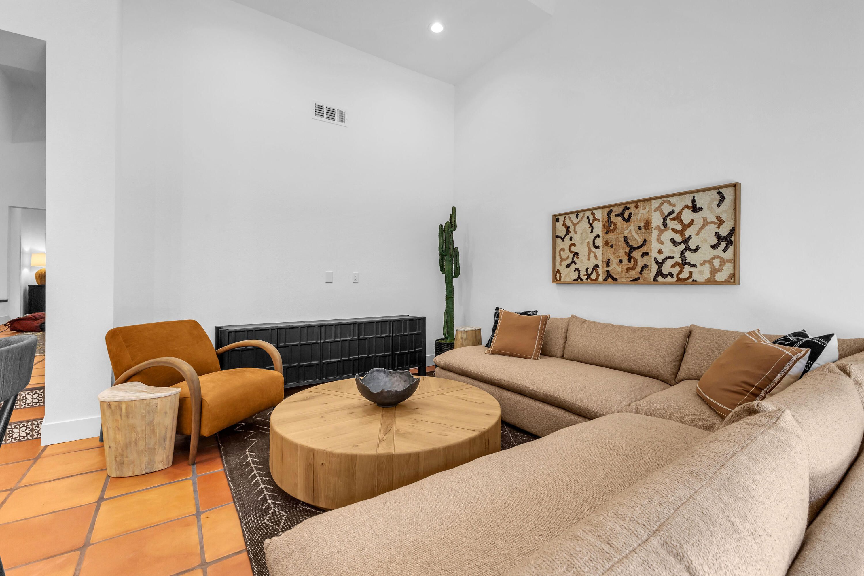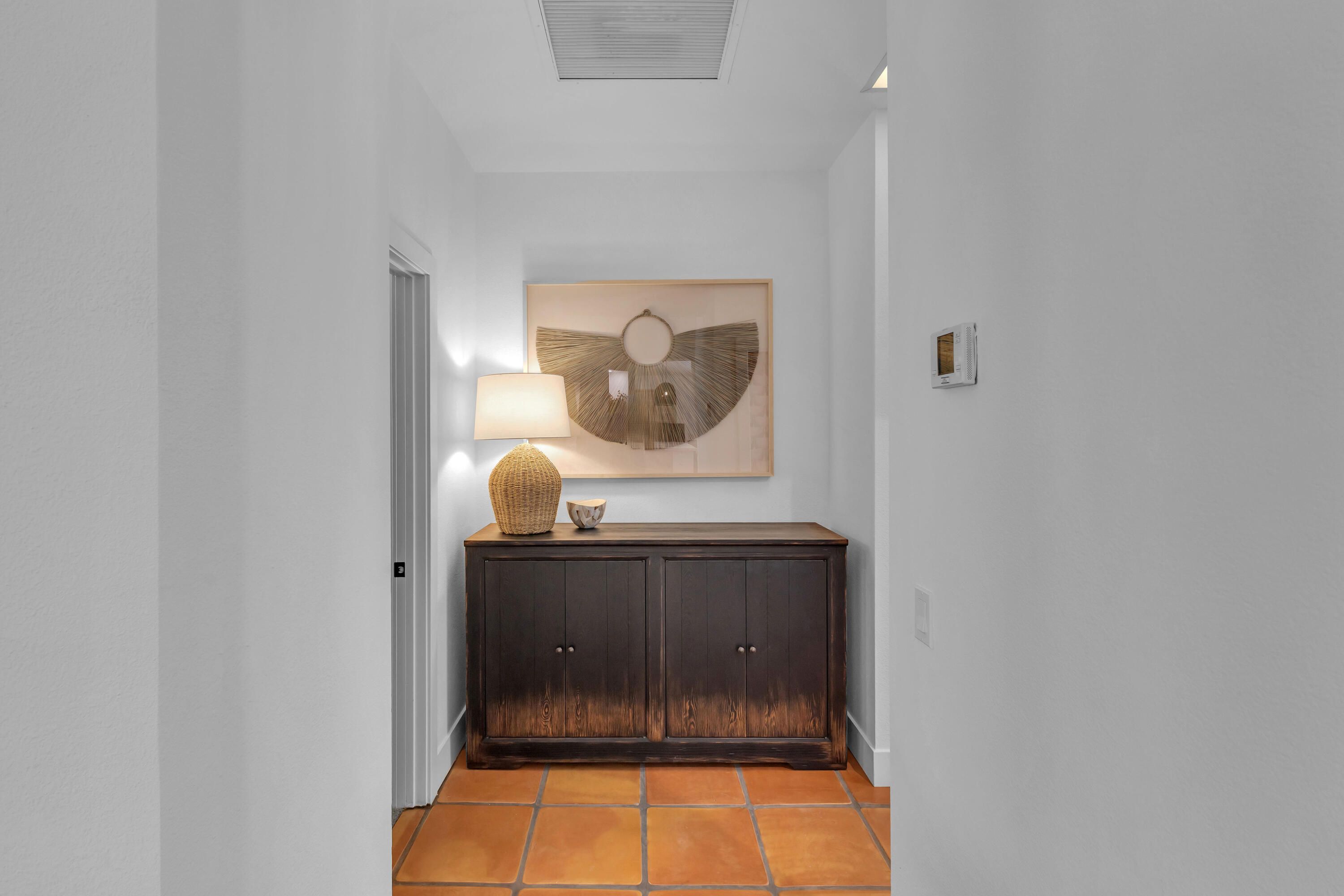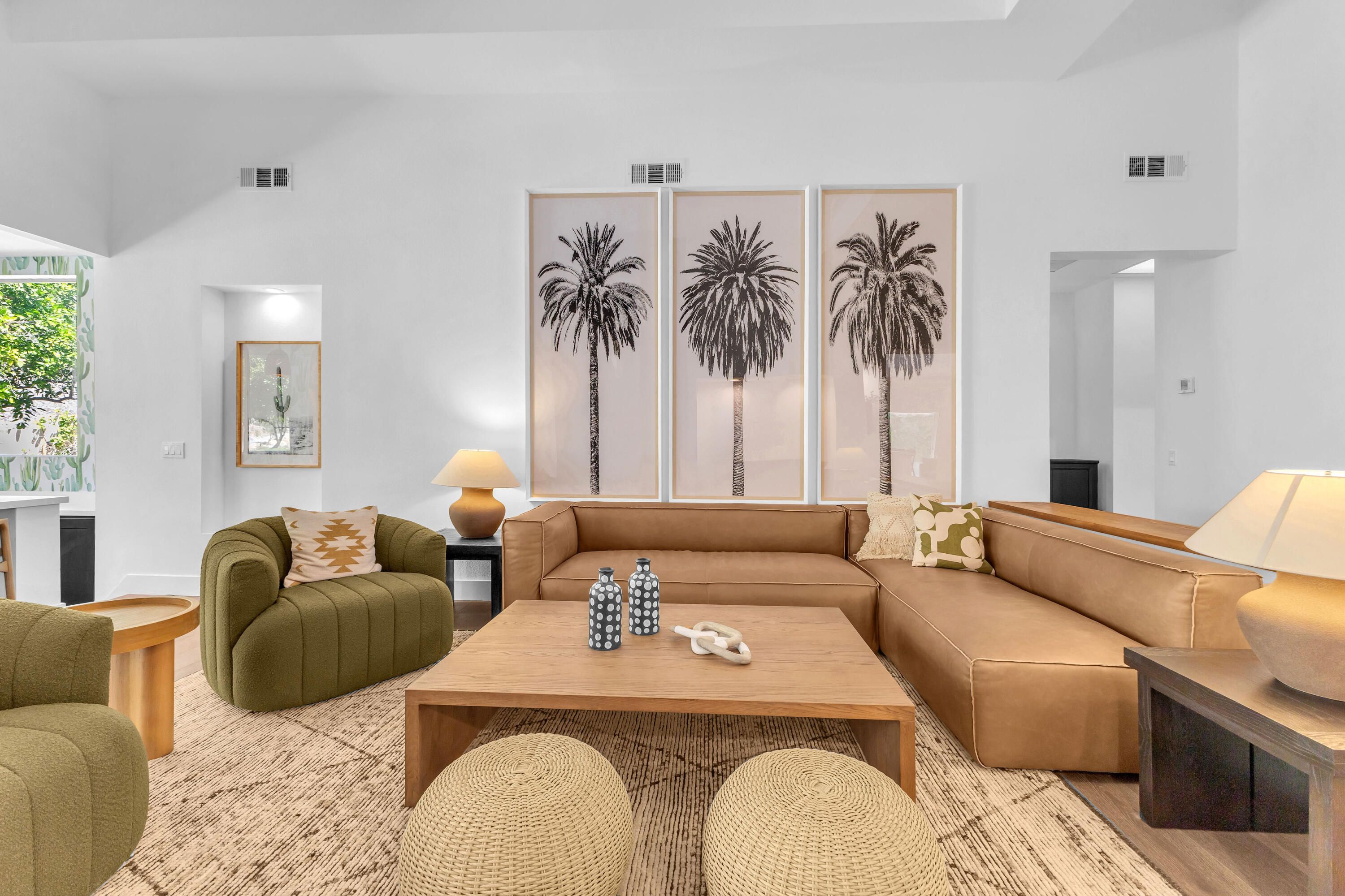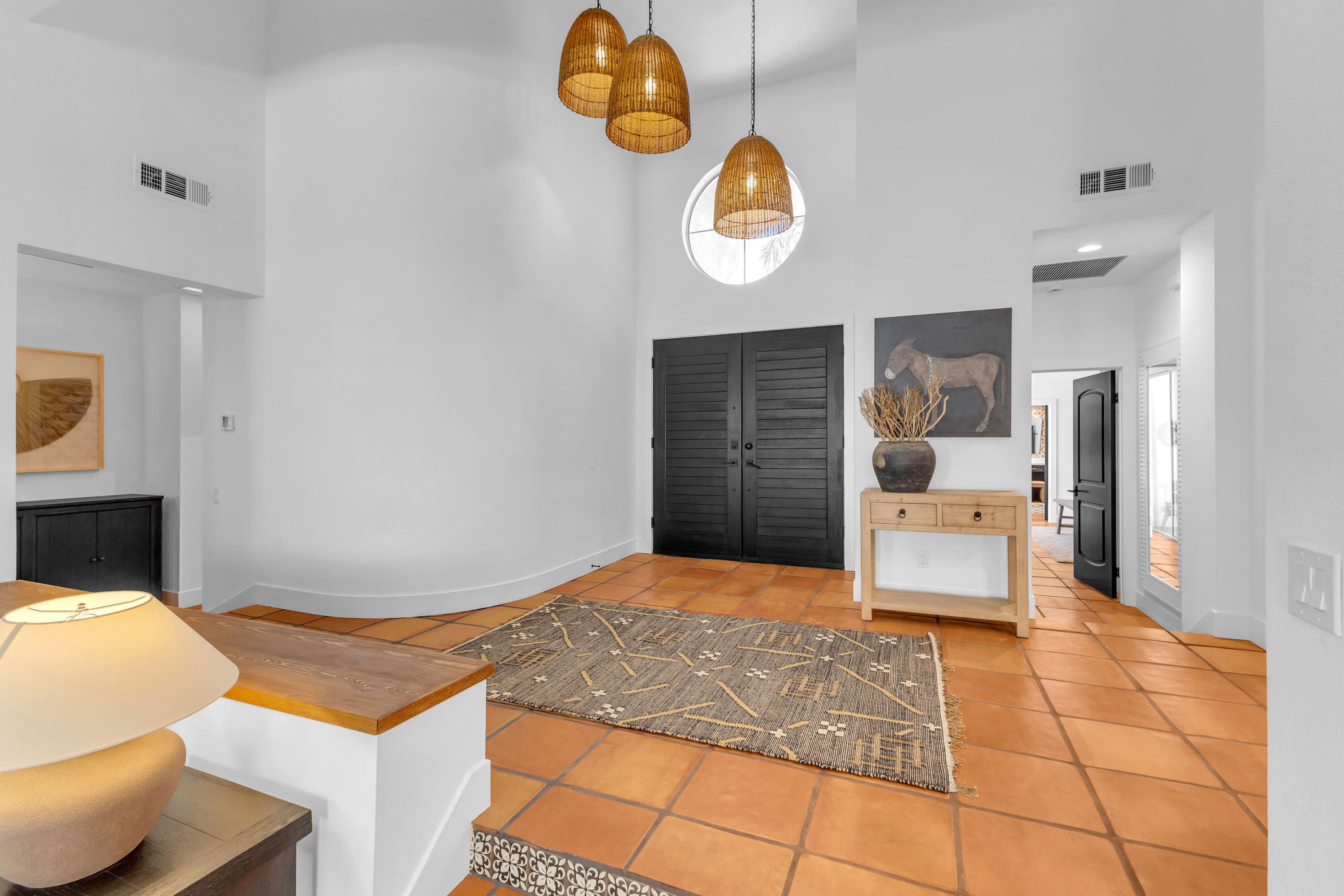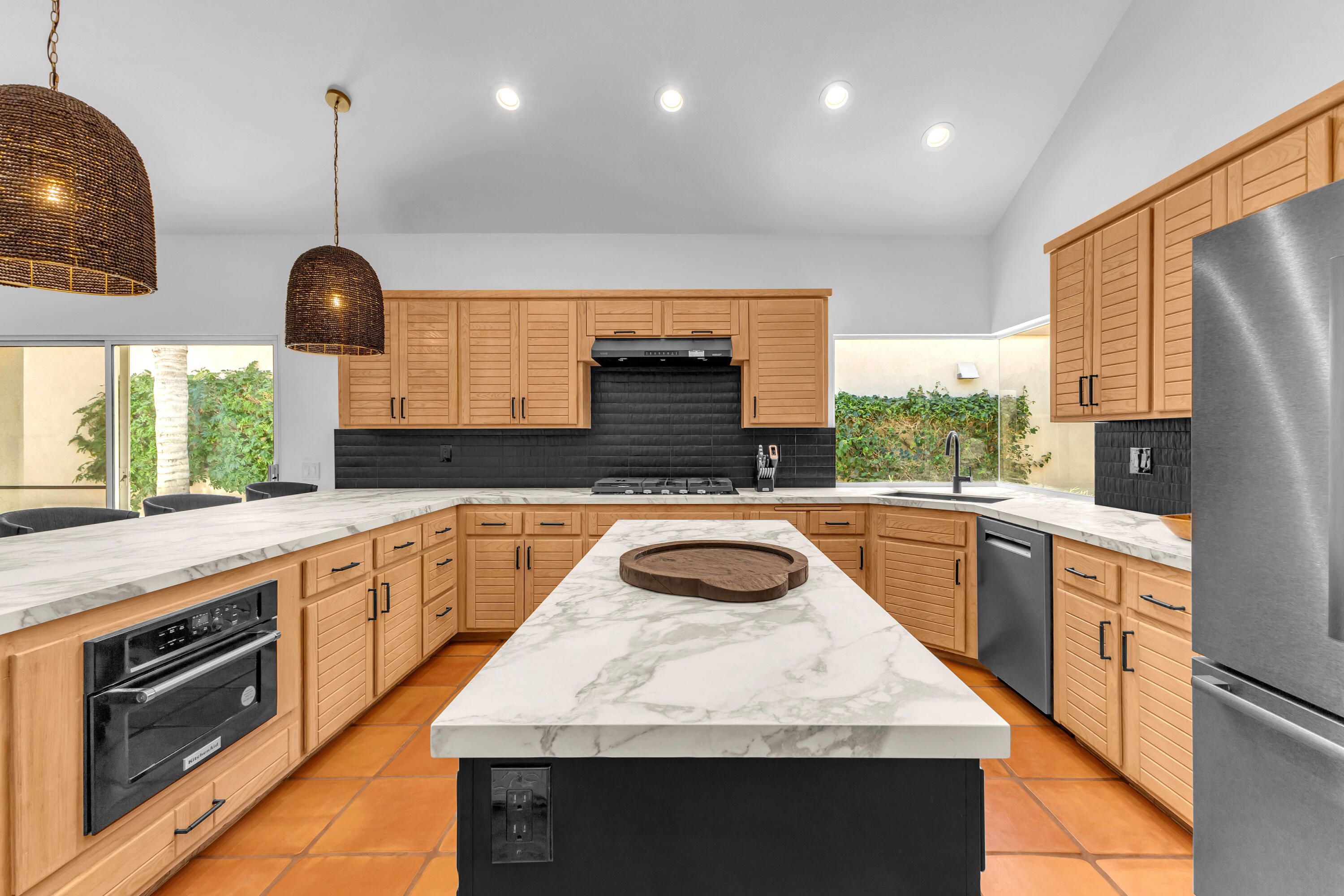 Experience elevated desert living in this exquisitely remodeled luxury residence, where no detail has been overlooked. This home offers 4 bedrooms and 4.5 bathrooms, thoughtfully redesigned with the finest high-end materials and impeccable craftsmanship throughout. New Saltillo flooring flows beautifully through the home, highlighted by custom accents at the step down into the sunken living room--adding warmth, character, and architectural charm. Every bathroom has been exquisitely reimagined with premium fixtures and elegant tile work. The primary suite delivers a spa-inspired retreat, featuring a stunning standalone soaking tub and a separate glass-enclosed shower designed for ultimate relaxation. Professionally curated with designer-selected art and furnishings--all included--this home offers a truly turnkey, move-in-ready experience. The detached casita, equally refined and fully furnished, provides a private and luxurious space for guests or extended stays. Modern upgrades include a new HVAC system for enhanced comfort, as well as a mini-split system in the garage. Both garages feature brand-new epoxy flooring, combining durability with a sleek, polished look. Step outside to your own resort-style oasis, where a sparkling pool overlooks the 15th fairway of the Palmer Private Course within the prestigious PGA West community. Enjoy unobstructed mountain views, lush golf course scenery, and breathtaking sunsets from your own backyard. This is more than a home, it's a seamless blend of luxury, design, and effortless indoor-outdoor living in one of the desert's most sought-after settings. PGA West offers 3 private and 3 public golf courses, tennis, pickleball, 3 clubhouses, restaurants,& 24-hour guard-gated security. HOA dues conveniently cover building structure, exterior paint, roof, ,full landscaping & irrigation, internet, cable, trash, and more making ownership effortless.