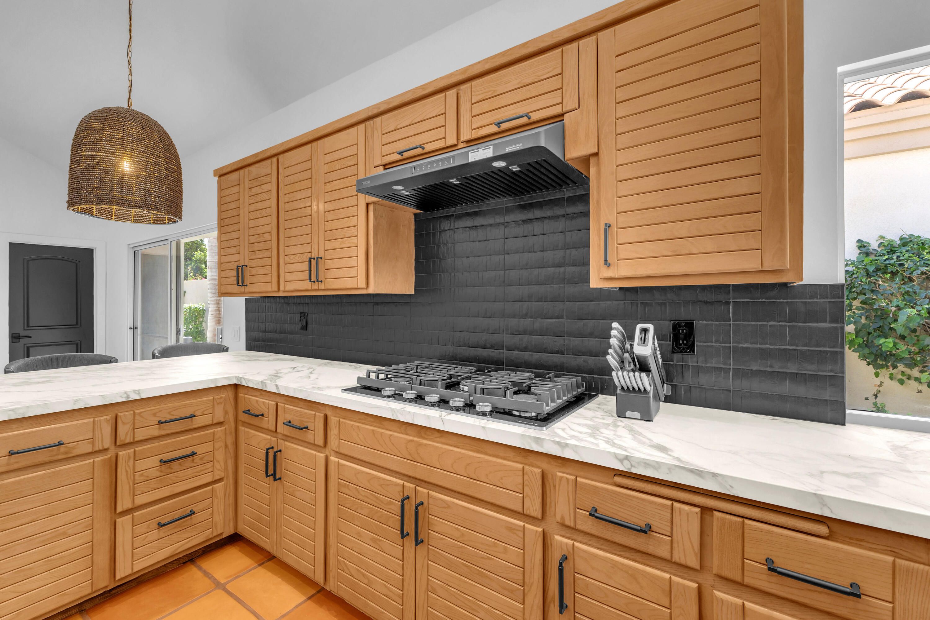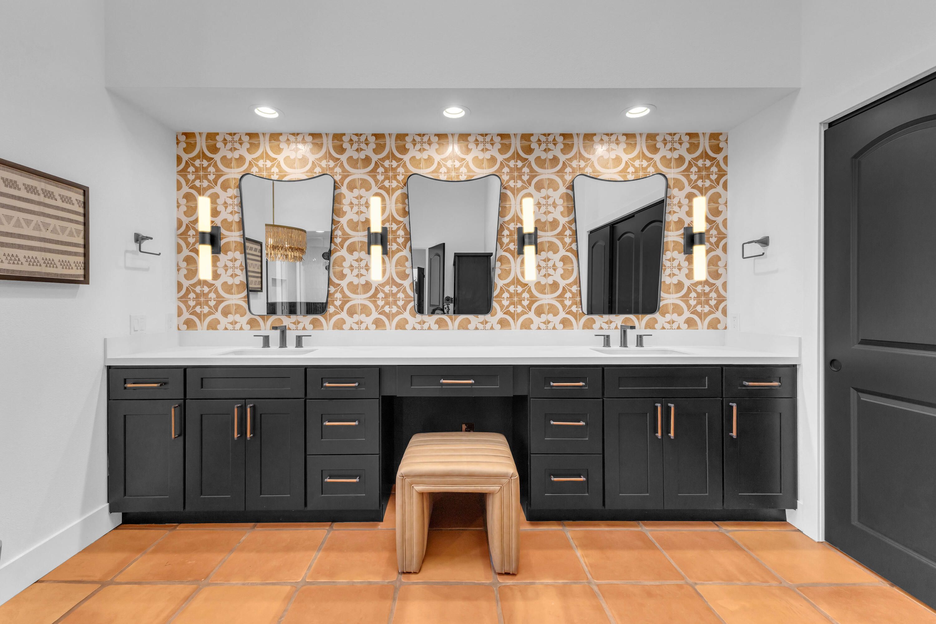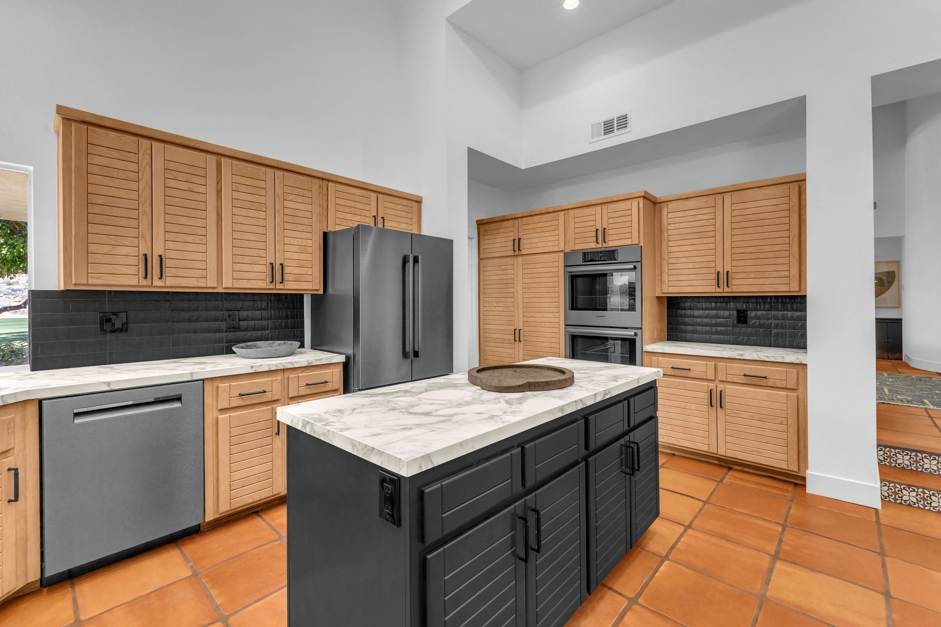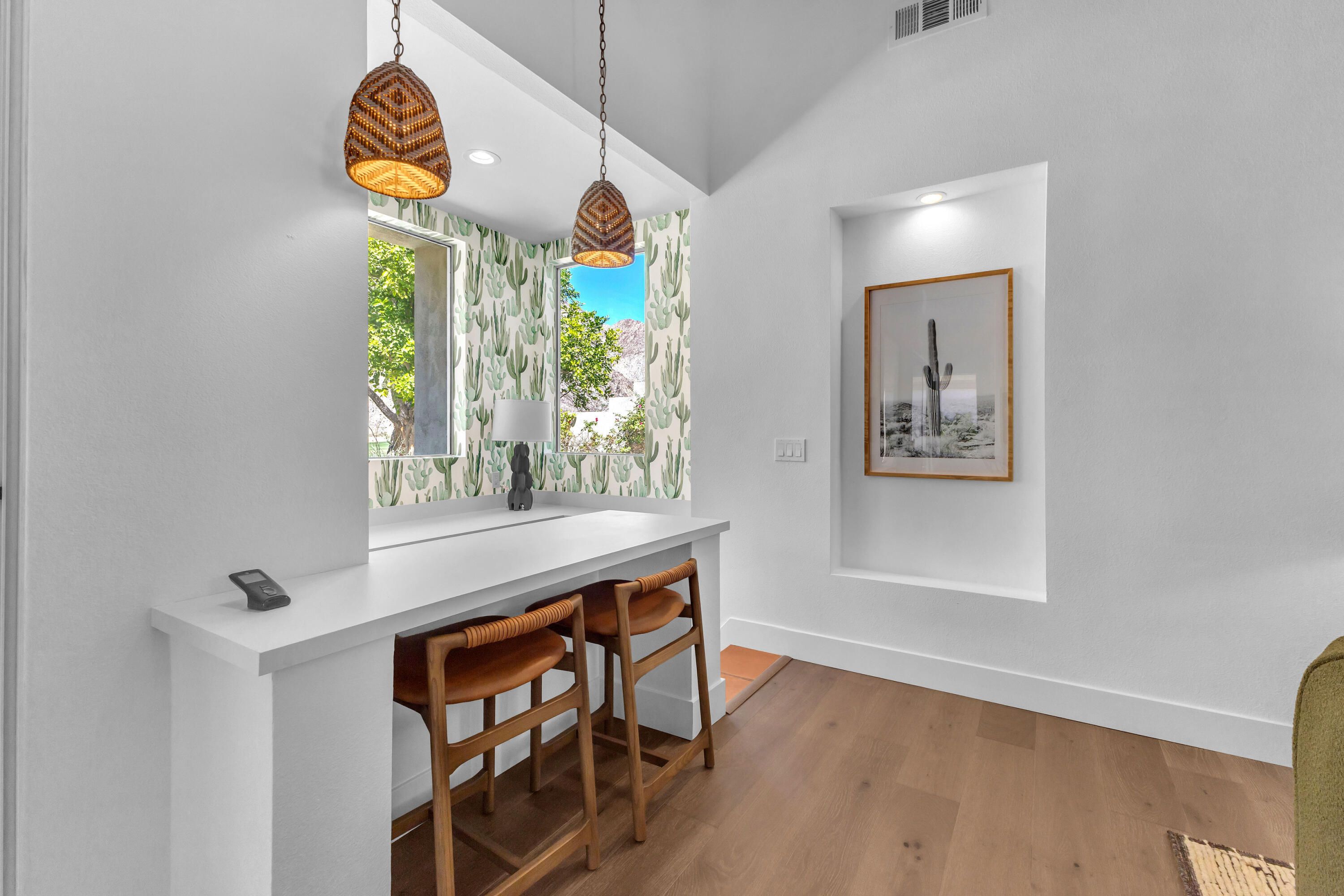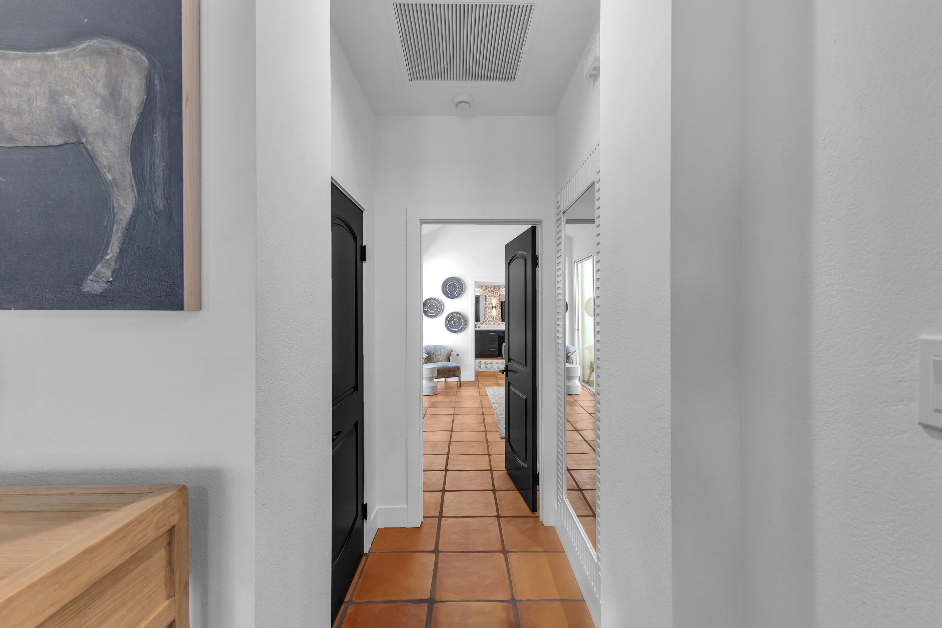 Experience elevated desert living in this exquisitely remodeled luxury residence, where no detail has been overlooked. This home offers 4 bedrooms and 4.5 bathrooms, thoughtfully redesigned with the finest high-end materials and impeccable craftsmanship throughout. New Saltillo flooring flows beautifully through the home, highlighted by custom accents at the step down into the sunken living room--adding warmth, character, and architectural charm. Every bathroom has been exquisitely reimagined with premium fixtures and elegant tile work. The primary suite delivers a spa-inspired retreat, featuring a stunning standalone soaking tub and a separate glass-enclosed shower designed for ultimate relaxation. Professionally curated with designer-selected art and furnishings--all included--this home offers a truly turnkey, move-in-ready experience. The detached casita, equally refined and fully furnished, provides a private and luxurious space for guests or extended stays. Modern upgrades include a new HVAC system for enhanced comfort, as well as a mini-split system in the garage. Both garages feature brand-new epoxy flooring, combining durability with a sleek, polished look. Step outside to your own resort-style oasis, where a sparkling pool overlooks the 15th fairway of the Palmer Private Course within the prestigious PGA West community. Enjoy unobstructed mountain views, lush golf course scenery, and breathtaking sunsets from your own backyard. This is more than a home, it's a seamless blend of luxury, design, and effortless indoor-outdoor living in one of the desert's most sought-after settings. PGA West offers 3 private and 3 public golf courses, tennis, pickleball, 3 clubhouses, restaurants,& 24-hour guard-gated security. HOA dues conveniently cover building structure, exterior paint, roof, ,full landscaping & irrigation, internet, cable, trash, and more making ownership effortless.