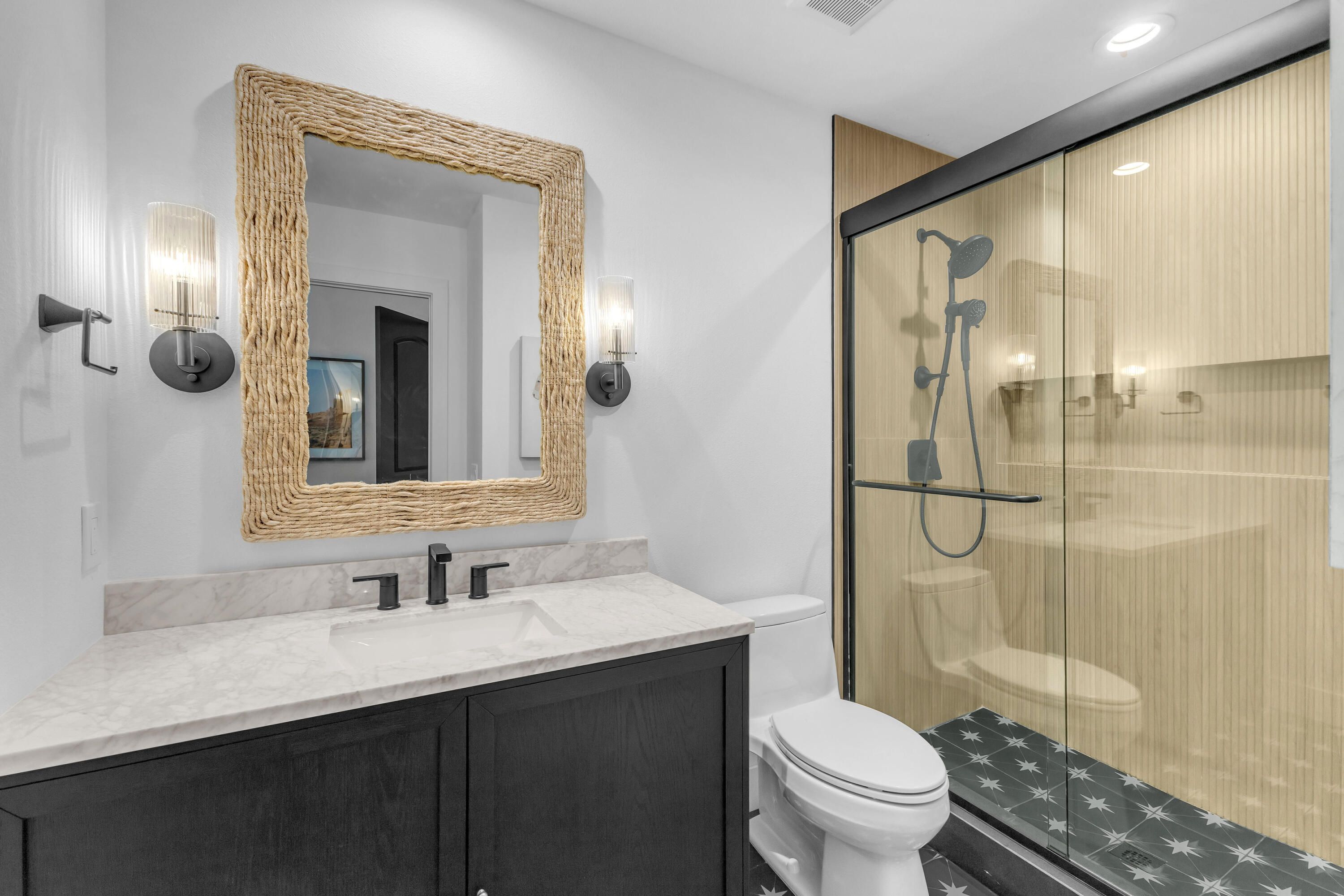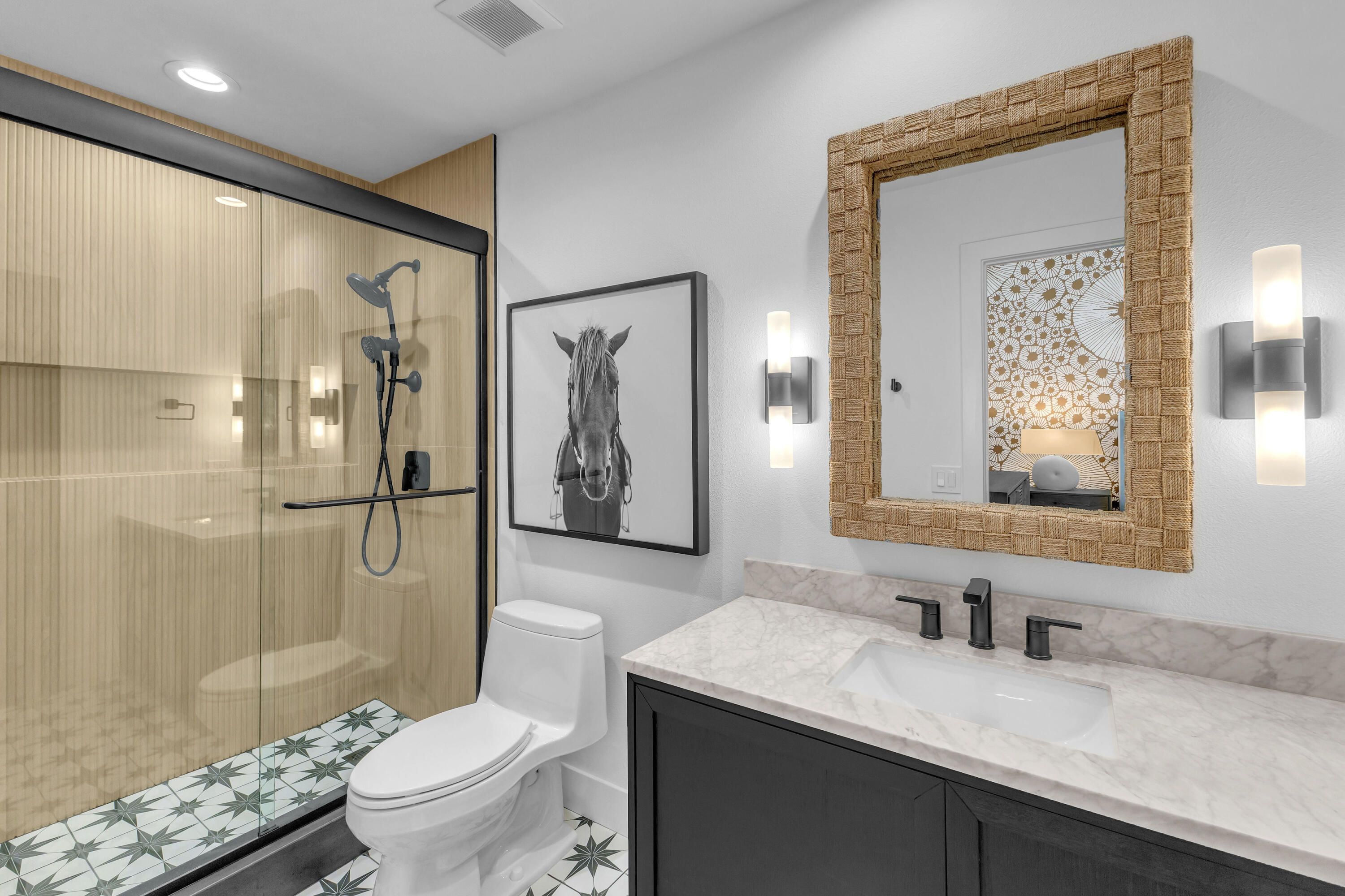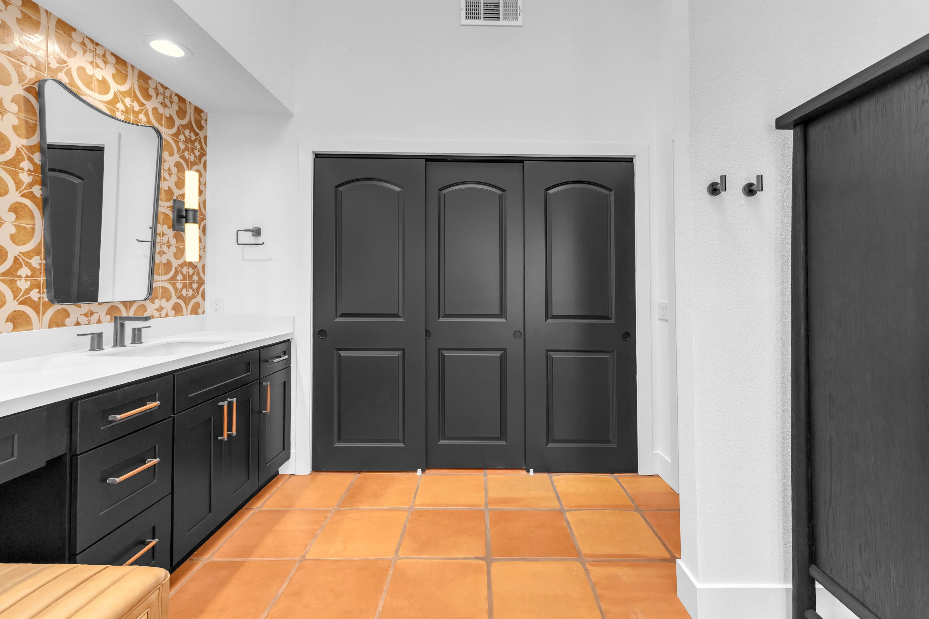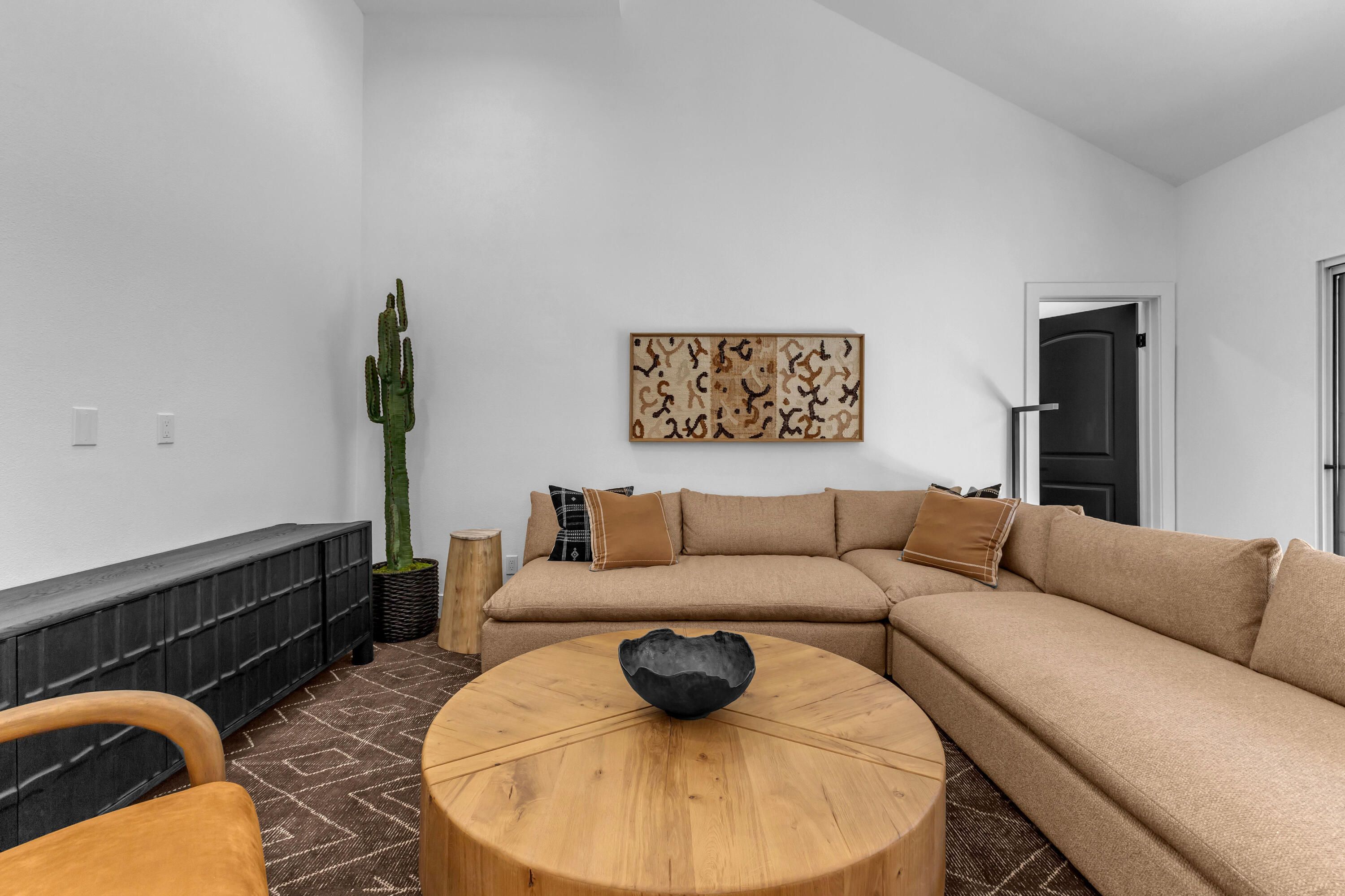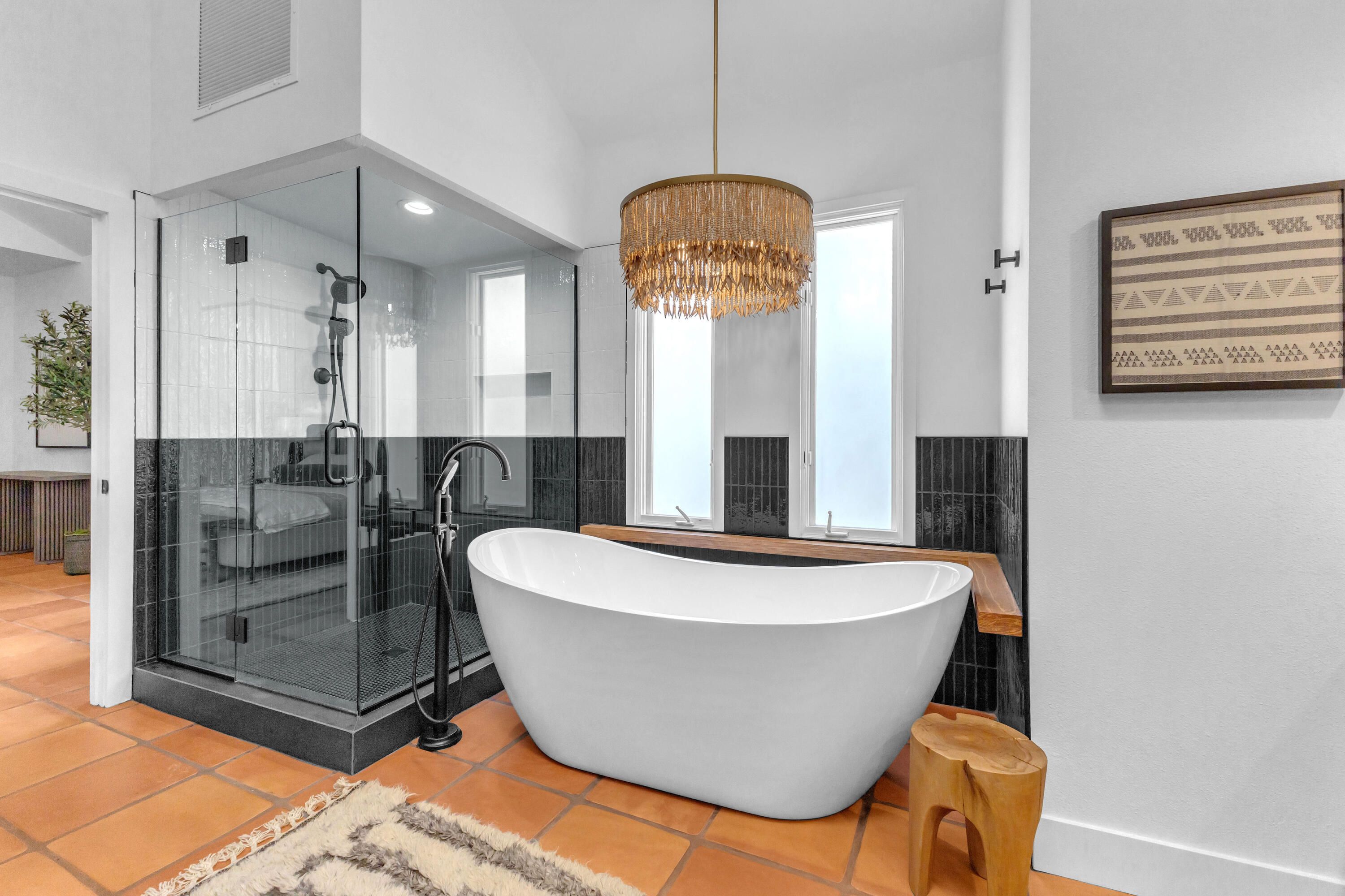 Experience elevated desert living in this exquisitely remodeled luxury residence, where no detail has been overlooked. This home offers 4 bedrooms and 4.5 bathrooms, thoughtfully redesigned with the finest high-end materials and impeccable craftsmanship throughout. New Saltillo flooring flows beautifully through the home, highlighted by custom accents at the step down into the sunken living room--adding warmth, character, and architectural charm. Every bathroom has been exquisitely reimagined with premium fixtures and elegant tile work. The primary suite delivers a spa-inspired retreat, featuring a stunning standalone soaking tub and a separate glass-enclosed shower designed for ultimate relaxation. Professionally curated with designer-selected art and furnishings--all included--this home offers a truly turnkey, move-in-ready experience. The detached casita, equally refined and fully furnished, provides a private and luxurious space for guests or extended stays. Modern upgrades include a new HVAC system for enhanced comfort, as well as a mini-split system in the garage. Both garages feature brand-new epoxy flooring, combining durability with a sleek, polished look. Step outside to your own resort-style oasis, where a sparkling pool overlooks the 15th fairway of the Palmer Private Course within the prestigious PGA West community. Enjoy unobstructed mountain views, lush golf course scenery, and breathtaking sunsets from your own backyard. This is more than a home, it's a seamless blend of luxury, design, and effortless indoor-outdoor living in one of the desert's most sought-after settings. PGA West offers 3 private and 3 public golf courses, tennis, pickleball, 3 clubhouses, restaurants,& 24-hour guard-gated security. HOA dues conveniently cover building structure, exterior paint, roof, ,full landscaping & irrigation, internet, cable, trash, and more making ownership effortless.