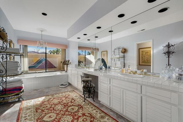 Enjoy the breathtaking double fairway and Santa Rosa views from this coveted Legends 40. Located just a sand wedge away from the 8th green of the World Class Stadium Course at PGA West, you will feel like you are living in a painting. This well maintained home is available just in time for the American Express PGA Tournament, and offers an open floor plan and soaring ceilings. Numerous upgrades include stainless steel appliances and granite counters in the kitchen; 3 large ensuite bedrooms with marble floors in the bathrooms and custom California Closets; oversized two car garage with steel shelving and workshop and separate golf cart garage. The community pool is conveniently located just across the street. Experience resort living at its best; come live the lifestyle you've dreamed about!