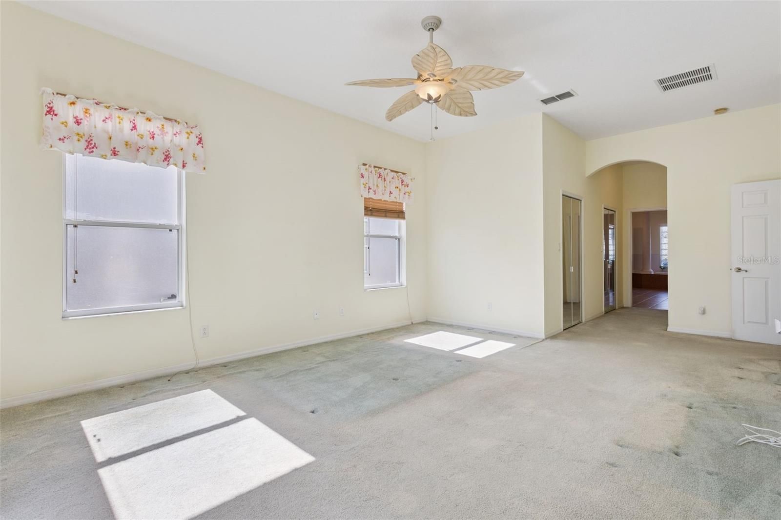 - Ceiling Fan(s), Eat-in Kitchen, High Ceilings, Kitchen/Family Room Combo, Open Floorplan, Main Level Primary, Solid Surface Counters, Solid-Wood Cabinets, Split Bedrooms, Thermostat, Walk-In Closet(s)