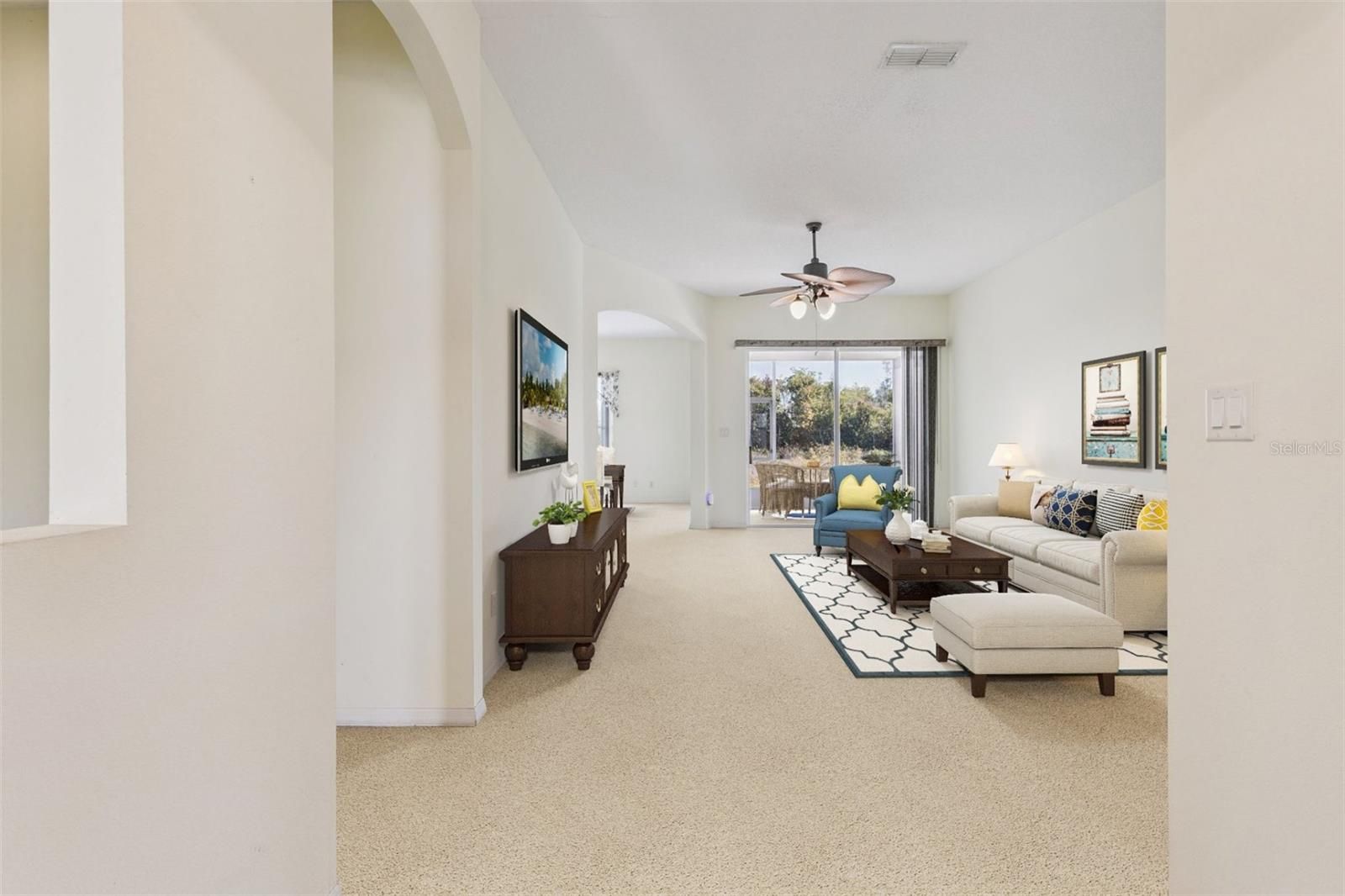 One or more photo(s) has been virtually staged. “Location! Location! Location!” Welcome home to this UNIQUE, PRIVATE, *WATER & CONSERVATION VIEW* home in Plantation of Leesburg! Views like this don't come by often! **NEW ROOF COMING JANUARY 2026!** (AC 2024). **Please Note: This home comes with a CARPET ALLOWANCE – giving you the chance to choose your own flooring and make it your own! This floorplan is one of the best in the community, featuring high ceilings, an open floorplan with 3 bedrooms, 2.5 bathrooms, PLUS a Dining Room Space, and Living Room + Family Room open concept! With beautiful views from almost every room. The split floorplan offers 2 guest bedrooms on the left side, both sharing a full bath for convenience – perfect for family and guests! The kitchen is large and is open with a bar area – great for entertaining. The Master bedroom is on the opposite side of the home, overlooking the beautiful pond/conservation! The master bedroom is large with sliding glass doors that lead to your covered, screened-in lanai, and has an expansive bathroom with a beautiful soaking tub, walk-in closets, dual sink vanities, and a comfortable shower. The outside lanai is PARADISE as you have a covered area to relax and enjoy the private scenery, birds & wildlife, and enjoy the Florida breeze – your own private oasis! The Laundry Room is large and features cabinets and utility sink for your convenience. The garage is an EXTRA BENEFIT as it has an extra 4’ extension for all your storage! Plantation of Leesburg offers a lifestyle of luxury and fun with 3 resort style pools, 2 Fitness Centers, Craft Rooms, Art Rooms, Billiards room, and so much more! Extra amenities such as pickleball, tennis, basketball, horseshoes, bocce courts, craft room, library, and so many planned activities will make sure you are living your best life. Plantation of Leesburg is conveniently located less than 30 minutes from the Villages, approximately an hour from Orlando’s International Airport, Disney and Universal theme parks, and less than two hours from the beaches on either coast. Discover the best of 55+ living at Plantations - where every day brings the opportunity to explore, relax, and enjoy the natural beauty that surrounds you! Call today for your private tour!
