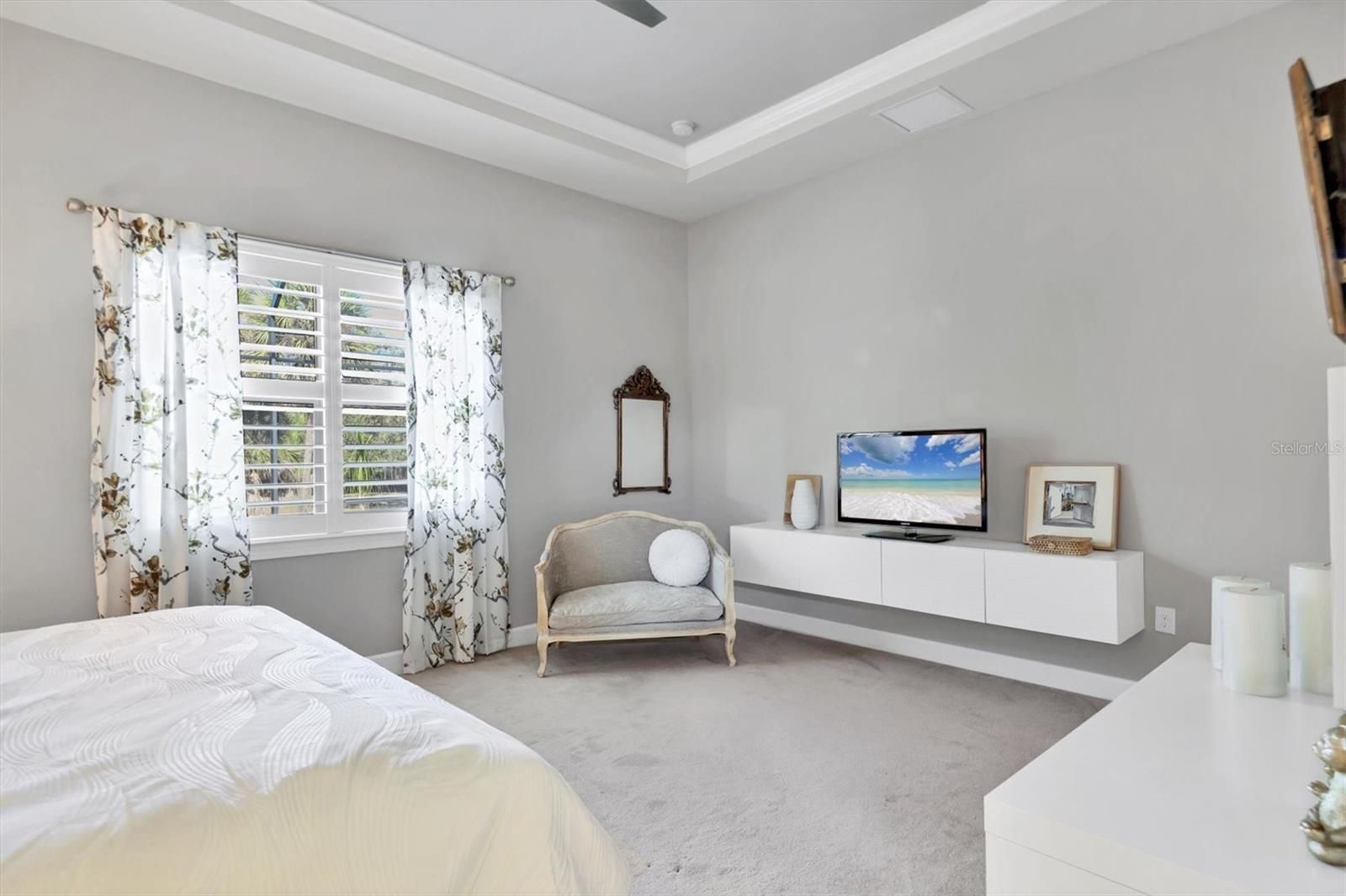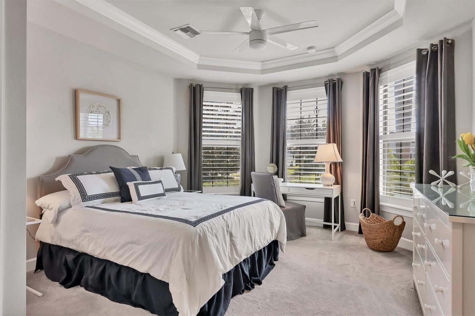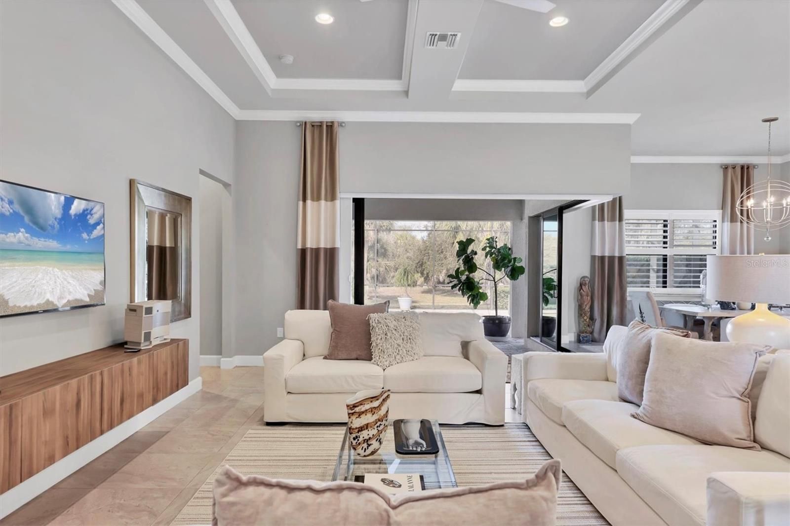 - Ceiling Fan(s), Coffered Ceiling(s), Crown Molding, High Ceilings, Kitchen/Family Room Combo, Living/Dining Room, Open Floorplan, Solid Surface Counters, Solid-Wood Cabinets, Tray Ceiling(s), Walk-In Closet(s), Window Treatments