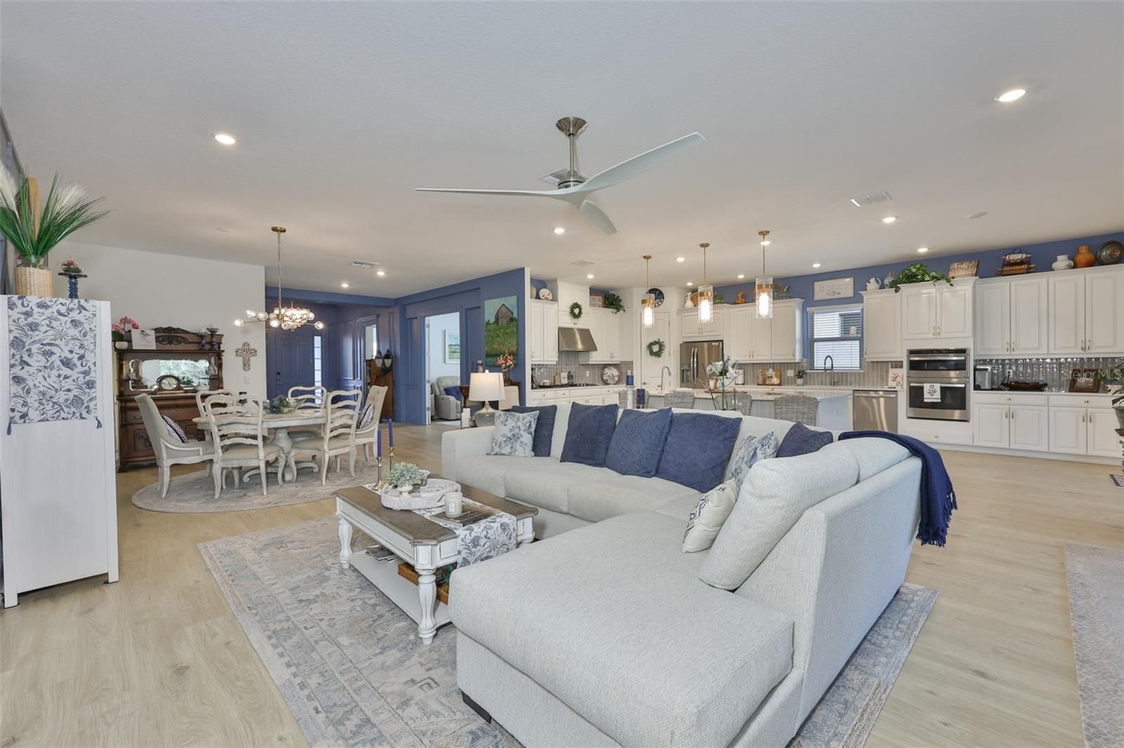 Welcome to the essence of Florida living in this meticulously maintained, beautifully appointed, nearly new Palazzio model, offering over 3,000 square feet of thoughtfully designed living space in the highly sought-after Esplanade at Artisan Lakes. Step through the elegant double-door entry and immediately experience the home's inviting ambiance, highlighted by soaring ceilings, abundant natural light, and a wide-open floor plan that delivers an impressive "wow" factor. Upgraded recessed LED lighting and designer ceiling fans are featured throughout, while a striking chandelier creates a sophisticated and welcoming first impression. Barely two years old, this three-bedroom, three-bath residence seamlessly blends architectural elegance with modern design, offering the perfect balance of luxury, comfort, and functionality. The home showcases luxury vinyl plank flooring throughout the main living area, 10-foot ceilings, 8-foot interior doors, crown molding, and tray ceilings. Designed for both everyday living and effortless entertaining, the open-concept layout flows beautifully between the gathering room, dining area, and gourmet kitchen. The chef's kitchen serves as the heart of the home, featuring upgraded cabinetry, a spacious center island, Italian porcelain tile backsplash, and a walk-in pantry. The owner's suite offers a private retreat with elegant bay windows and a spa-inspired ensuite bath, complete with dual vanities, a walk-in shower, a private water closet, and a custom walk-in closet with thoughtfully designed built-ins. Bedroom two functions as a true secondary suite with its own private bath and generous closet, while bedroom three is equally spacious and well-appointed. A versatile flex room with designer glass double doors provides the ideal space for a home office, library, den, or media room. Additional highlights include a well-appointed laundry room with built-in cabinetry for added convenience and storage, and a 4-foot extended garage complete with pro-grade polyaspartic flooring and overhead storage. Embracing Florida's indoor-outdoor lifestyle, a dramatic 12-foot pocket sliding glass door opens to an oversized covered and screened lanai, pre-plumbed for a full outdoor kitchen and fireplace, creating a stunning outdoor retreat. There is also ample space to design and build your dream pool! Living in Esplanade at Artisan Lakes offers a true resort-style experience within a beautifully planned community. Residents of this gated enclave enjoy access to an array of world-class amenities centered around a luxurious clubhouse, complemented by a full-time lifestyle director who curates engaging social events and activities. Amenities include a resort-style pool and spa, a resistance pool, a state-of-the-art fitness center, aerobics and dance studio, day spa with massage rooms, tennis, pickleball and bocce courts, gathering spaces, a catering kitchen, fire pit lounge, scenic walking and biking trails, and a dedicated dog park. Ideally located with convenient access to Interstate 75, you're just a short drive from Tampa, St. Petersburg, Sarasota, and the pristine Gulf Coast beach. Experience the perfect blend of lifestyle, space, and elevated design this exceptional home offers. Schedule your private showing today.
